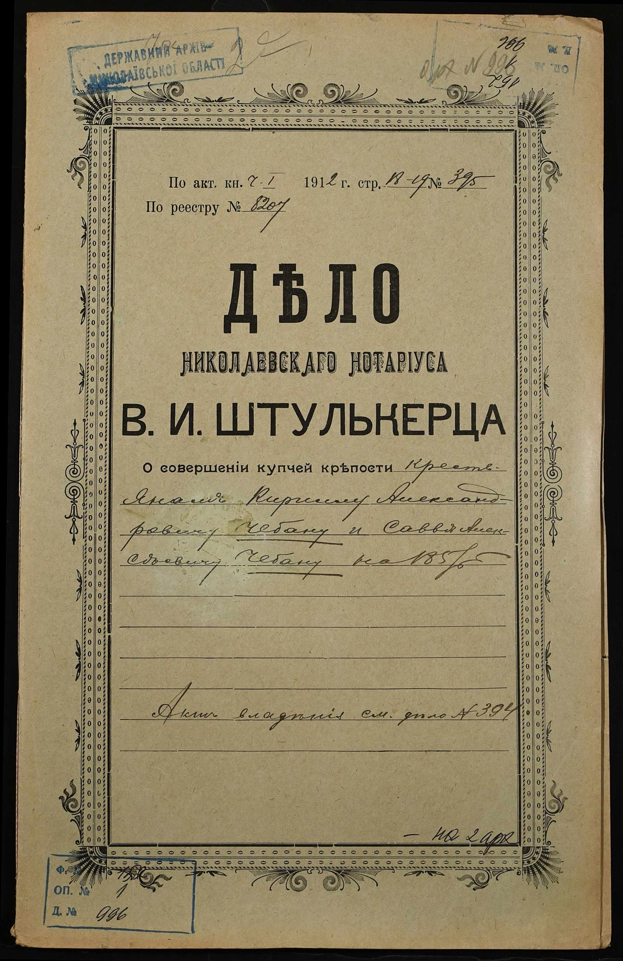 • • • • Справа № 996 “Справа про вчинення купчої про продаж землі селянином Чебаном Кирилом Олександровичем (Чебаном Кириллом Александровичем) на користь селянина Чебана Сави Олексійовича (Чебана Саввы Алексеевича)”