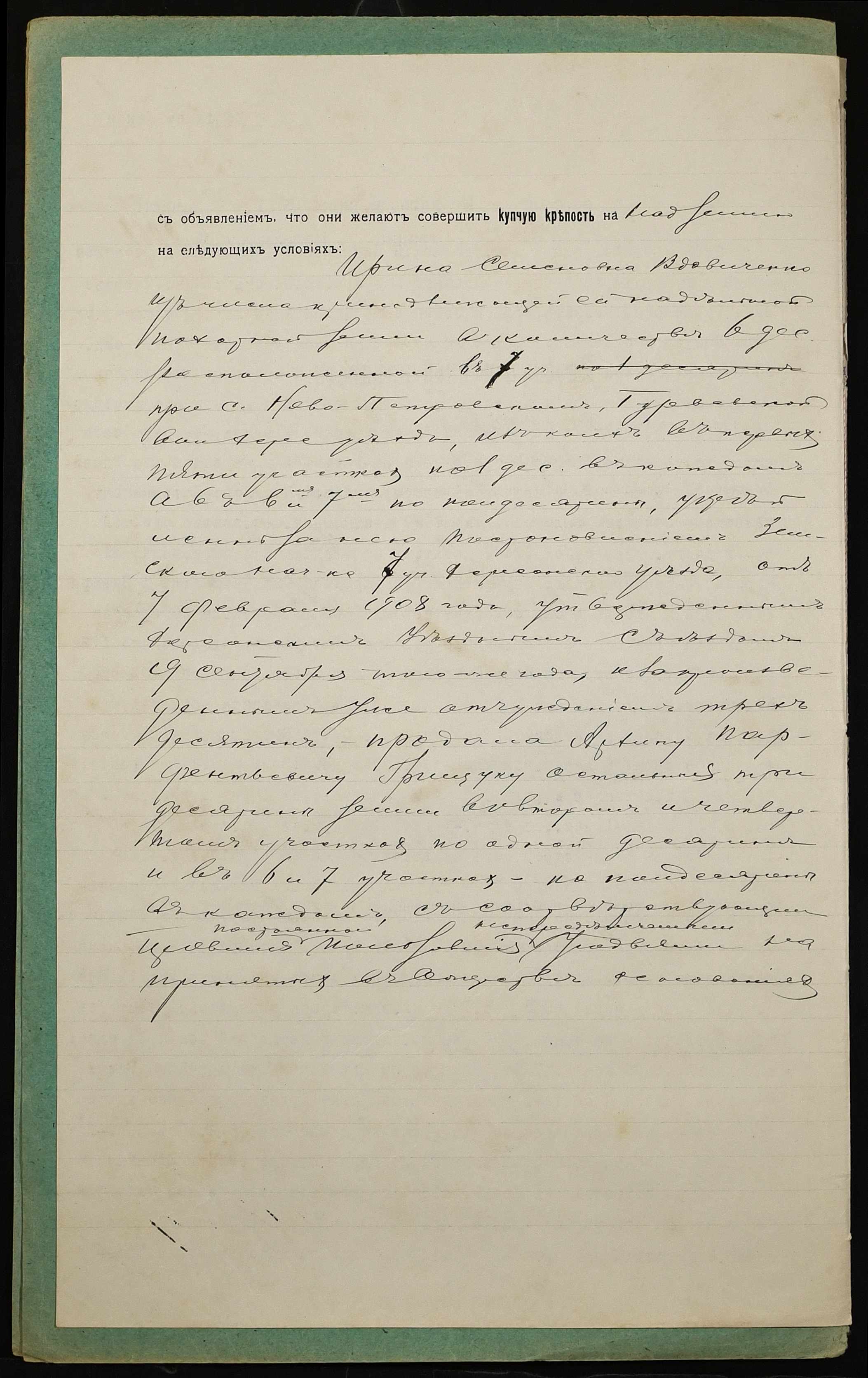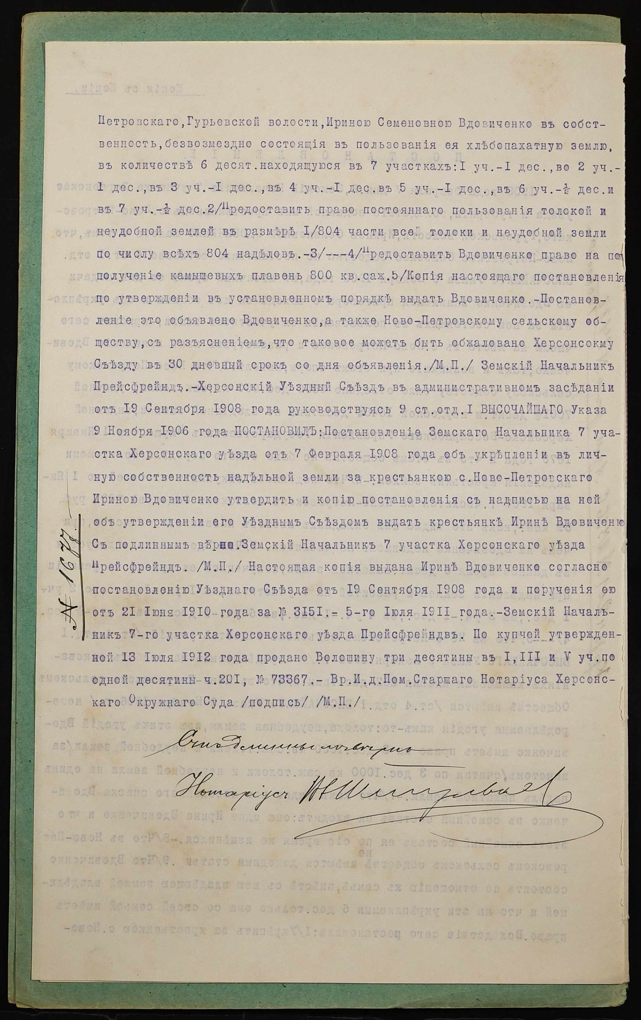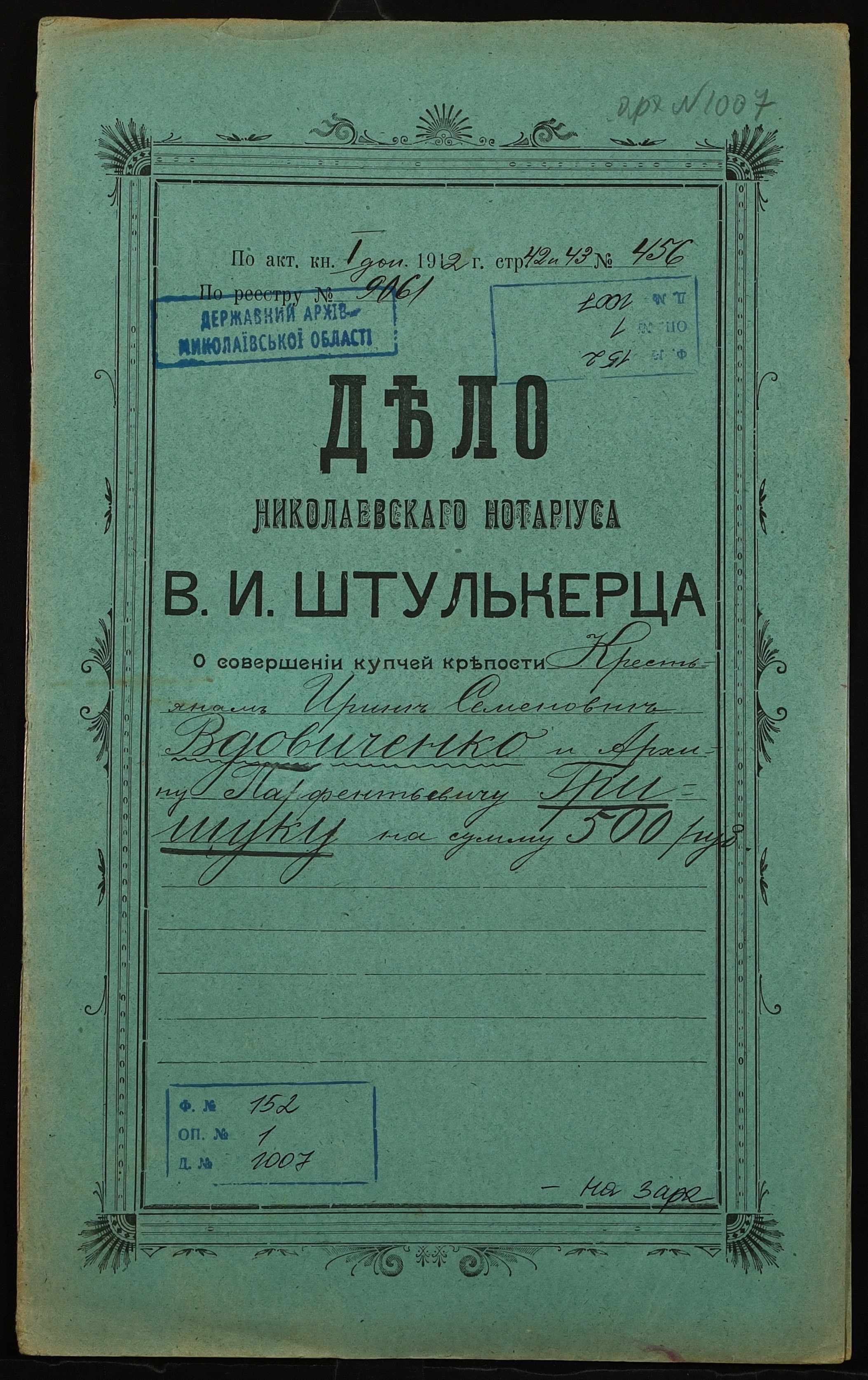 • • • • Справа № 1007 “Справа про вчинення купчої про продаж землі селянкою Вдовиченко Іриною Семенівною (Вдовиченко Ириной Семеновной) на користь селянина Грищука Архипа Парфентійовича (Грищука Архипа Парфентьевича)”