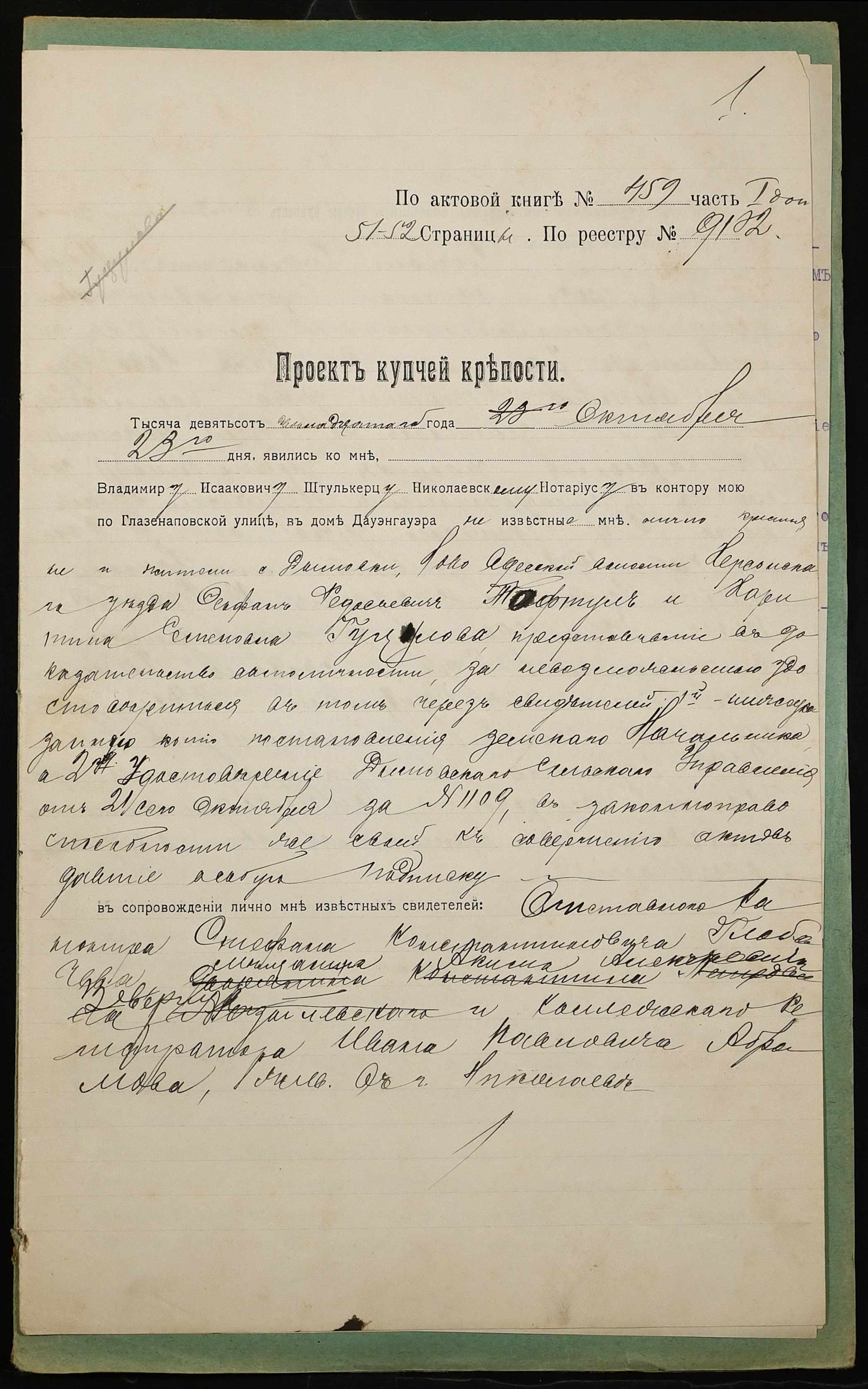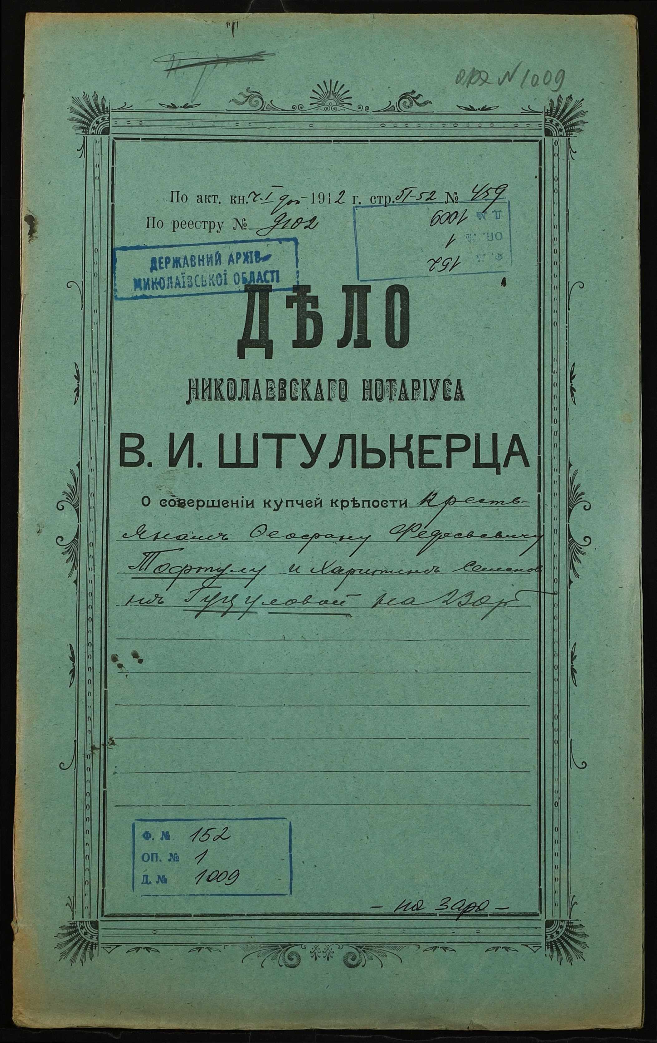 ◦ ◦ Фонд № 152 “Контора миколаївського нотаріуса Херсонського окружного суду Штулькерца Володимира Ісааковича”