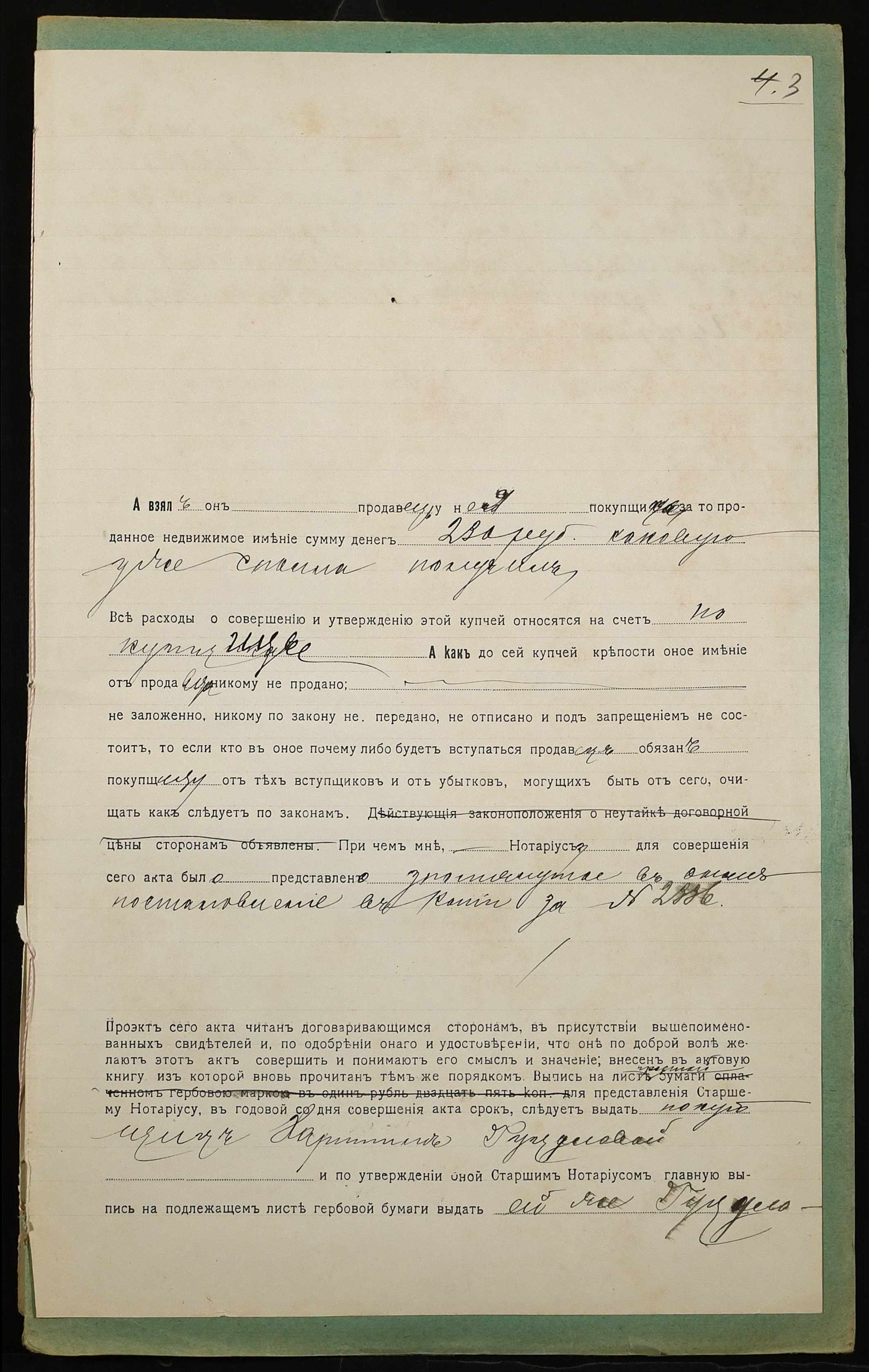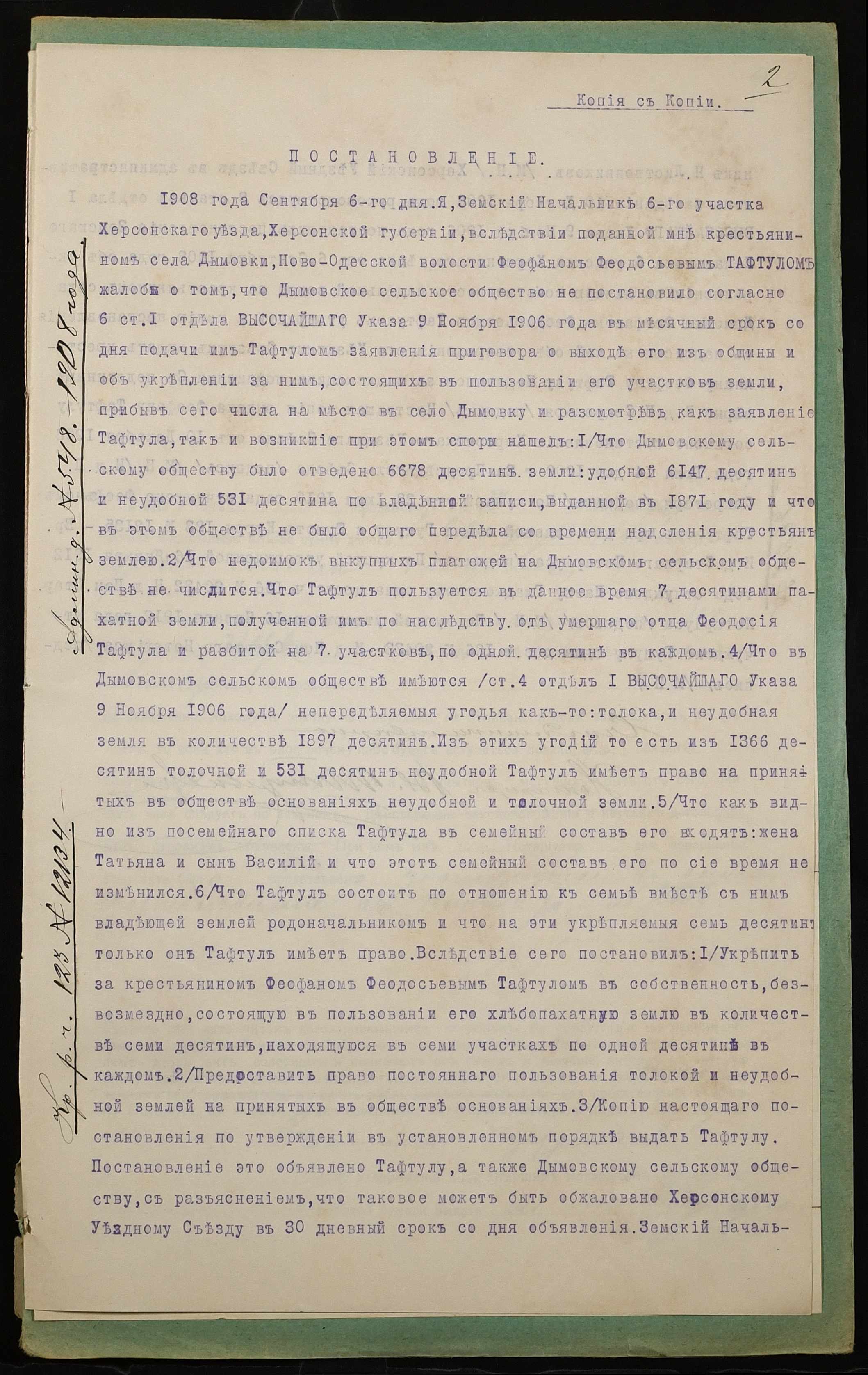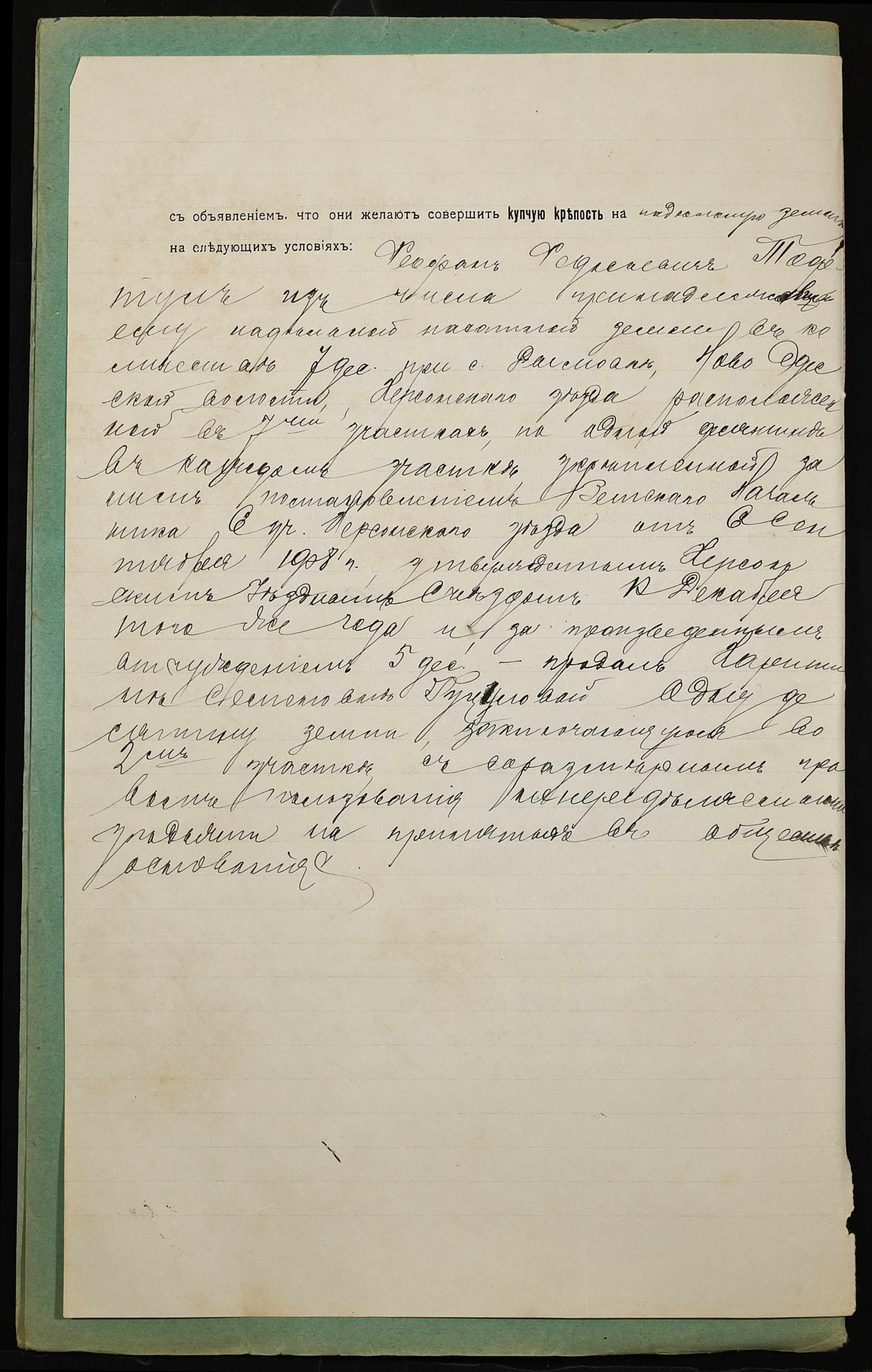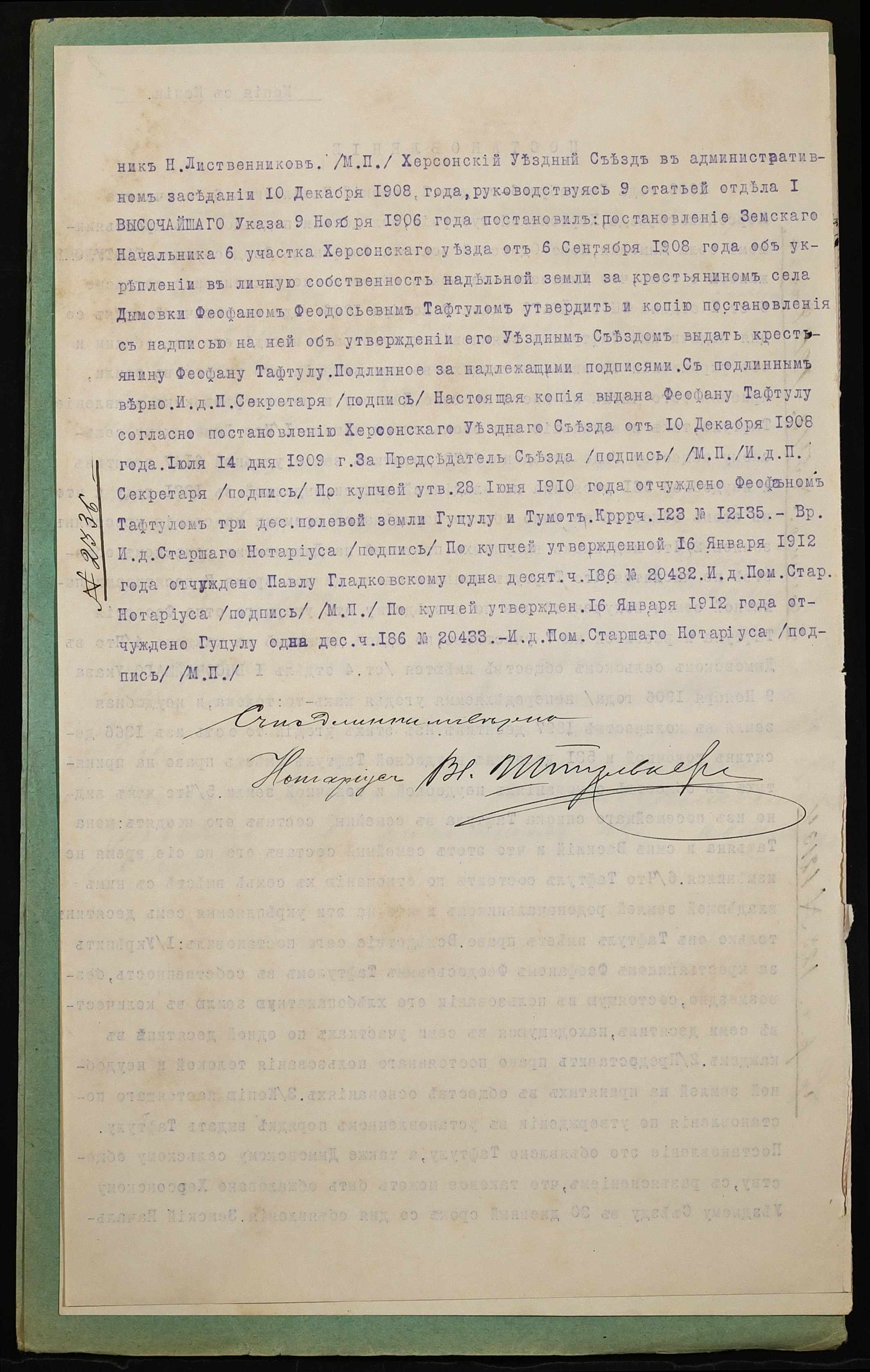• • • • Справа № 1009 “Справа про вчинення купчої про продаж землі селянином Тофтулом Феофаном Федосійовичем (Тофтулом Феофаном Федосеевичем) на користь селянки Гуцулової Харитини Семенівни (Гуцуловой Харитины Семеновны)”