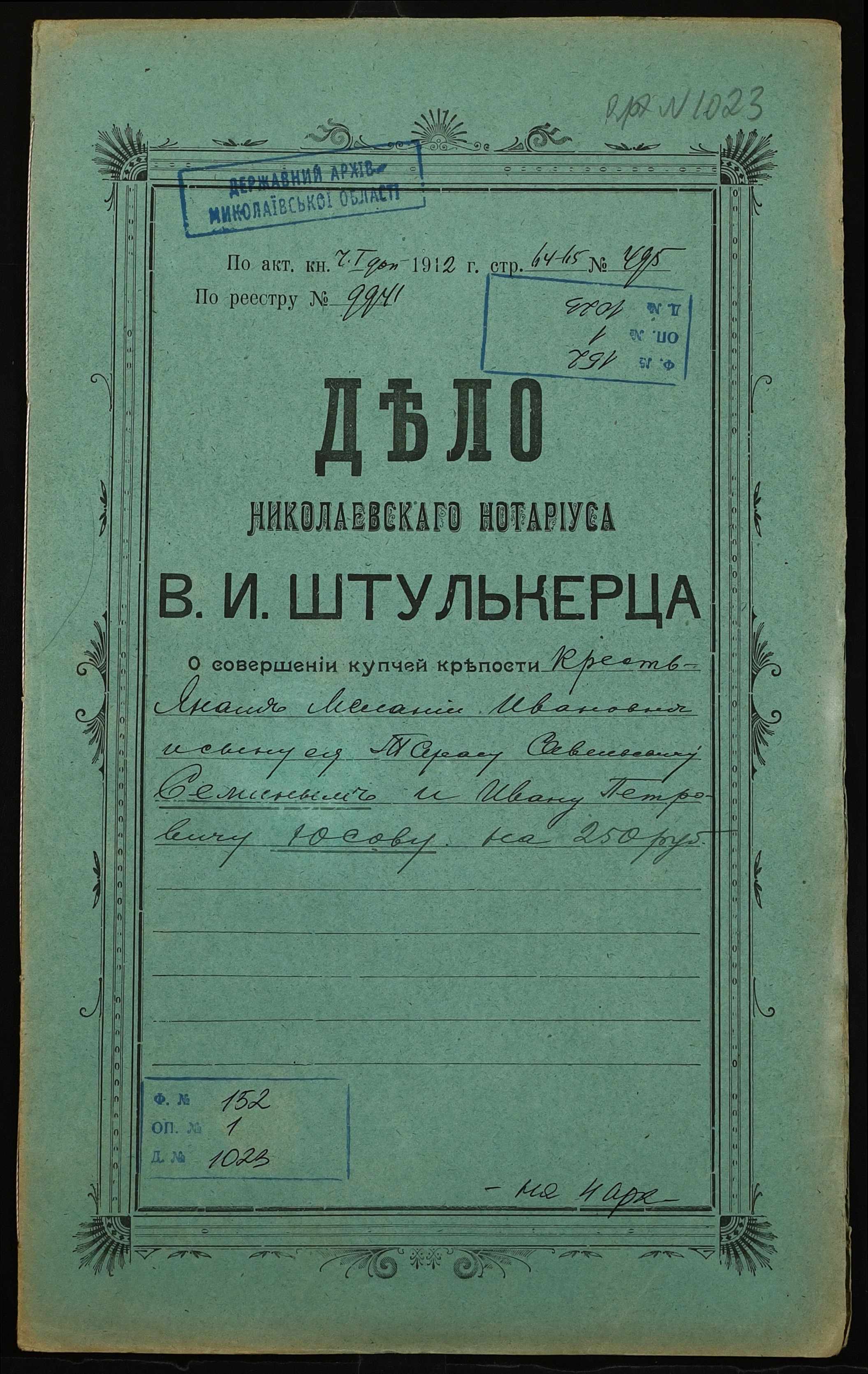 ◦ ◦ Фонд № 152 “Контора миколаївського нотаріуса Херсонського окружного суду Штулькерца Володимира Ісааковича”