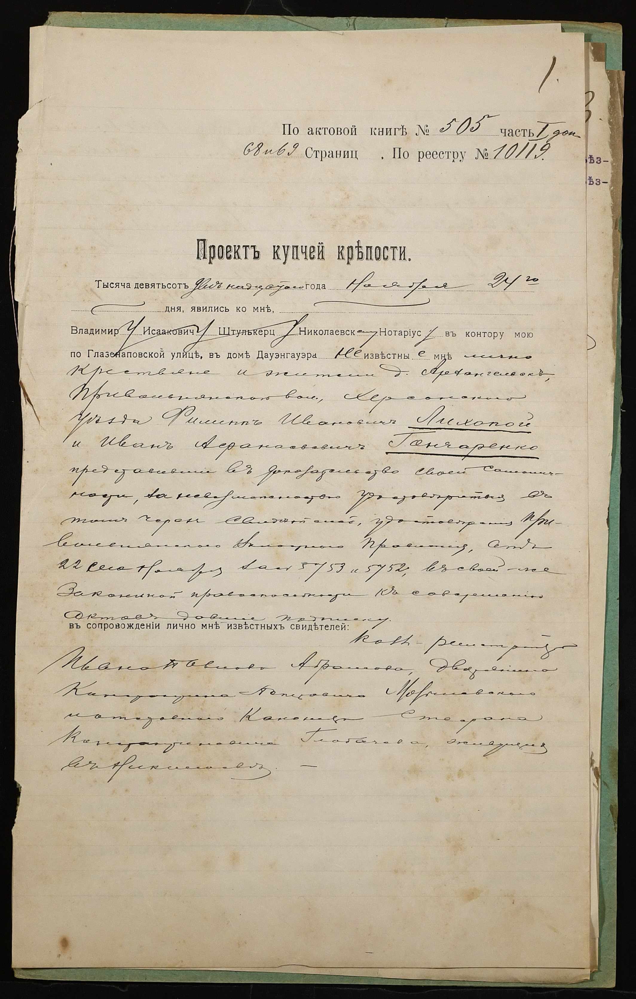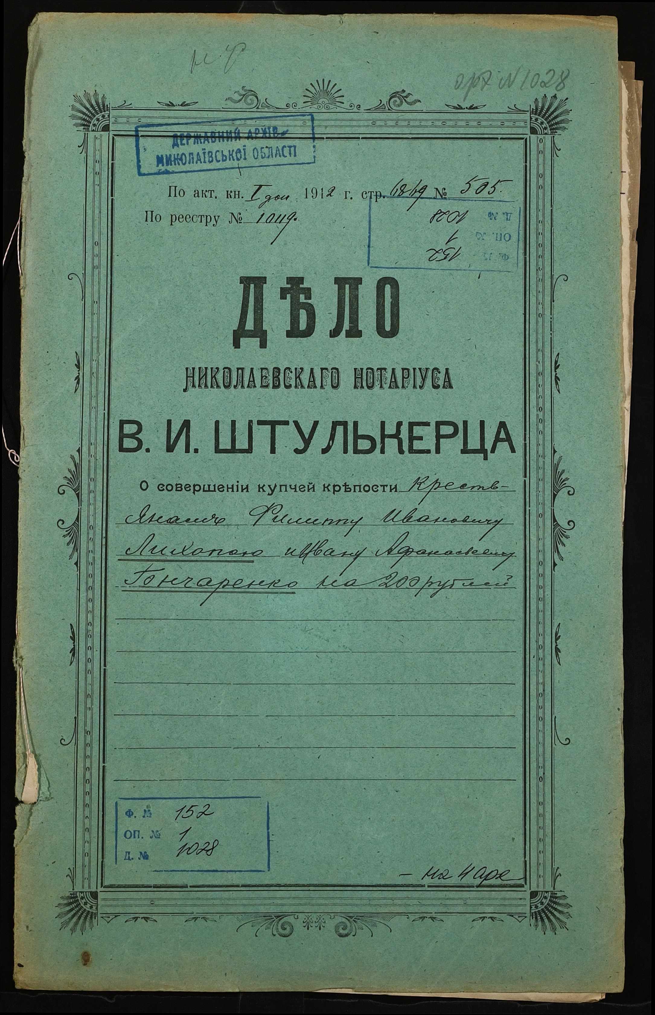 ◦ ◦ Фонд № 152 “Контора миколаївського нотаріуса Херсонського окружного суду Штулькерца Володимира Ісааковича”