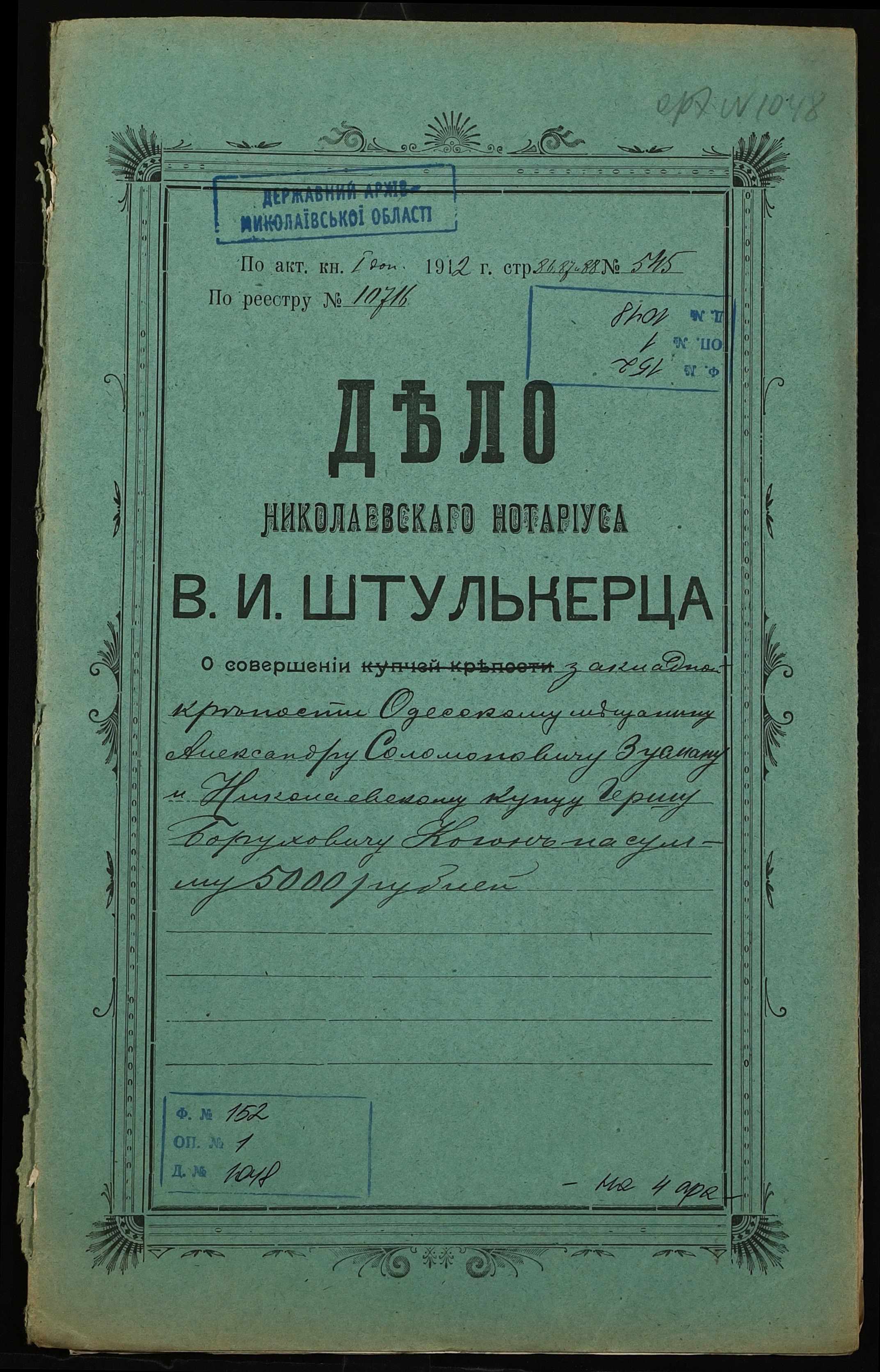 ◦ ◦ Фонд № 152 “Контора миколаївського нотаріуса Херсонського окружного суду Штулькерца Володимира Ісааковича”
