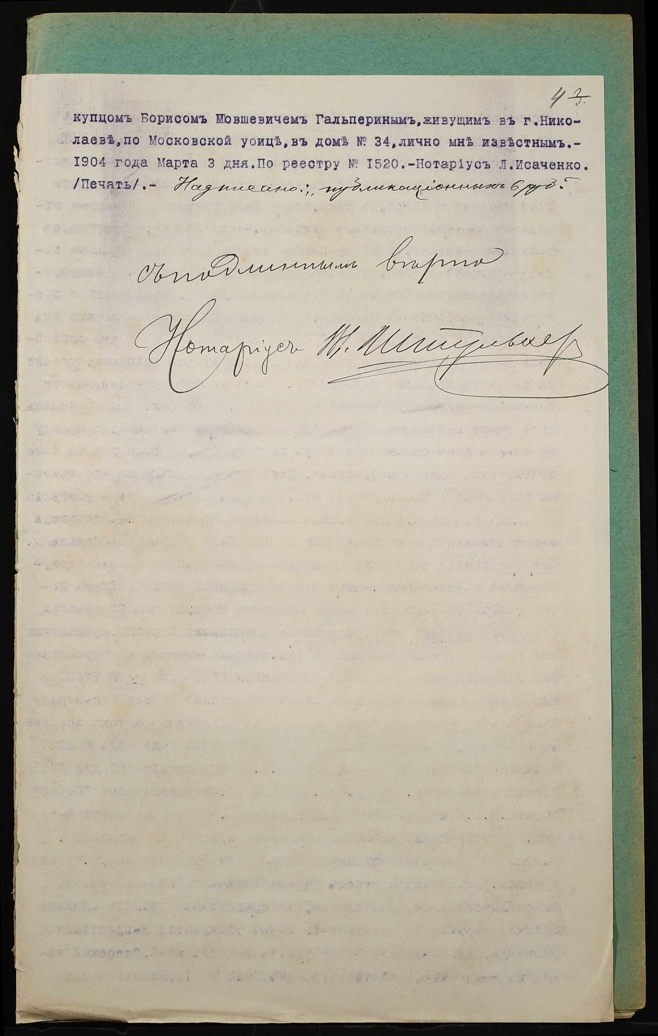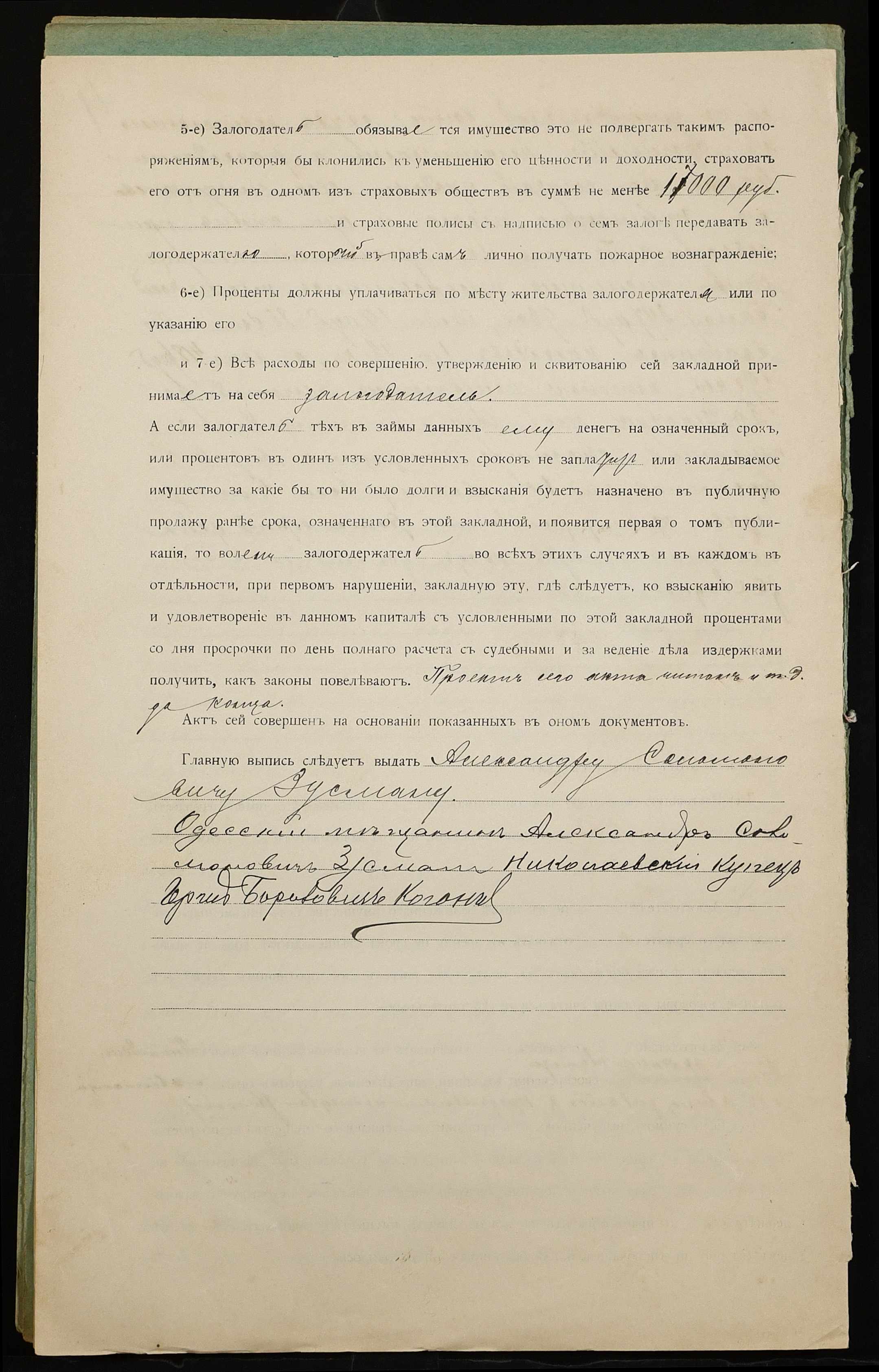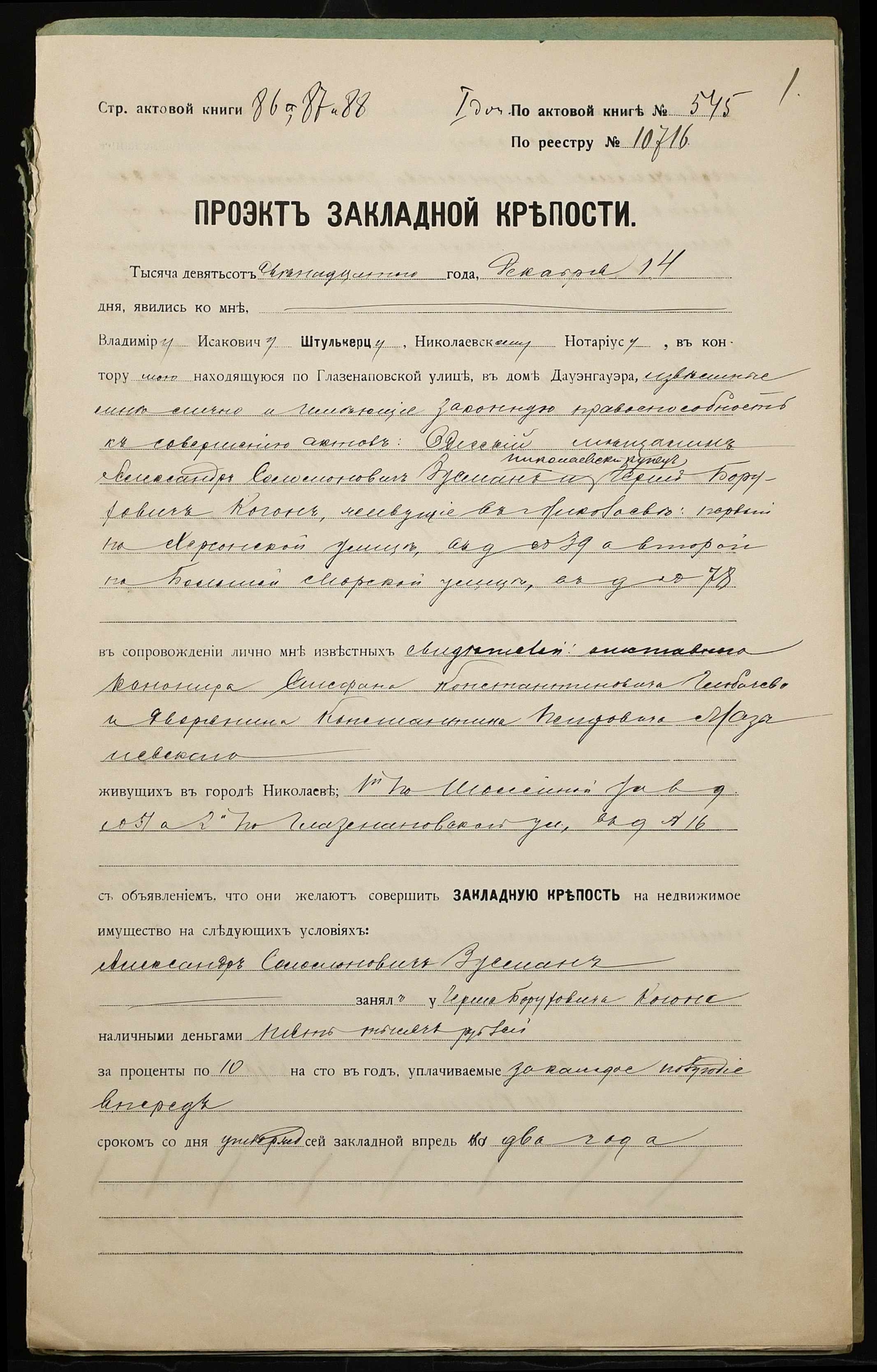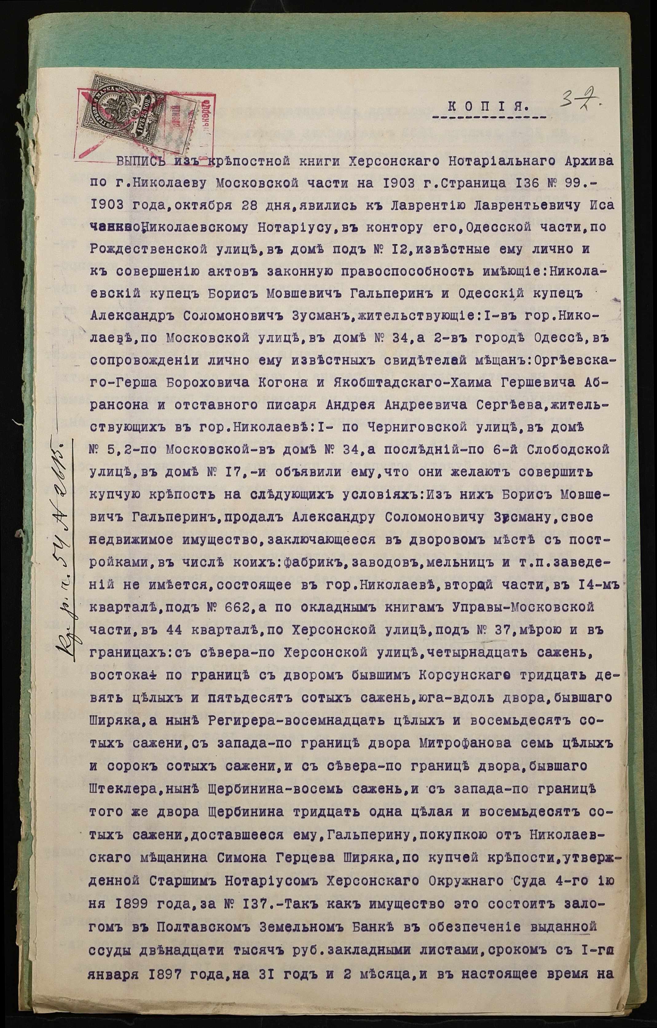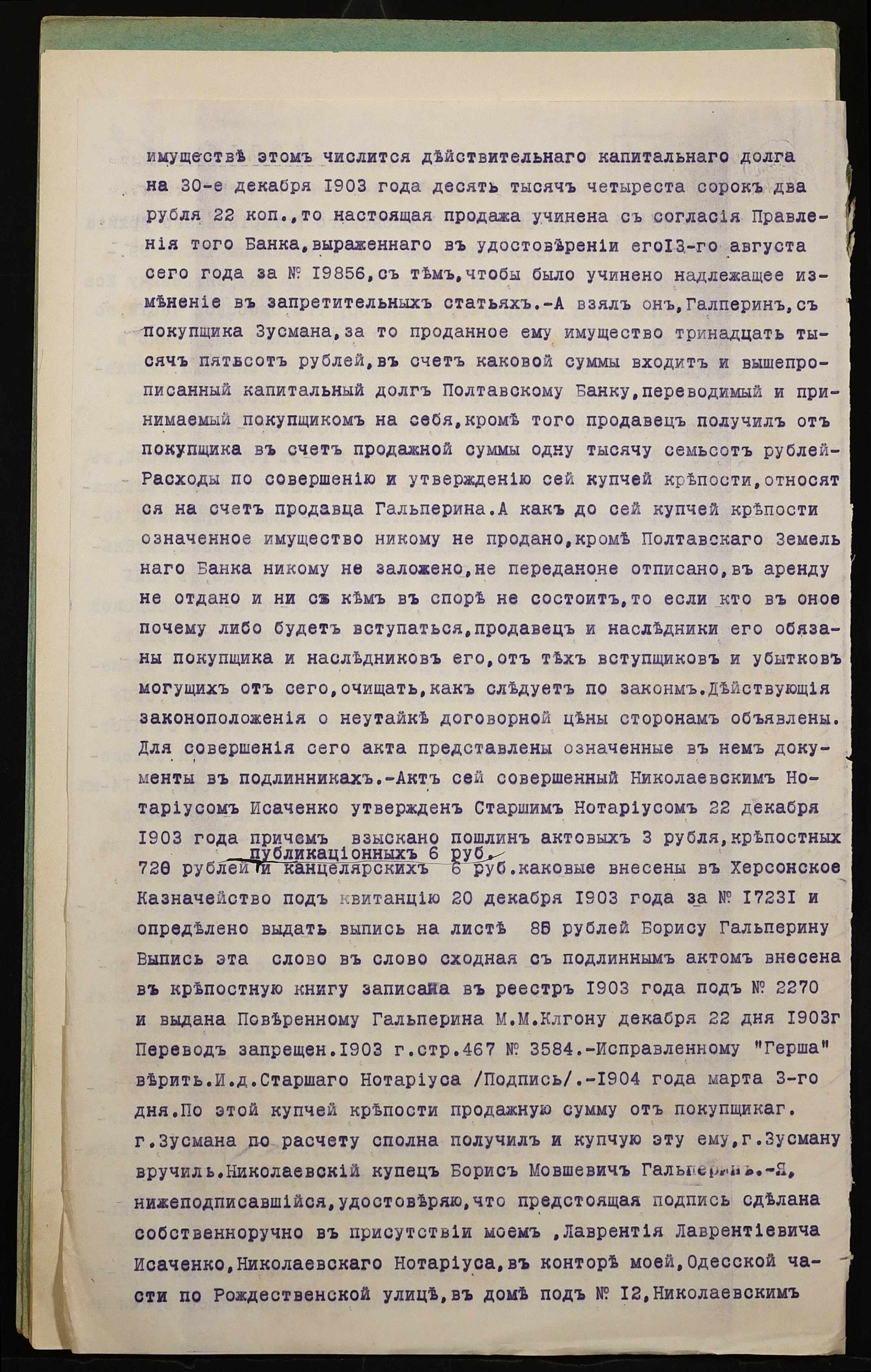 • • • • Справа № 1048 “Справа про вчинення заставної на нерухоме майно, закладене Зусманом Олександром Соломоновичем (Зусманом Александром Соломоновичем) – миколаївському купцю Когону Гершу Бороховичу (Когону Гершу Бороховичу)”