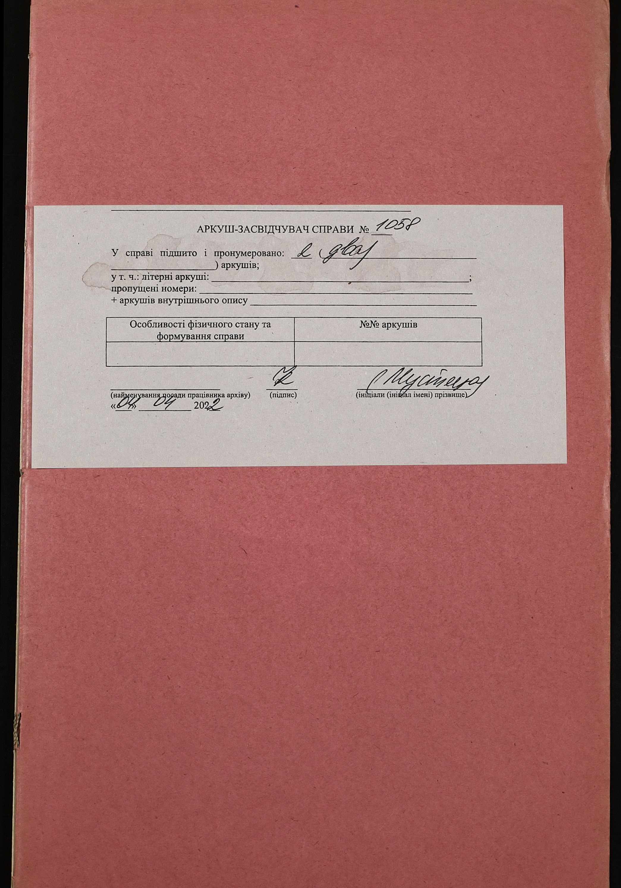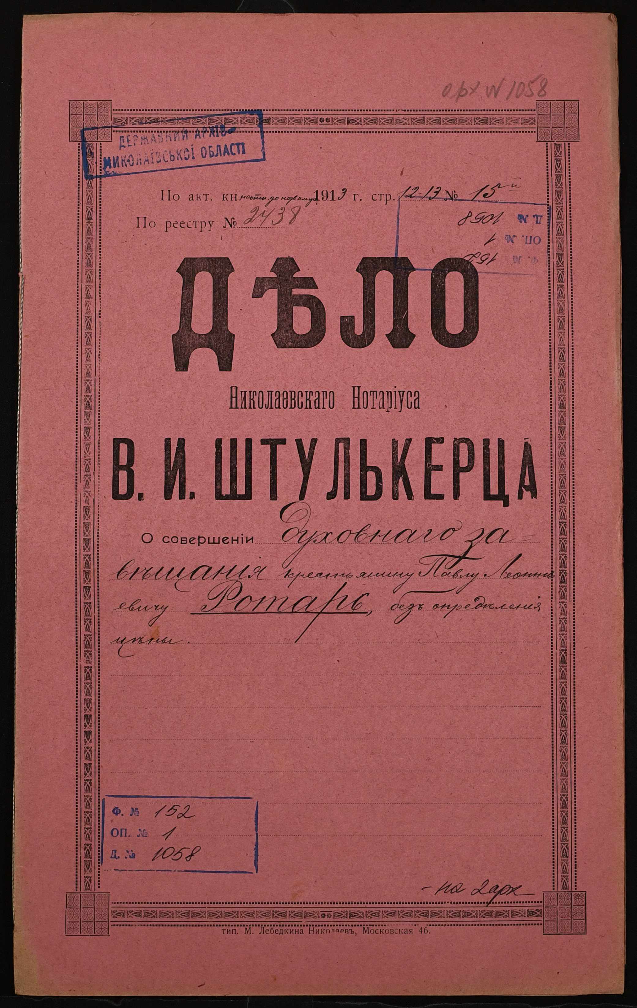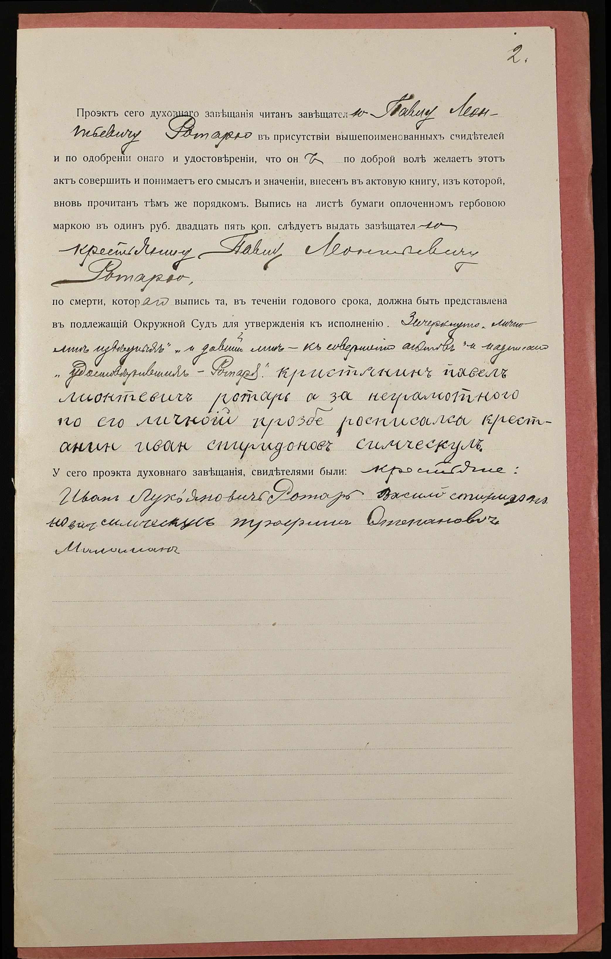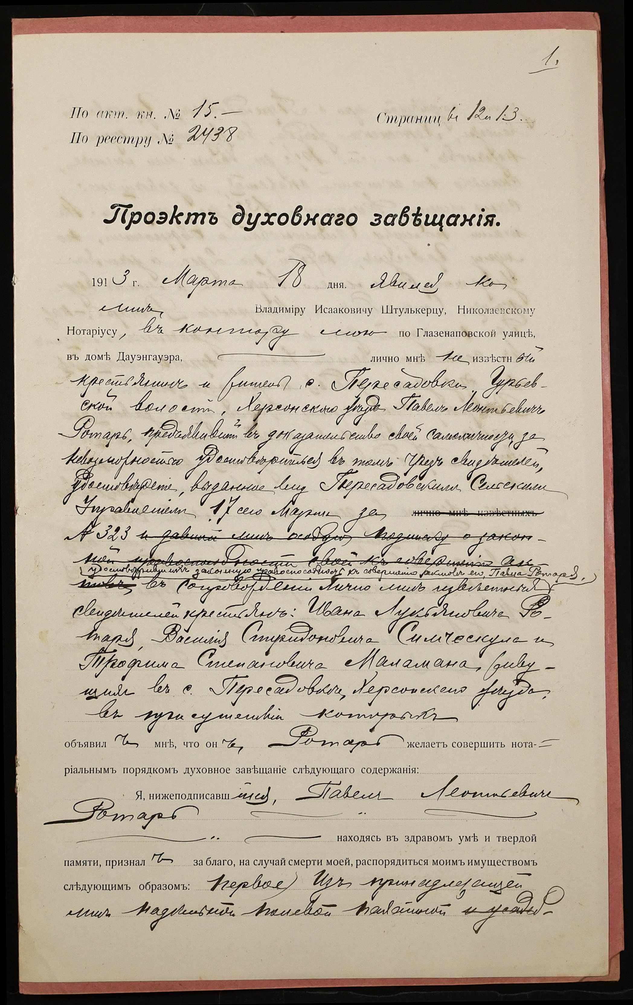 • • • • Справа № 1058 “Проєкт духівниці селянина Ротаря Павла Леонтійовича (Ротаря Павла Леонтьевича)”