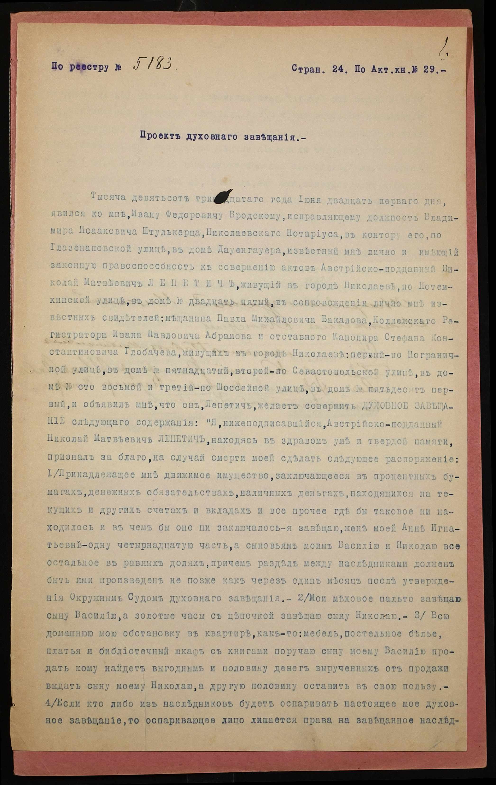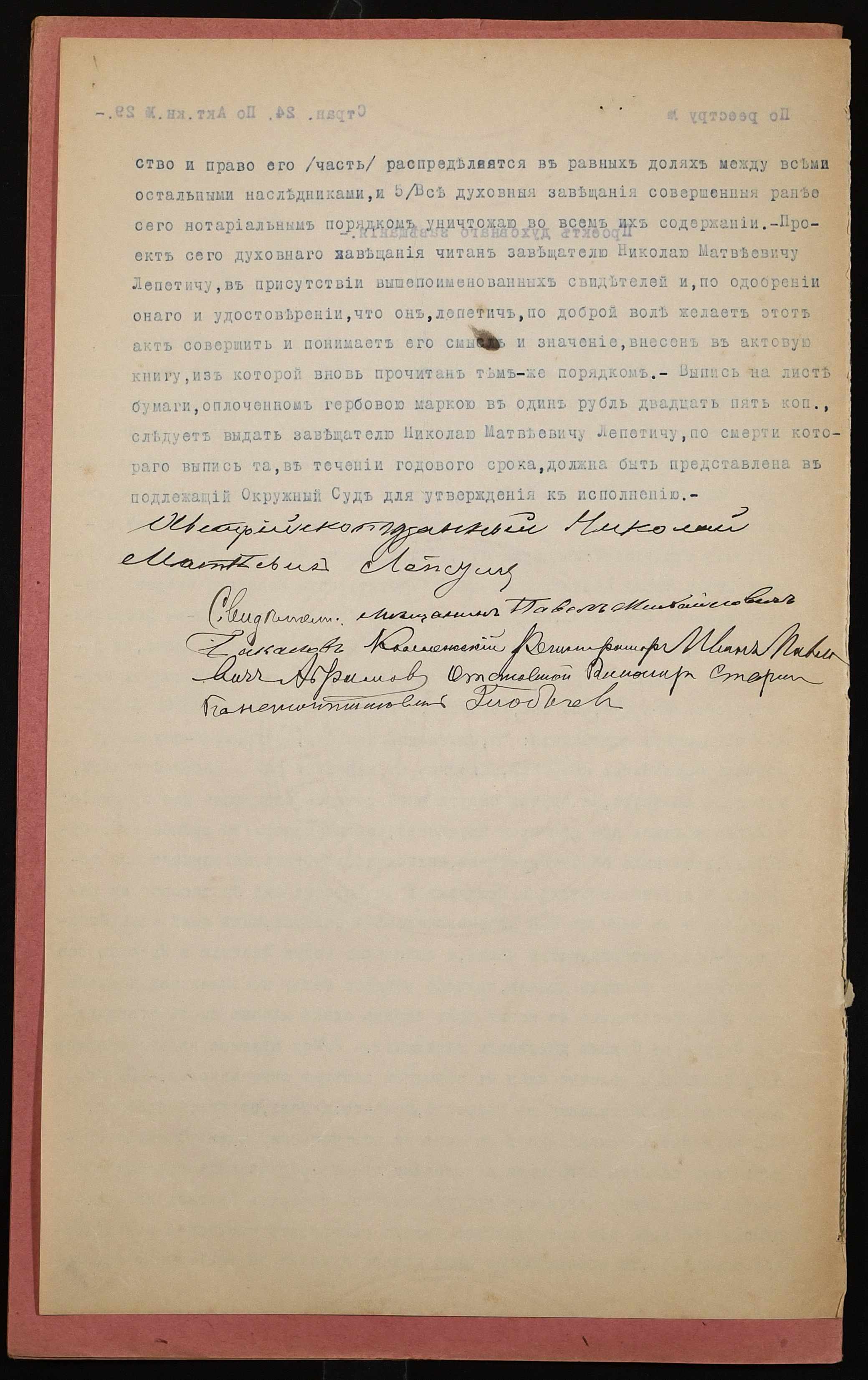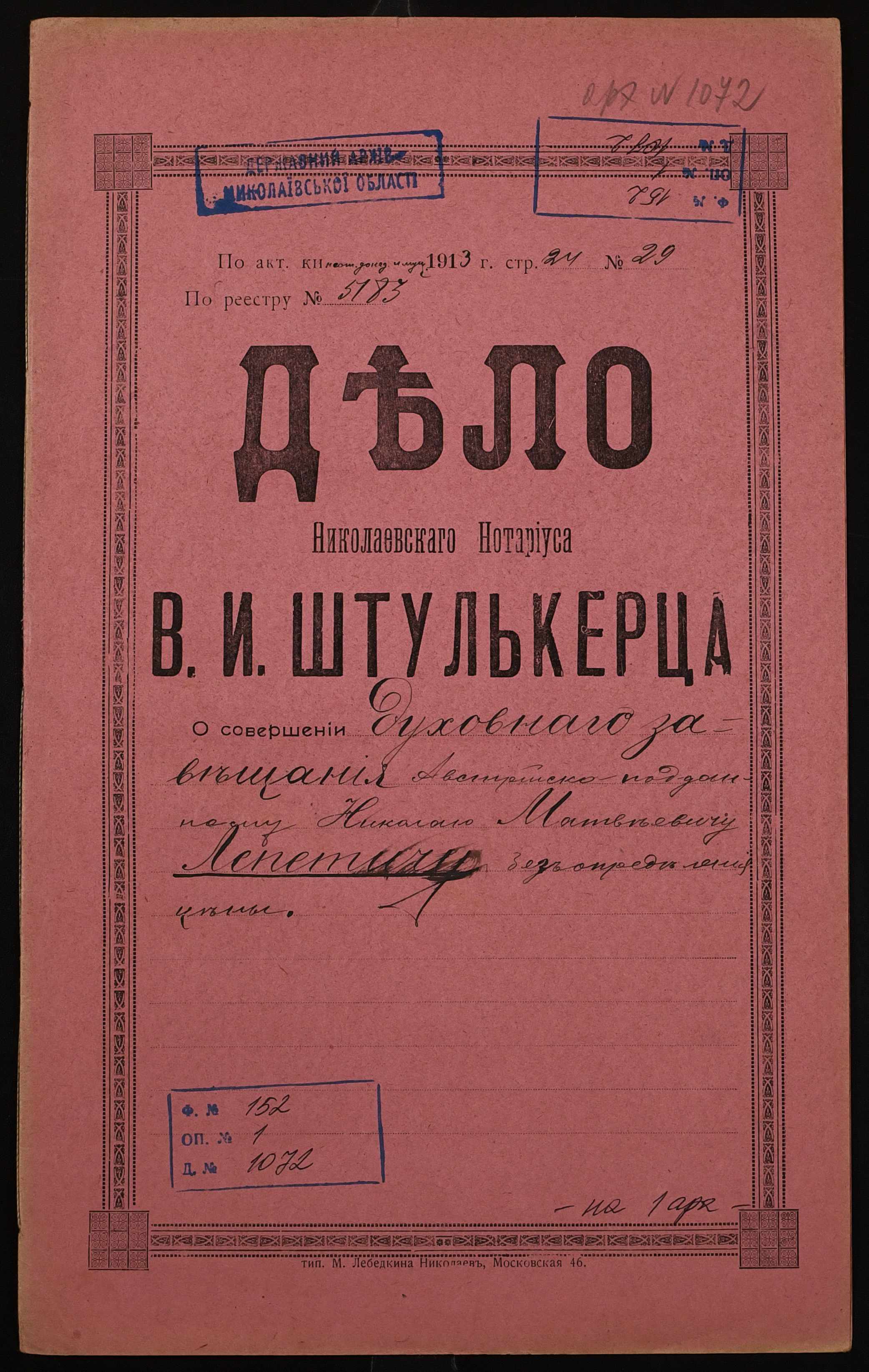 • • • • Справа № 1072 “Проєкт духівниці підданого Австрії Лепетича Миколи Матвійовича (Лепетича Николая Матвеевича)”
