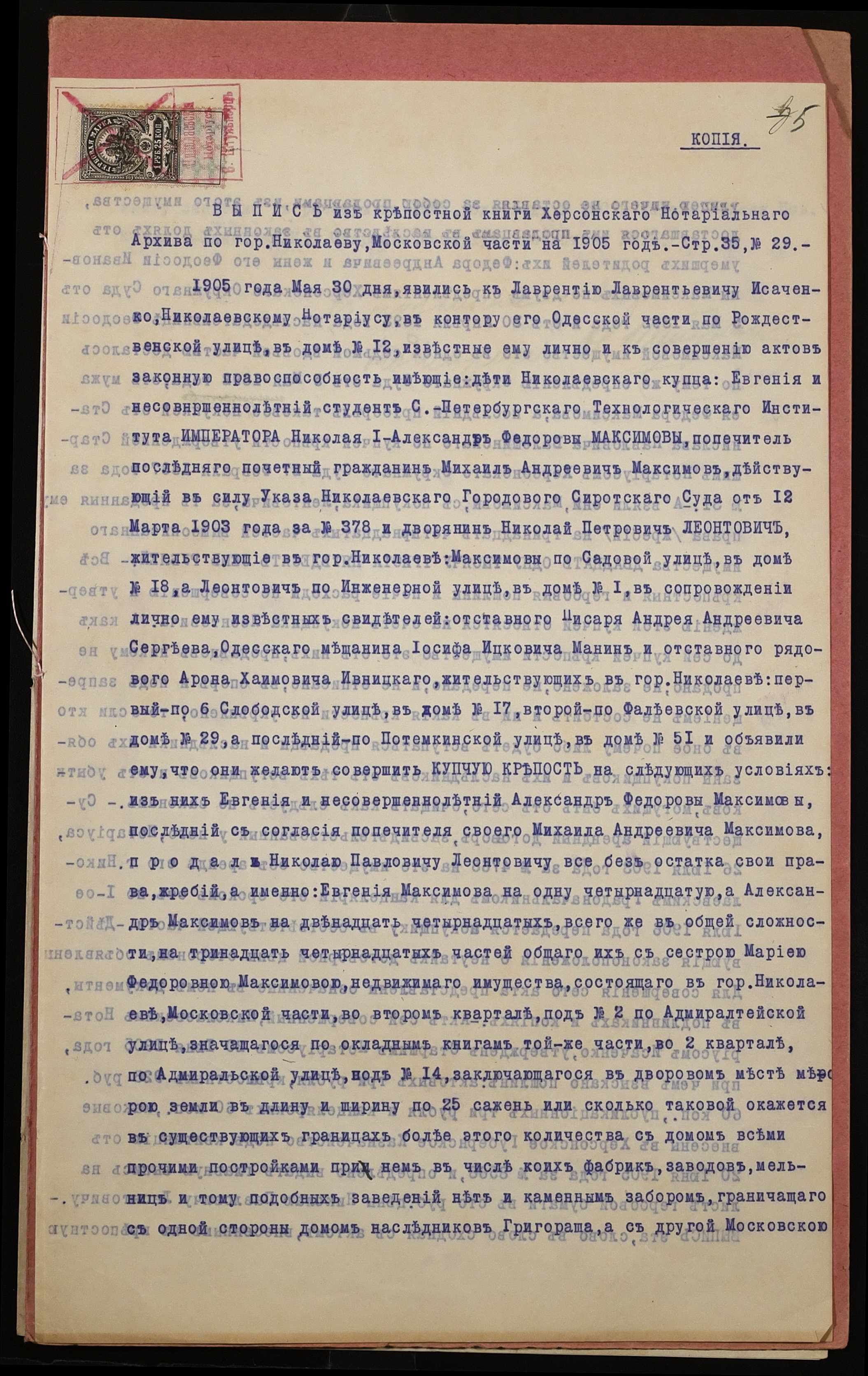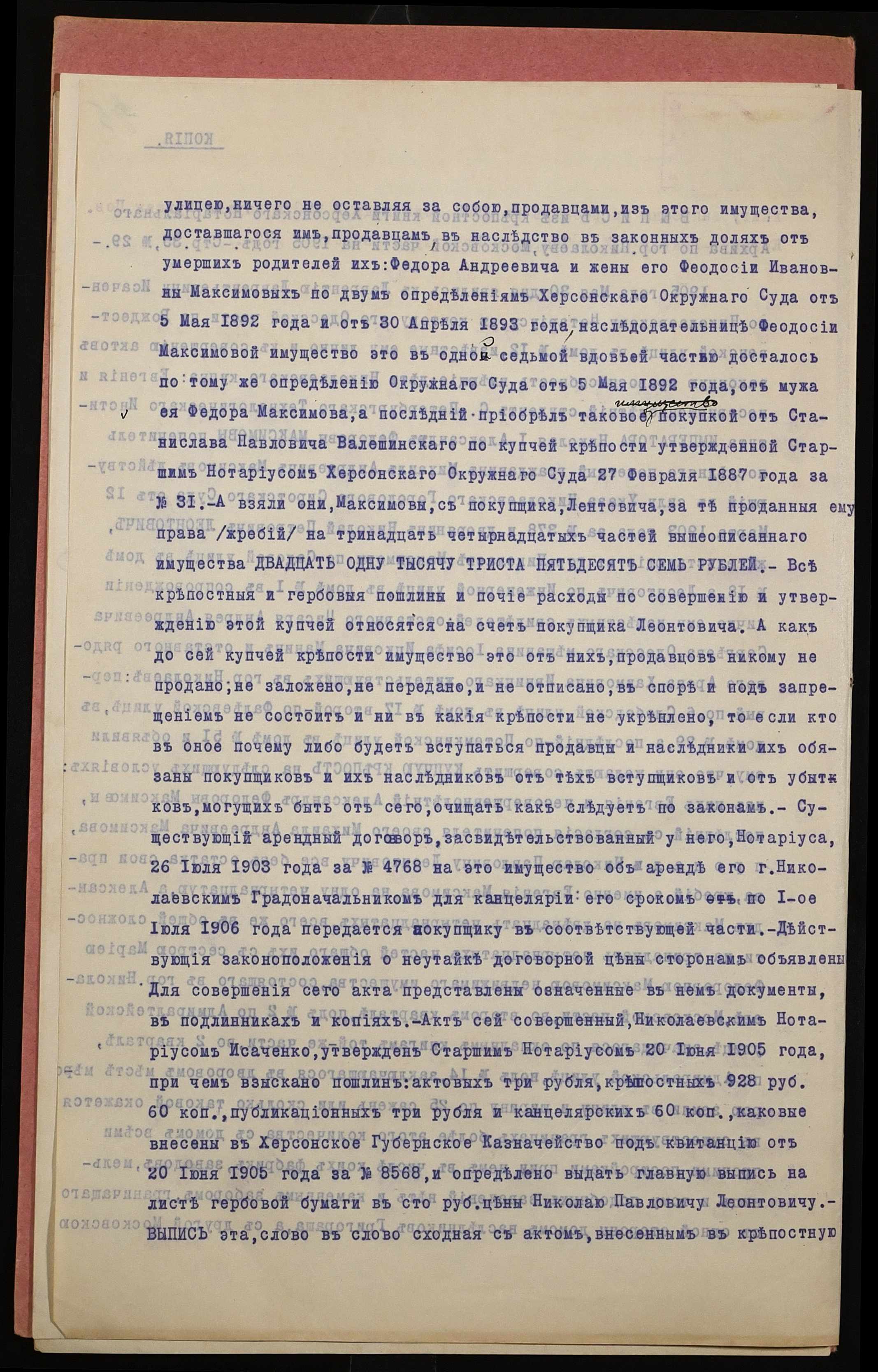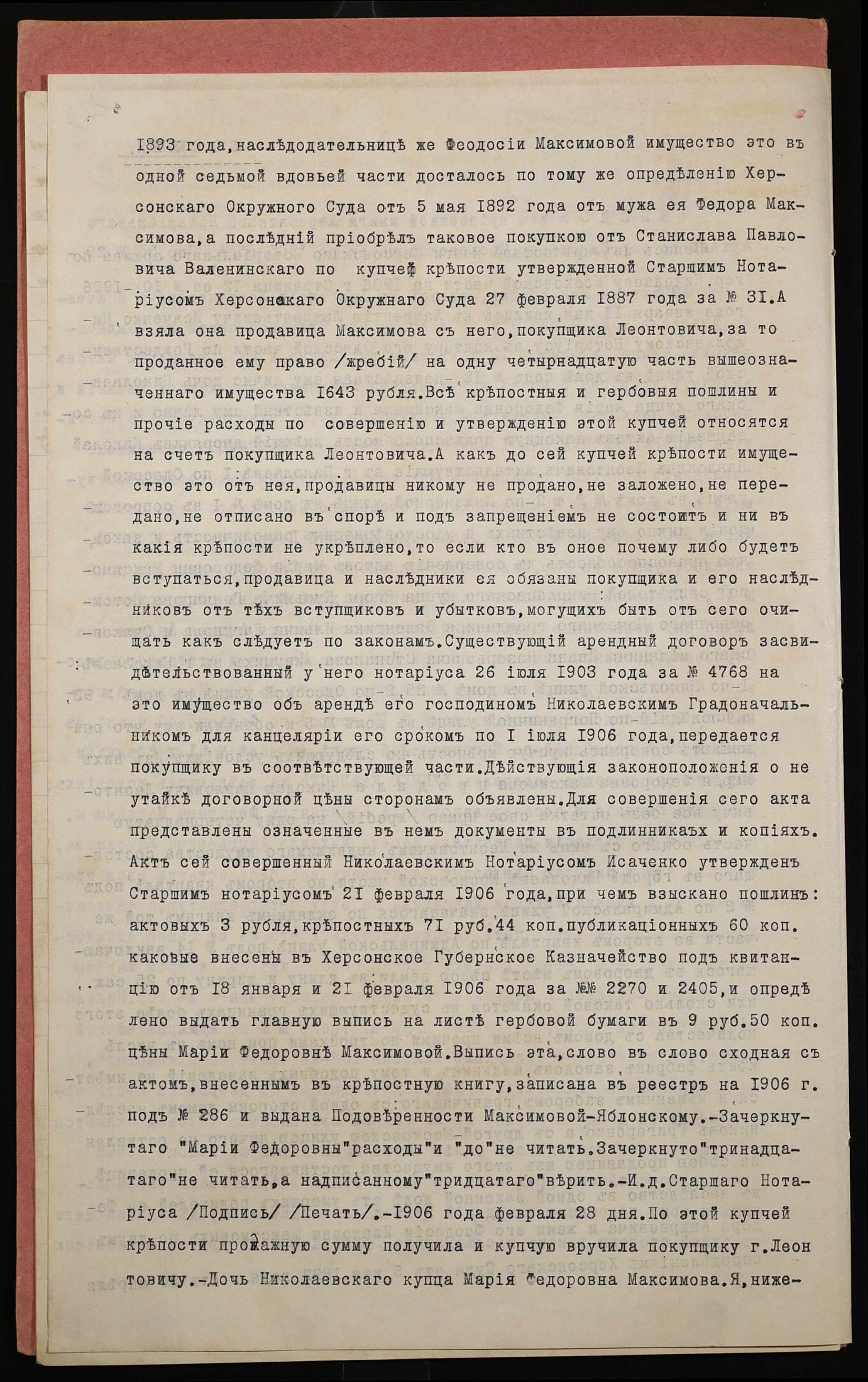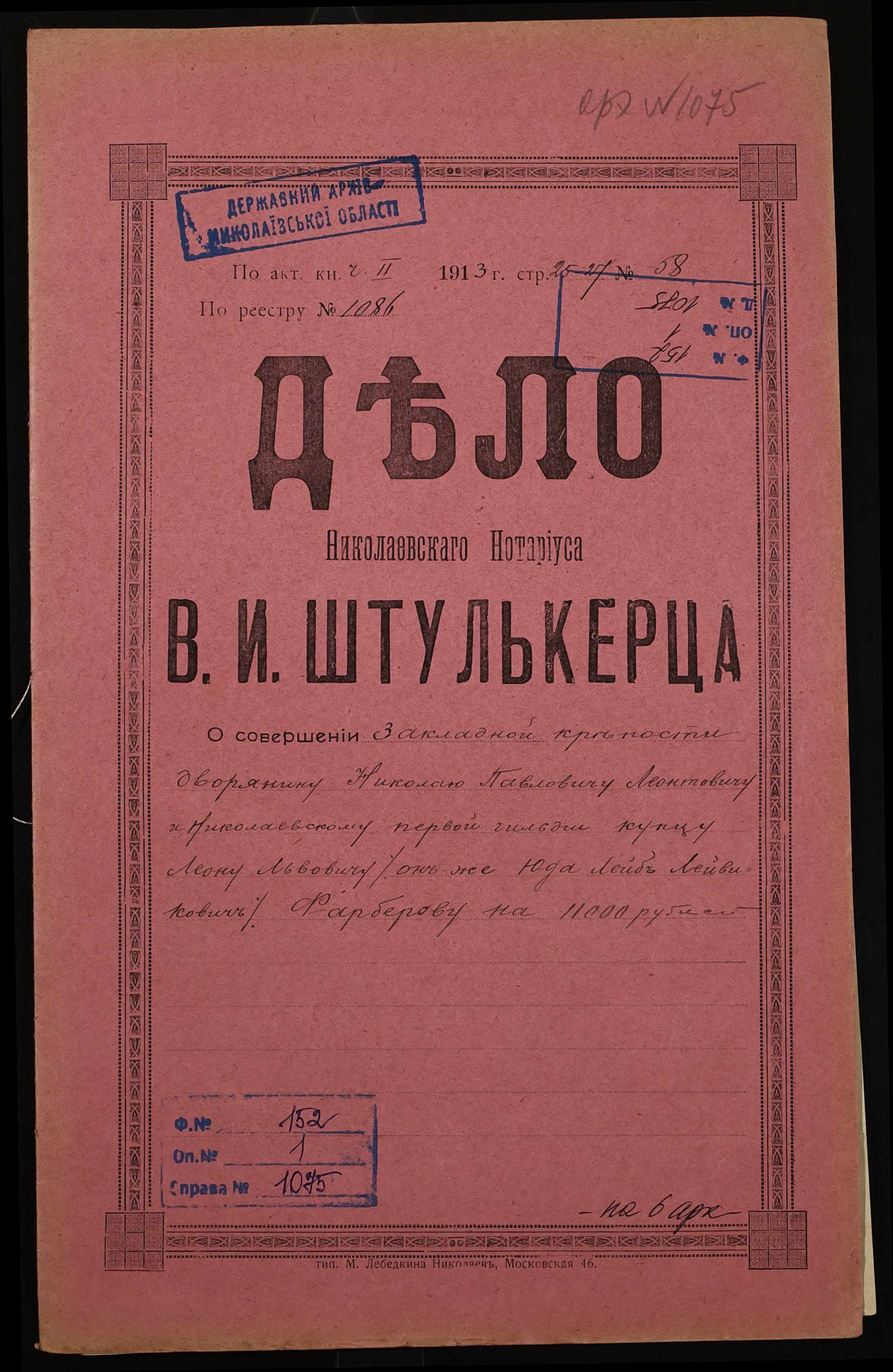 • • • • Справа № 1075 “Справа про вчинення заставної на нерухоме майно, закладене дворянином Леонтовичем Миколою Петровичем (Леонтовичем Николаем Петровичем) – миколаївському купцю 1-ї гільдії Фарберову Леону Львовичу (Фарберову Леону Львовичу) (він же Юда-Лейб Лейвикович (Юда-Лейб Лейвикович))”