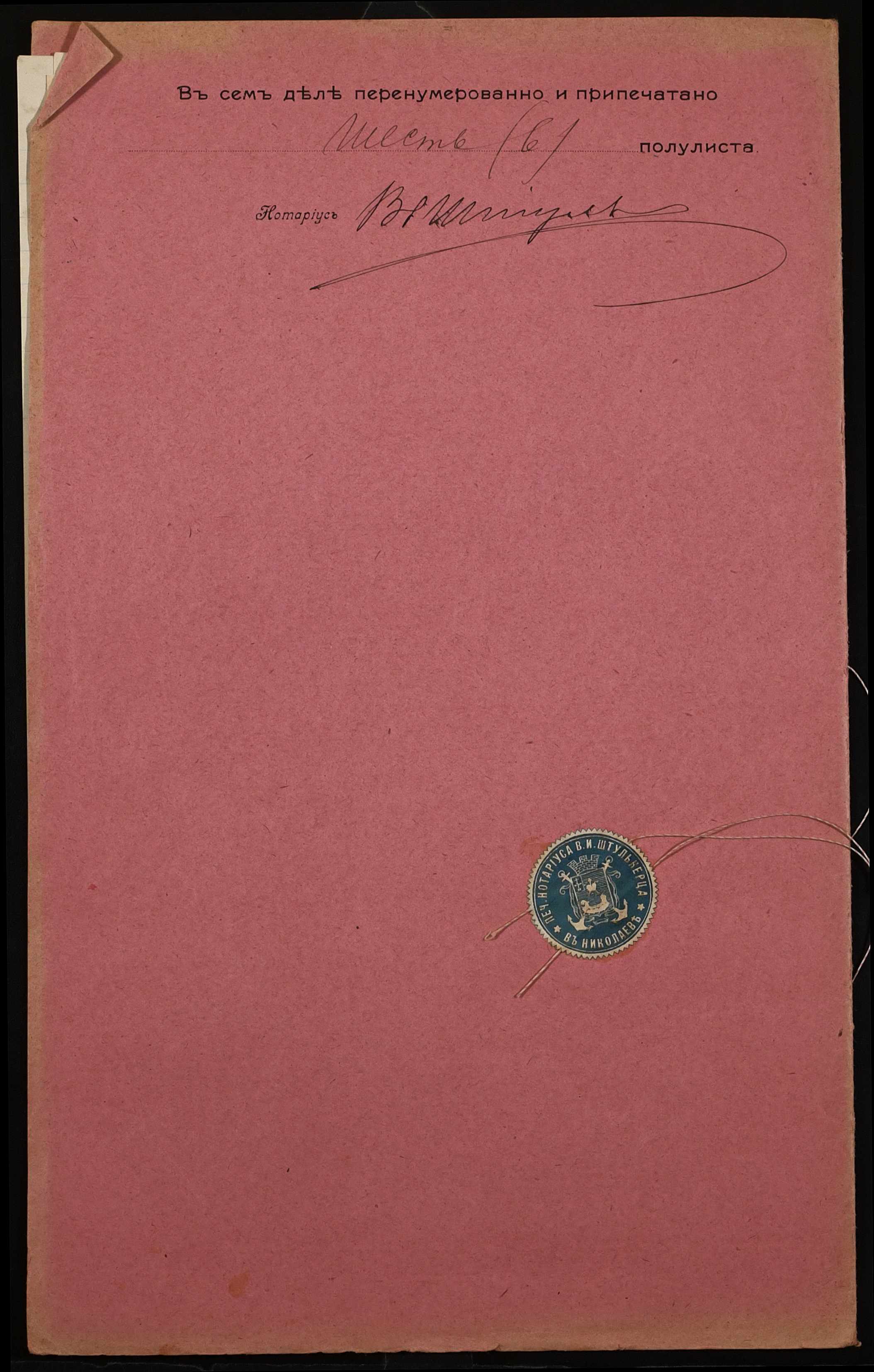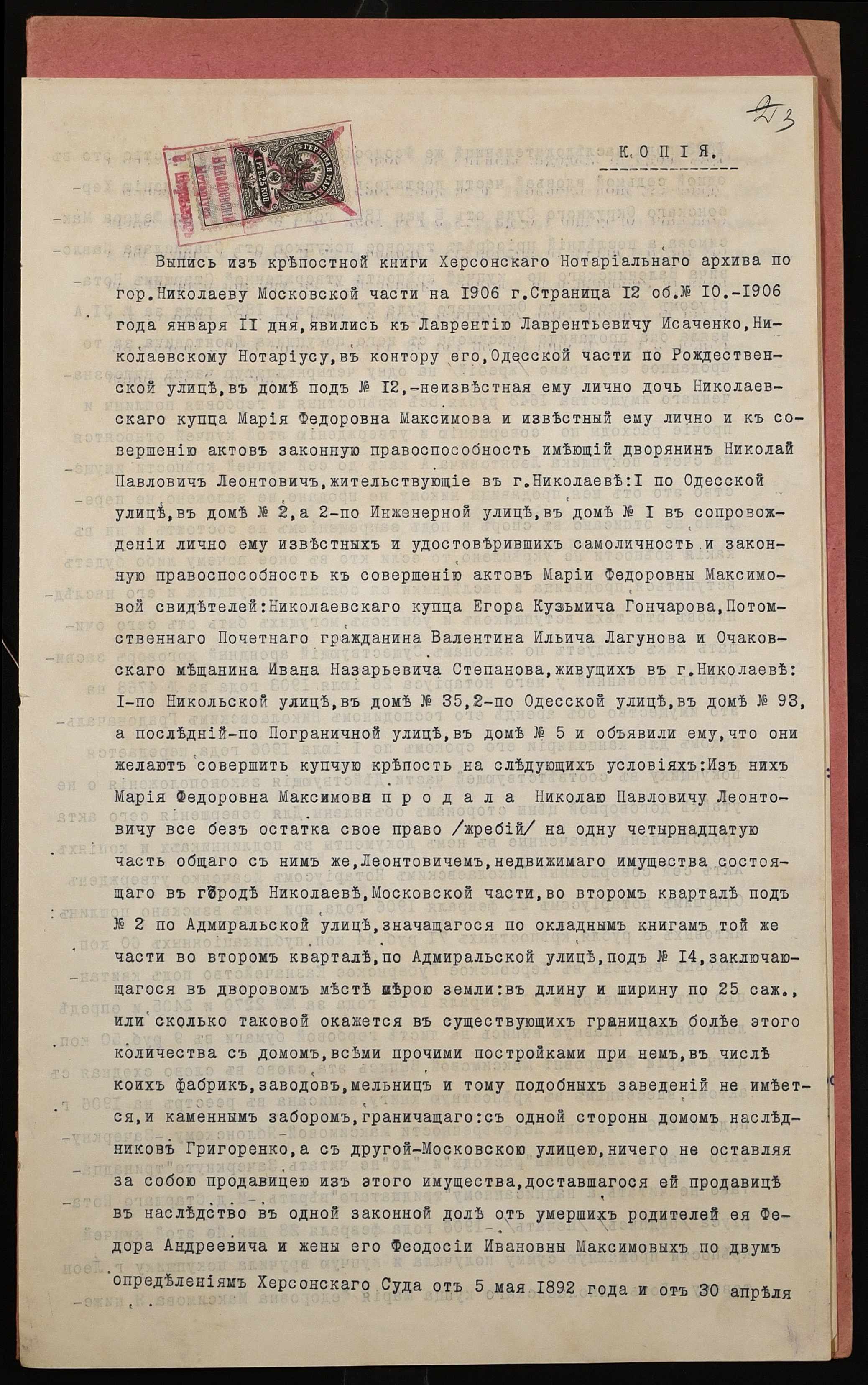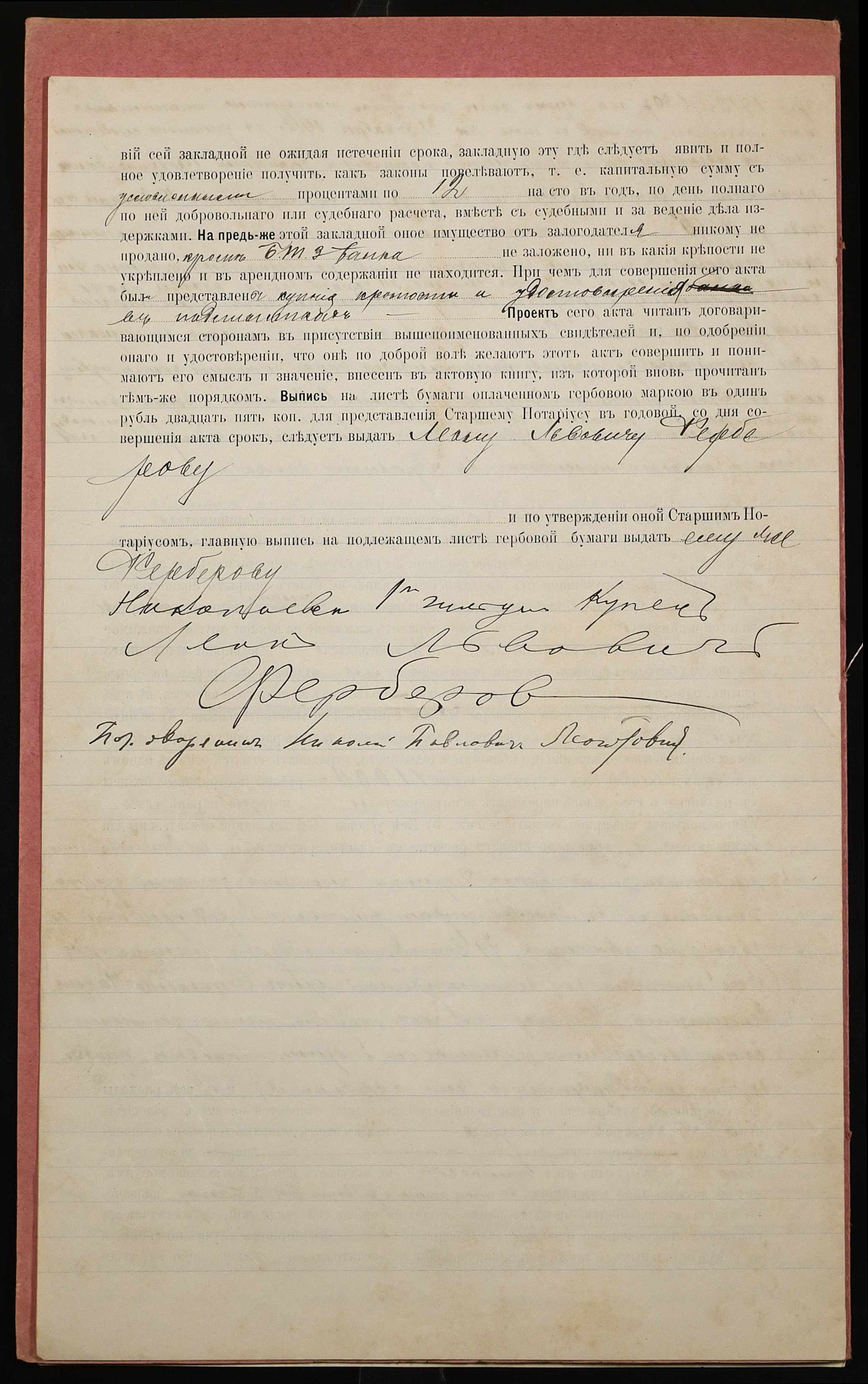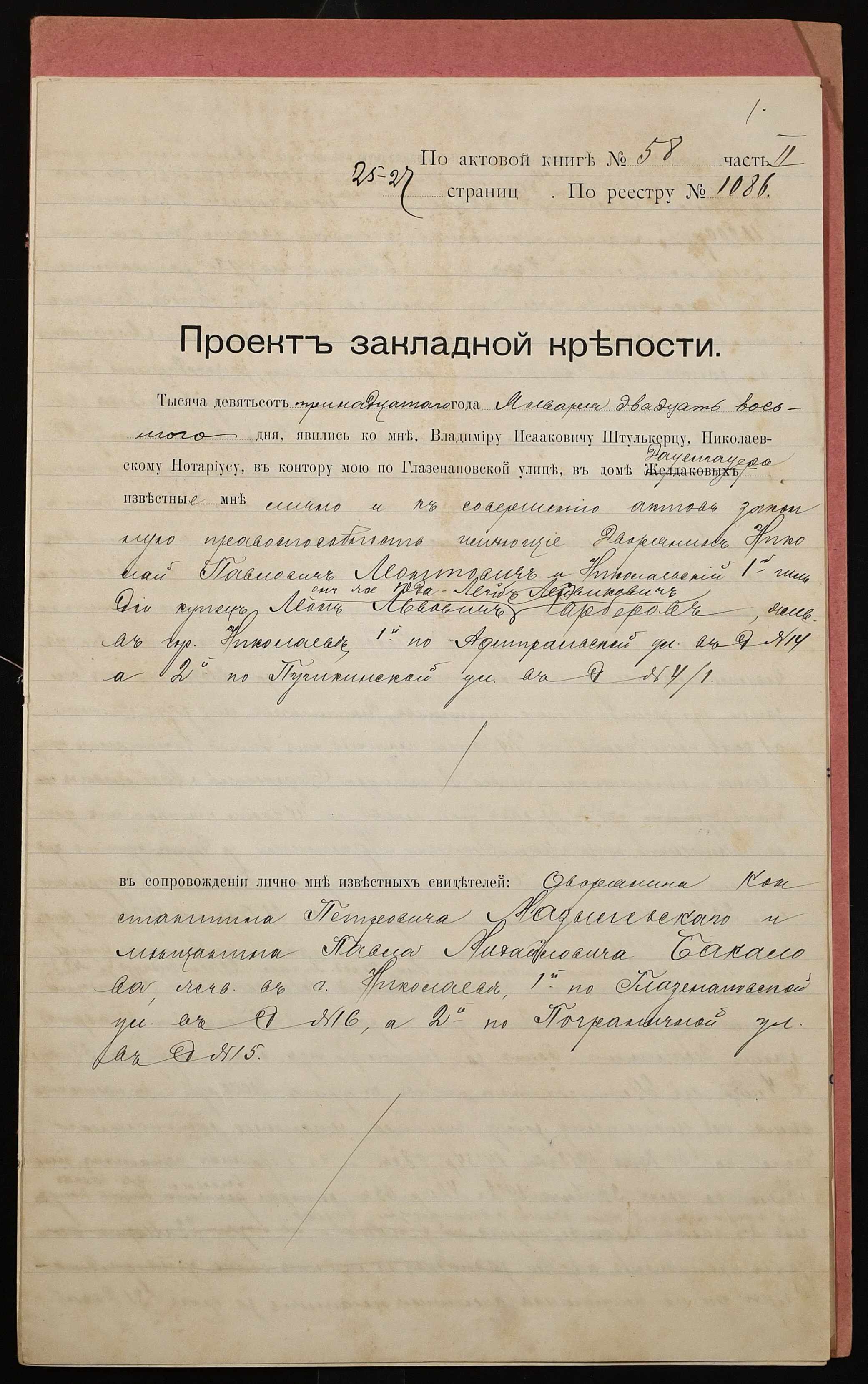 • • • • Справа № 1075 “Справа про вчинення заставної на нерухоме майно, закладене дворянином Леонтовичем Миколою Петровичем (Леонтовичем Николаем Петровичем) – миколаївському купцю 1-ї гільдії Фарберову Леону Львовичу (Фарберову Леону Львовичу) (він же Юда-Лейб Лейвикович (Юда-Лейб Лейвикович))”