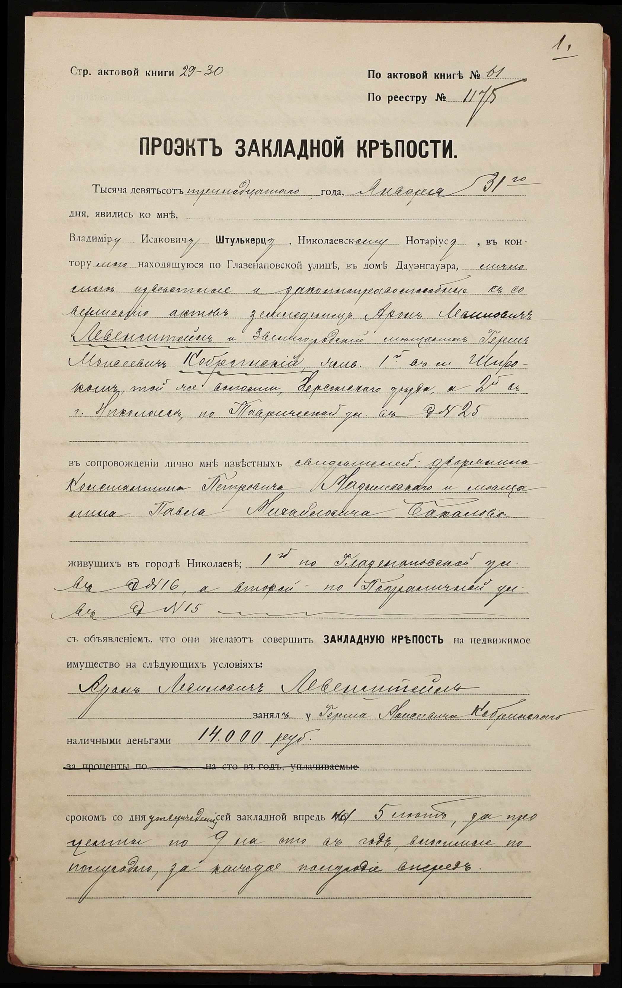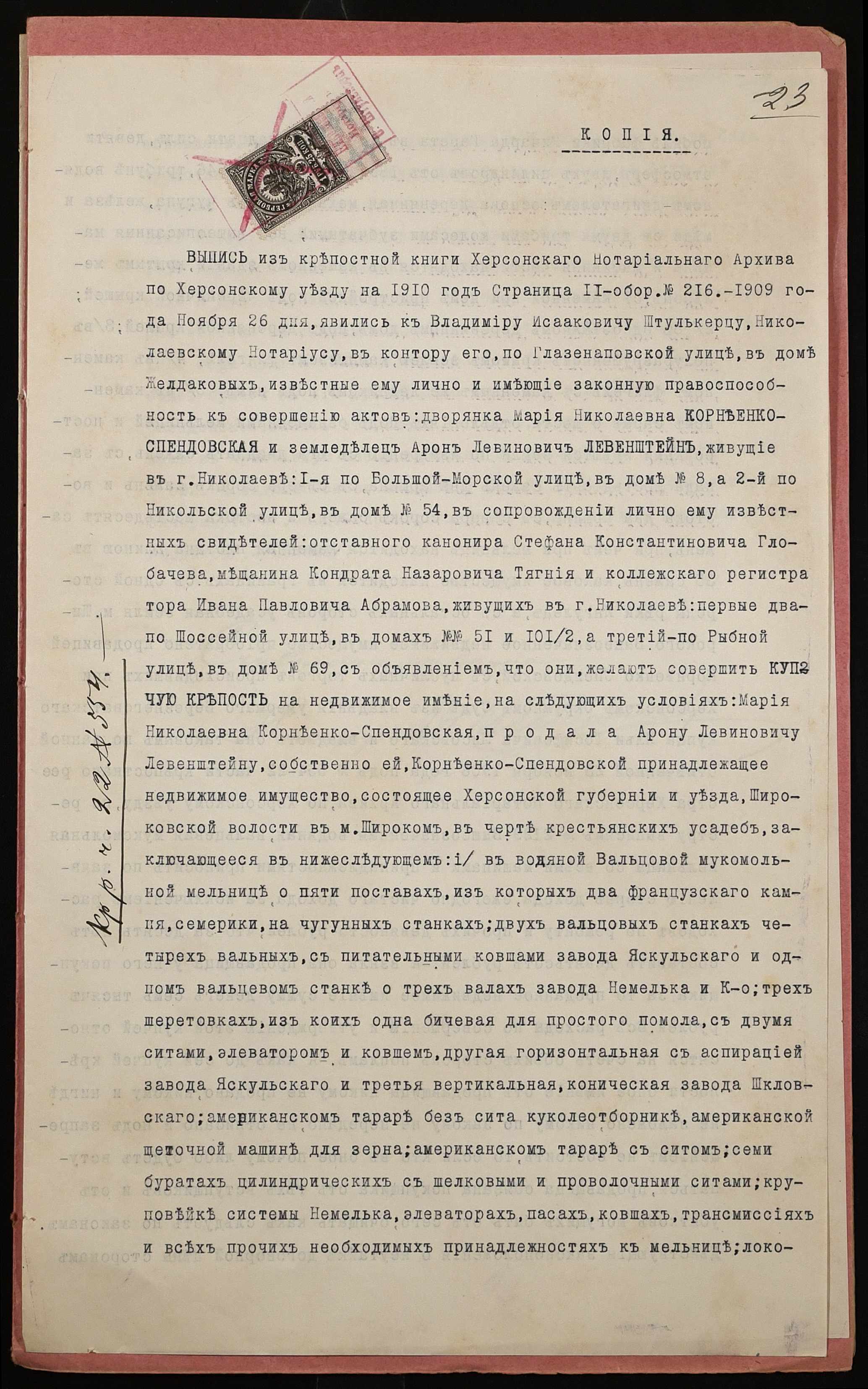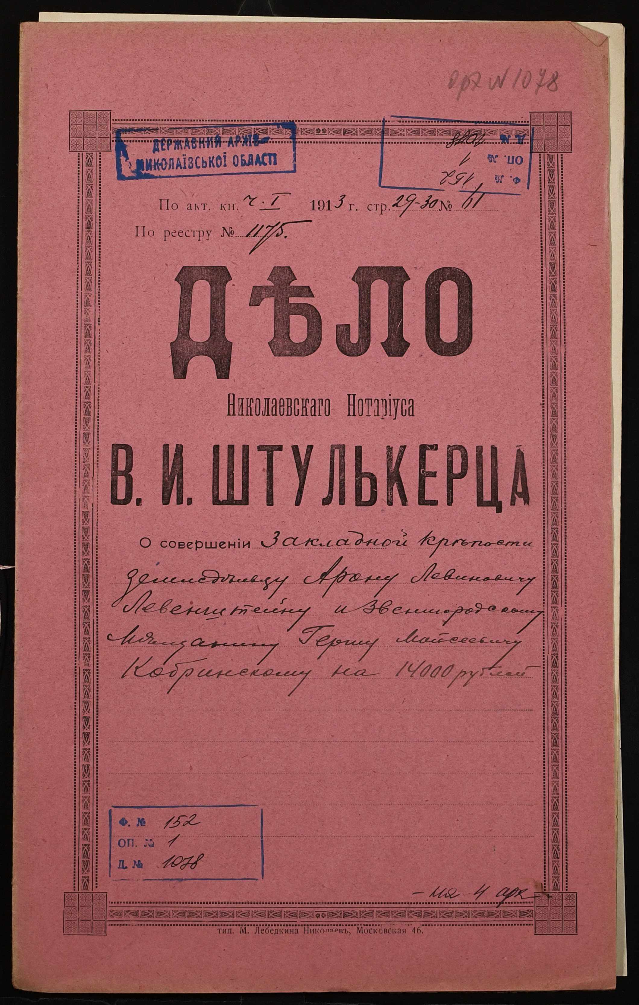 • • • • Справа № 1078 “Справа про вчинення заставної на нерухоме майно, закладене землеробом Левенштейном Ароном Левіновичем (Левенштейном Ароном Левиновичем) – звенигородському міщанину Кобринському Гершу Мойсейовичу (Кобринскому Гершу Моисеевичу)”