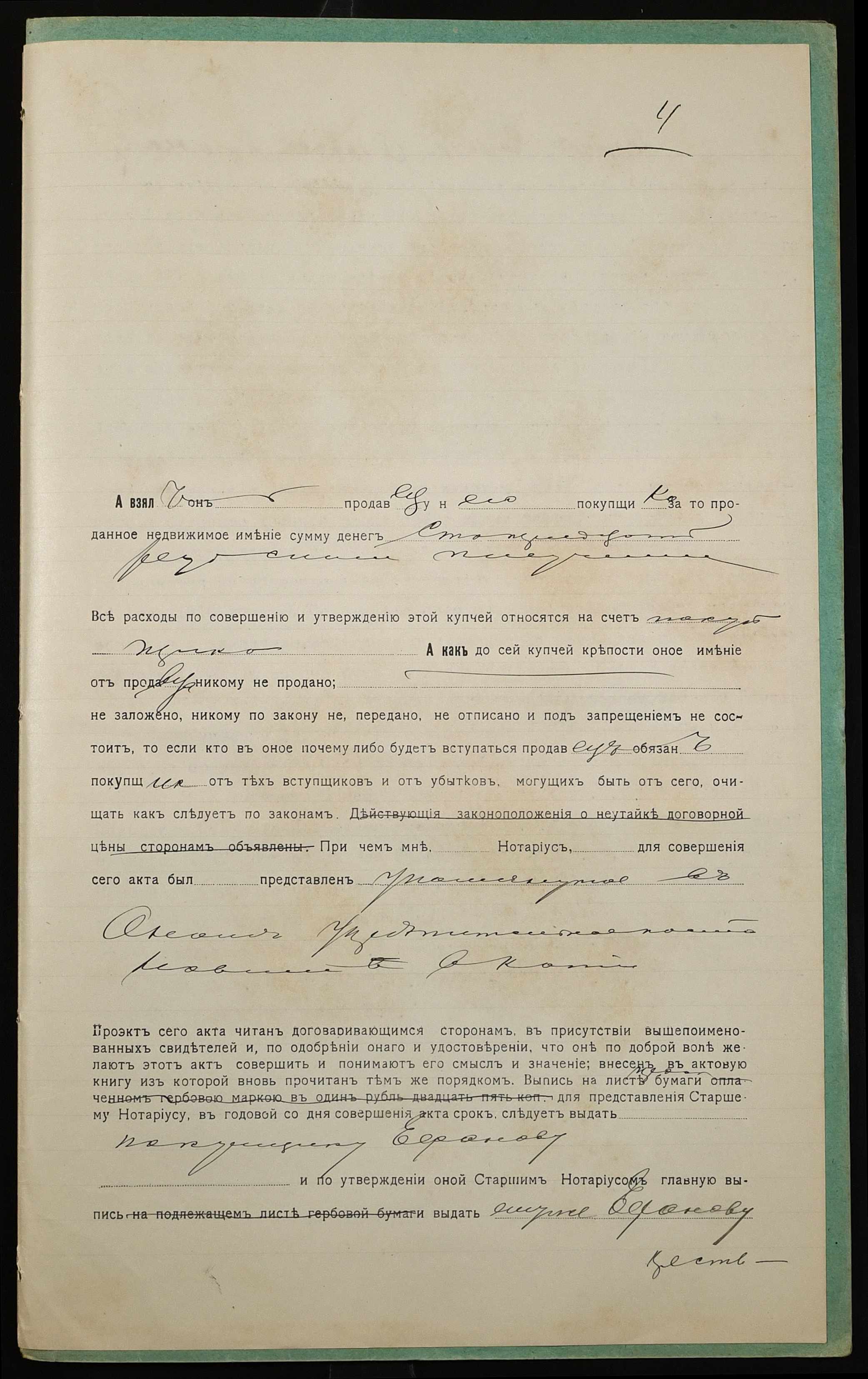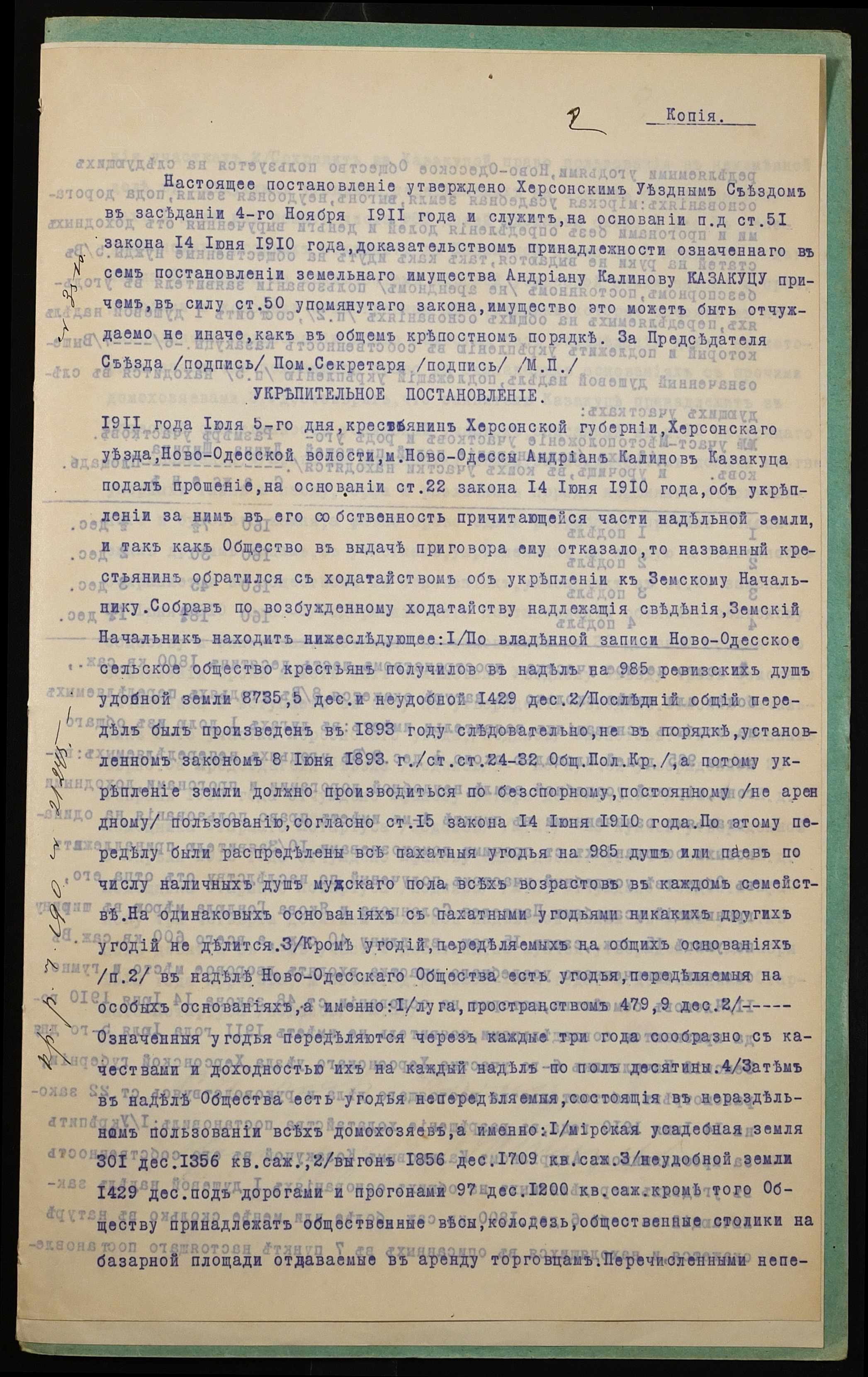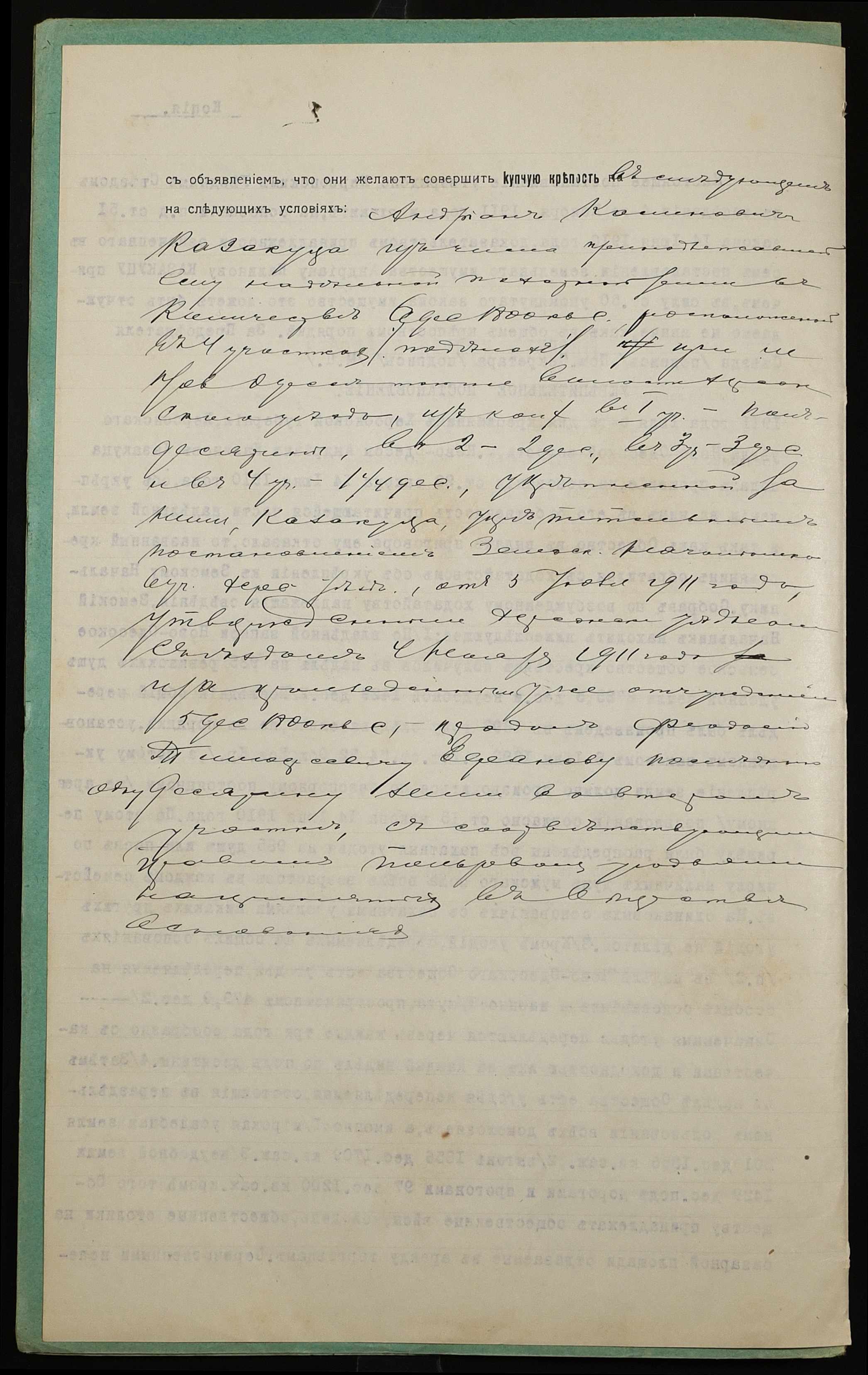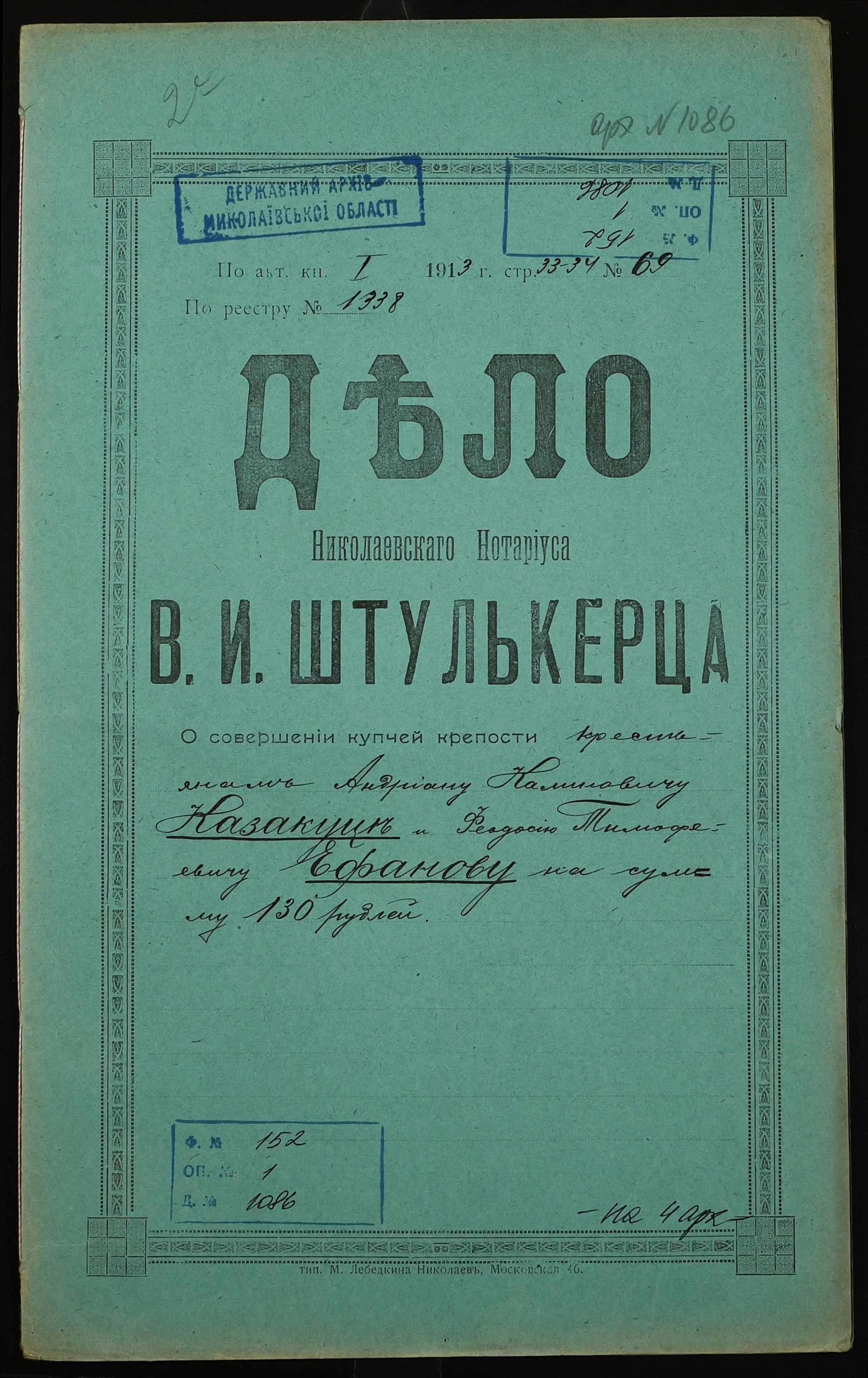 • • • • Справа № 1086 “Справа про вчинення купчої про продаж землі селянином Казакуцею Андріяном Калиновичем (Казакуцей Андрияном Калиновичем) на користь селянина Єфанова Феодосія Тимофійовича (Ефанова Феодосия Тимофеевича)”