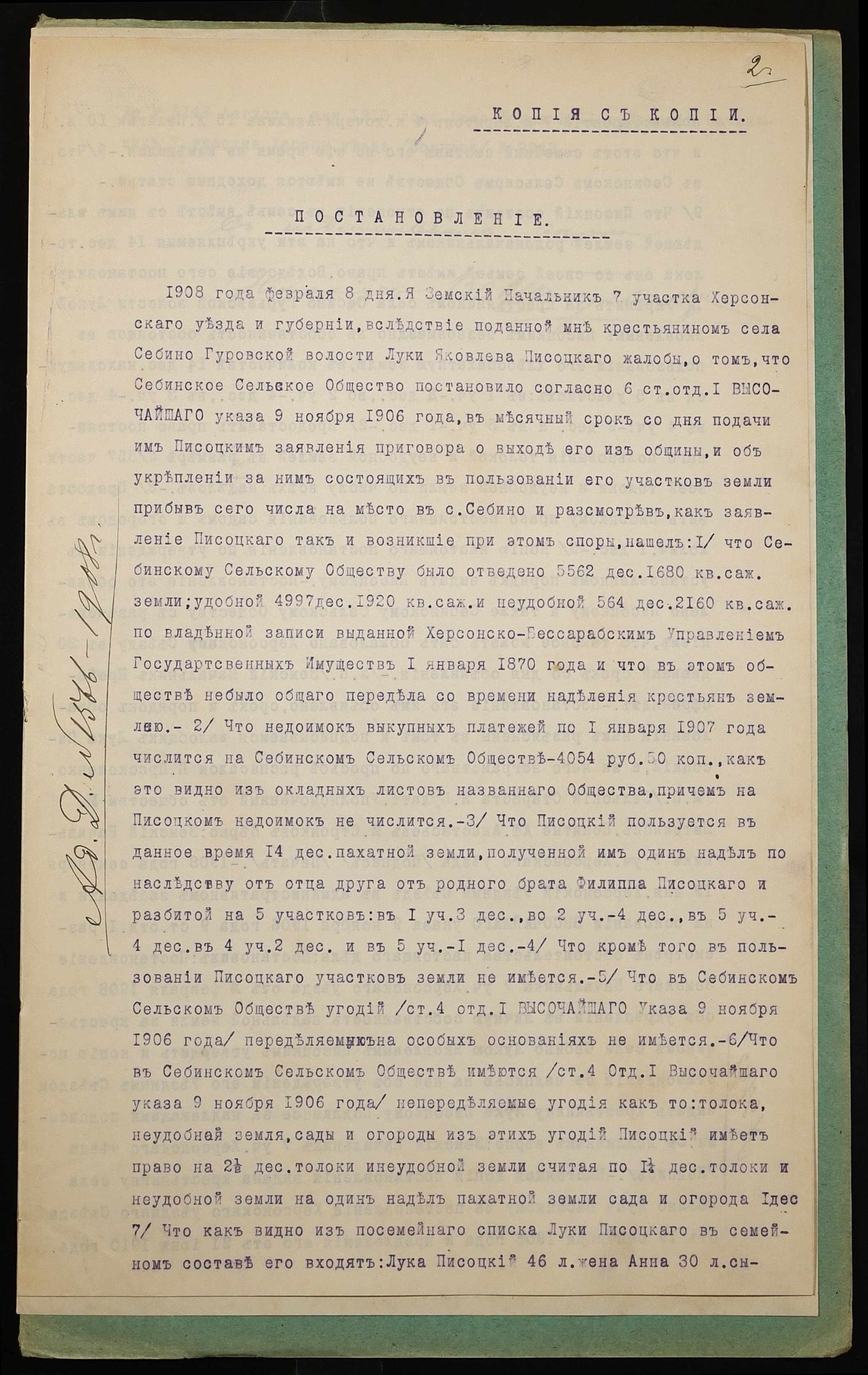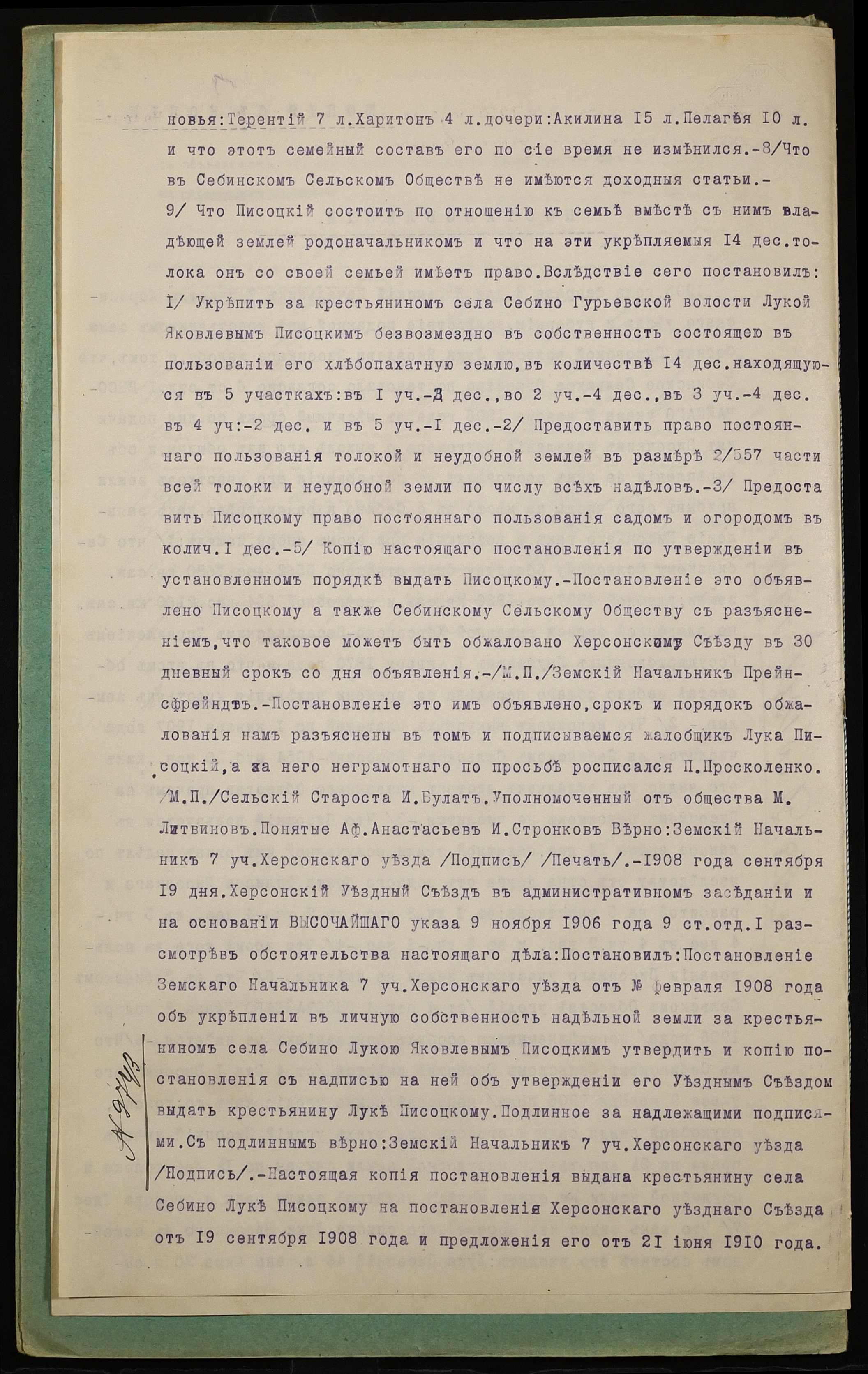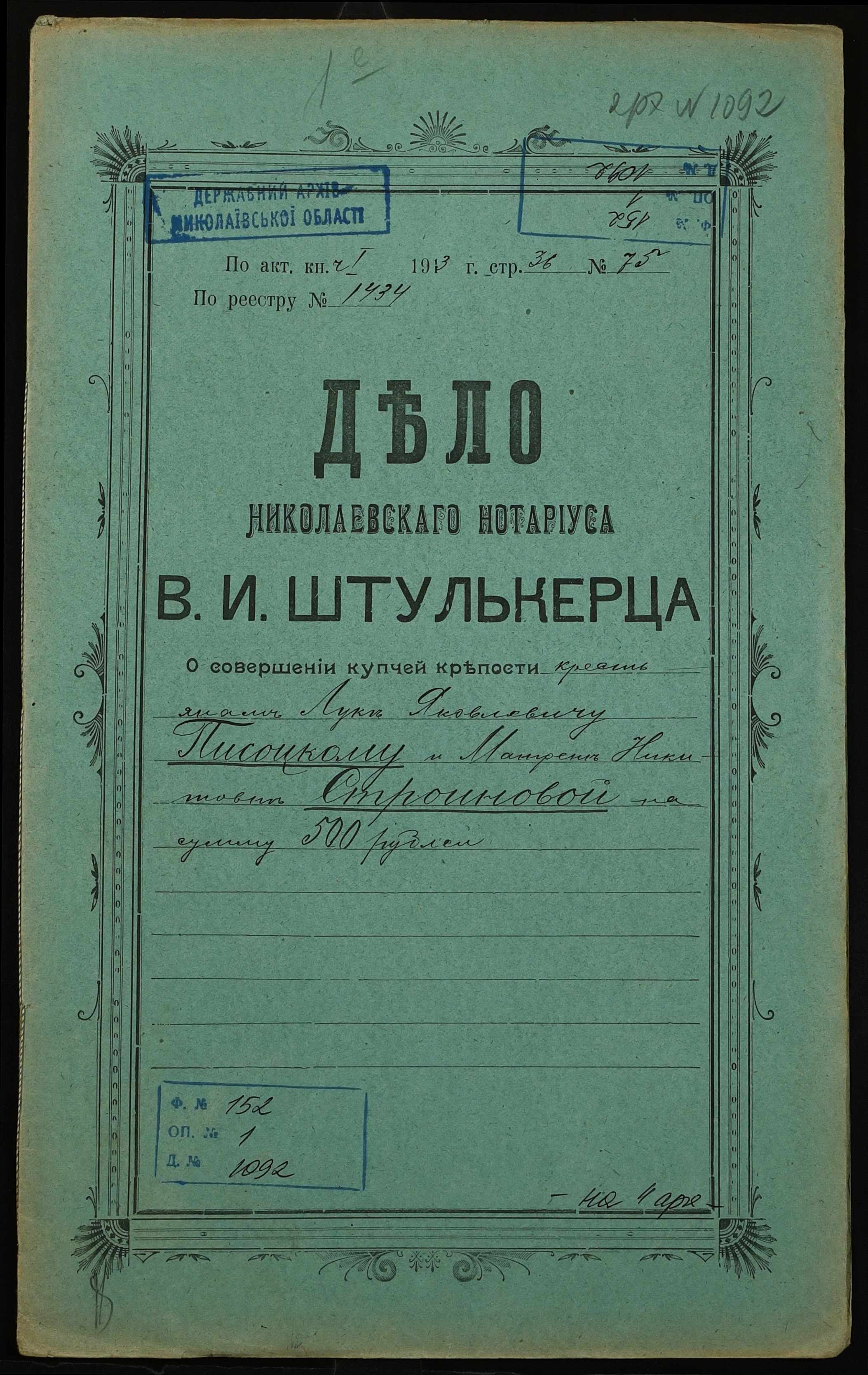 • • • • Справа № 1092 “Справа про вчинення купчої про продаж землі селянином Пісоцьким Лукою Яковичем (Писоцким Лукой Яковлевичем) на користь селянки Строїнової Матрони Микитівни (Строиновой Матрены Никитовны)”