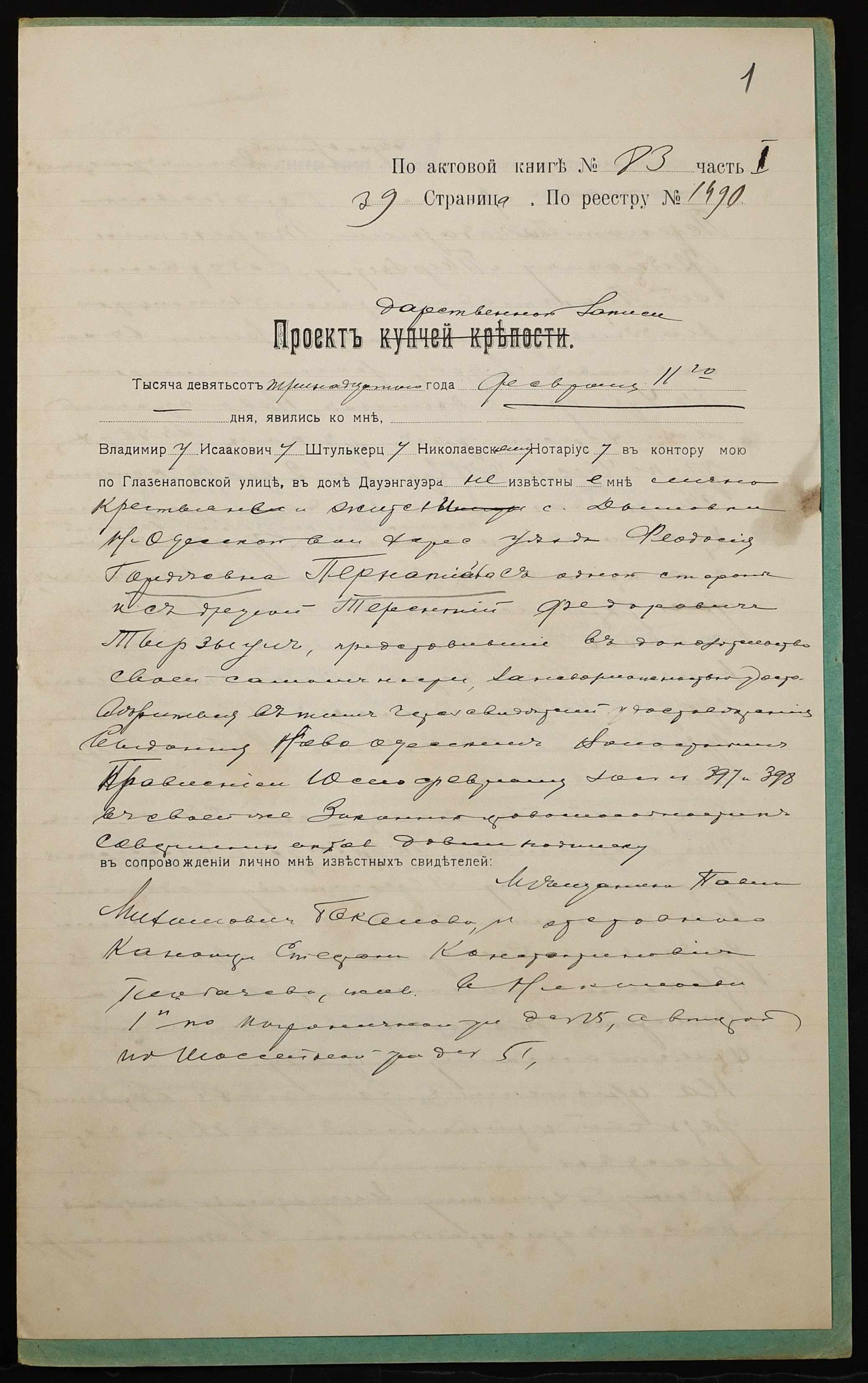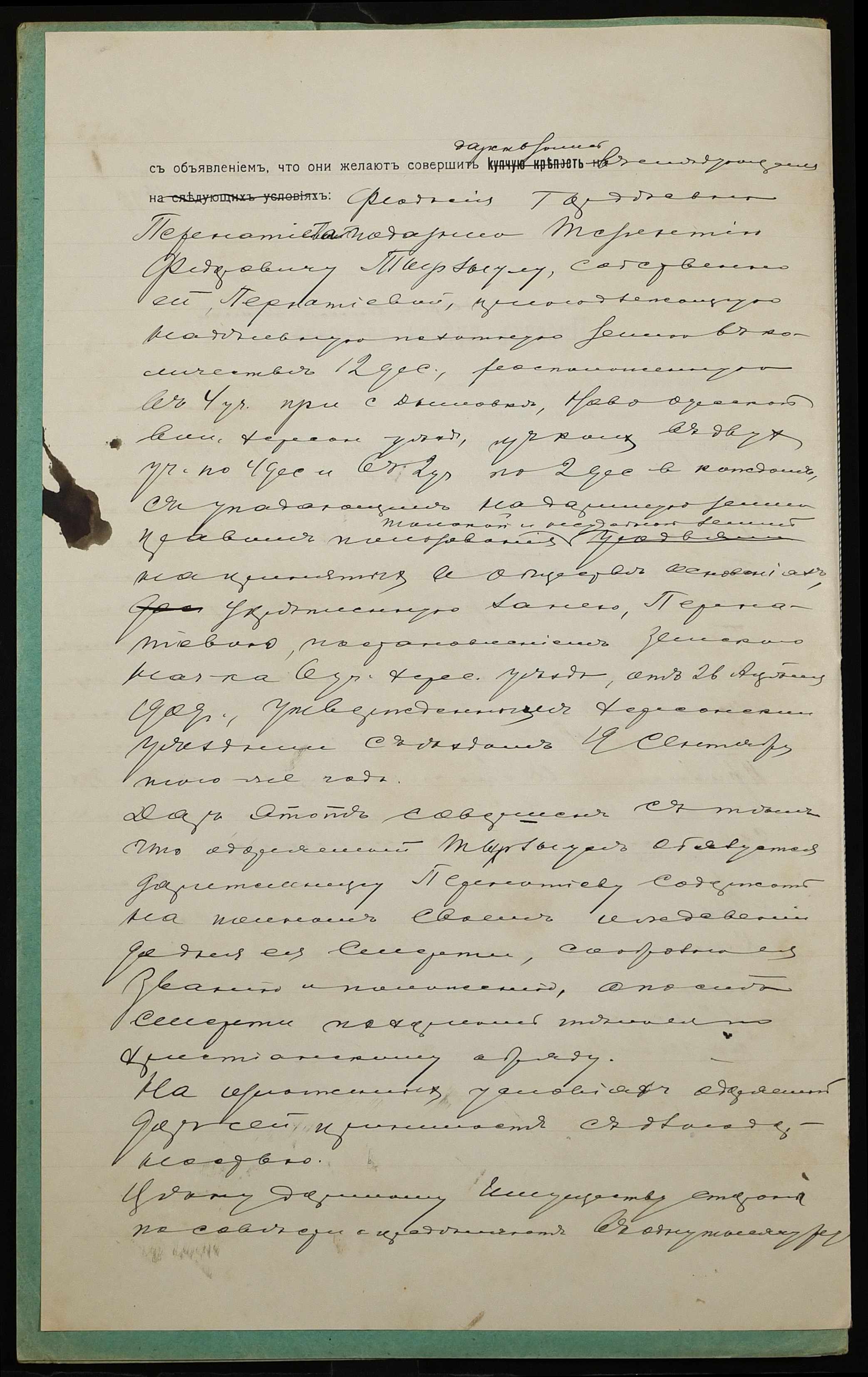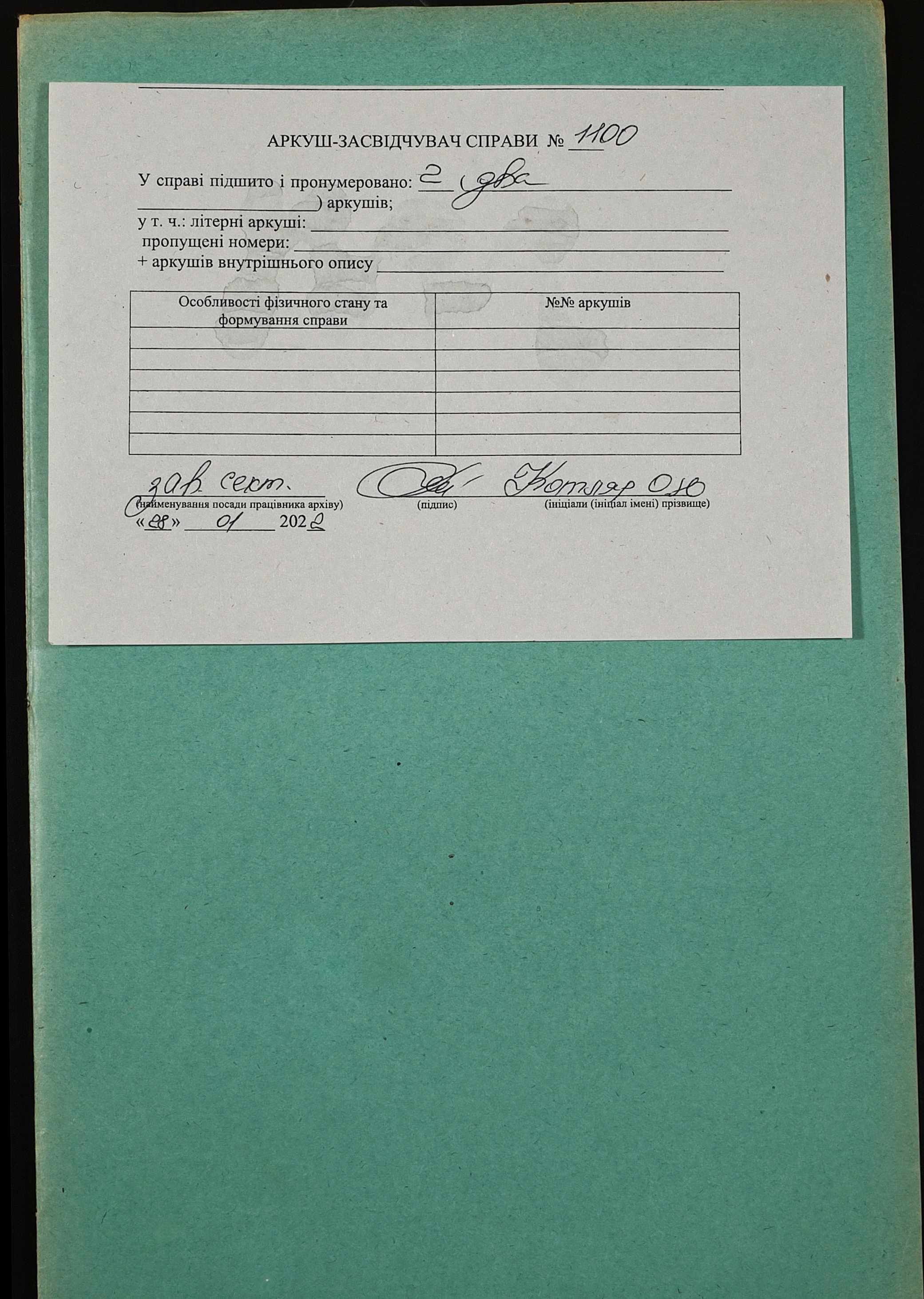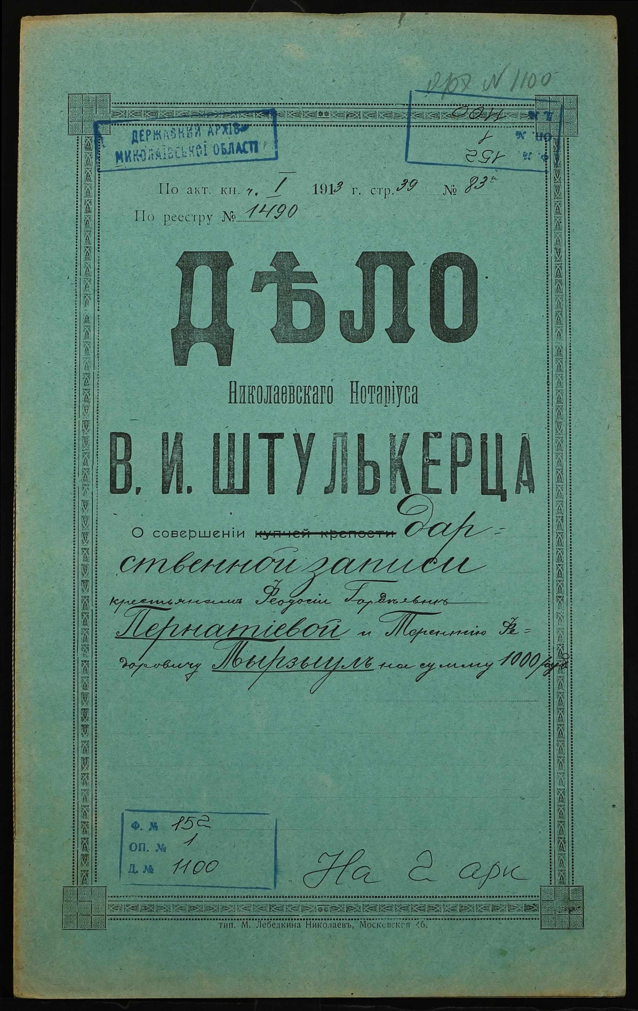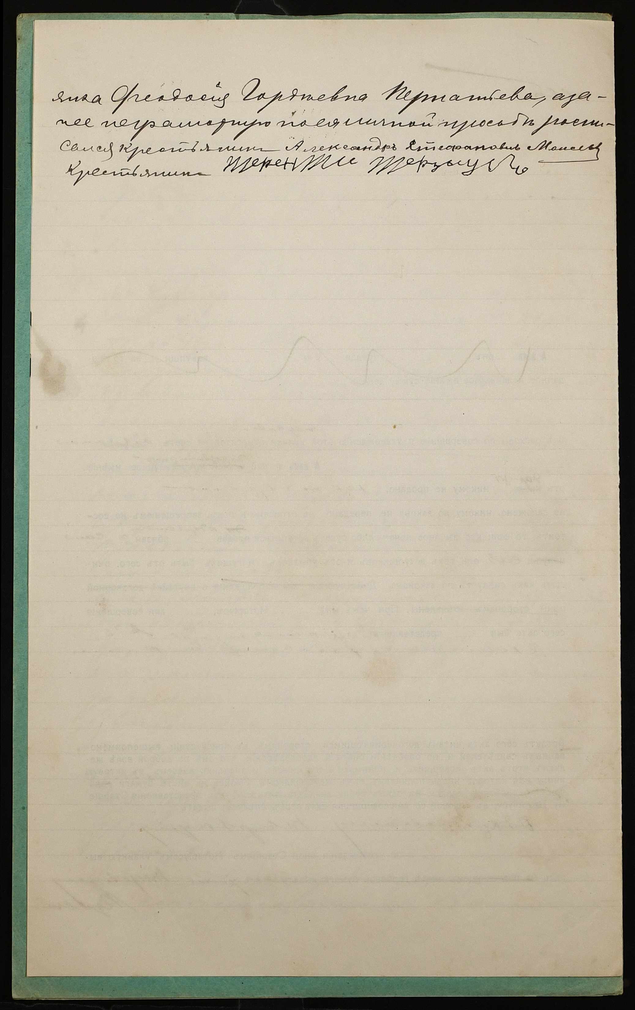 • • • • Справа № 1100 “Справа про вчинення дарчого запису на землю, передану селянкою Пернатієвою Феодосією Гордіївною (Пернатиевой Феодосией Гордеевной) у власність селянина Тирзиул Терентія Федоровича (Тырзыул Терентия Федоровича)”