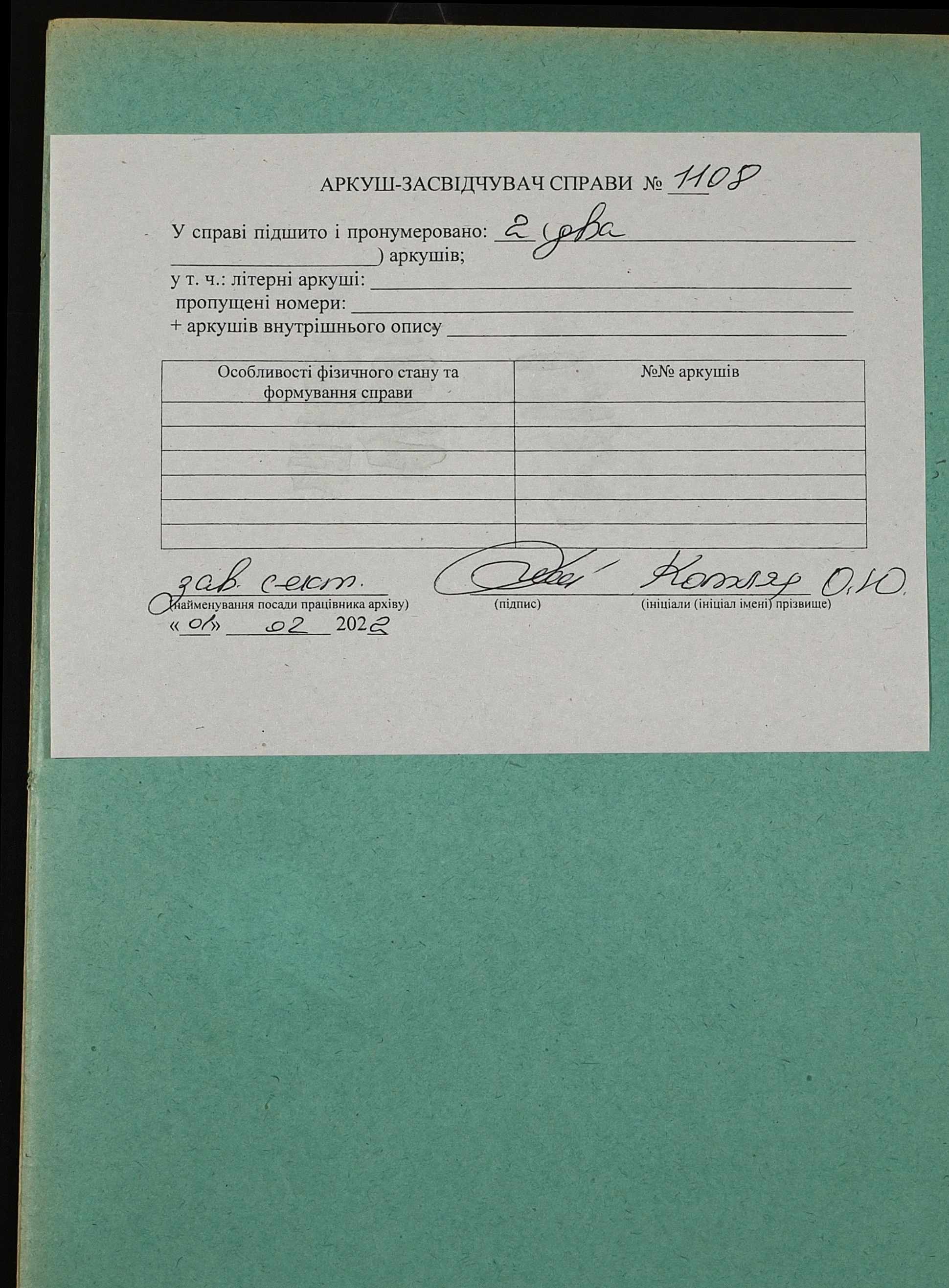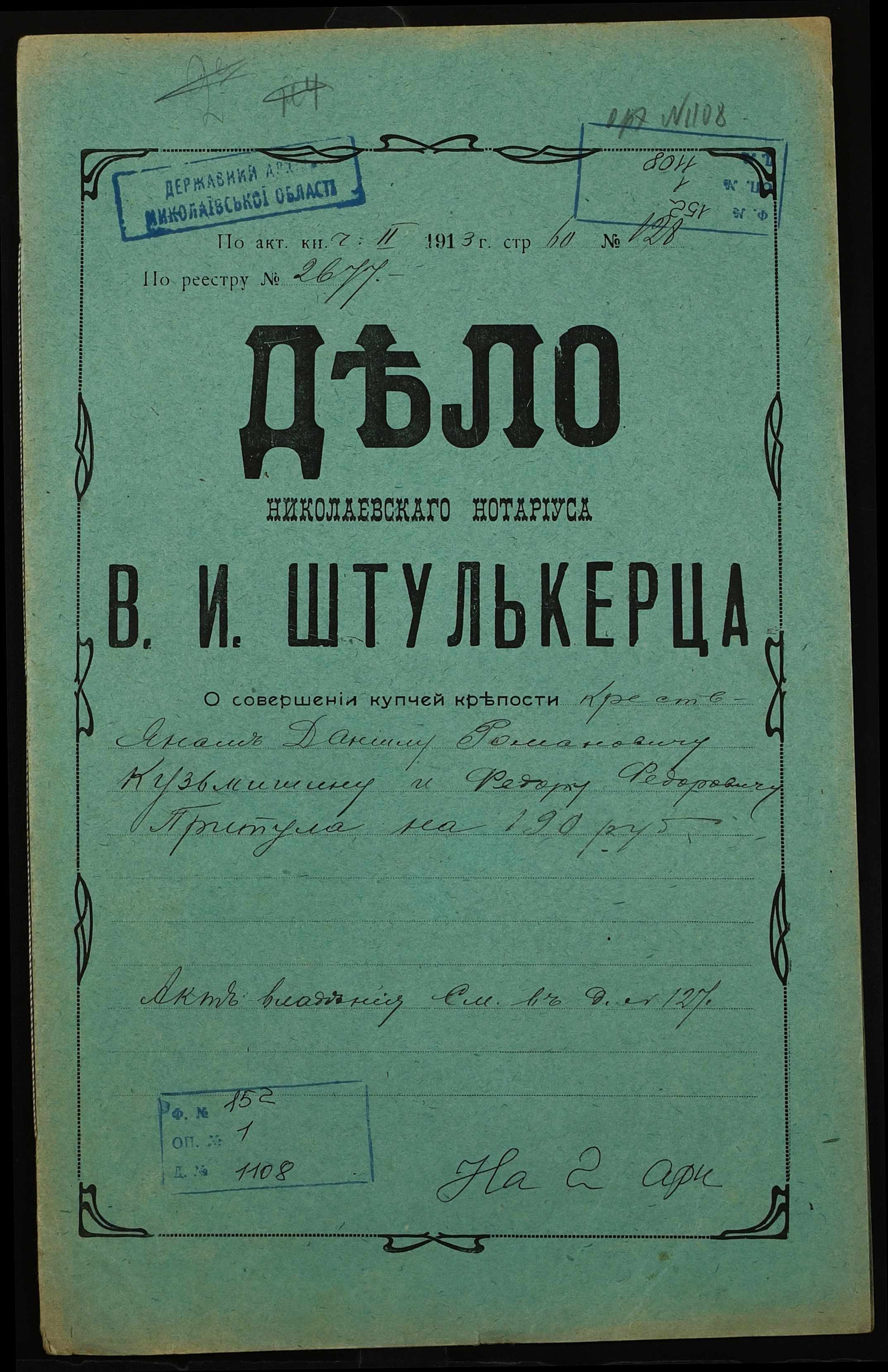 • • • • Справа № 1108 “Справа про вчинення купчої про продаж землі селянином Кузьмишиним Даниїлом Романовичем (Кузьмишиным Даниилом Романовичем) на користь селянина Притули Федора Федоровича (Притулы Федора Федоровича)”