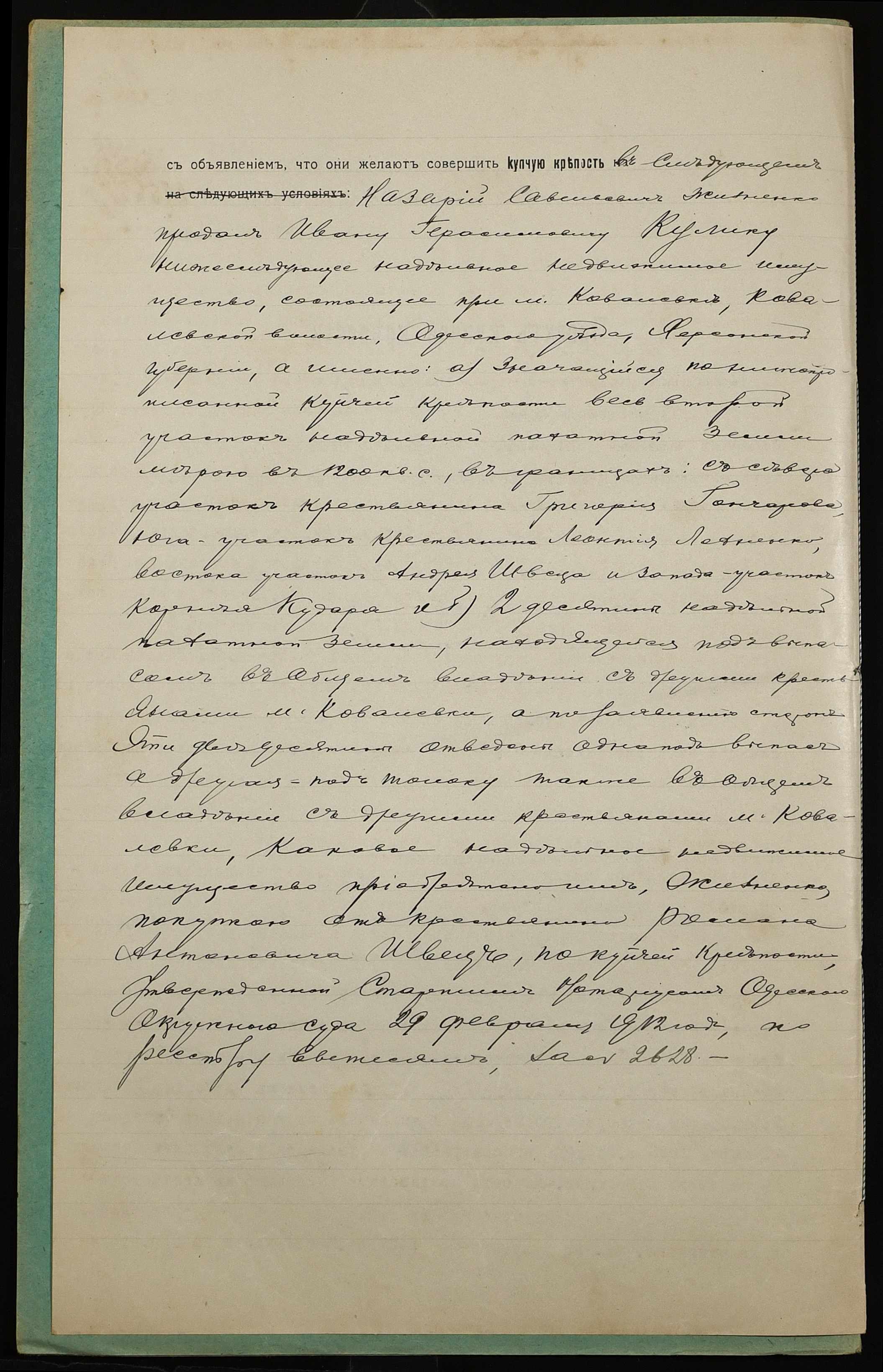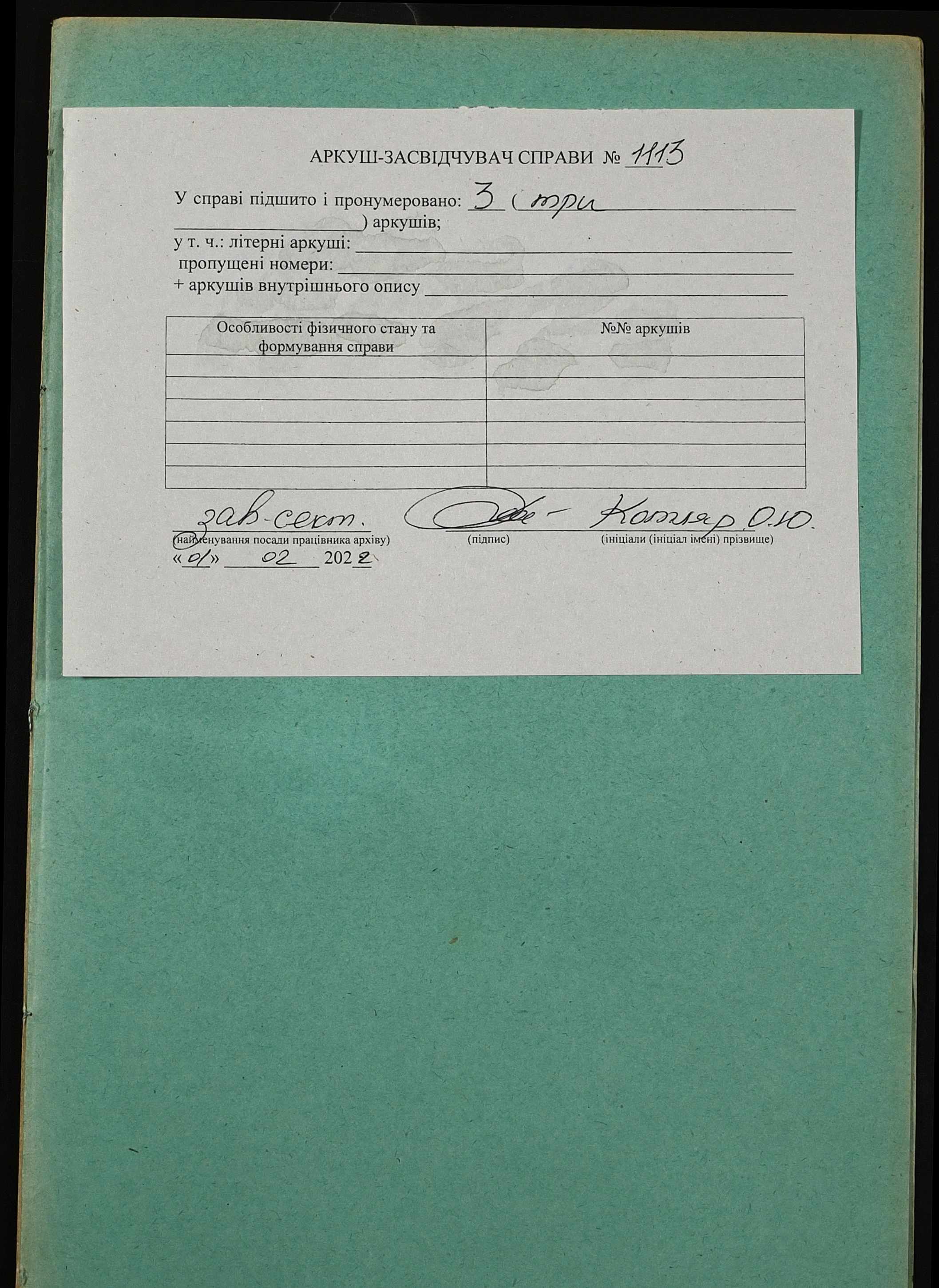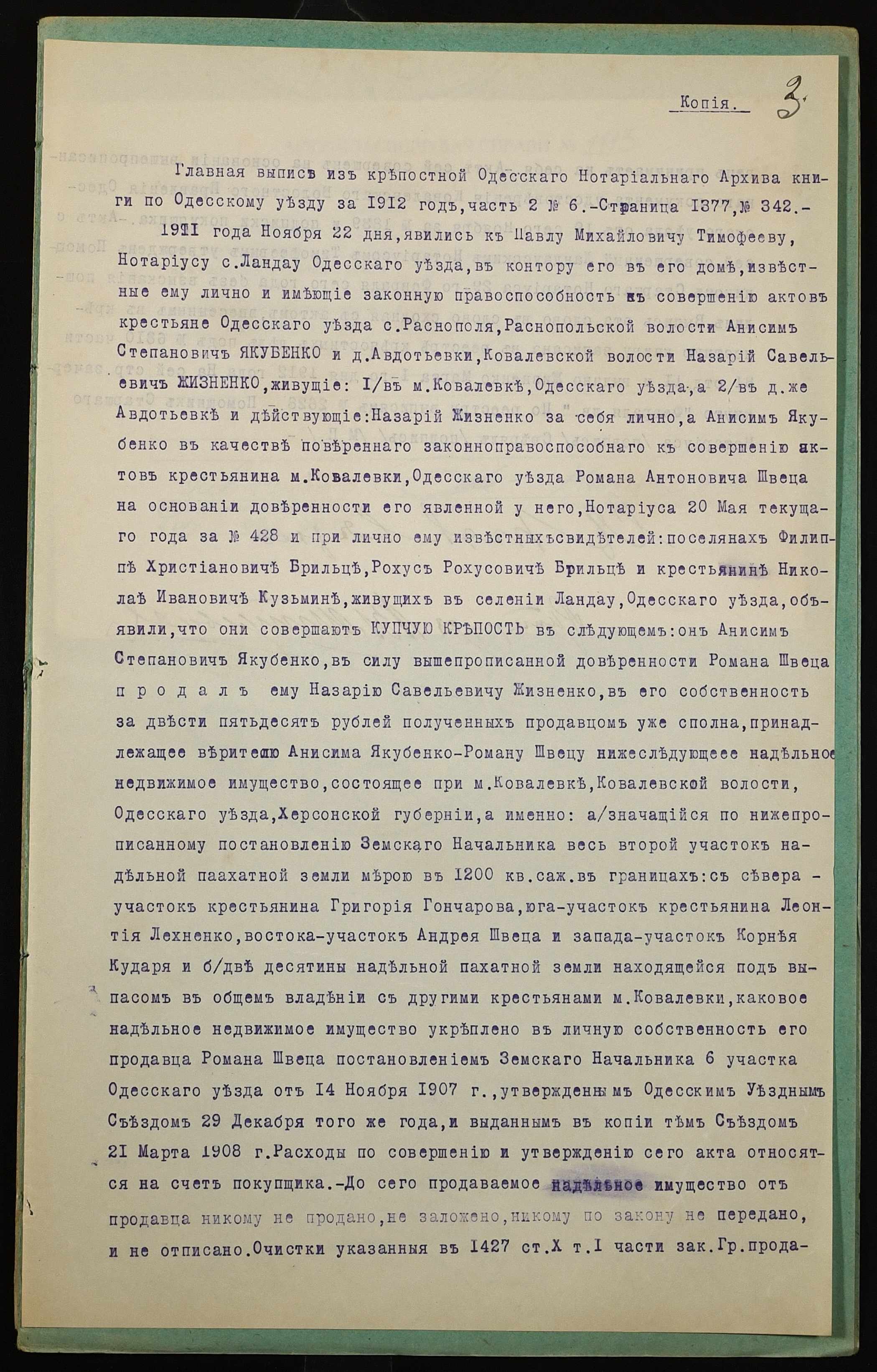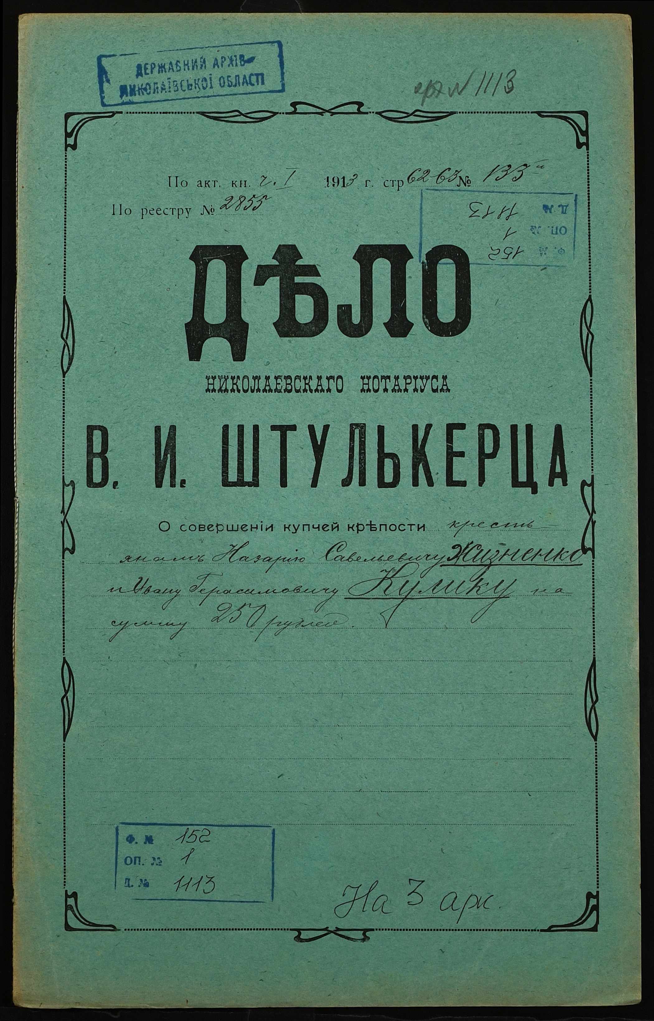 • • • • Справа № 1113 “Справа про вчинення купчої про продаж землі селянином Жизненком Назарієм Савелійовичем (Жизненко Назарием Савельевичем) на користь селянина Кулика Івана Герасимовича (Кулика Ивана Герасимовича)”