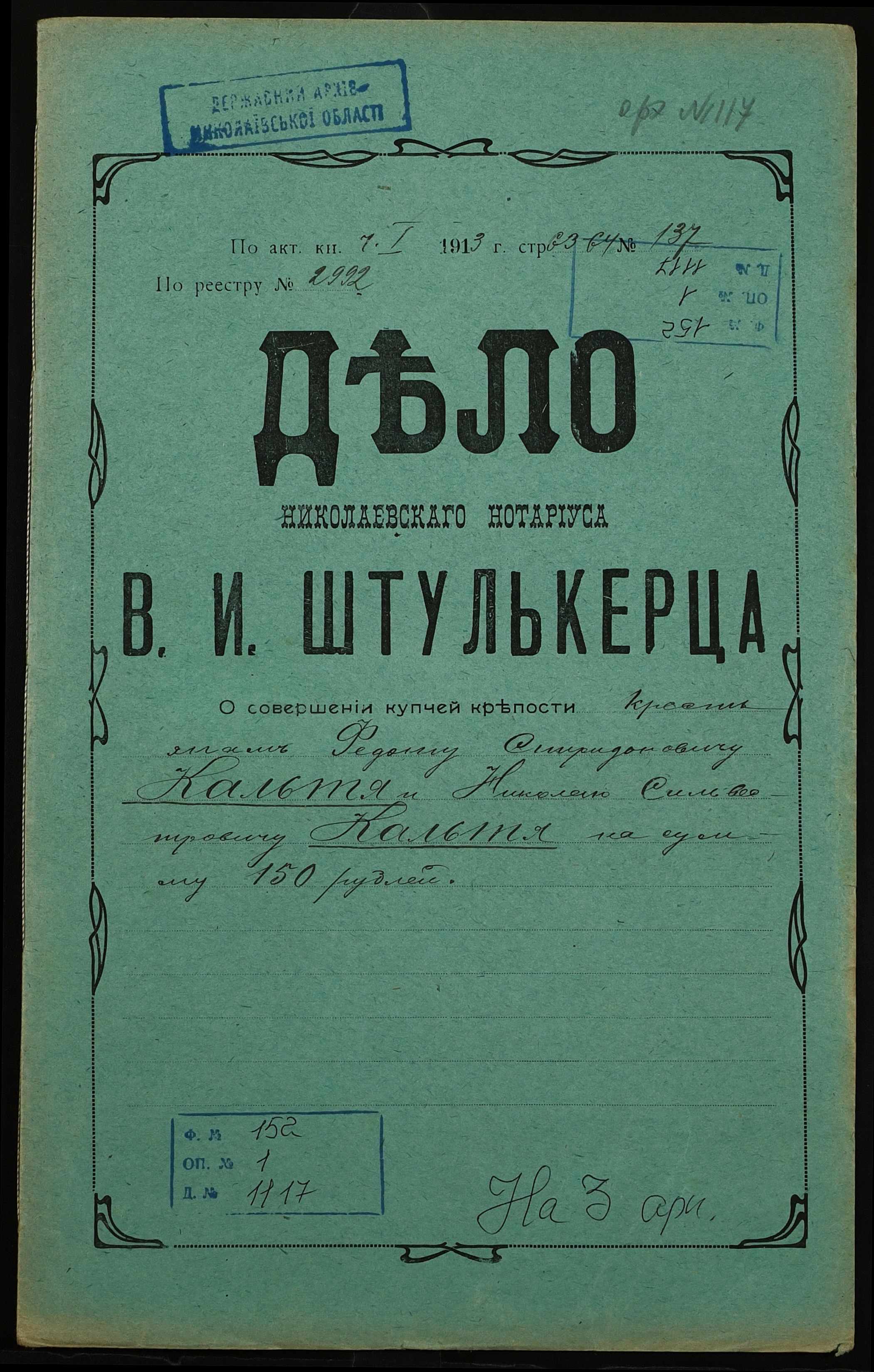 ◦ ◦ Фонд № 152 “Контора миколаївського нотаріуса Херсонського окружного суду Штулькерца Володимира Ісааковича”