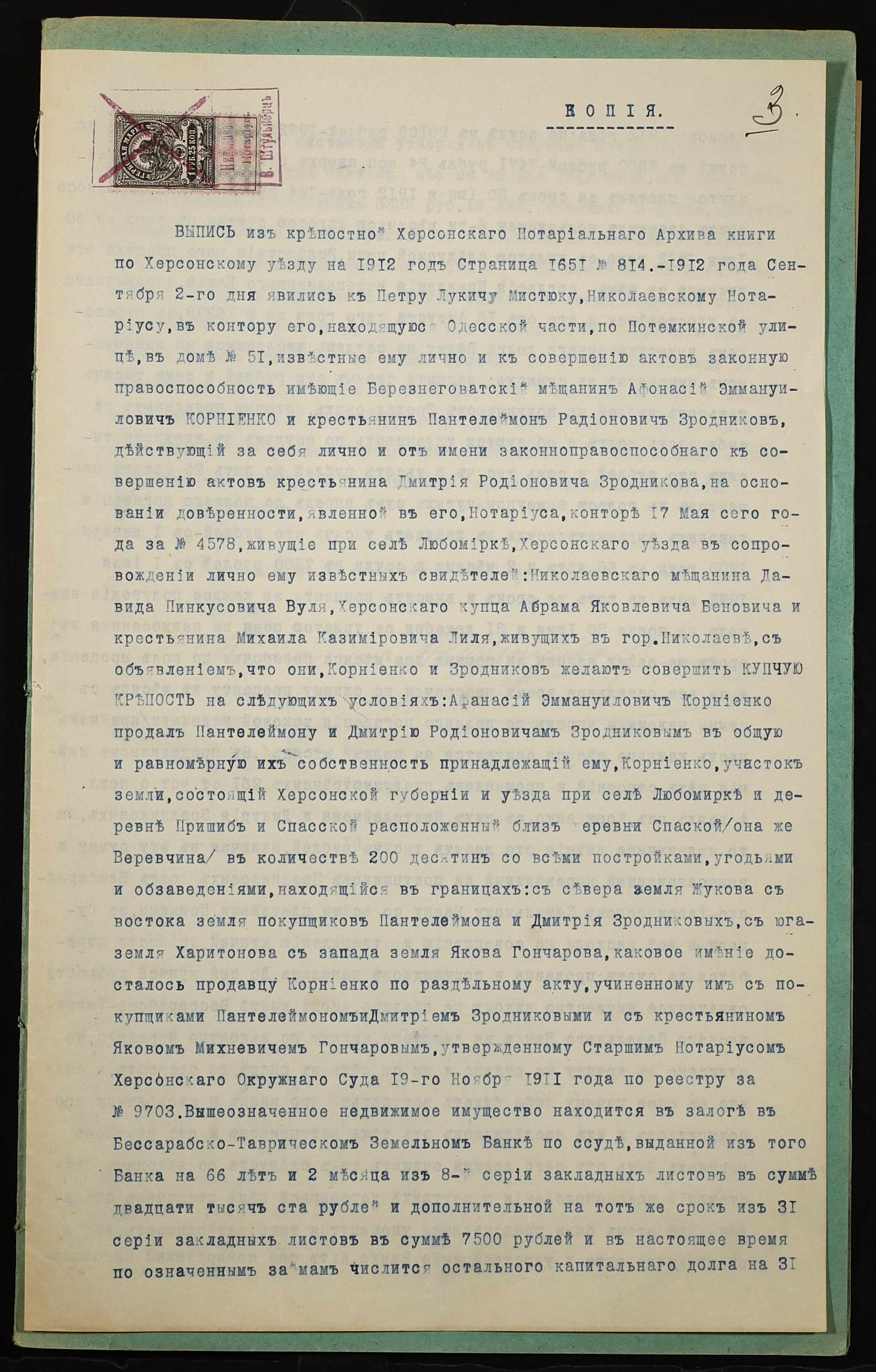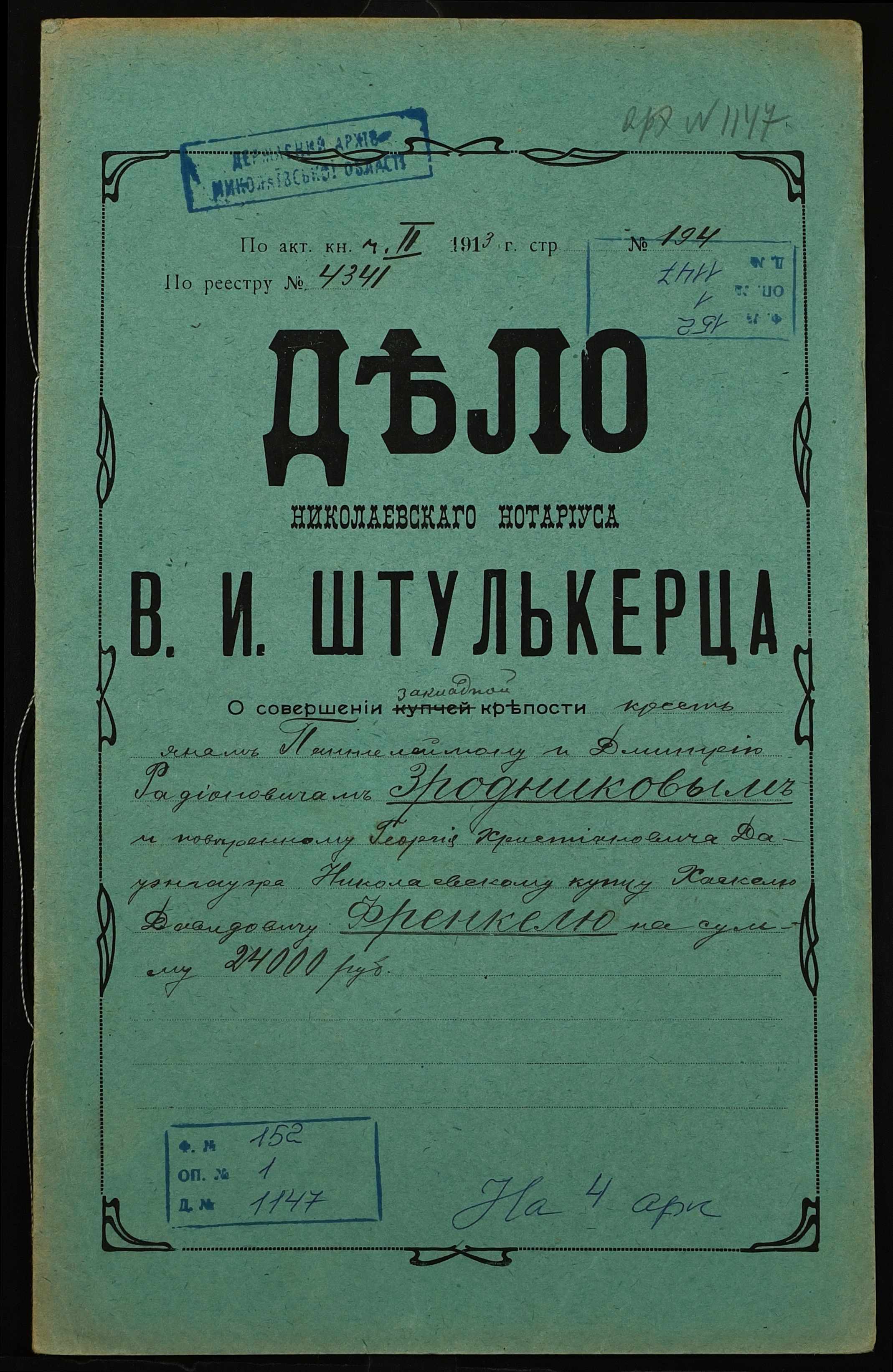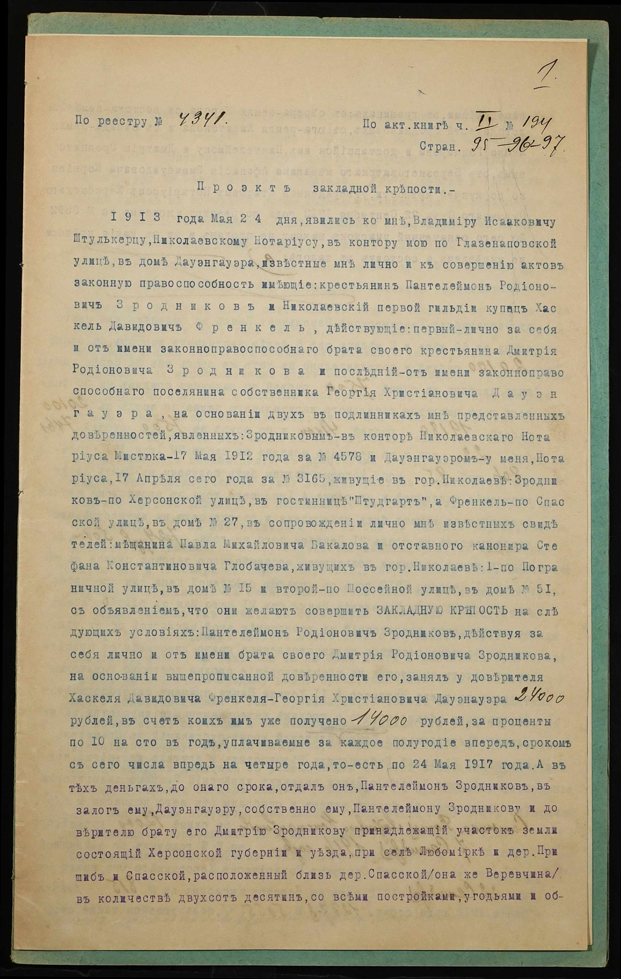 • • • • Справа № 1147 “Справа про вчинення заставної на землю, закладену селянами Зродниковими Пантелеймоном і Дмитром Родіоновичами (Зродниковыми Пантелеймоном и Дмитрием Радионовичами) – миколаївському купцю Френкелю Хаскелю Давидовичу (Френкелю Хаскелю Давидовичу), повіреному Дауенгауера Георгія Християновича (Дауэнгауэра Георгия Христяновича)”