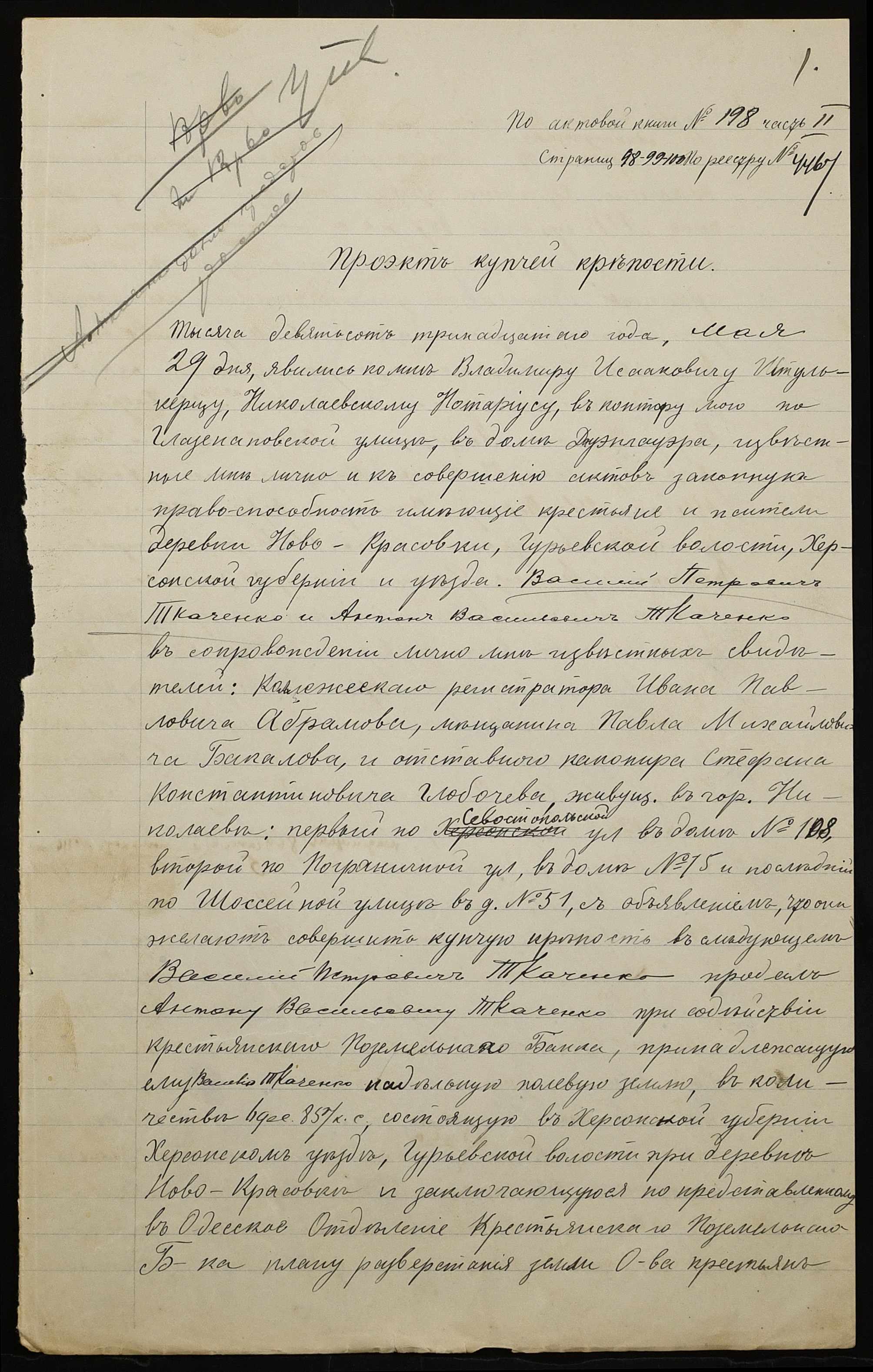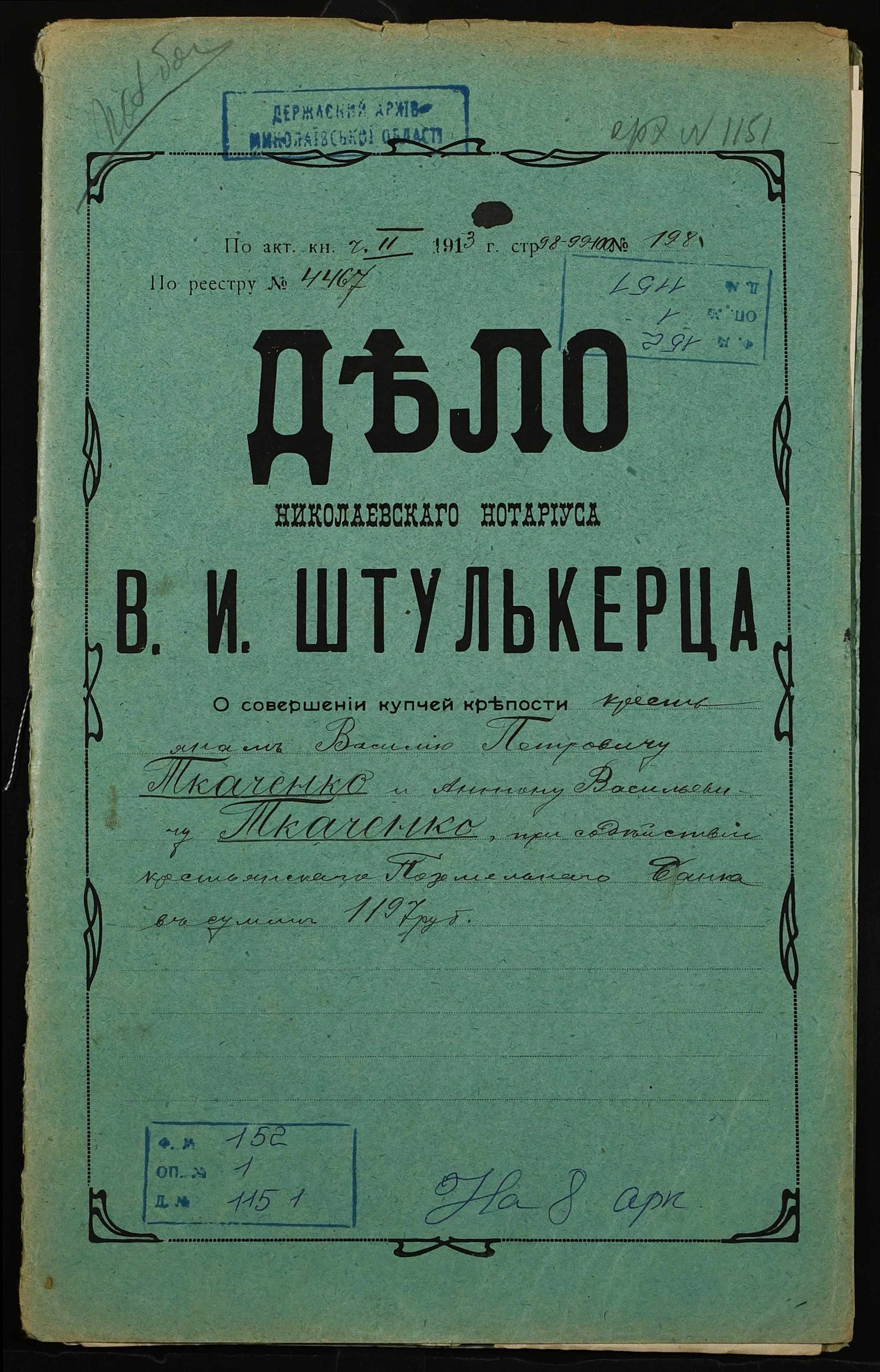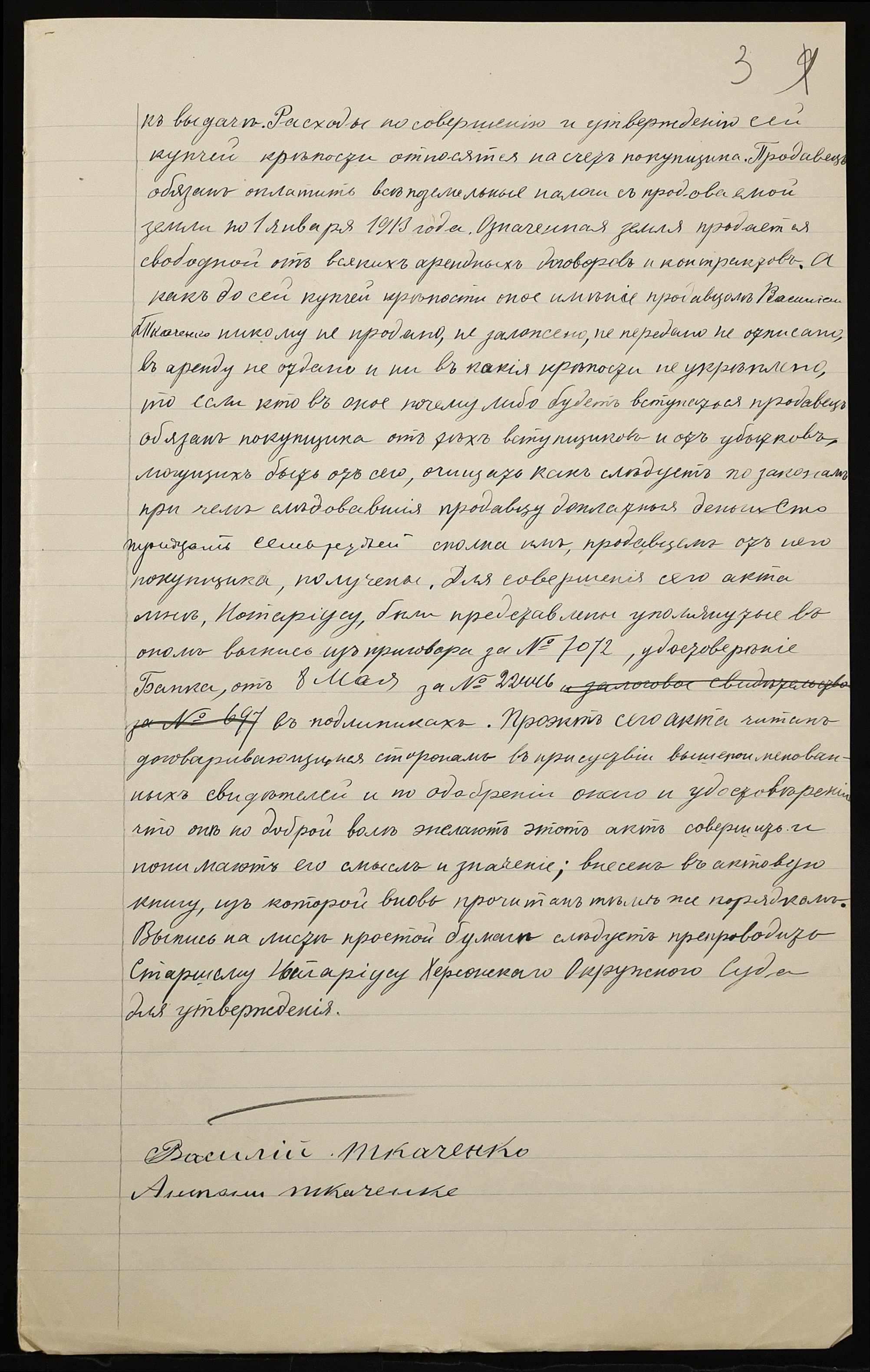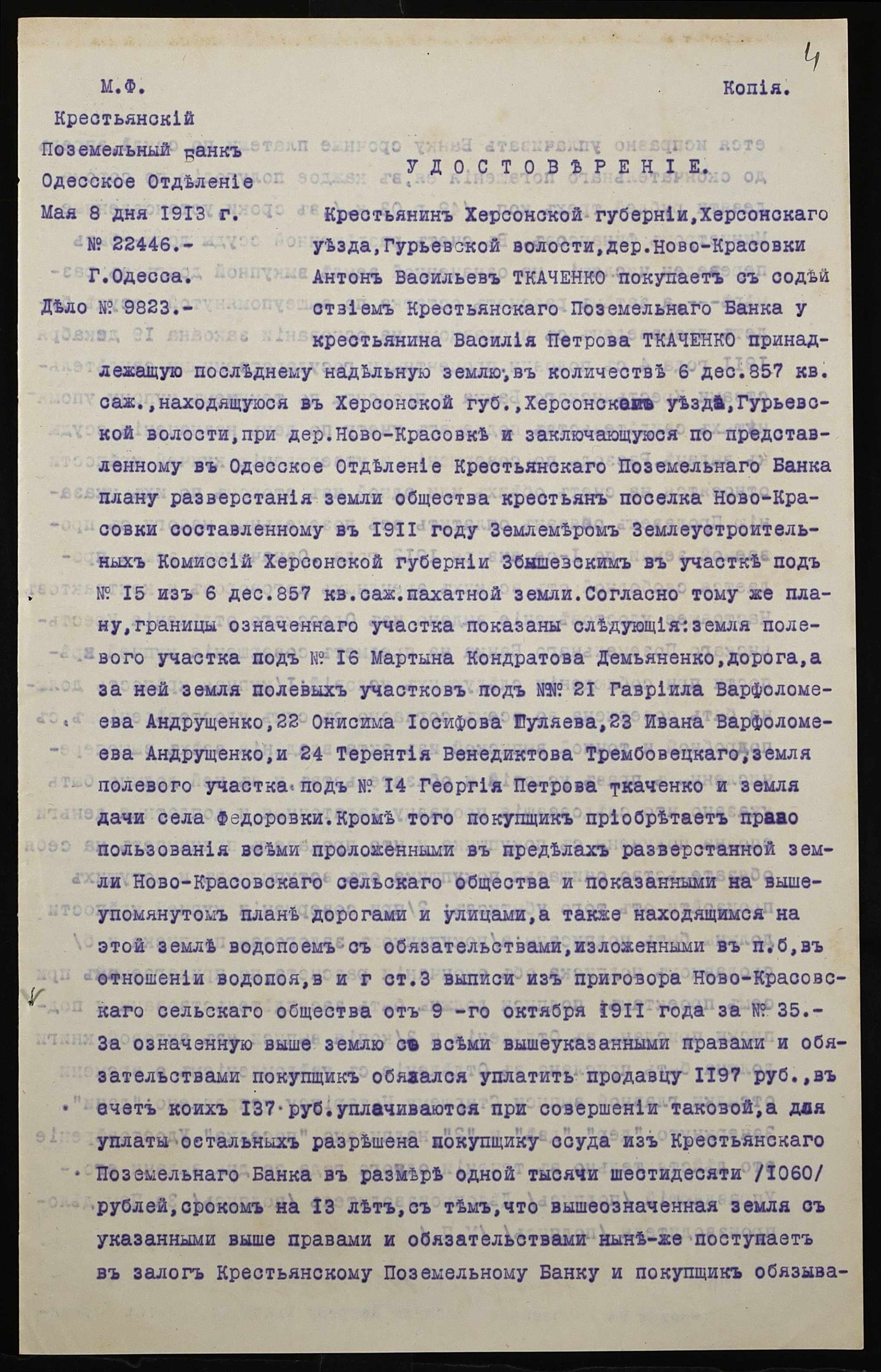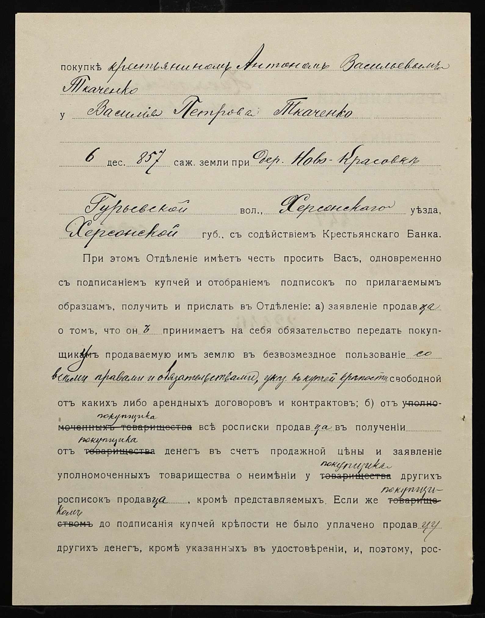 • • • • Справа № 1151 “Справа про вчинення купчої про продаж землі селянином Ткаченком Василем Петровичем (Ткаченко Василием Петровичем) на користь селянина Ткаченка Антона Васильовича (Ткаченко Антона Васильевича) за сприяння Селянського поземельного банку”