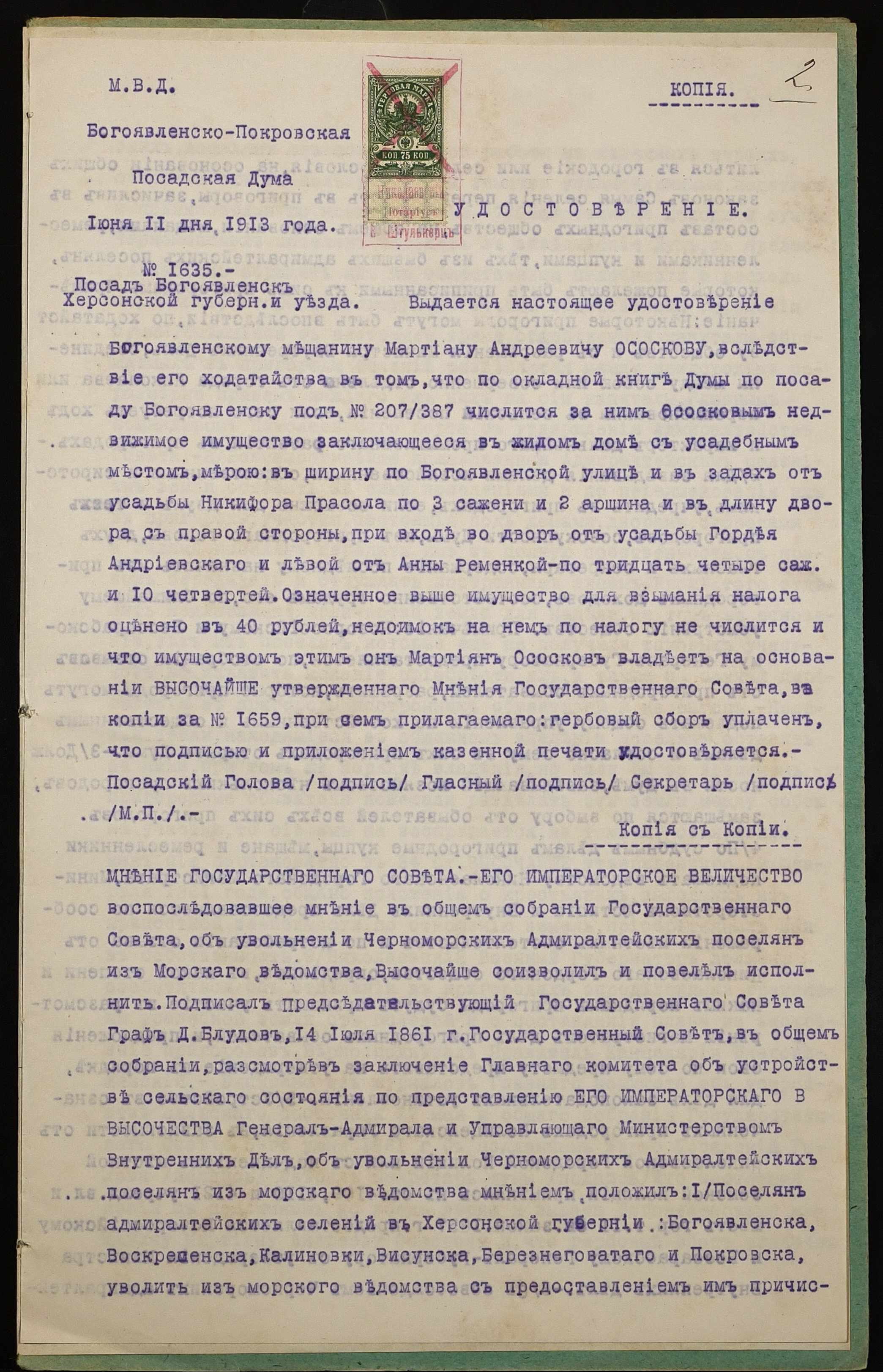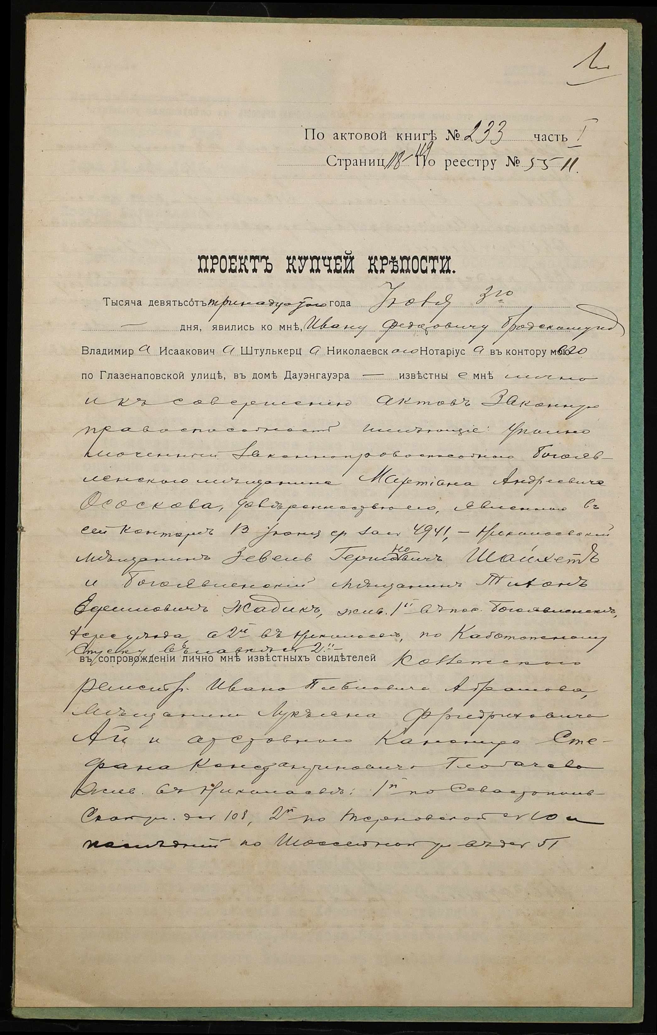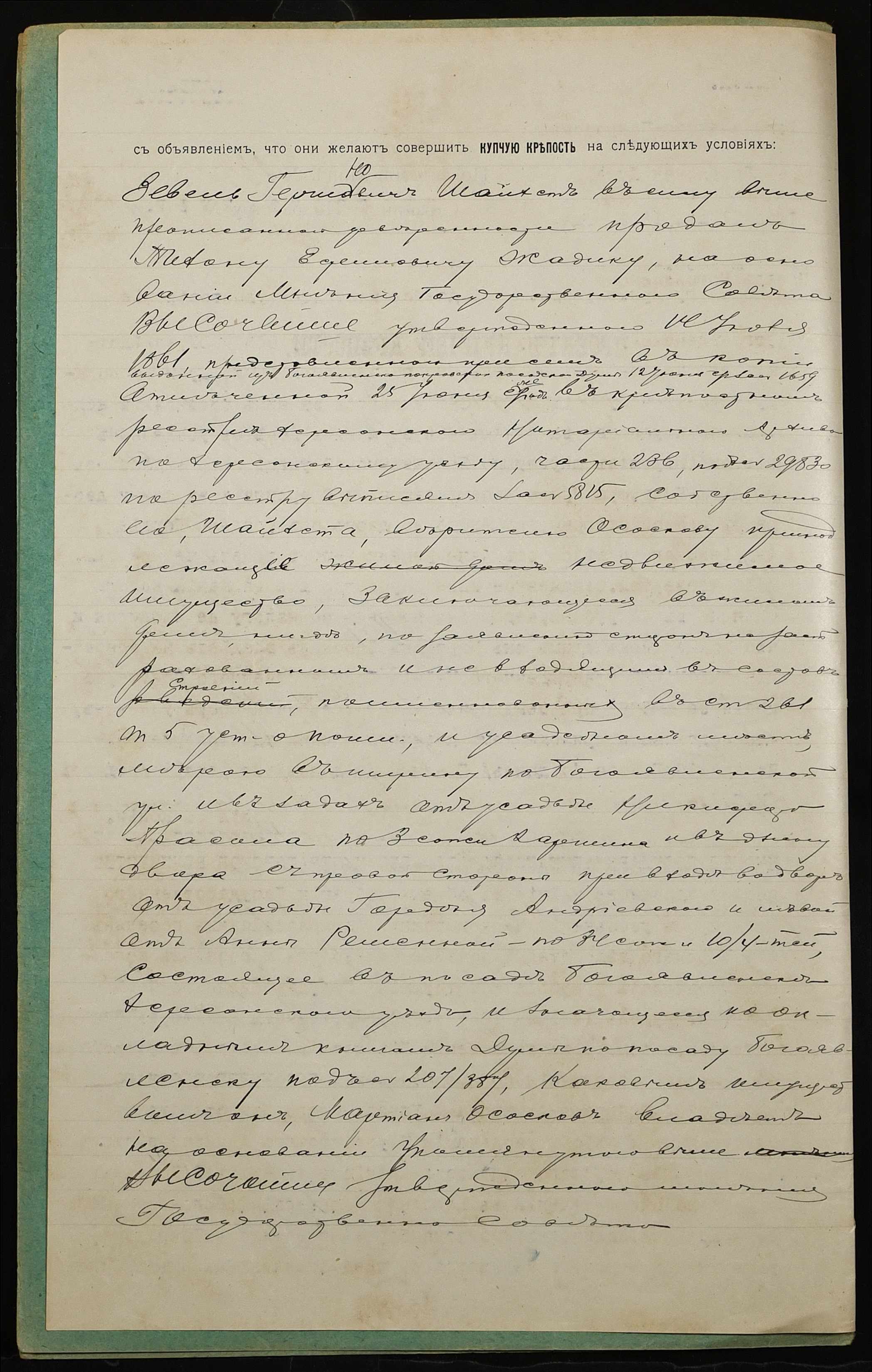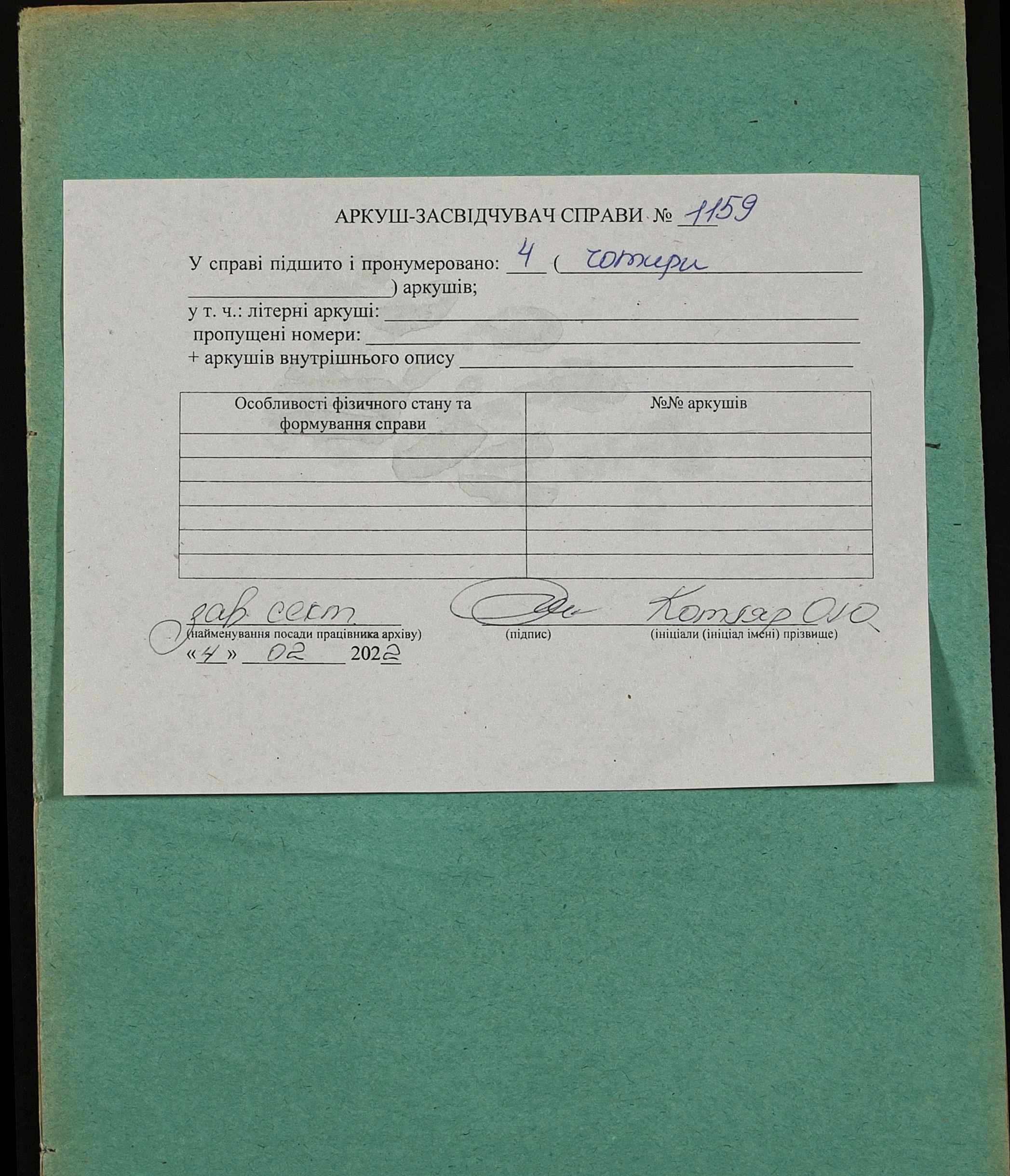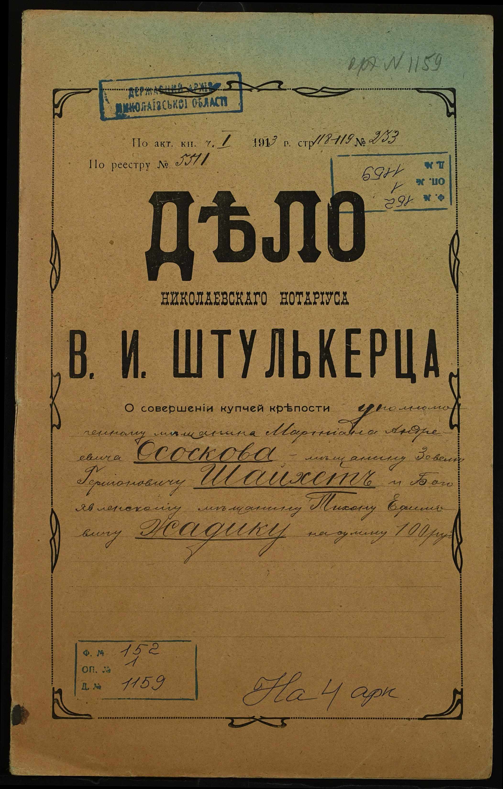• • • • Справа № 1159 “Справа про вчинення купчої про продаж нерухомого майна міщанином Шайхетом Зевелем Гершеновичем (Шайхетом Зевелем Гершеновичем), повіреним міщанина Ососкова Мартіана Андрійовича (Ососкова Мартиана Андреевича), на користь богоявленського міщанина Жадика Тихона Юхимовича (Жадика Тихона Ефимовича)”
