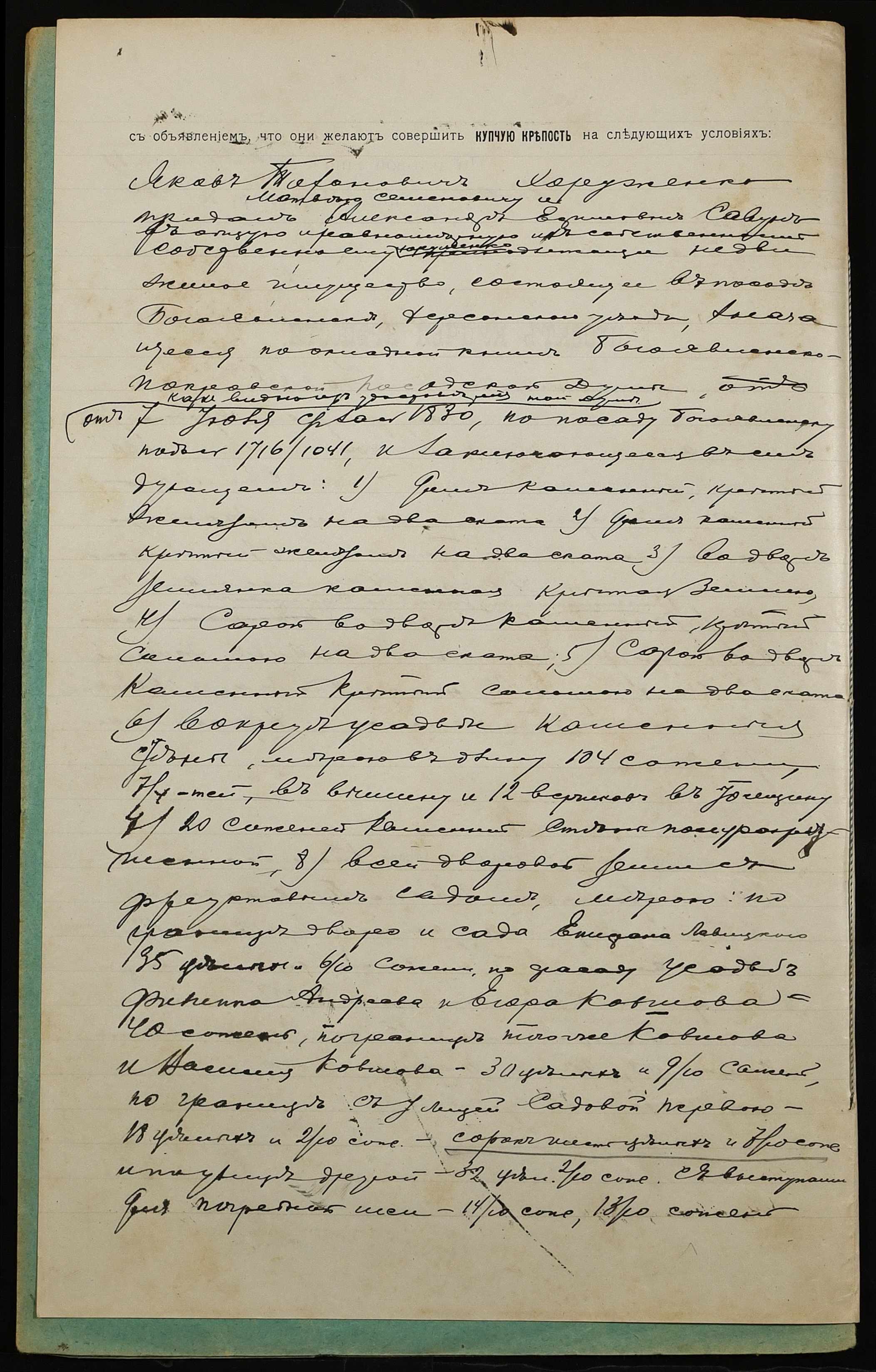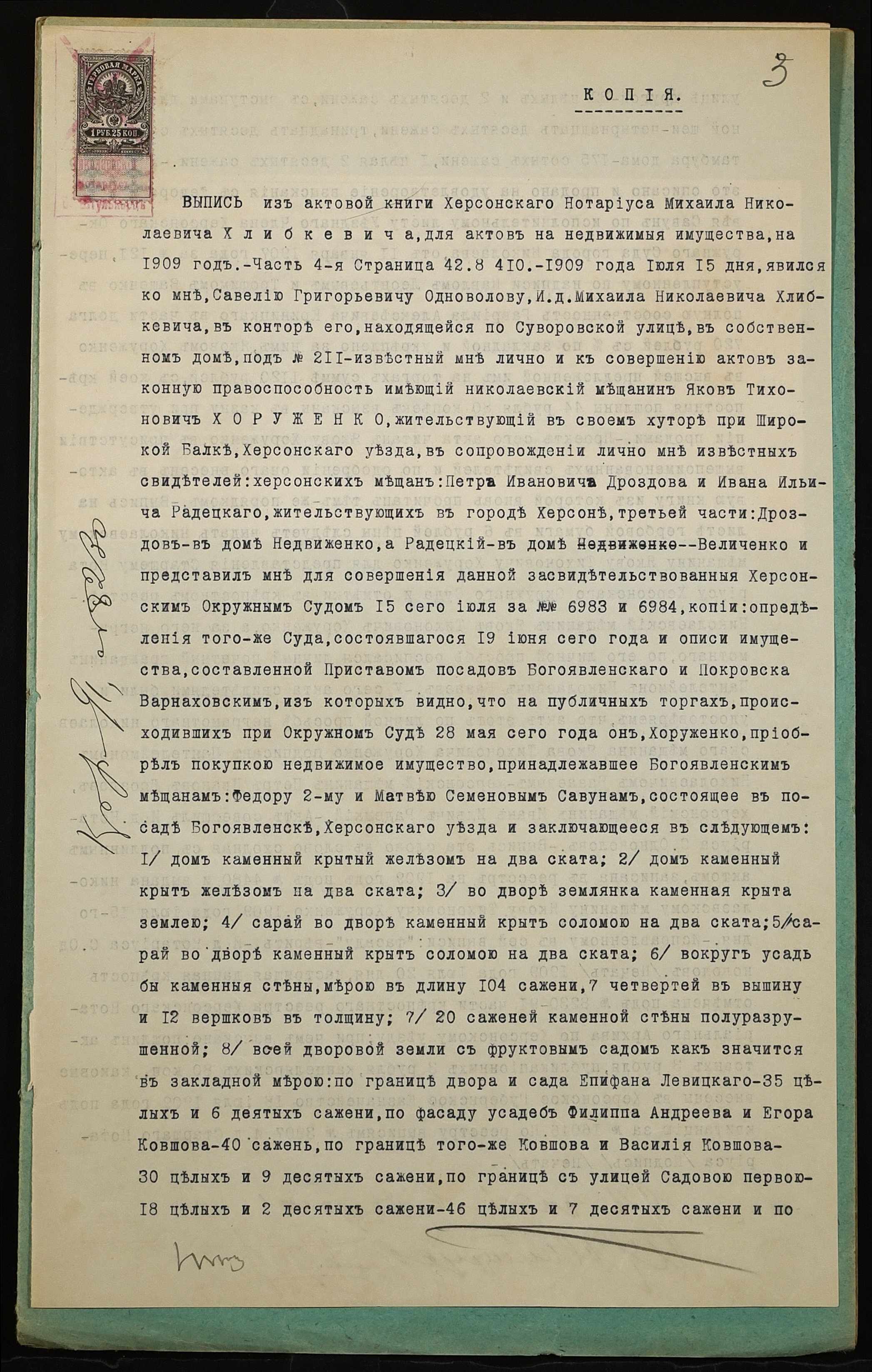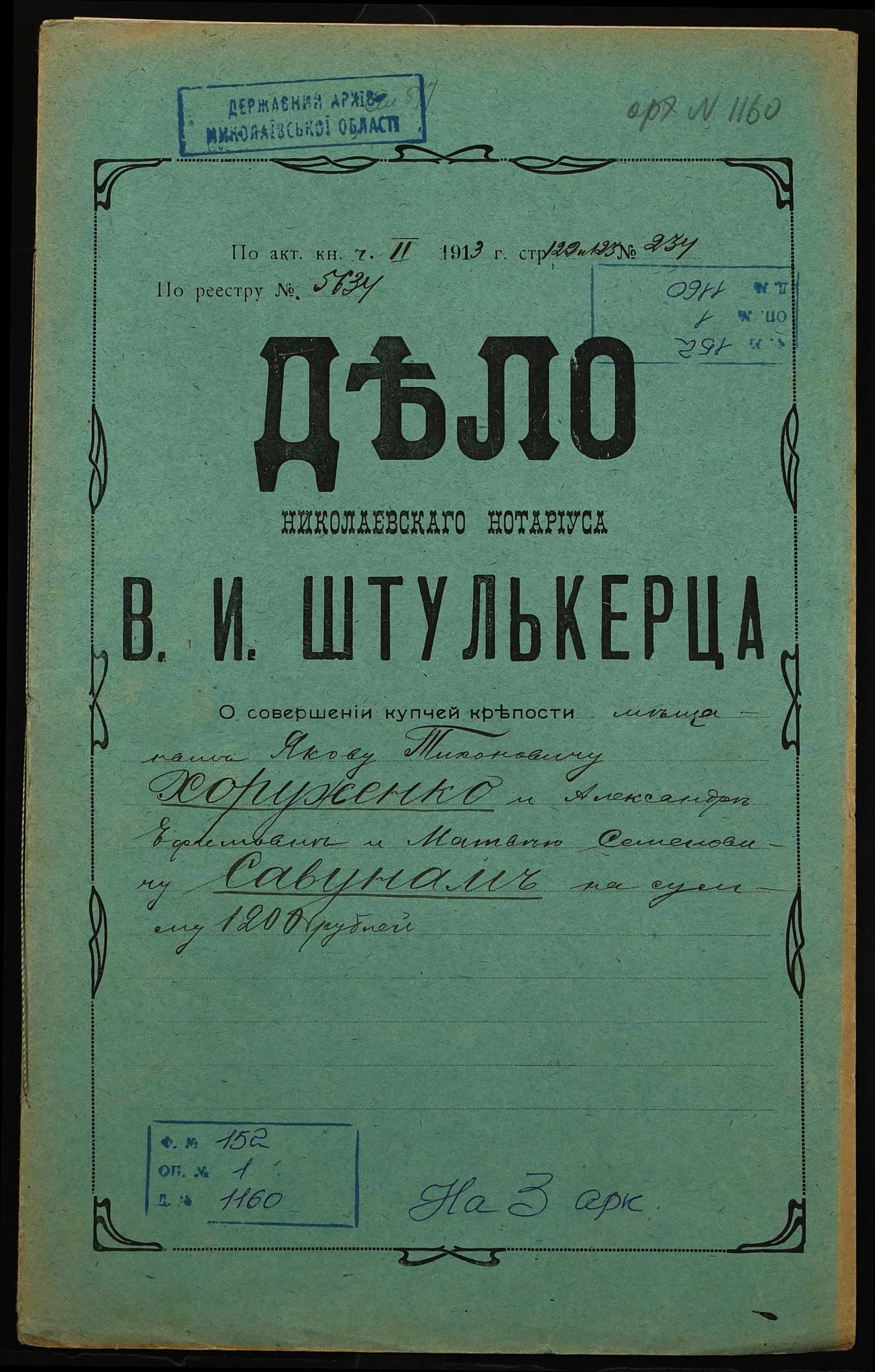 • • • • Справа № 1160 “Справа про вчинення купчої про продаж нерухомого майна міщанином Хоруженком Яковом Тихоновичем (Хоруженко Яковом Тихоновичем) на користь міщан Савун Олександри Юхимівни (Савун Александры Ефимовны) і Савуна Матвія Семеновича (Савуна Матвея Семеновича)”
