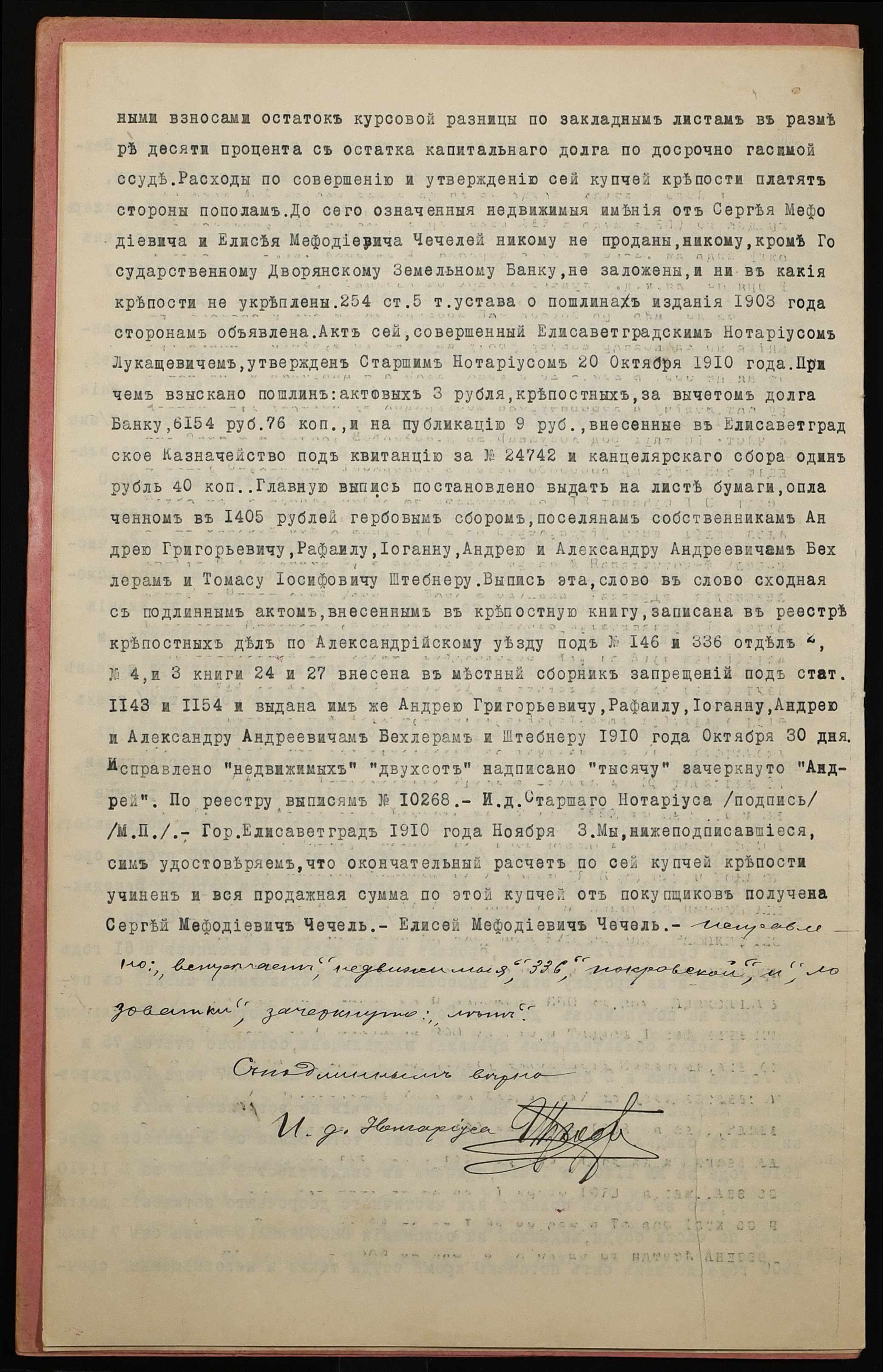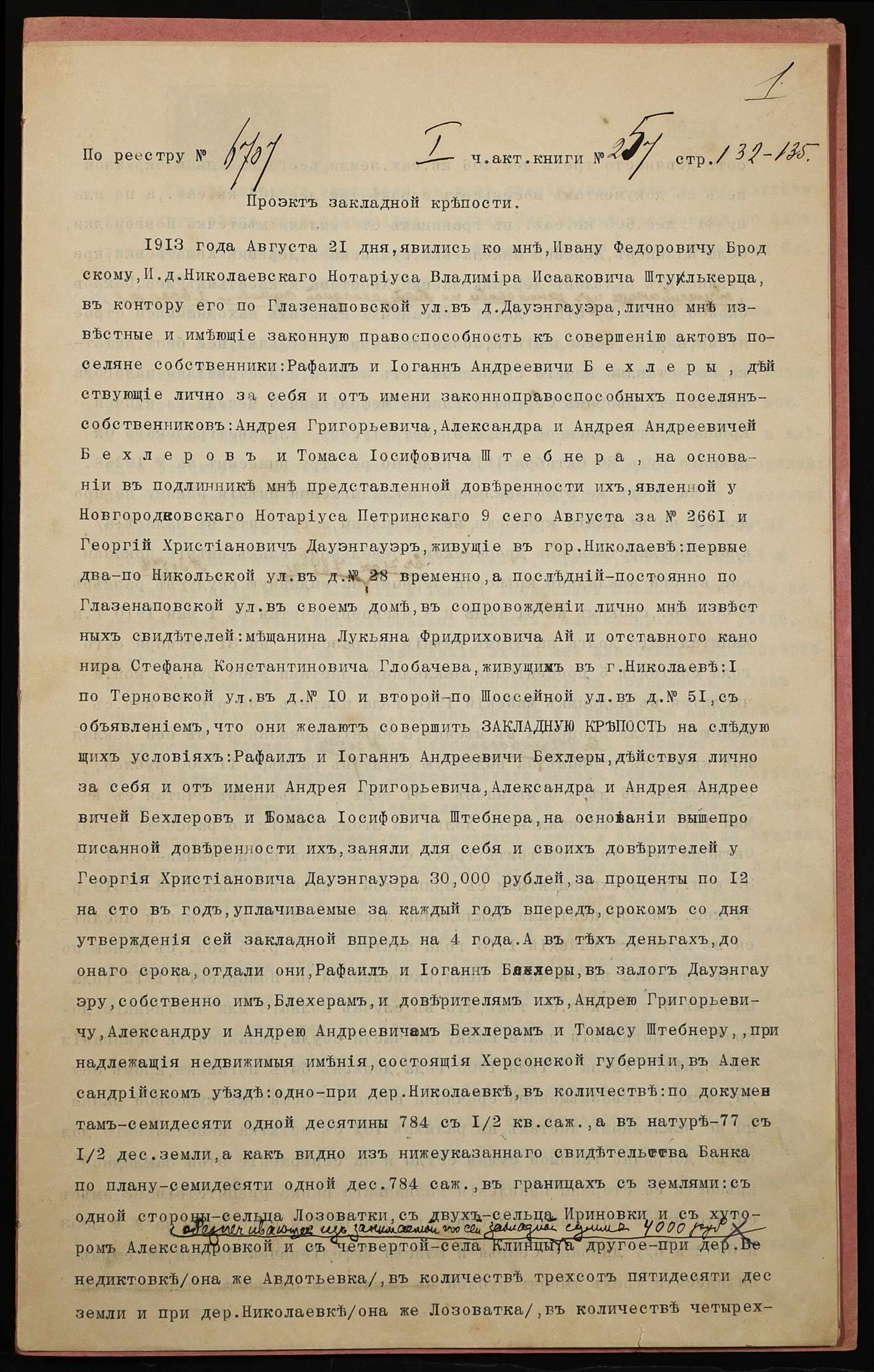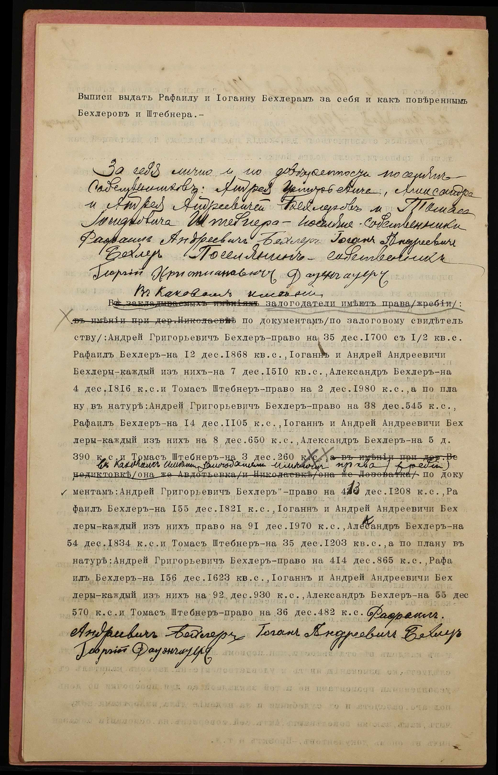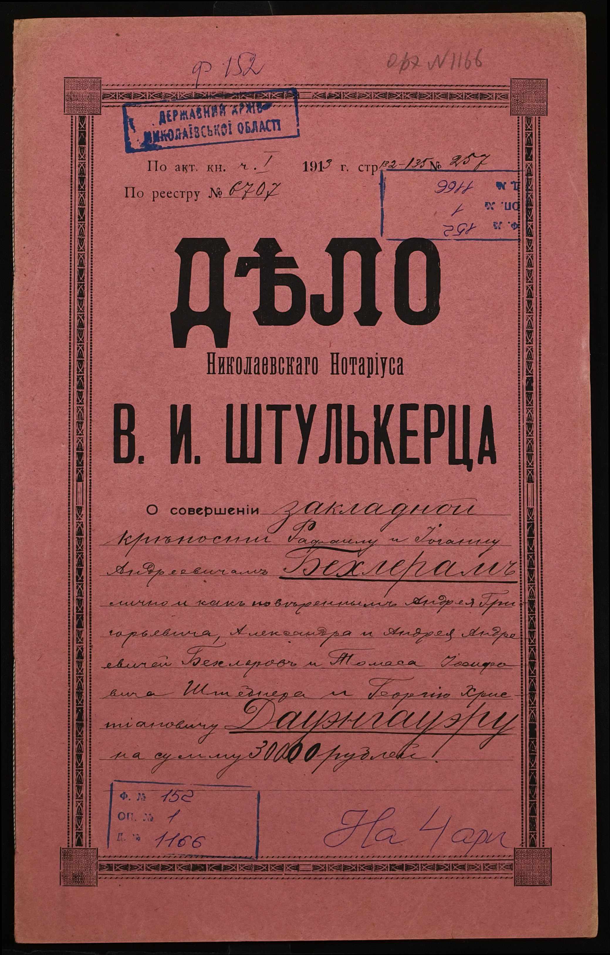 • • • • Справа № 1166 “Справа про вчинення заставної на нерухоме майно, закладене Бехлером Рафаїлом Андрійовичем (Бехлер Рафаилом Андреевичем) і Бехлером Йоганом Андрійовичем (Бехлер Иоганом Андреевичем), повіреними Бехлера Андрія Григоровича (Бехлер Андрея Григорьевича), Бехлерів Олександра і Андрія Андрійовичів (Бехлер Александра и Андрея Андреевичей) і Штебнера Томаса Йосиповича (Штебнера Томаса Иосифовича), – Дауенгауеру Георгію Християновичу (Дауэнгауэру Георгию Христиановичу)”