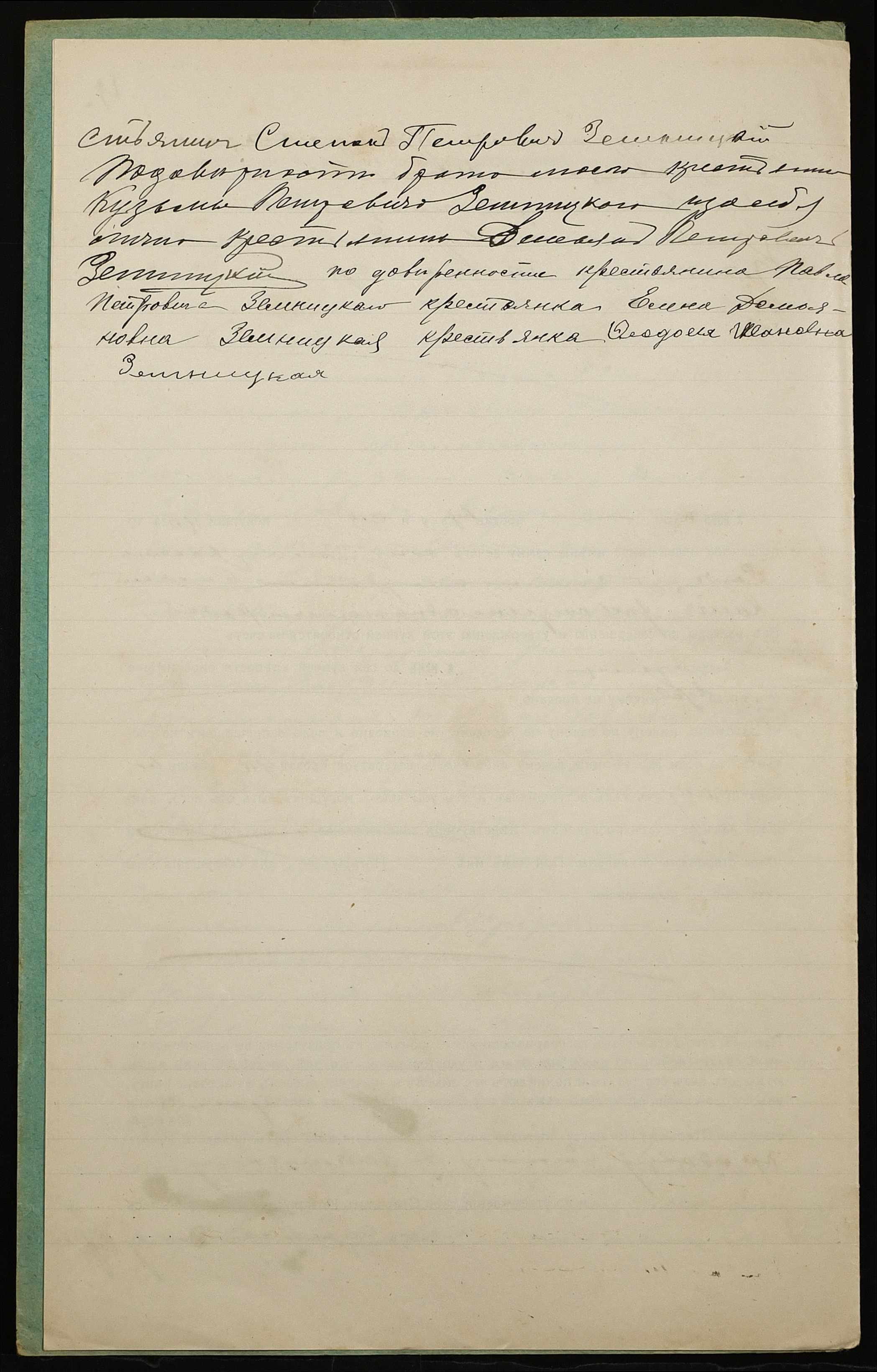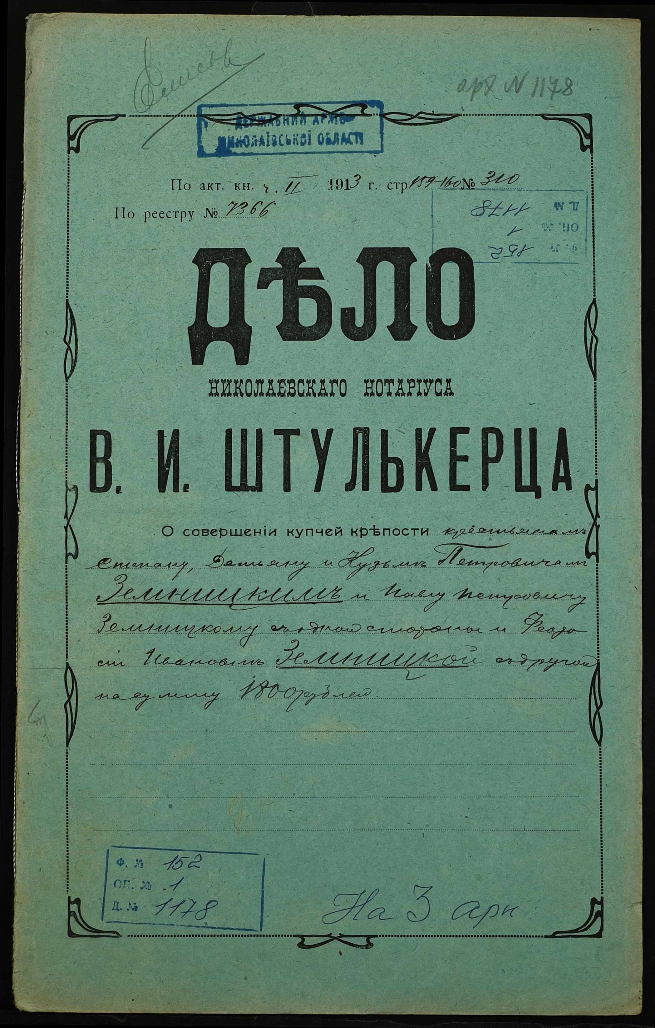 • • • • Справа № 1178 “Справа про вчинення купчої про продаж землі селянами Земницькими Степаном, Дем’яном, Кузьмою і Павлом Петровичами (Земницкими Степаном, Демьяном, Кузьмой и Павлом Петровичами) на користь селянки Земницької Феодосії Іванівни (Земницкой Феодосии Ивановны)”