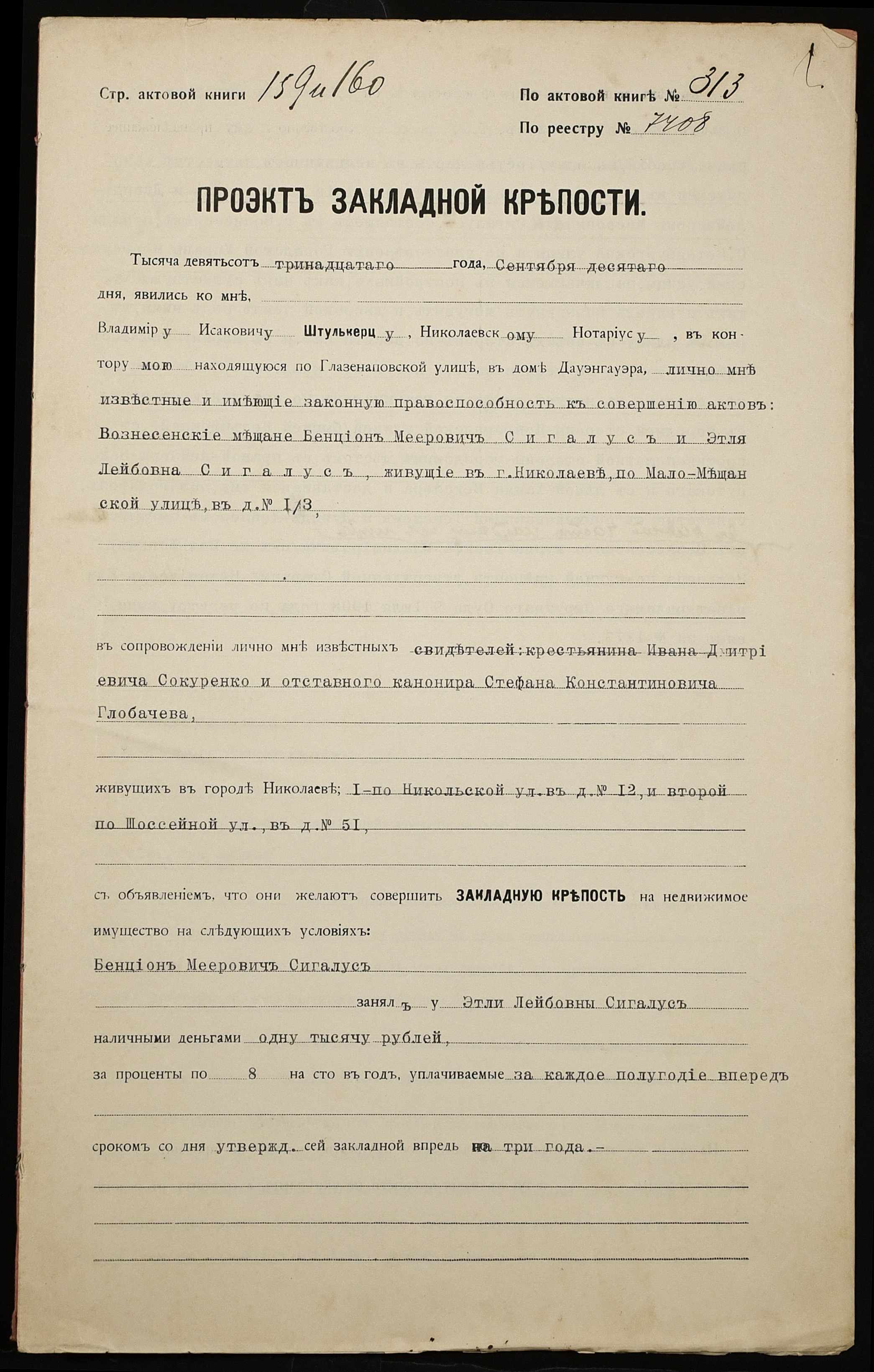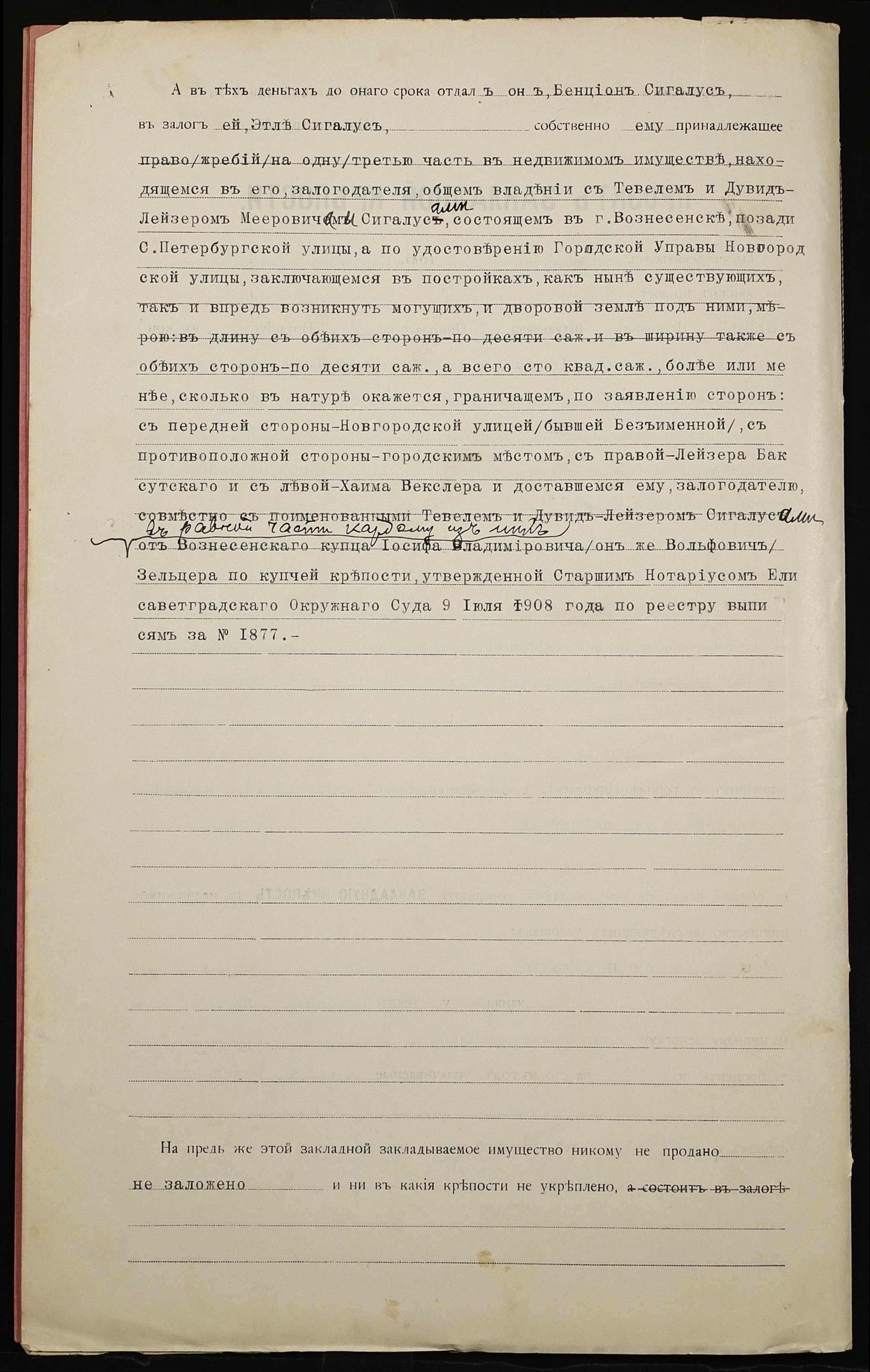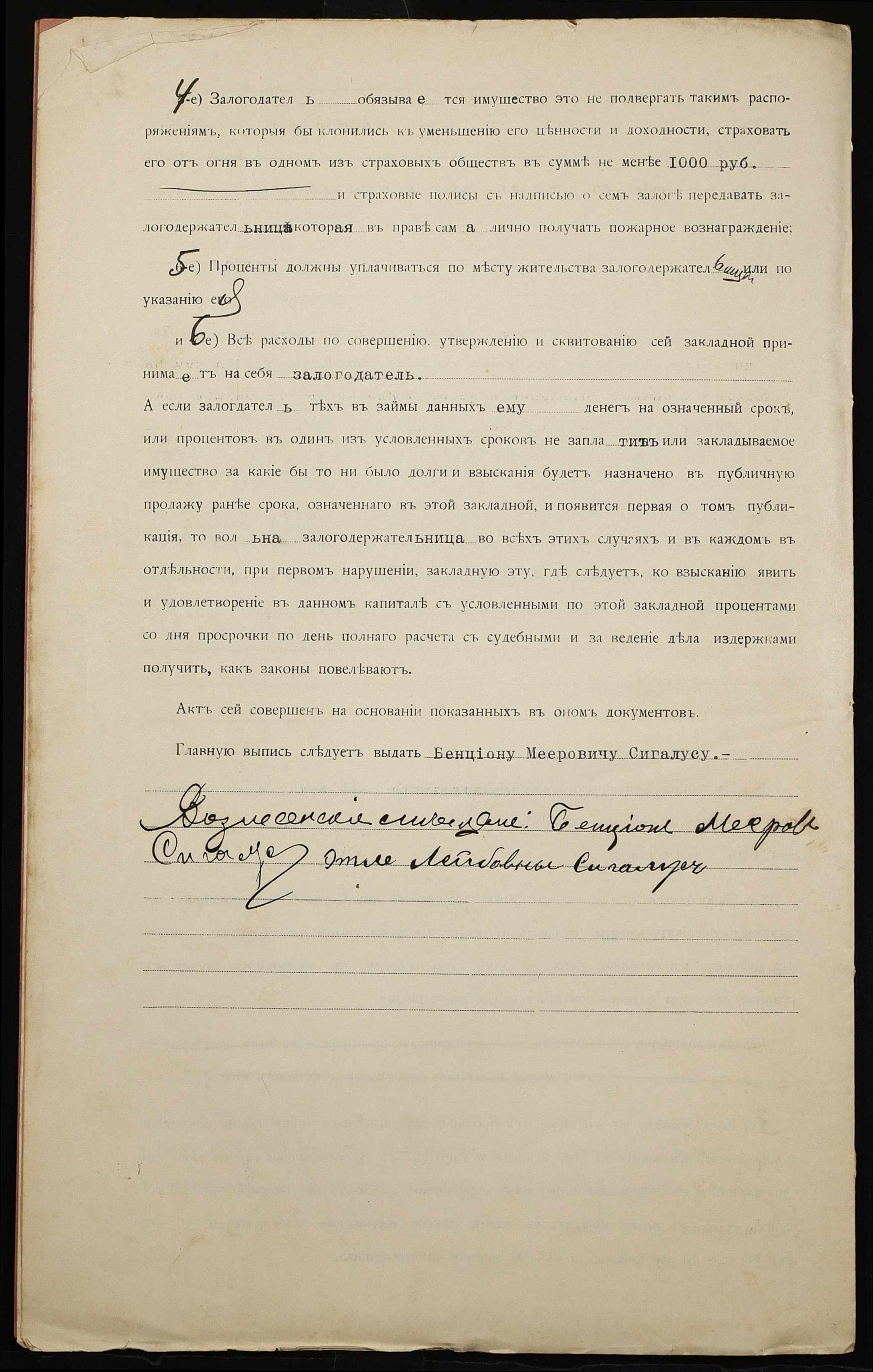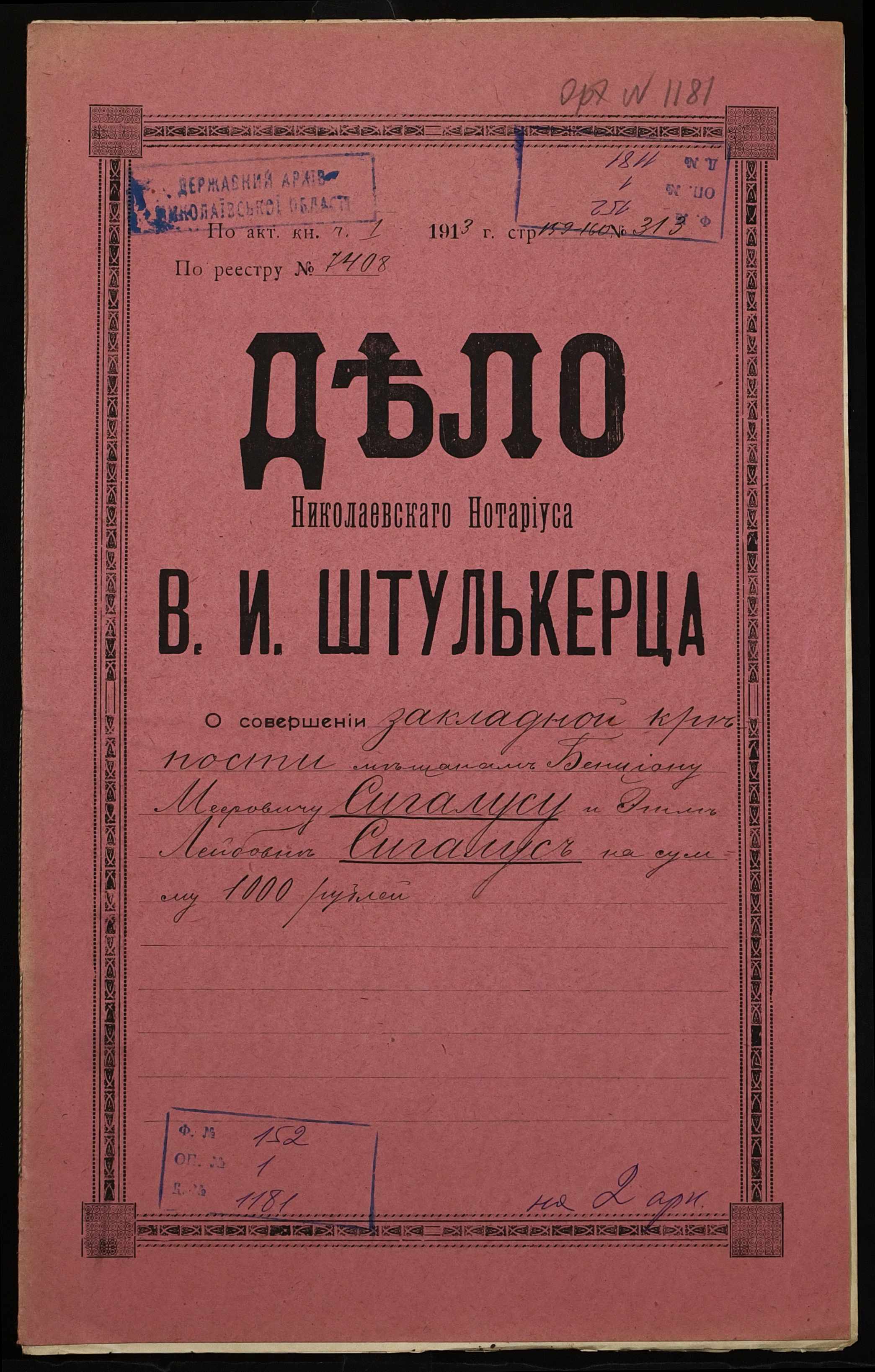 • • • • Справа № 1181 “Справа про вчинення заставної на нерухоме майно, закладене міщанином Сігалусом Бенціоном Меєровичем (Сигалусом Бенционом Мееровичем) – міщанці Сігалус Етлі Лейбівні (Сигалус Этли Лейбовне)”
