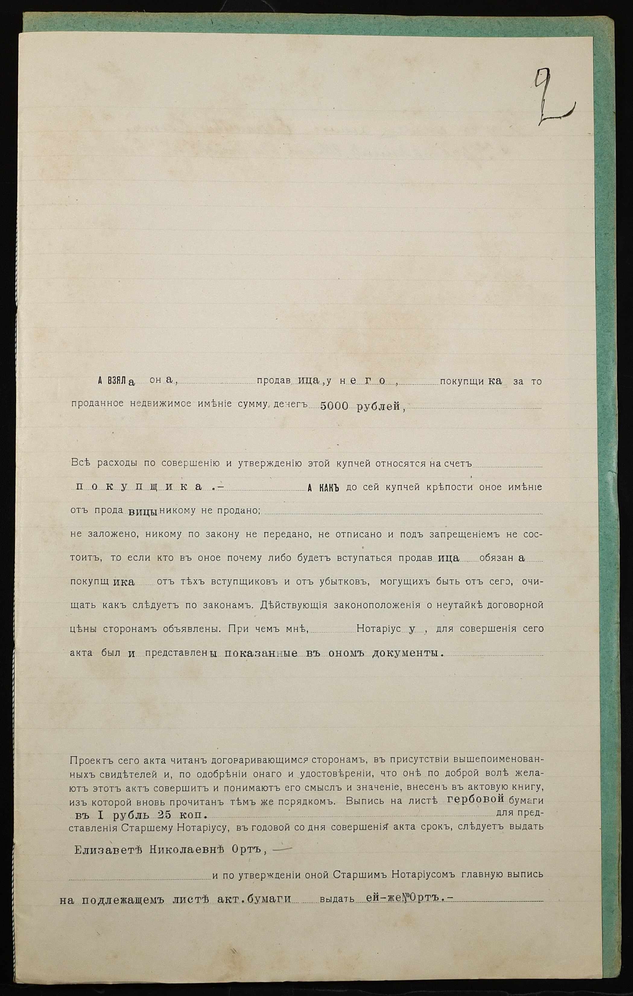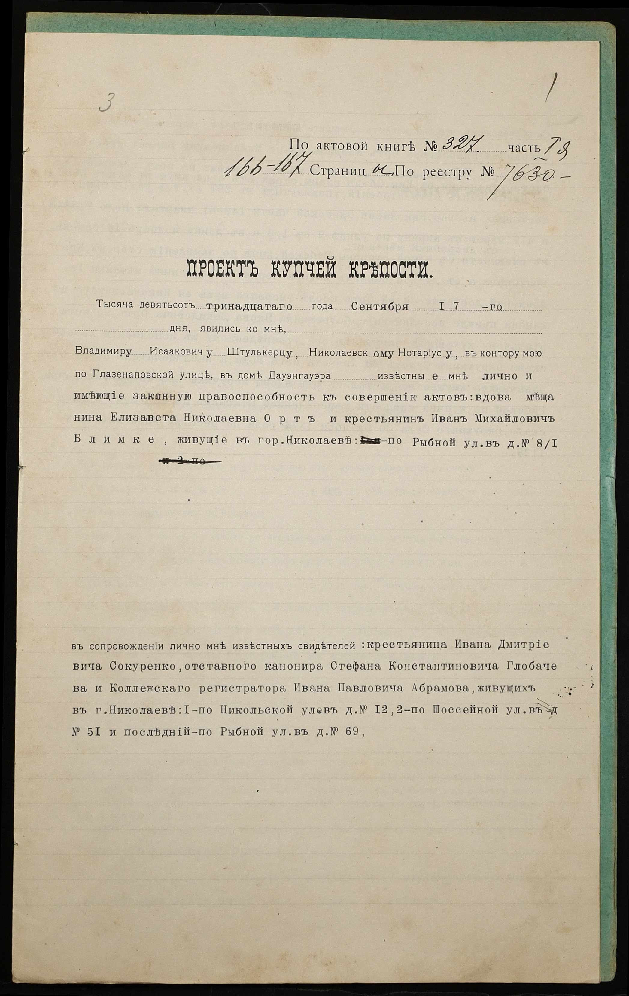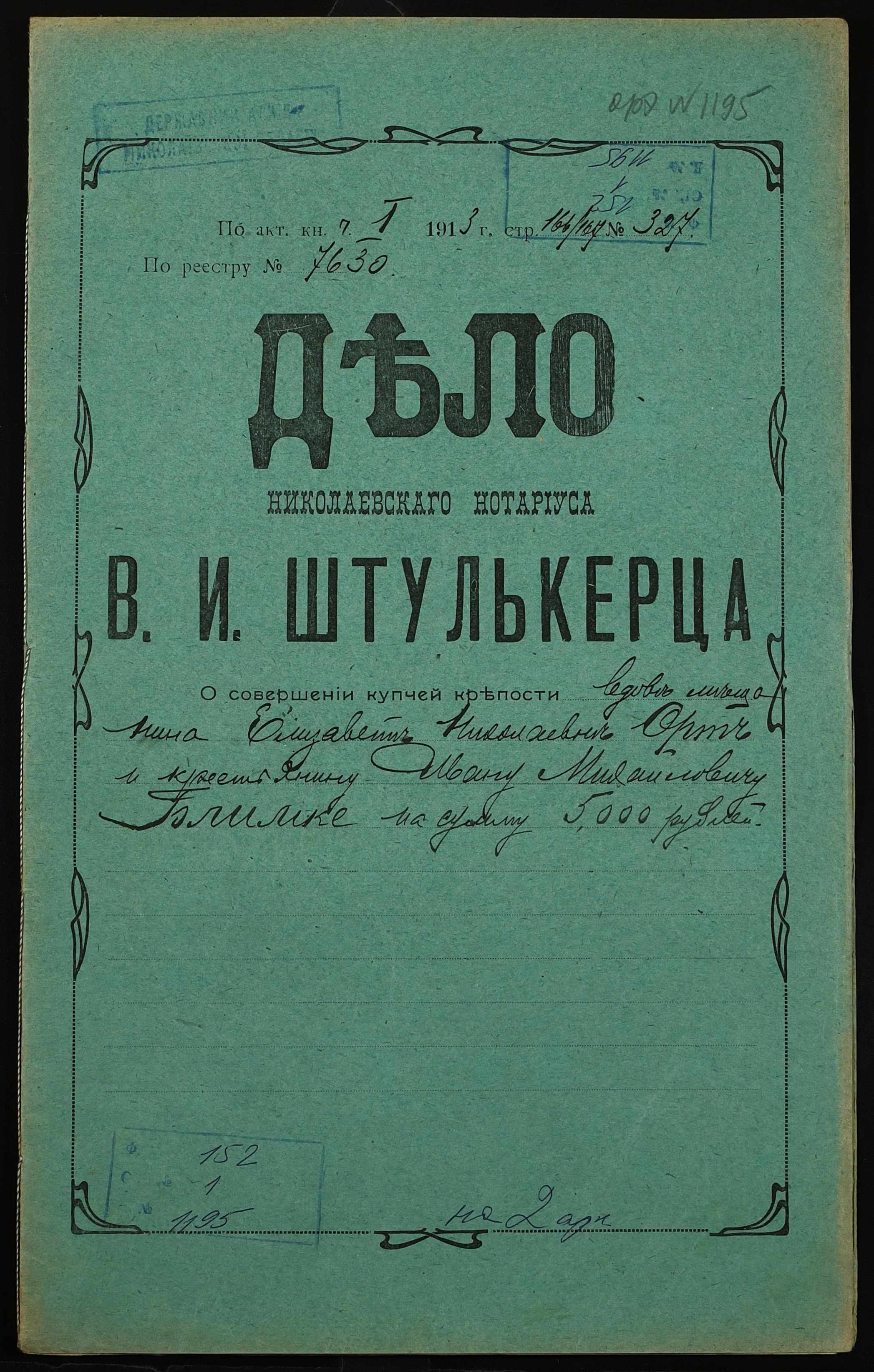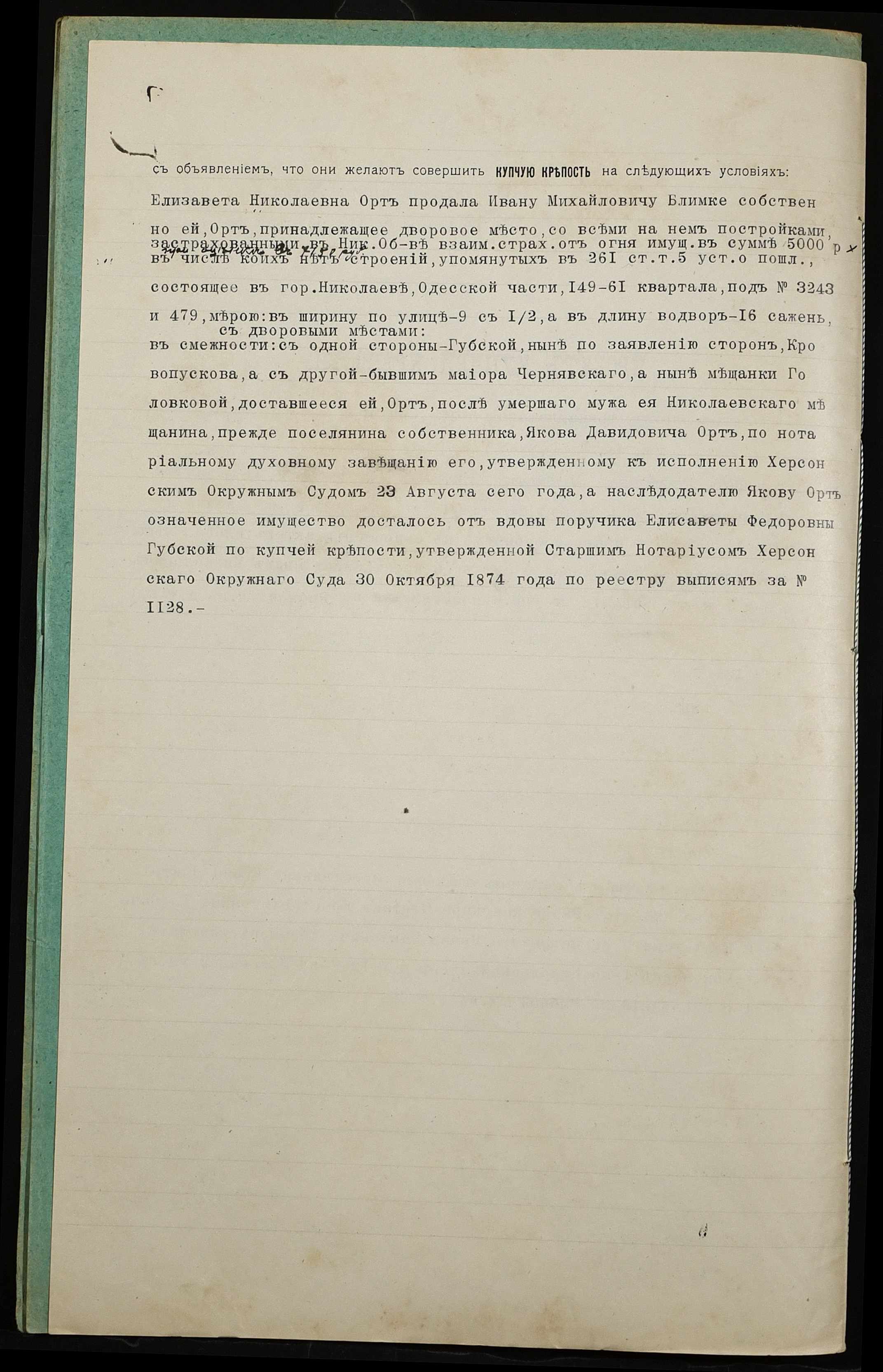 • • • • Справа № 1195 “Справа про вчинення купчої про продаж дворового місця з усіма спорудами удовою міщанина Орт Єлизаветою Миколаївною (Орт Елизаветой Николаевной) на користь селянина Блімке Івана Михайловича (Блимке Ивана Михайловича)”