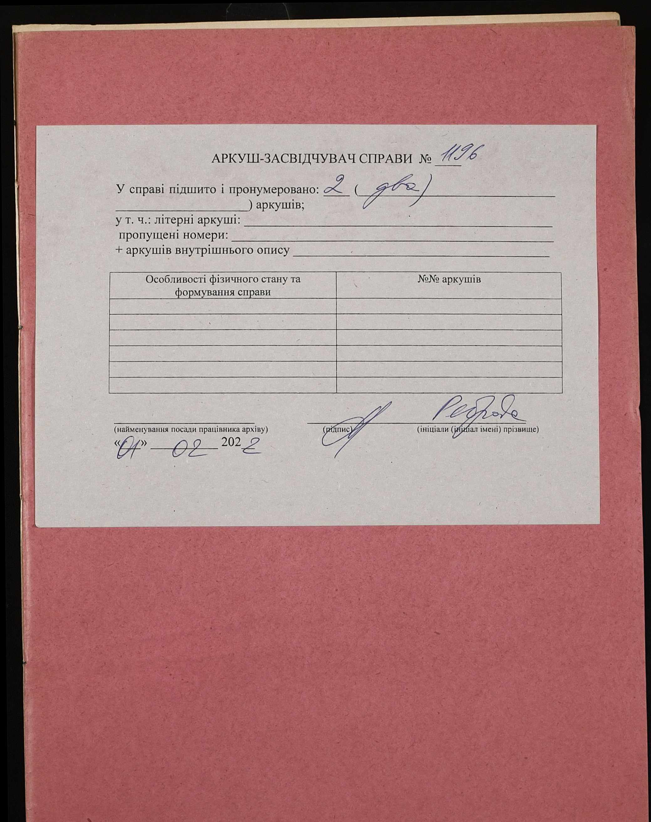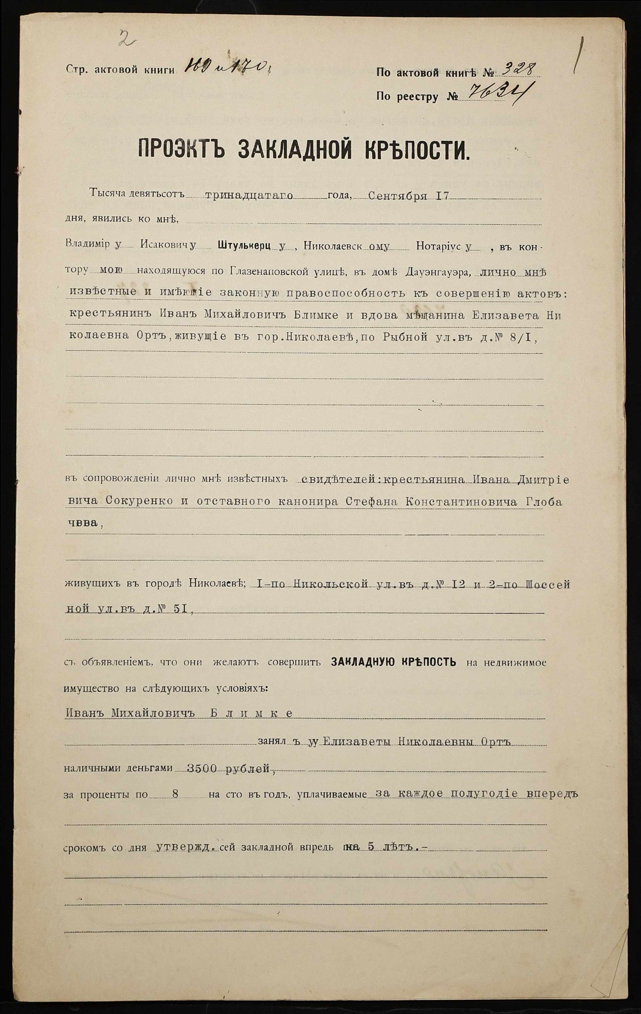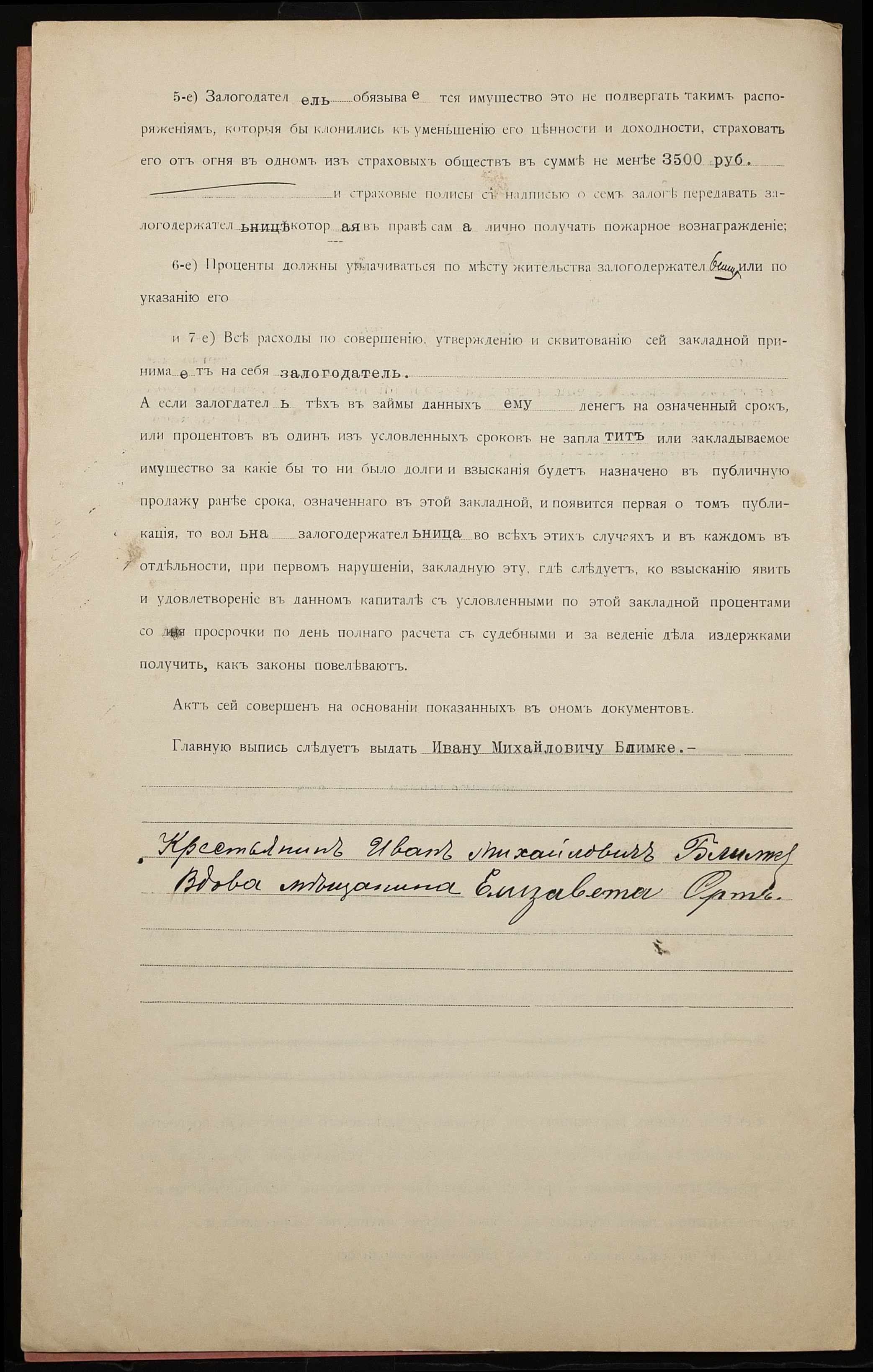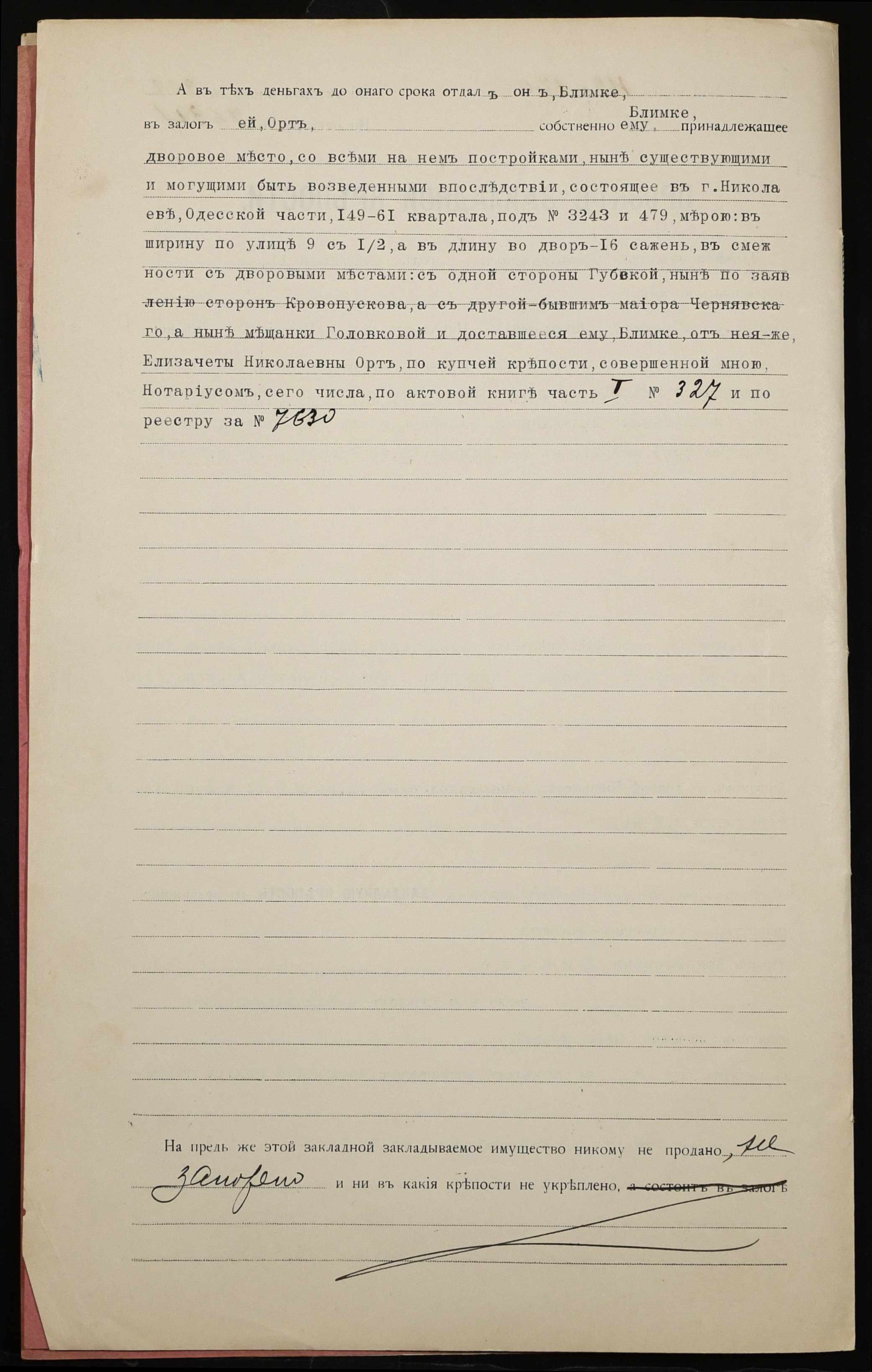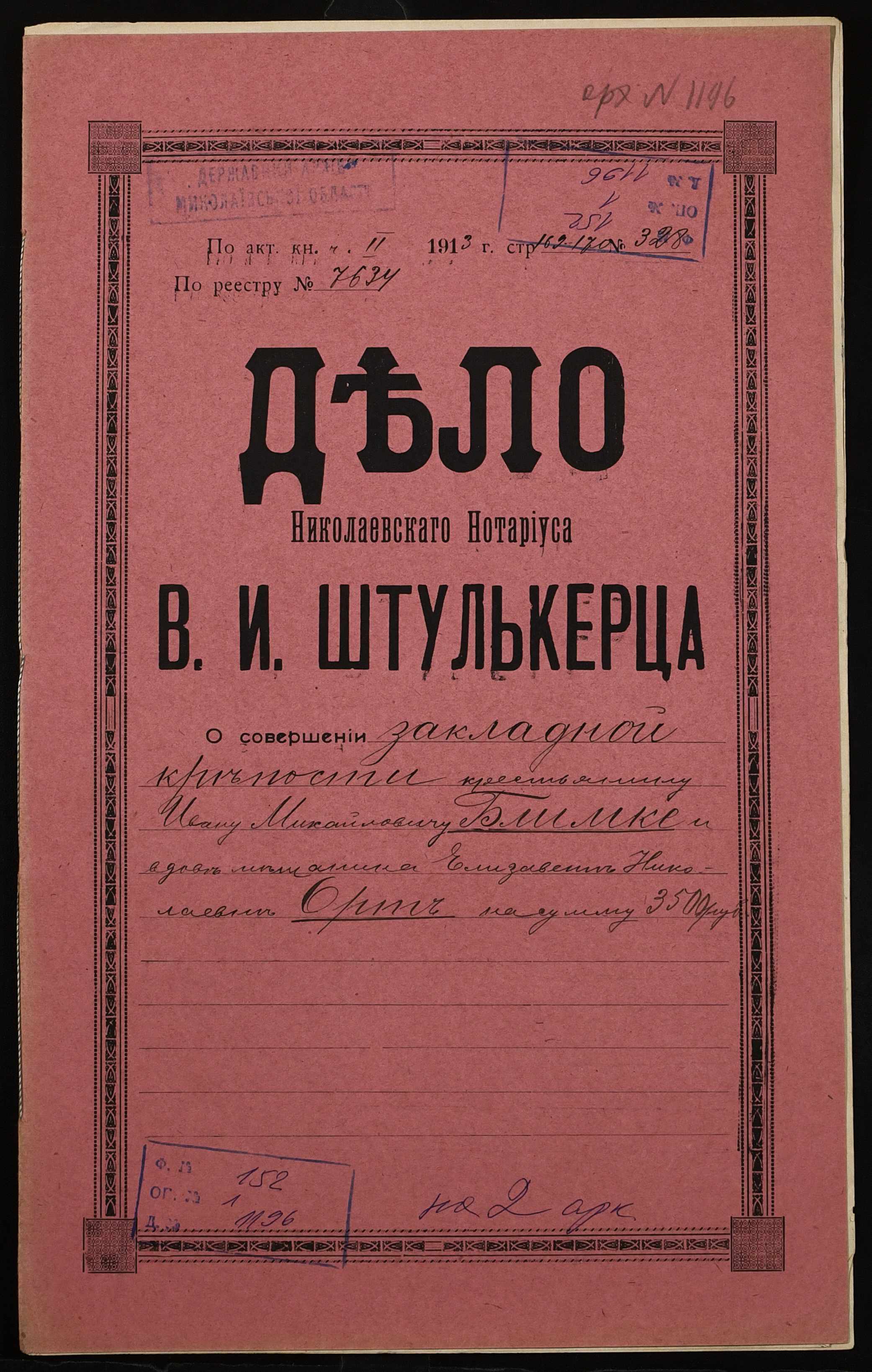 • • • • Справа № 1196 “Справа про вчинення заставної на дворове місце з усіма спорудами, закладене селянином Блімке Іваном Михайловичем (Блимке Иваном Михайловичем) – удові міщанина Орт Єлизаветі Миколаївні (Орт Елизавете Николаевне)”