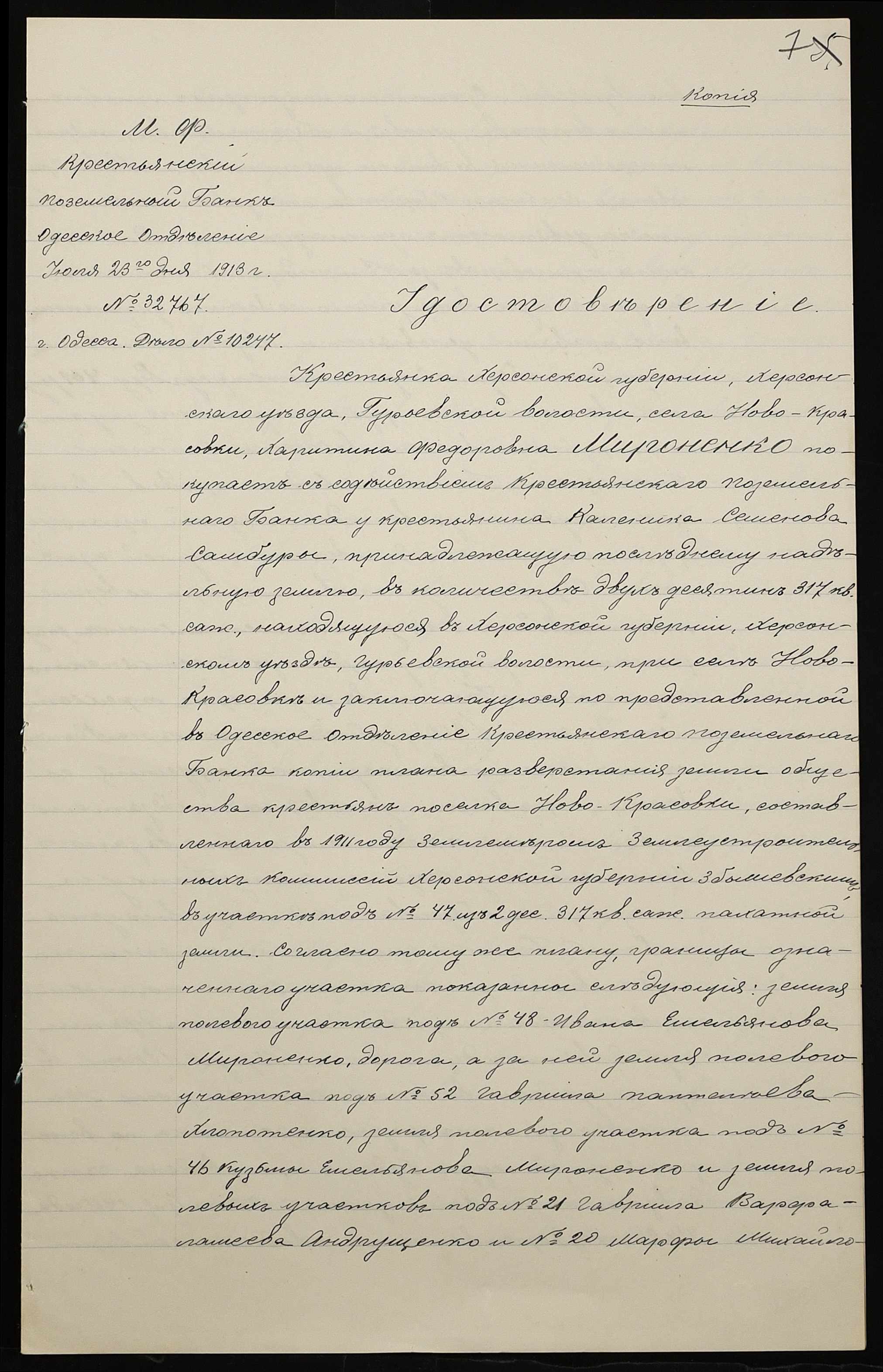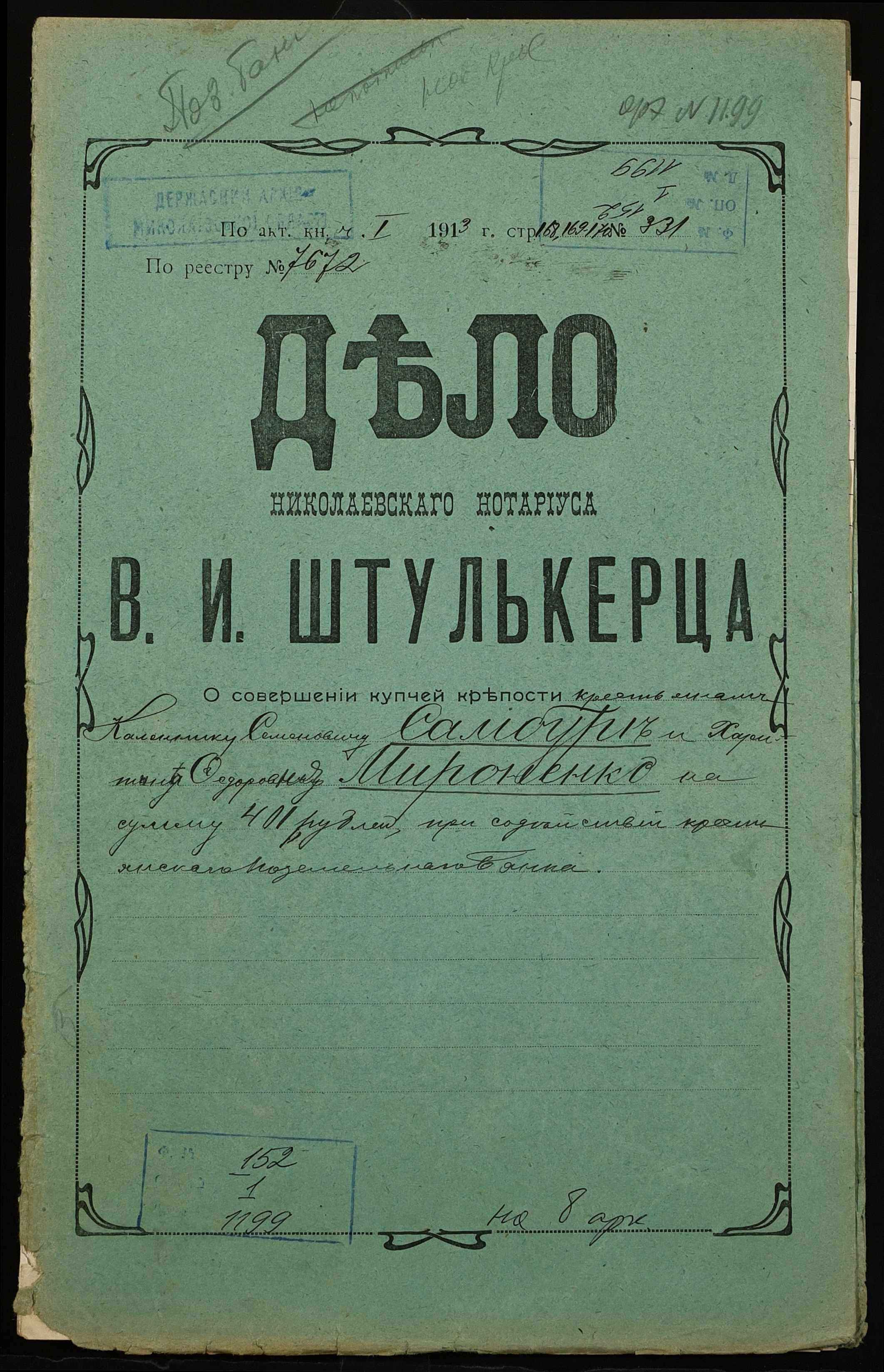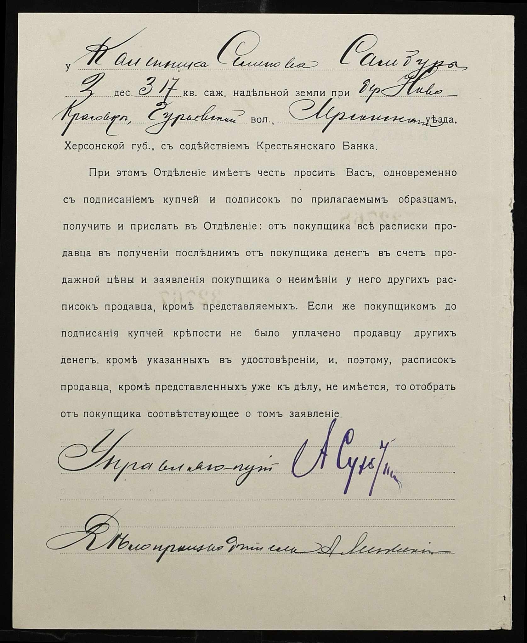• • • • Справа № 1199 “Справа про вчинення купчої про продаж землі селянином Самбуром Калеником Семеновичем (Самбуром Калеником Семеновичем) на користь селянки Мироненко Харитини Федорівни (Мироненко Харитины Федоровны) за сприяння Селянського поземельного банку”