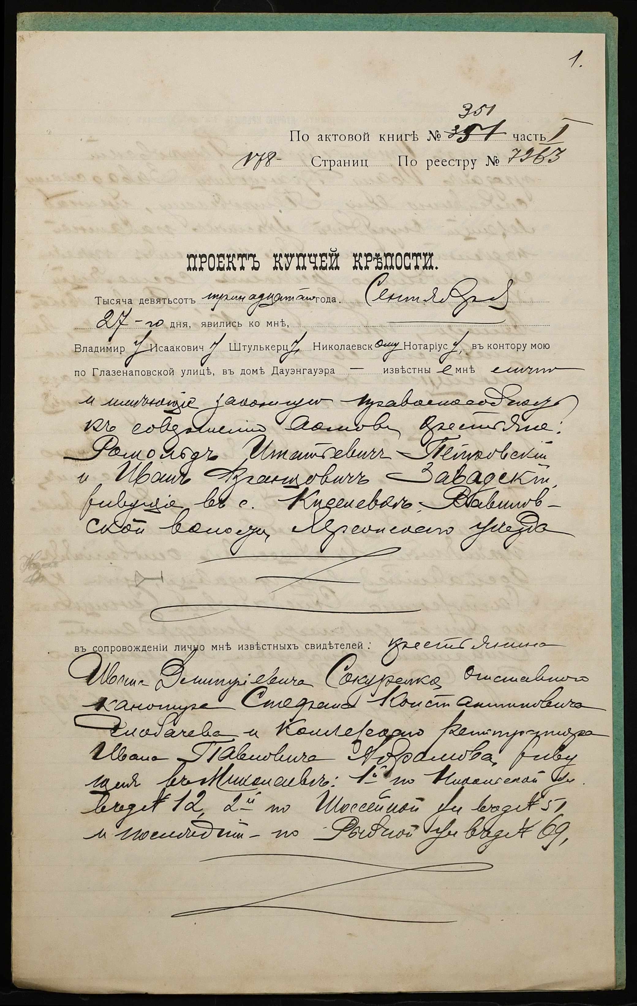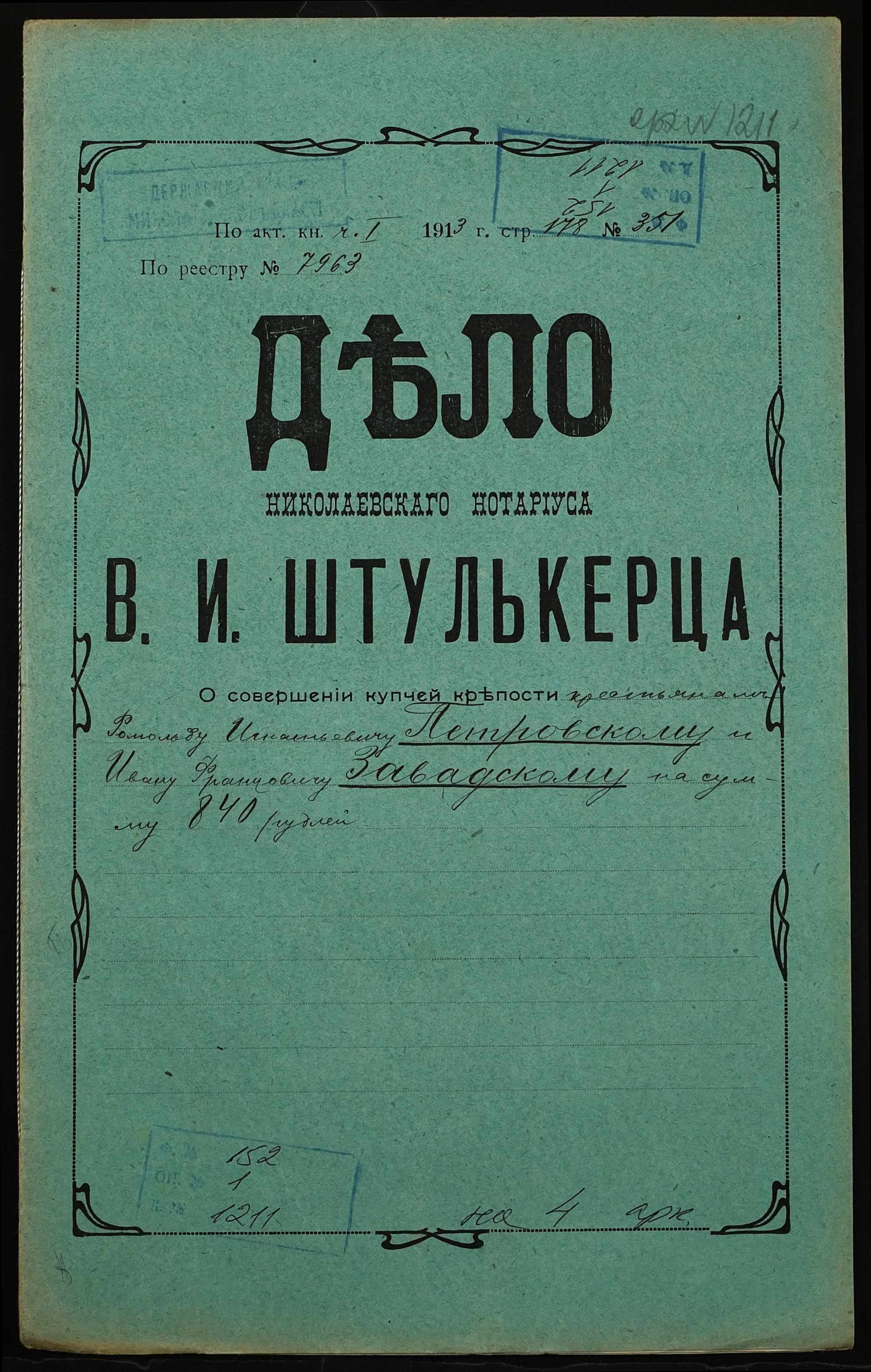 • • • • Справа № 1211 “Справа про вчинення купчої про продаж землі селянином Петровським Ромольдом Гнатовичем (Петровским Ромольдом Игнатьевичем) на користь селянина Завадського Івана Францовича (Завадского Ивана Францевича)”