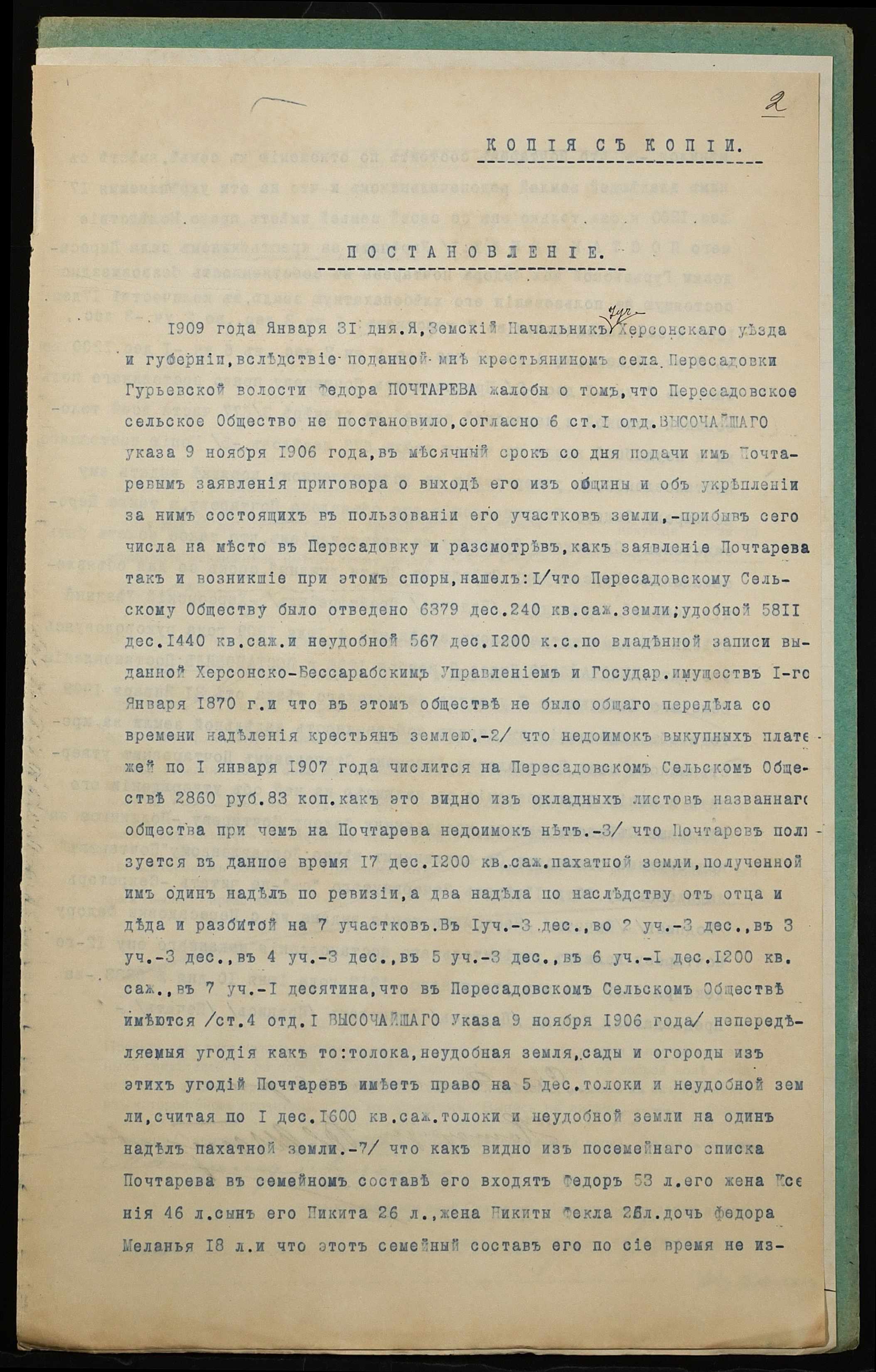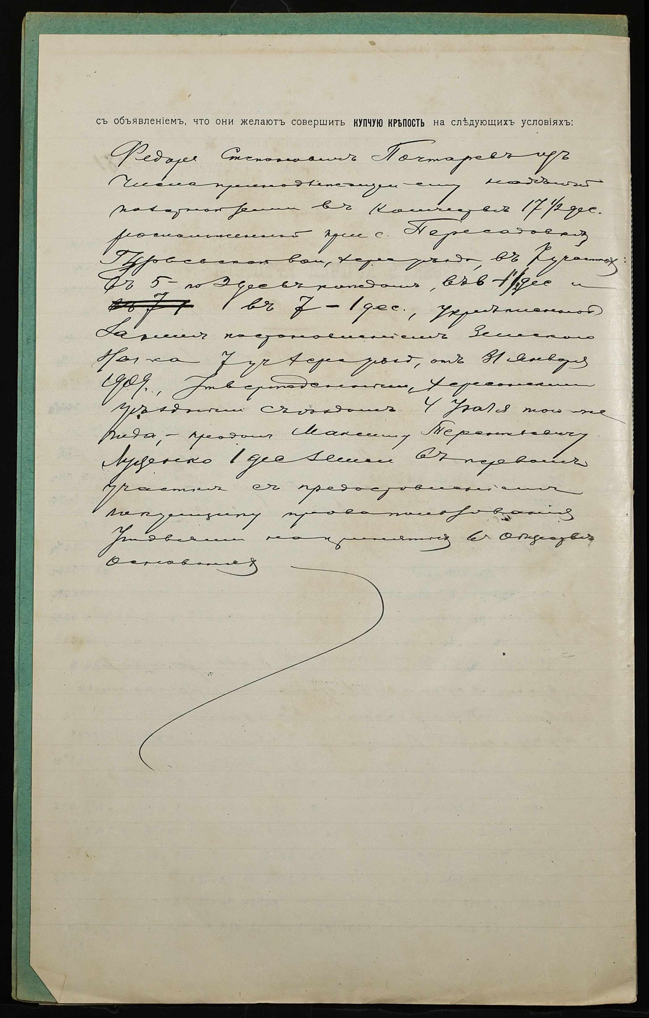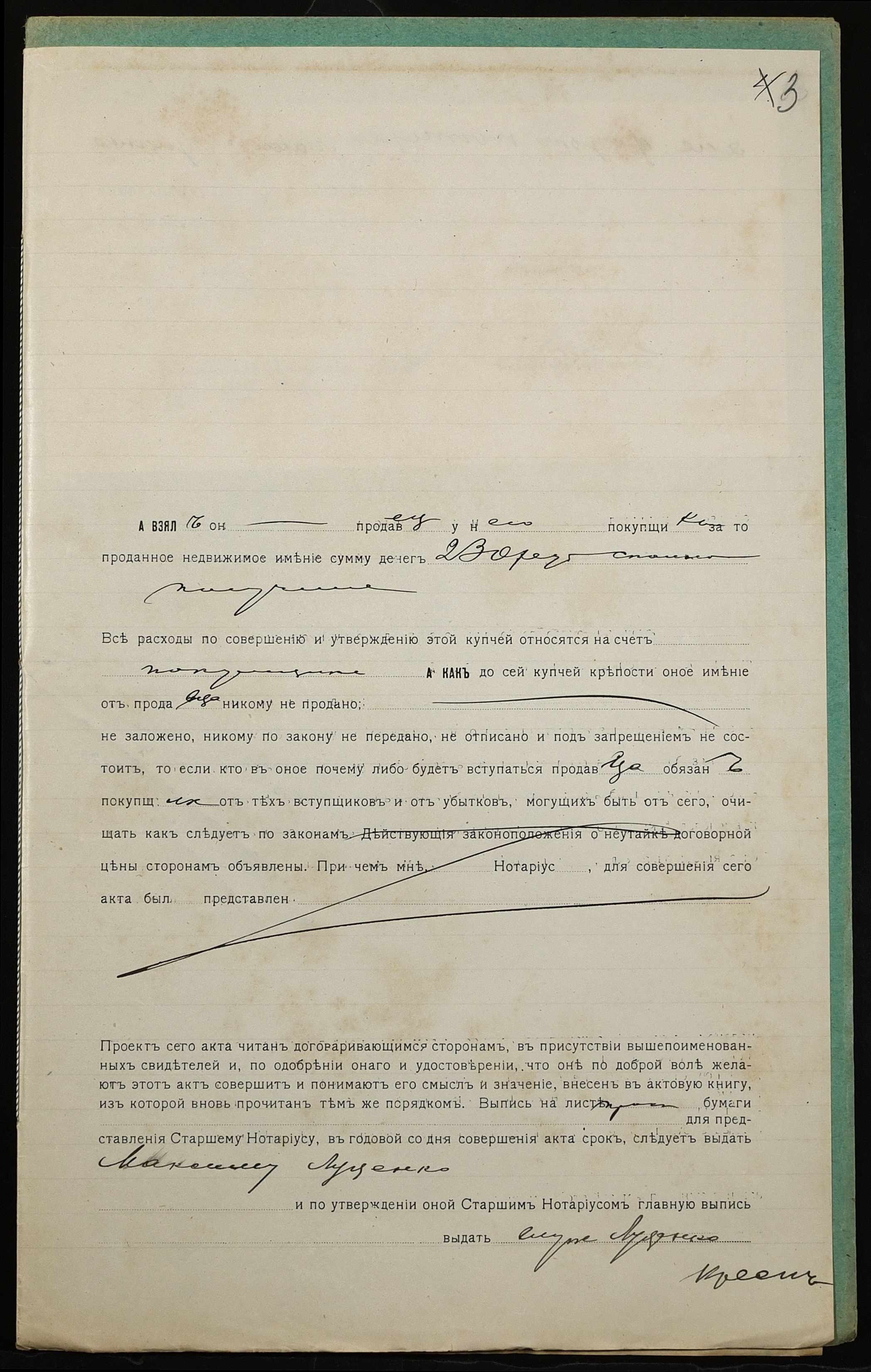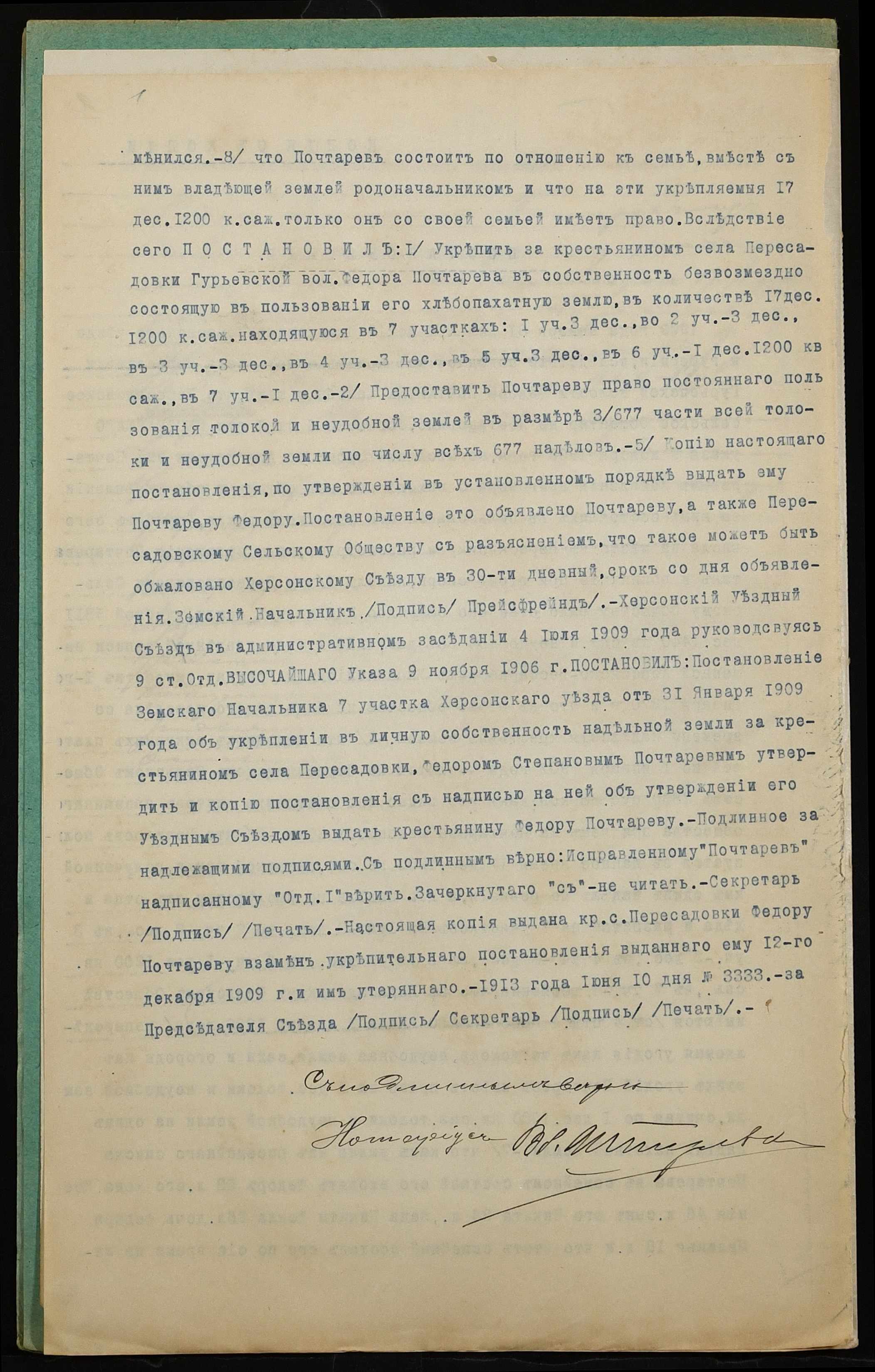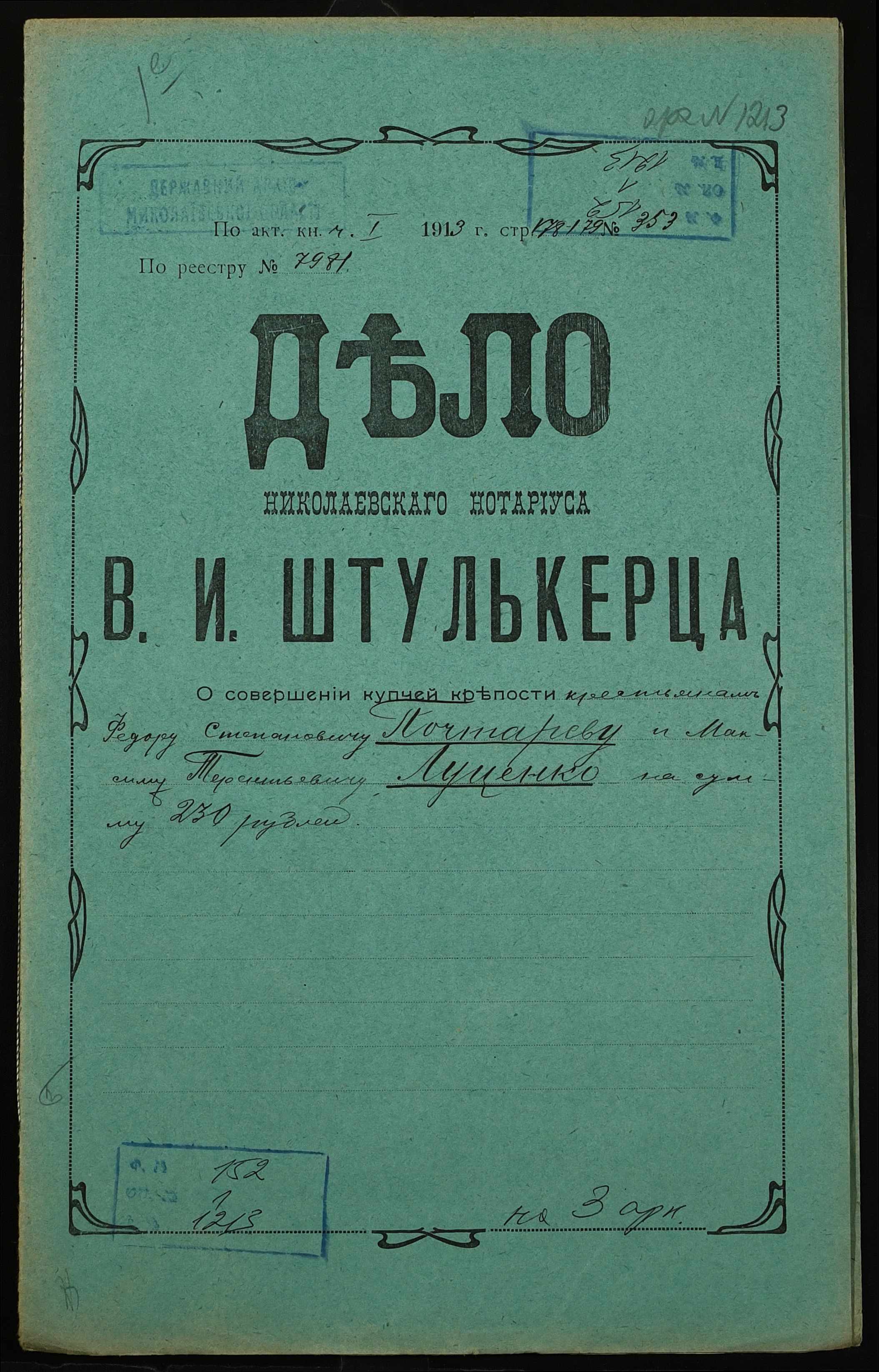• • • • Справа № 1213 “Справа про вчинення купчої про продаж землі селянином Почтарьовим Федором Степановичем (Почтаревым Федором Степановичем) на користь селянина Луценка Максима Терентійовича (Луценко Максима Терентьевича)”
