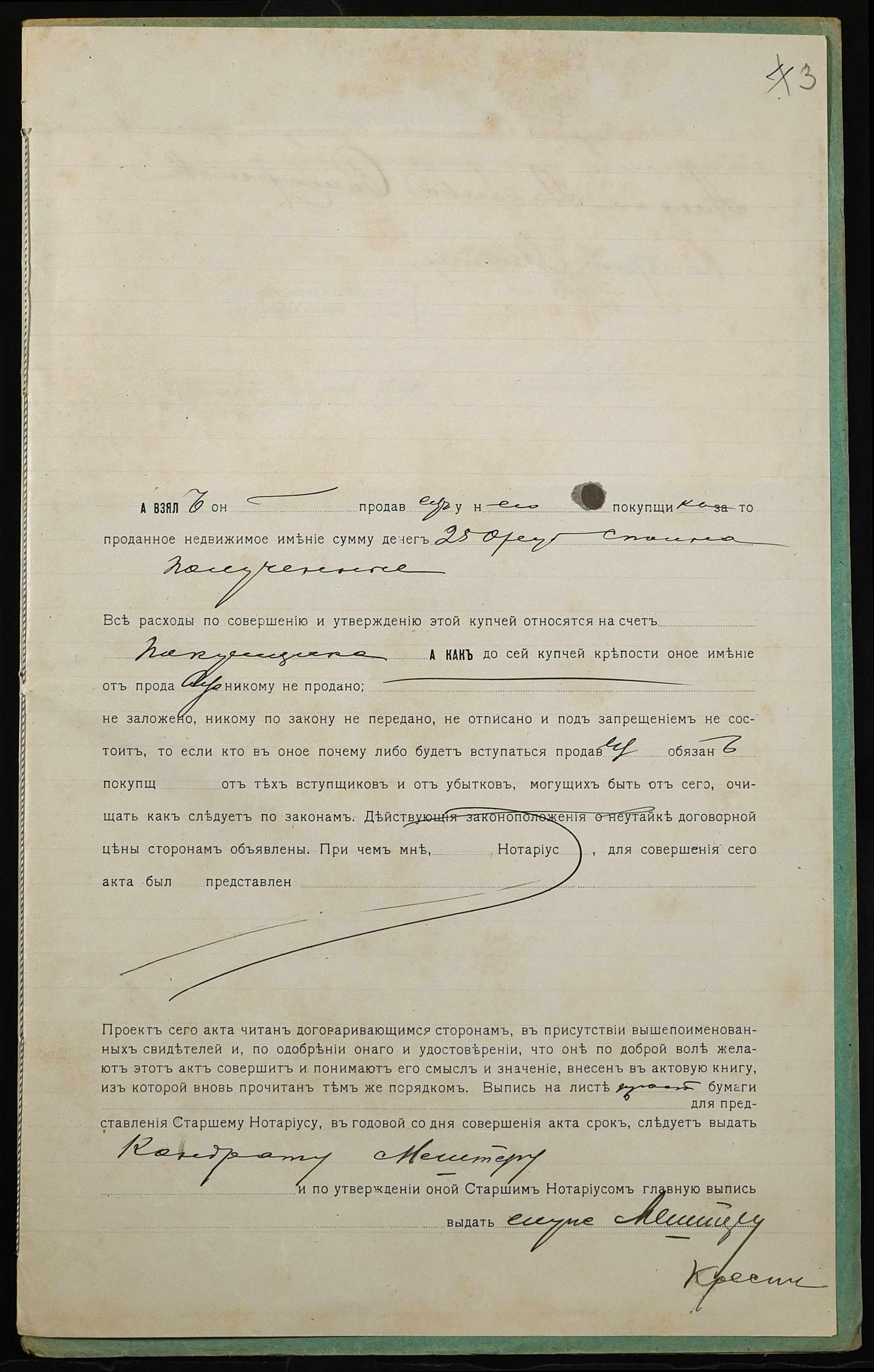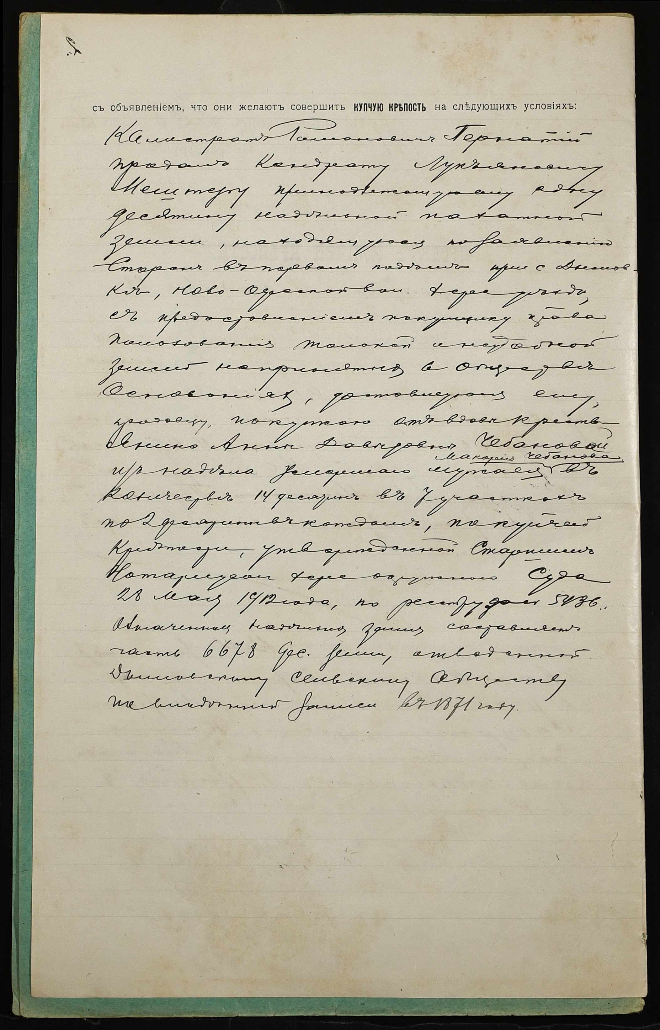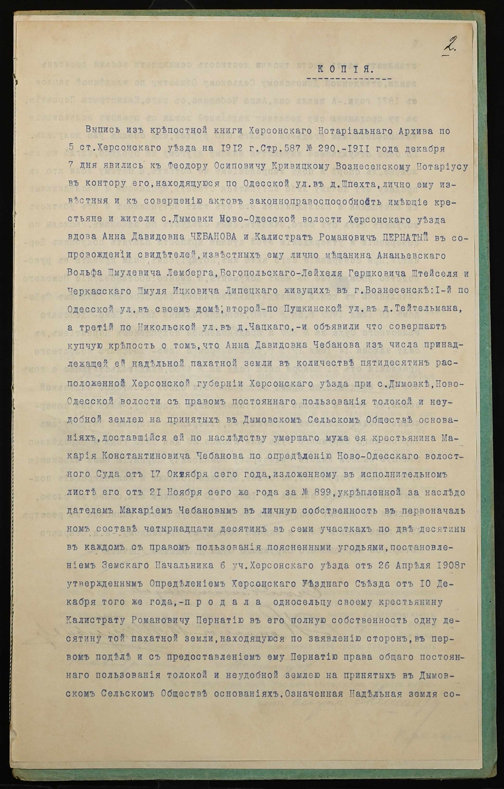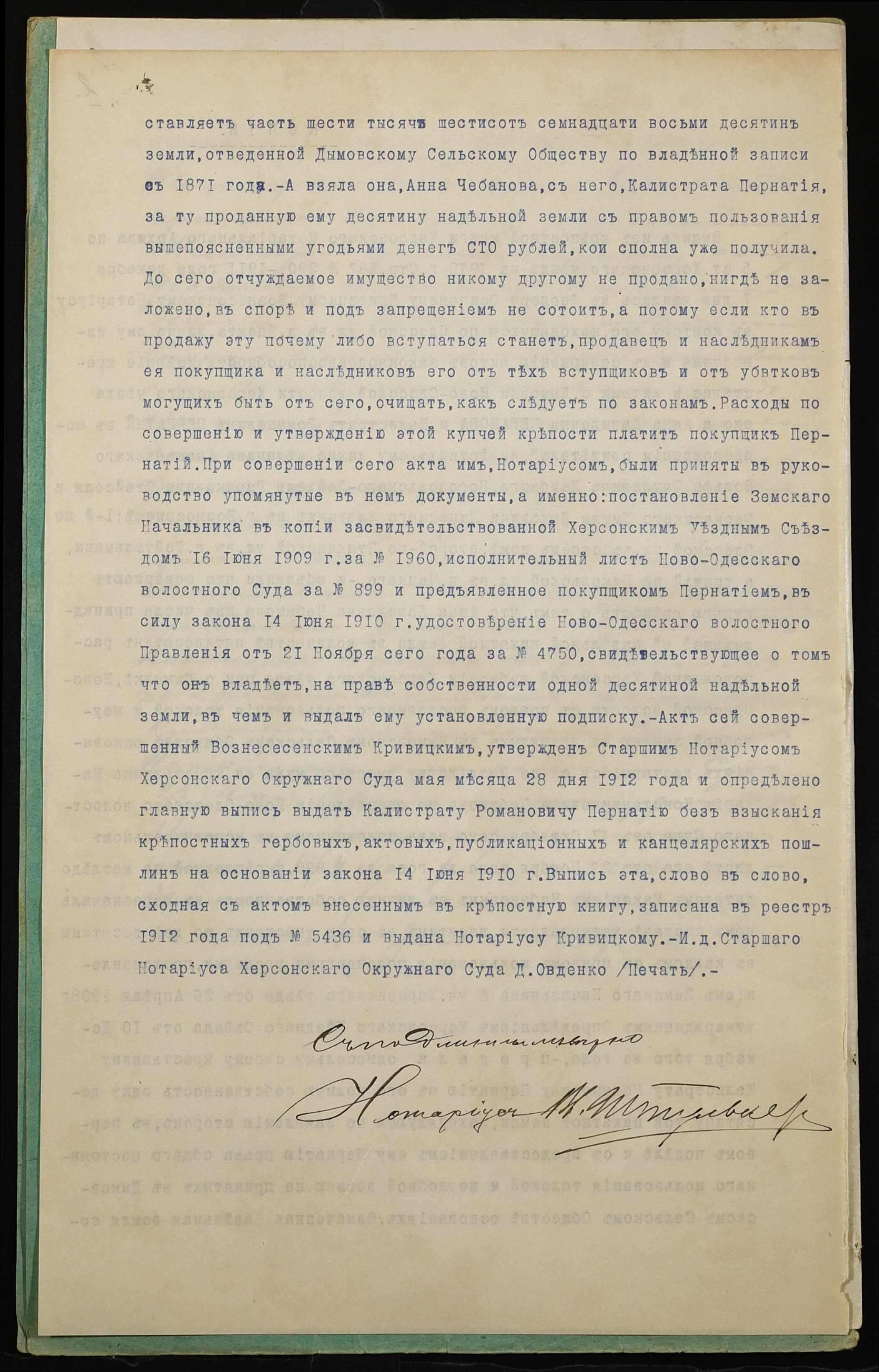 • • • • Справа № 1218 “Справа про вчинення купчої про продаж землі селянином Пернатієм Калістратом Романовичем (Пернатием Калистратом Романовичем) на користь селянина Мештера Кіндрата Лук’яновича (Мештера Кондрата Лукьяновича)”