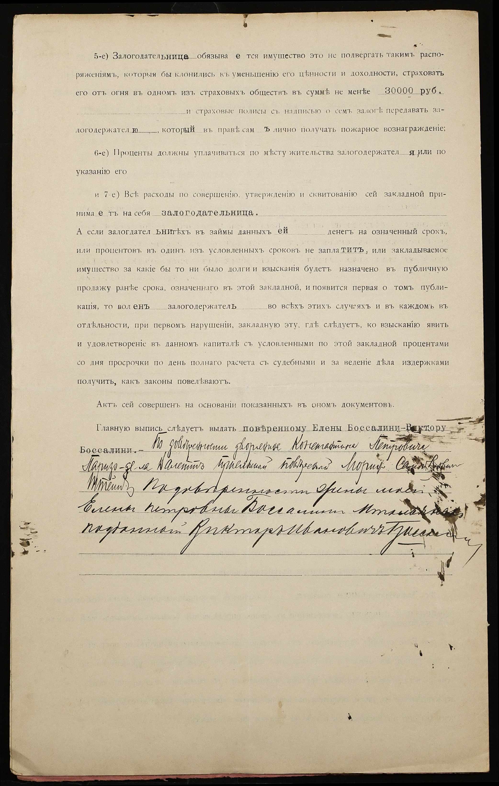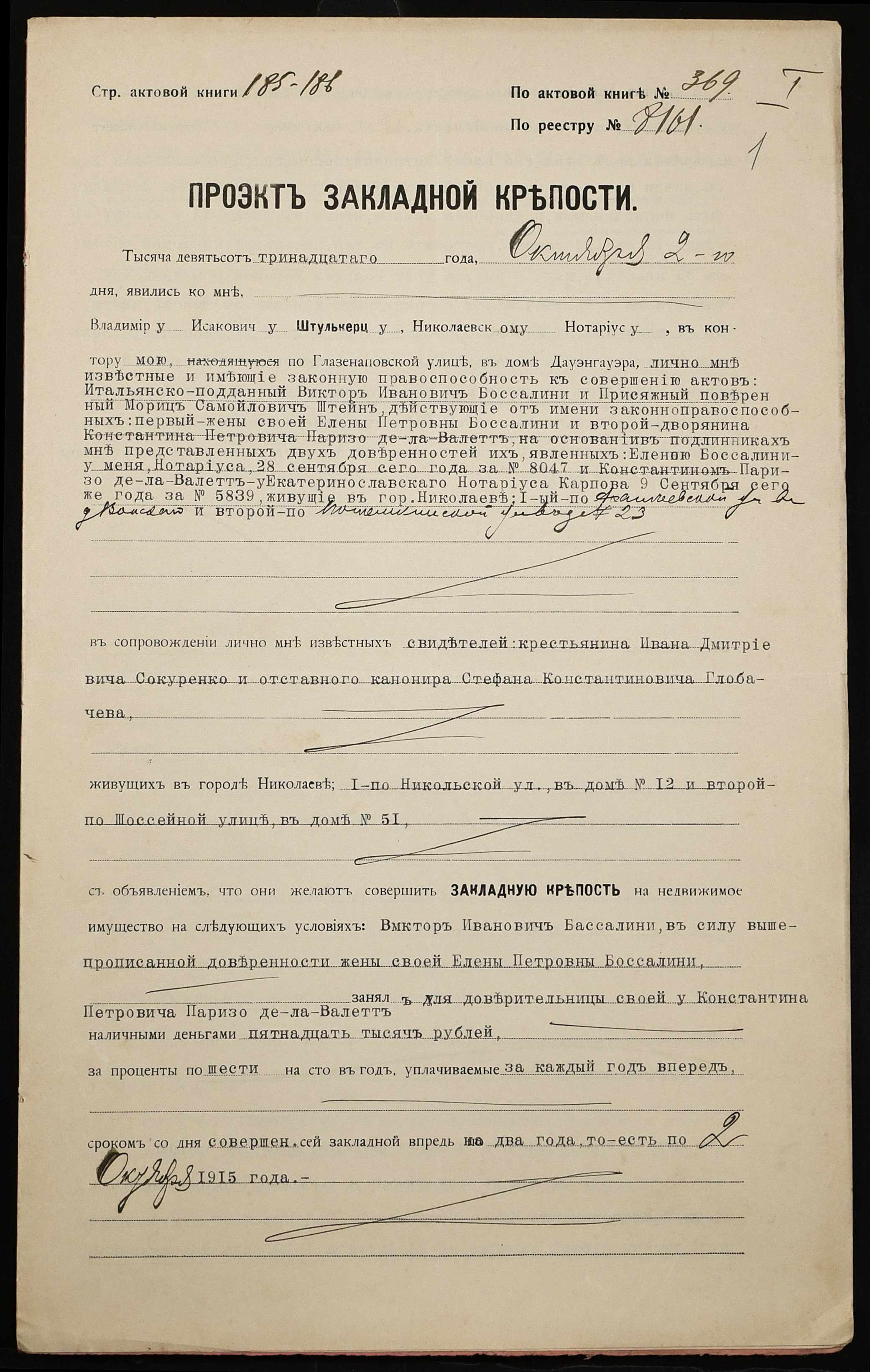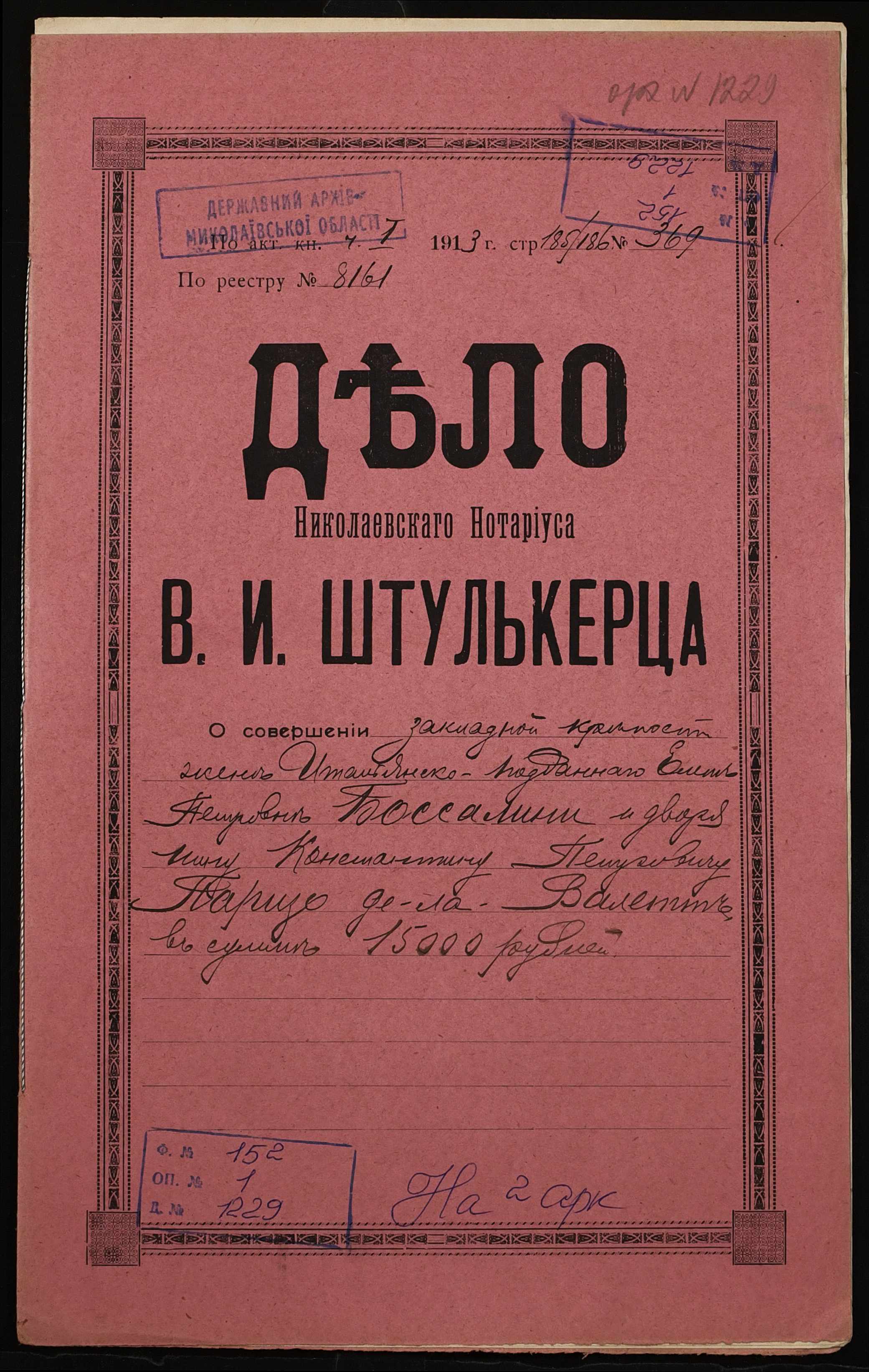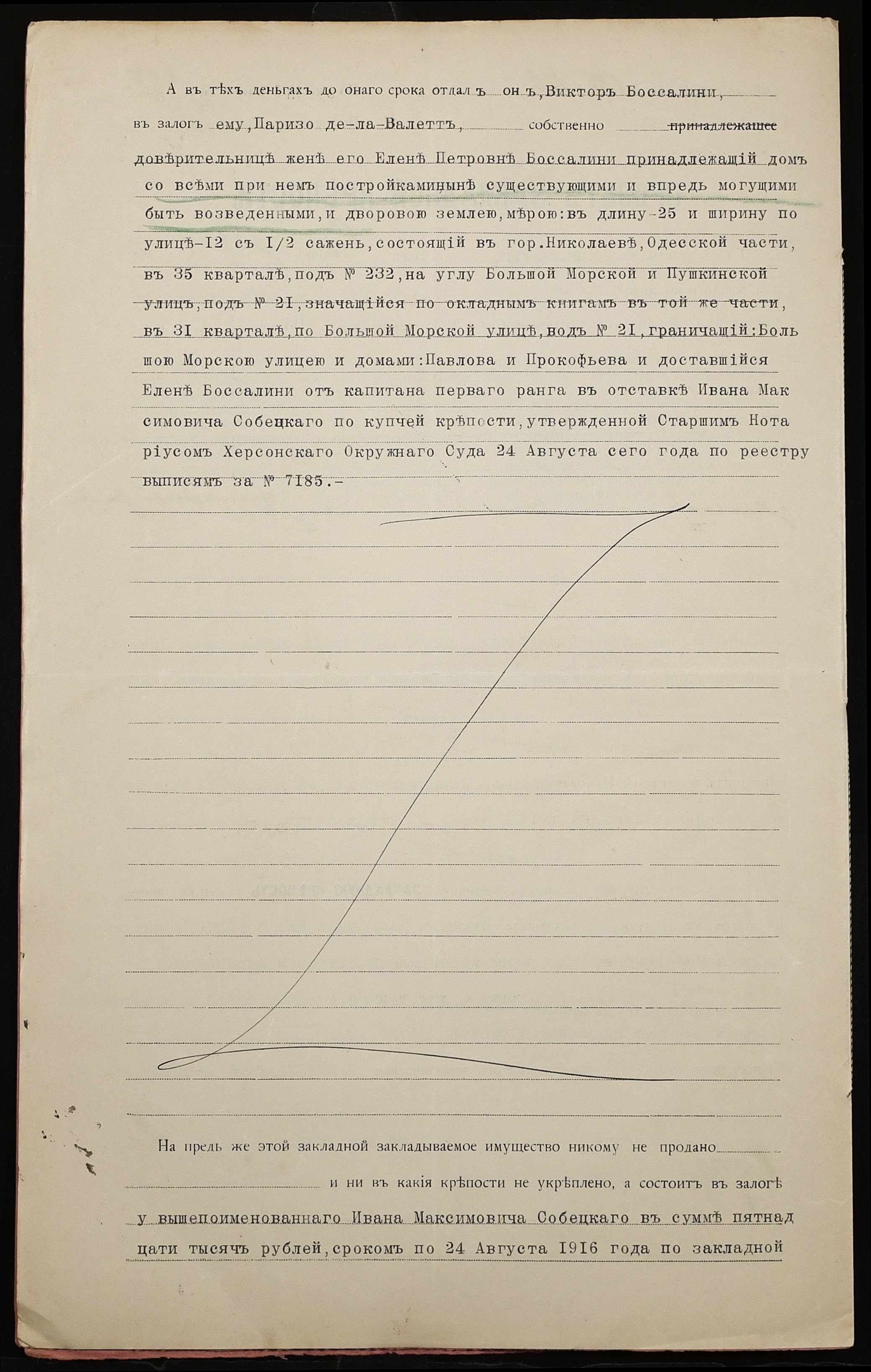 • • • • Справа № 1229 “Справа про вчинення заставної на будинок з усіма спорудами і дворовою землею, закладене дружиною підданого Італії Боссаліні Оленою Петрівною (Боссалини Еленой Петровной) – дворянину Парізо-де-ла-Валетт Костянтину Петровичу (Паризо-де-ла-Валетт Константину Петровичу)”