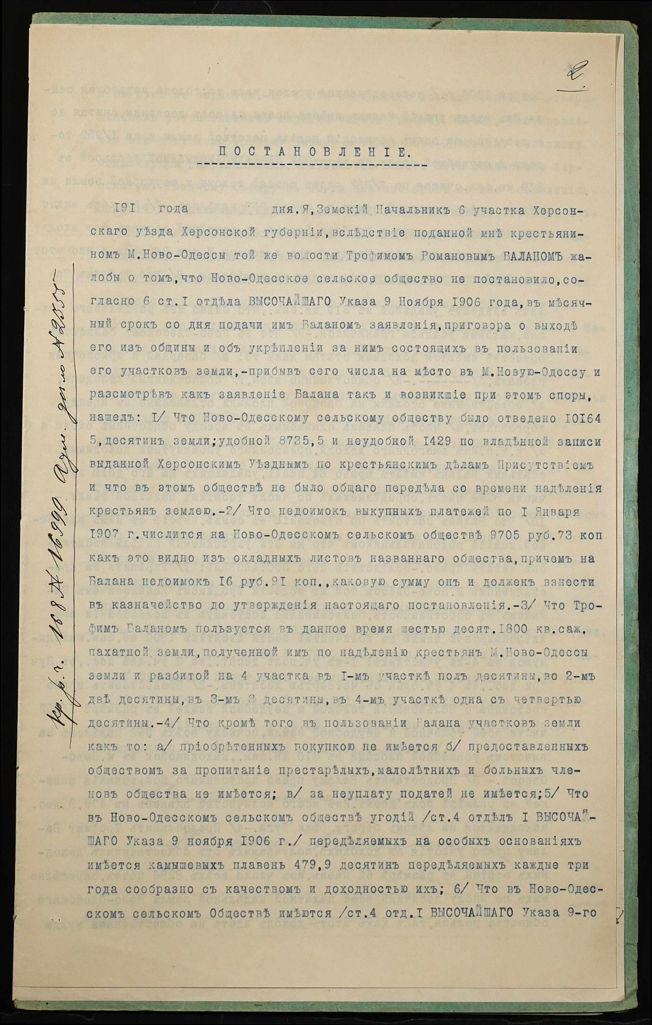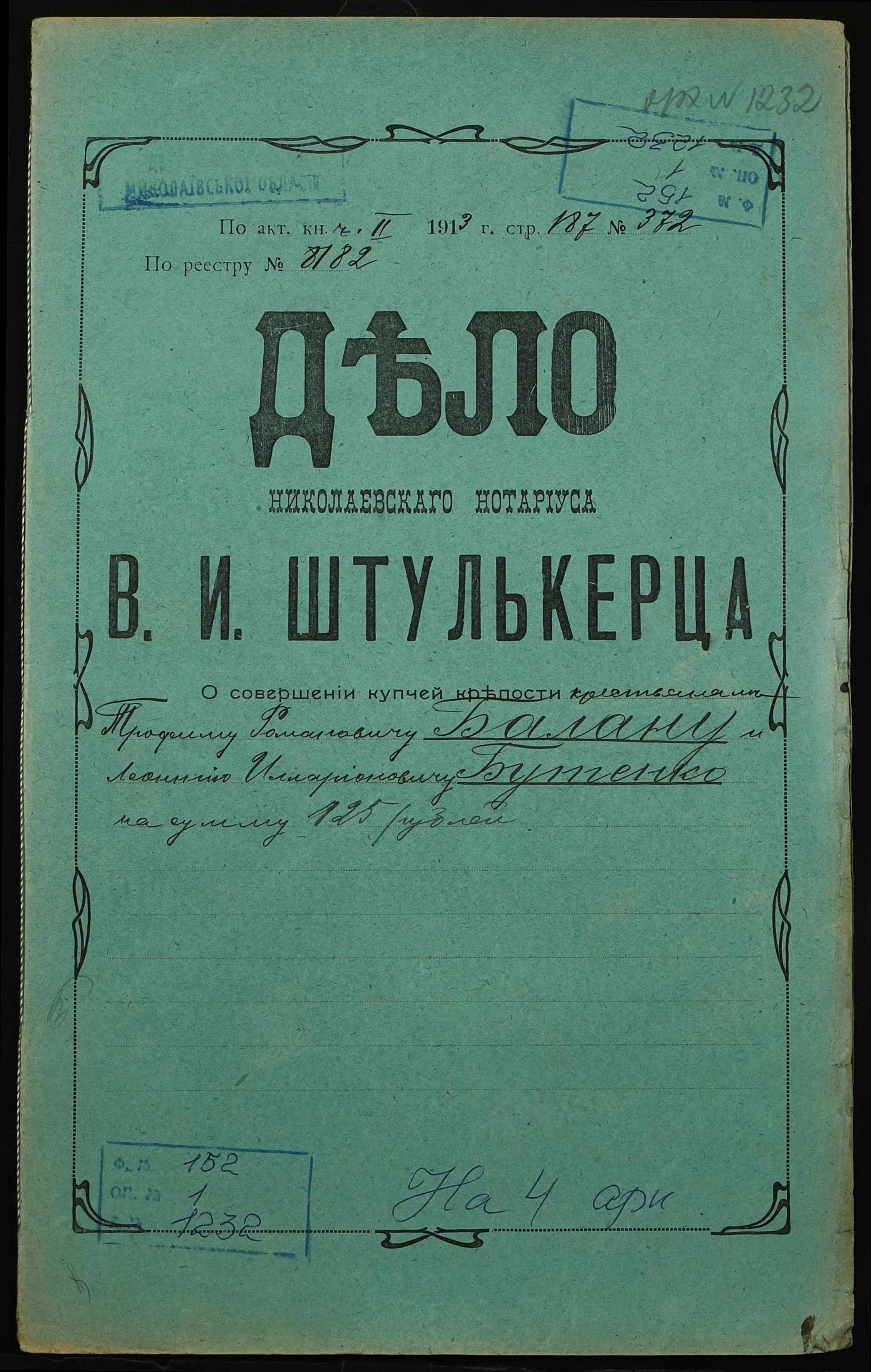 • • • • Справа № 1232 “Справа про вчинення купчої про продаж землі селянином Баланом Трохимом Романовичем (Баланом Трофимом Романовичем) на користь селянина Бутенка Леонтія Іларіоновича (Бутенко Леонтия Илларионовича)”