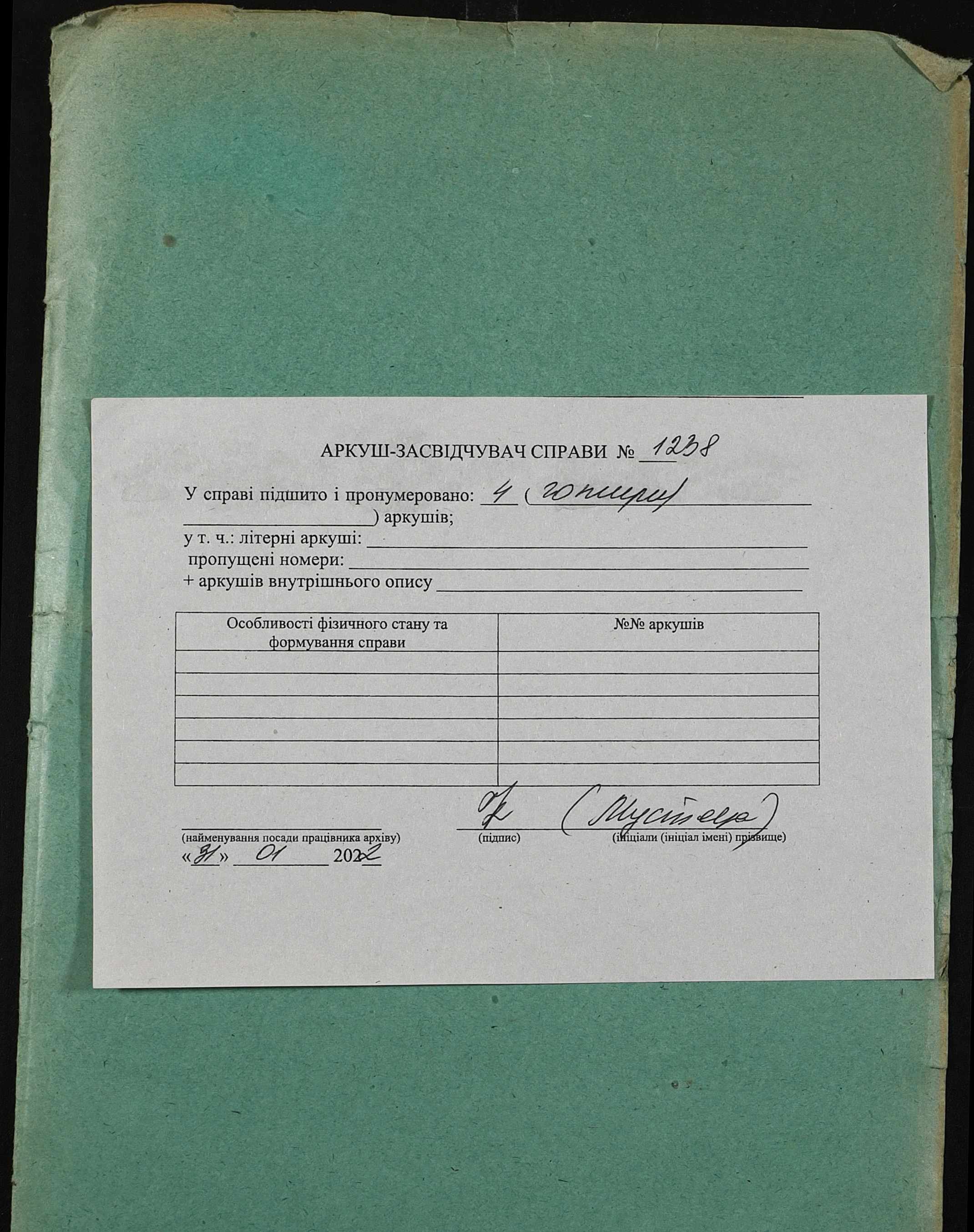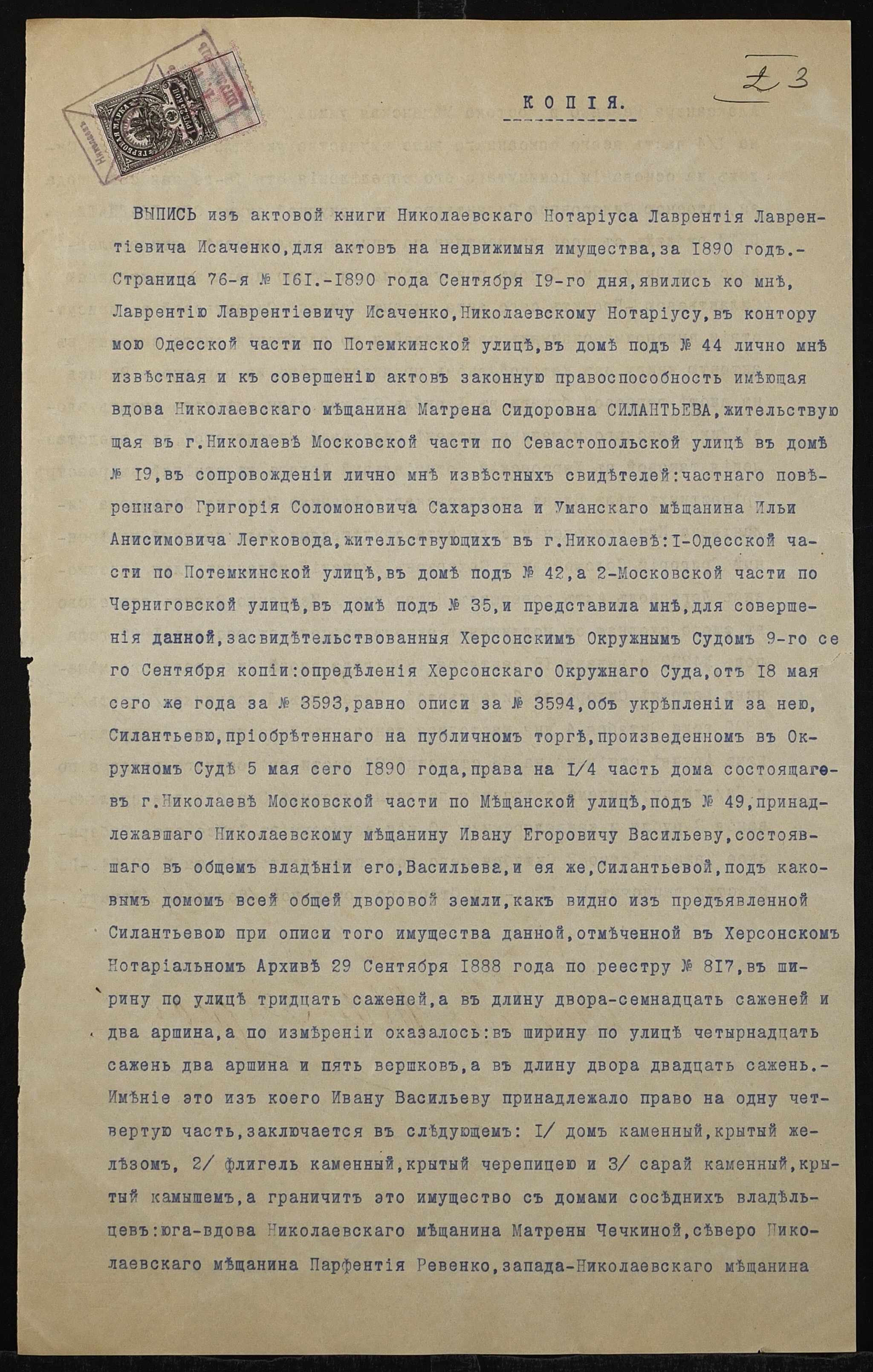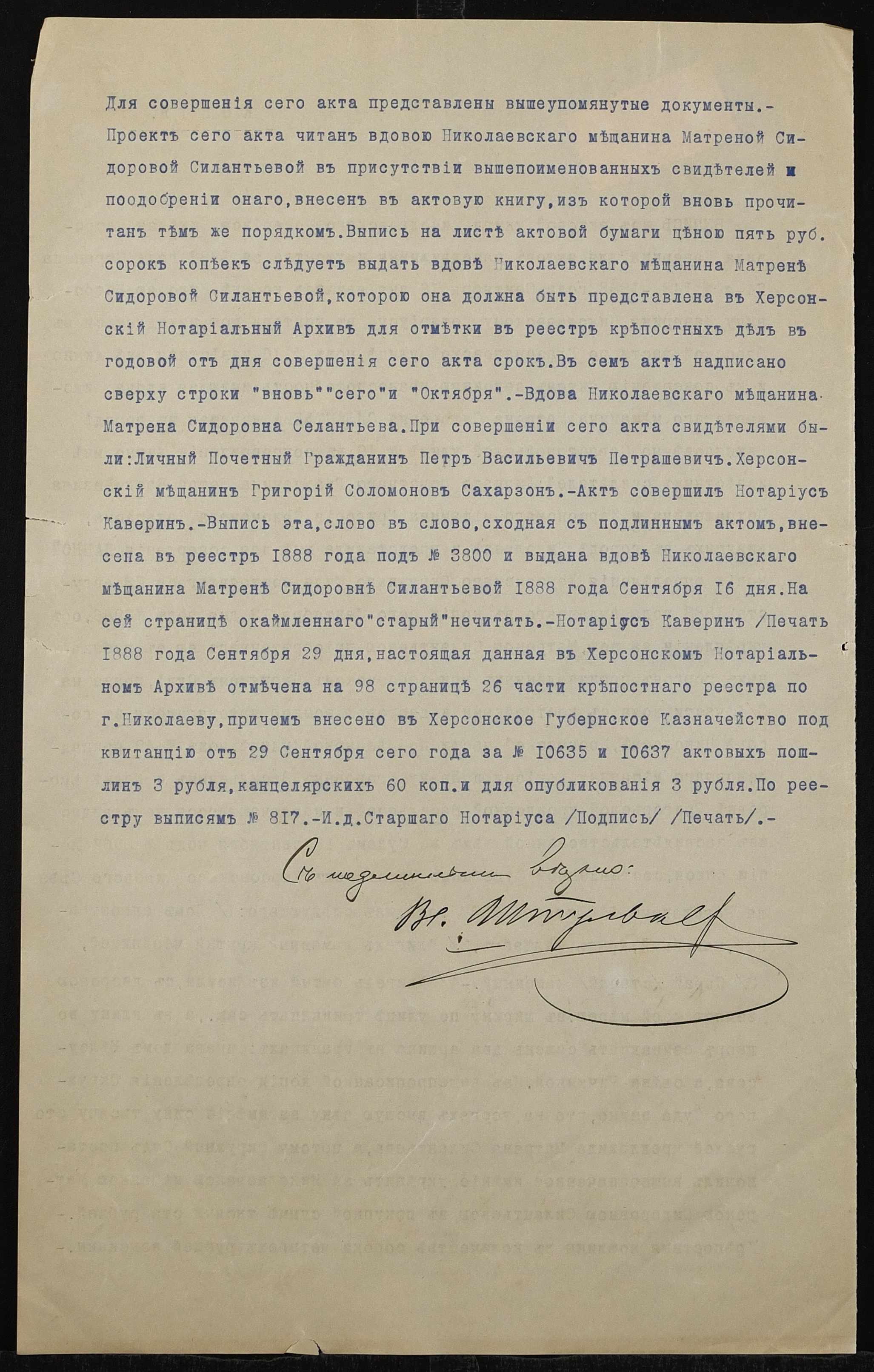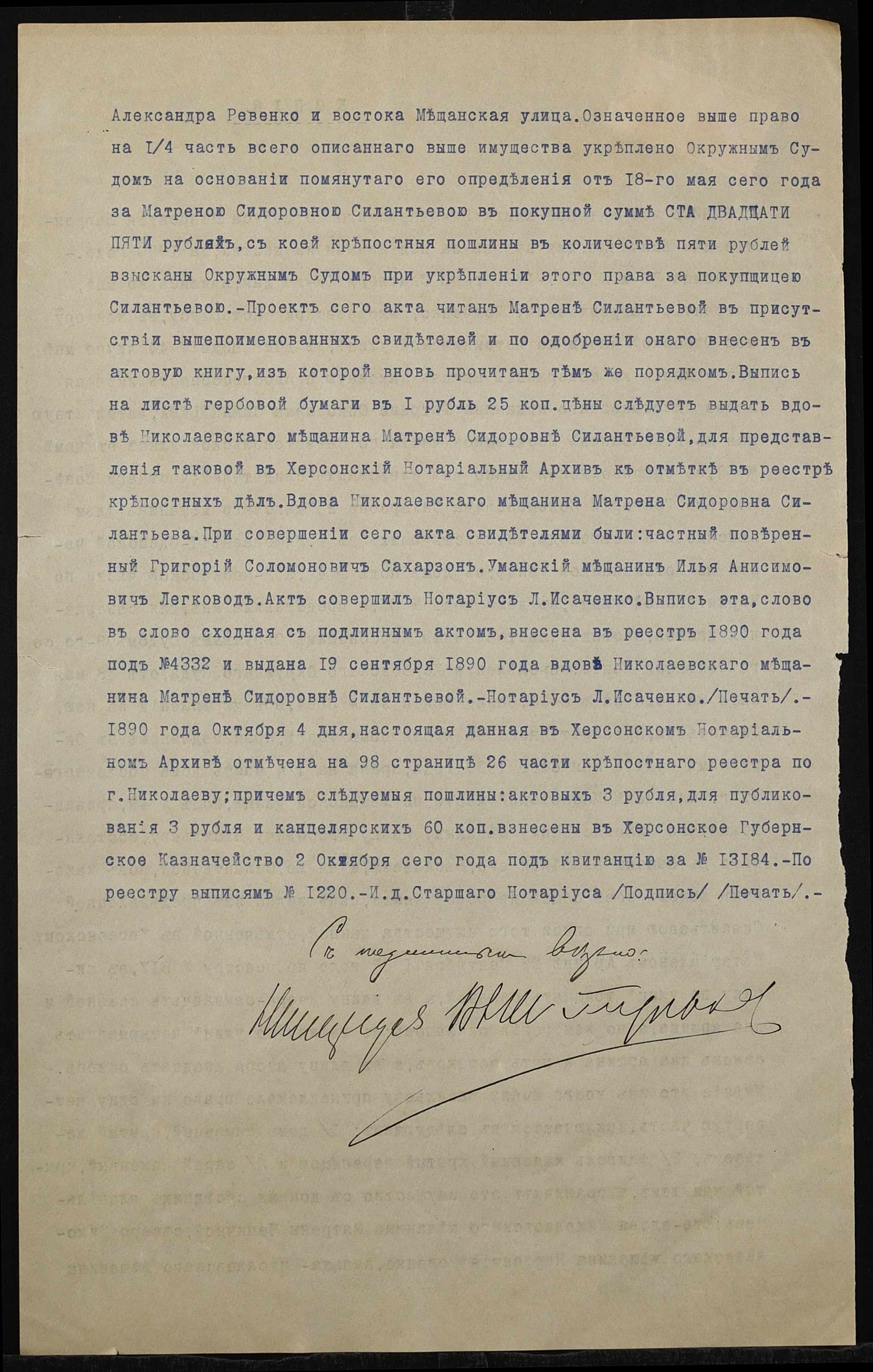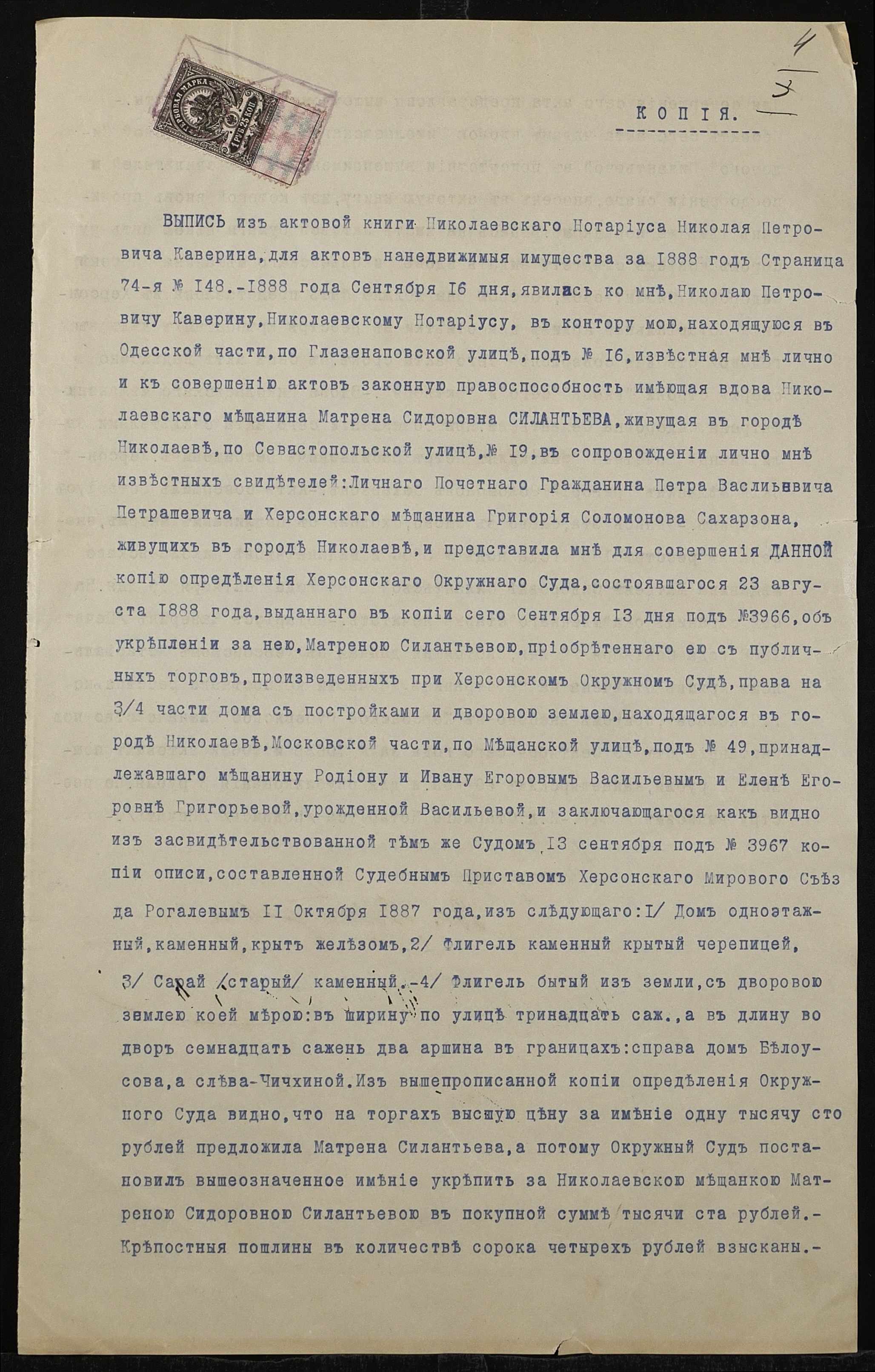 • • • • Справа № 1238 “Справа про вчинення купчої про продаж будинку дружиною священника Латою Клавдією Стефанівною (Латой Клавдией Стефановной) на користь миколаївських міщан Мускіна Антона Микитовича (Мускина Антона Никитовича) і Мускіна Олександра Олександровича (Мускина Александра Александровича)”