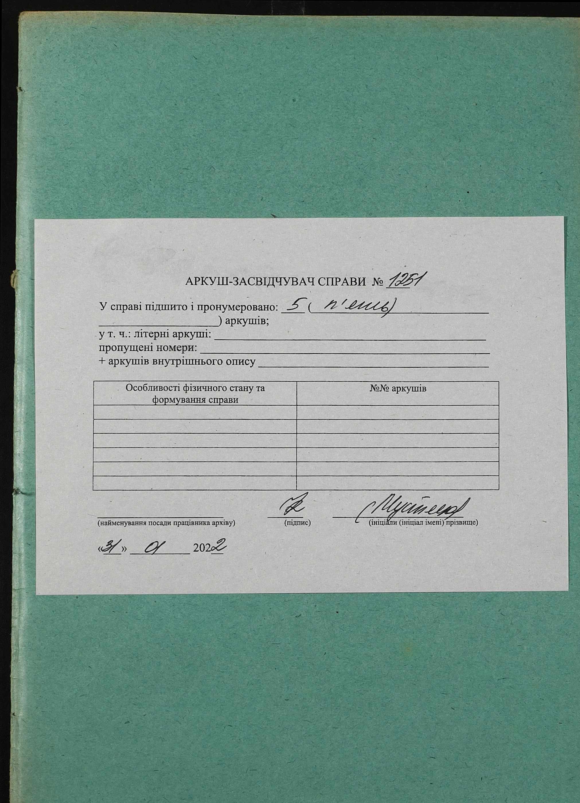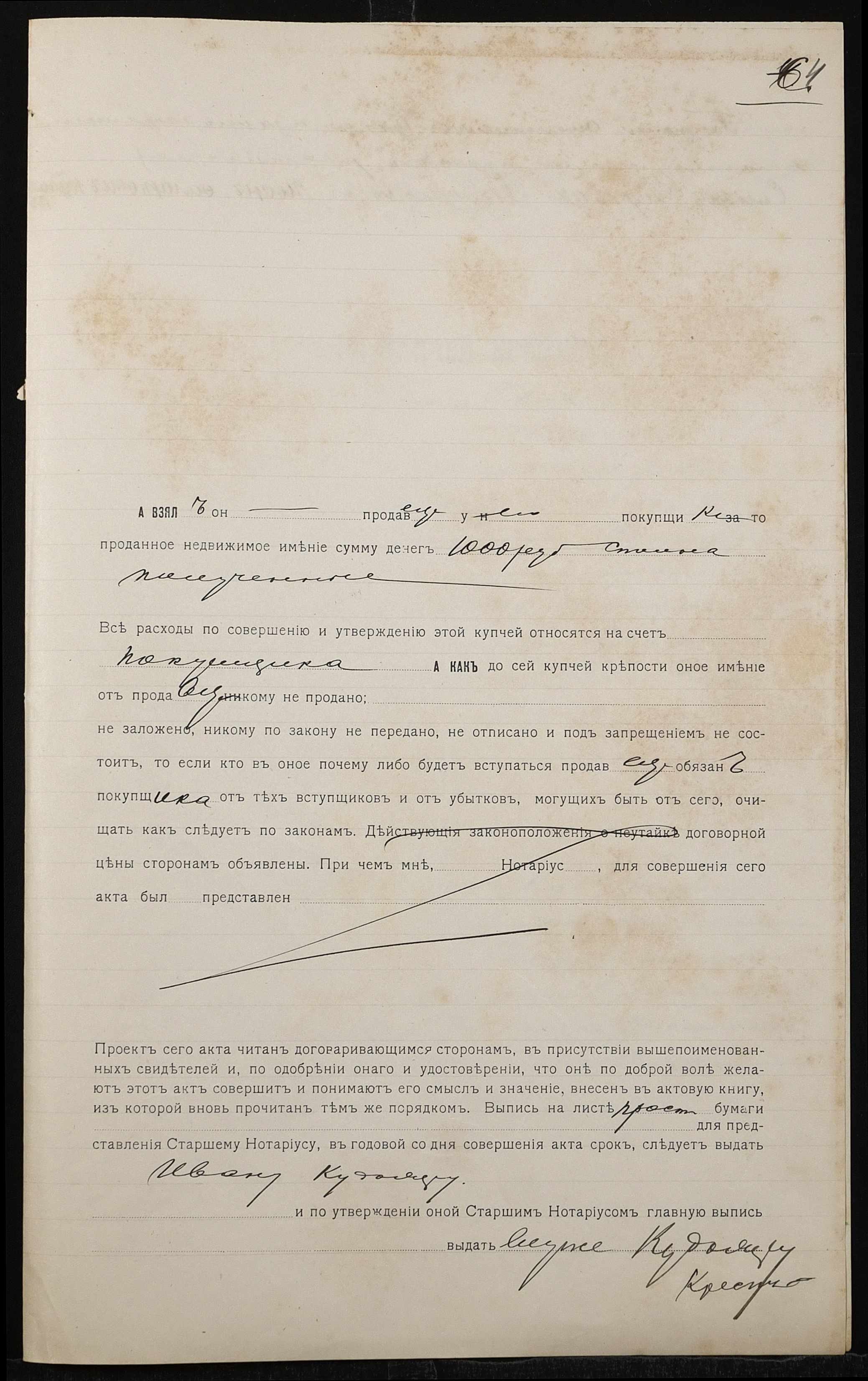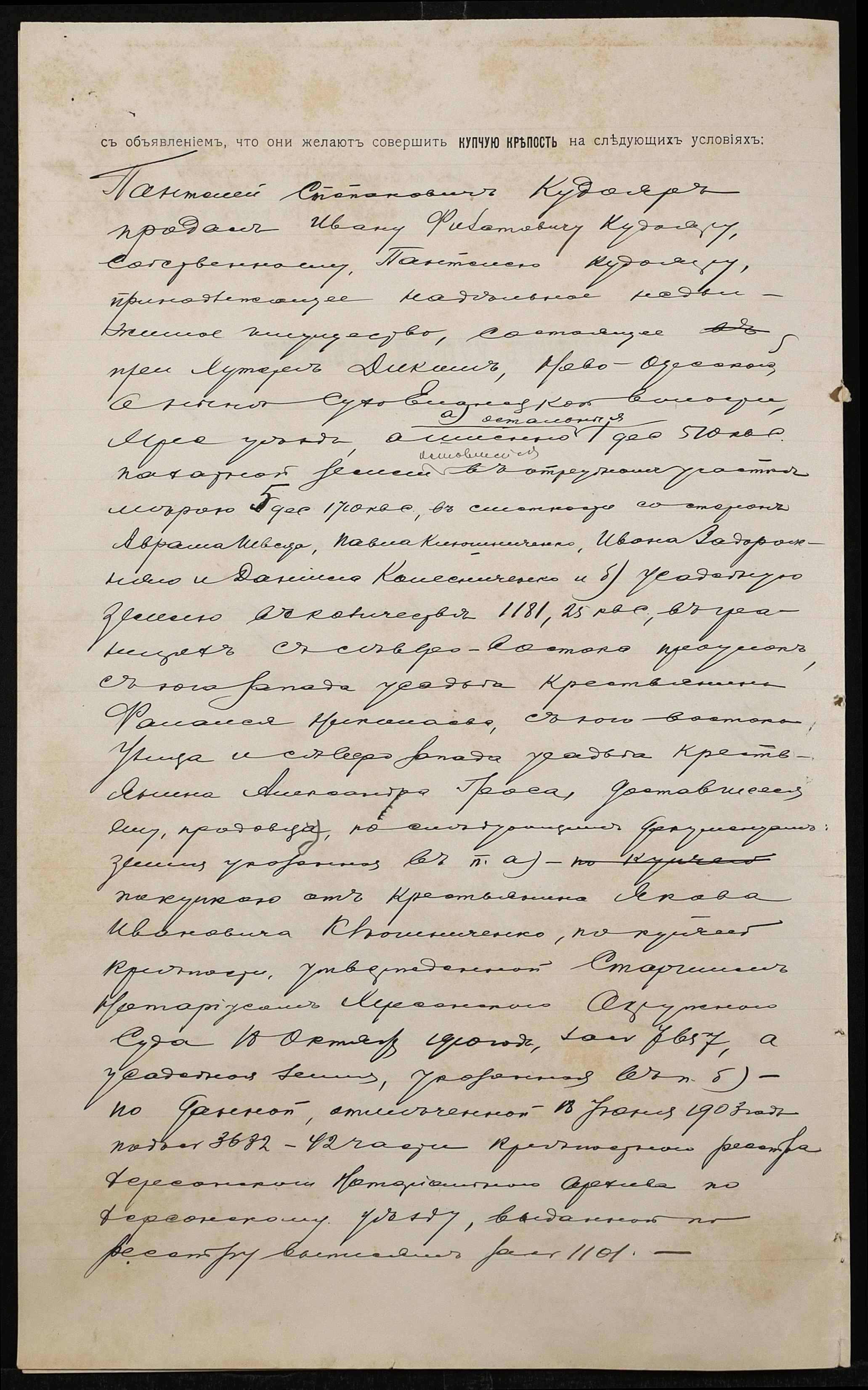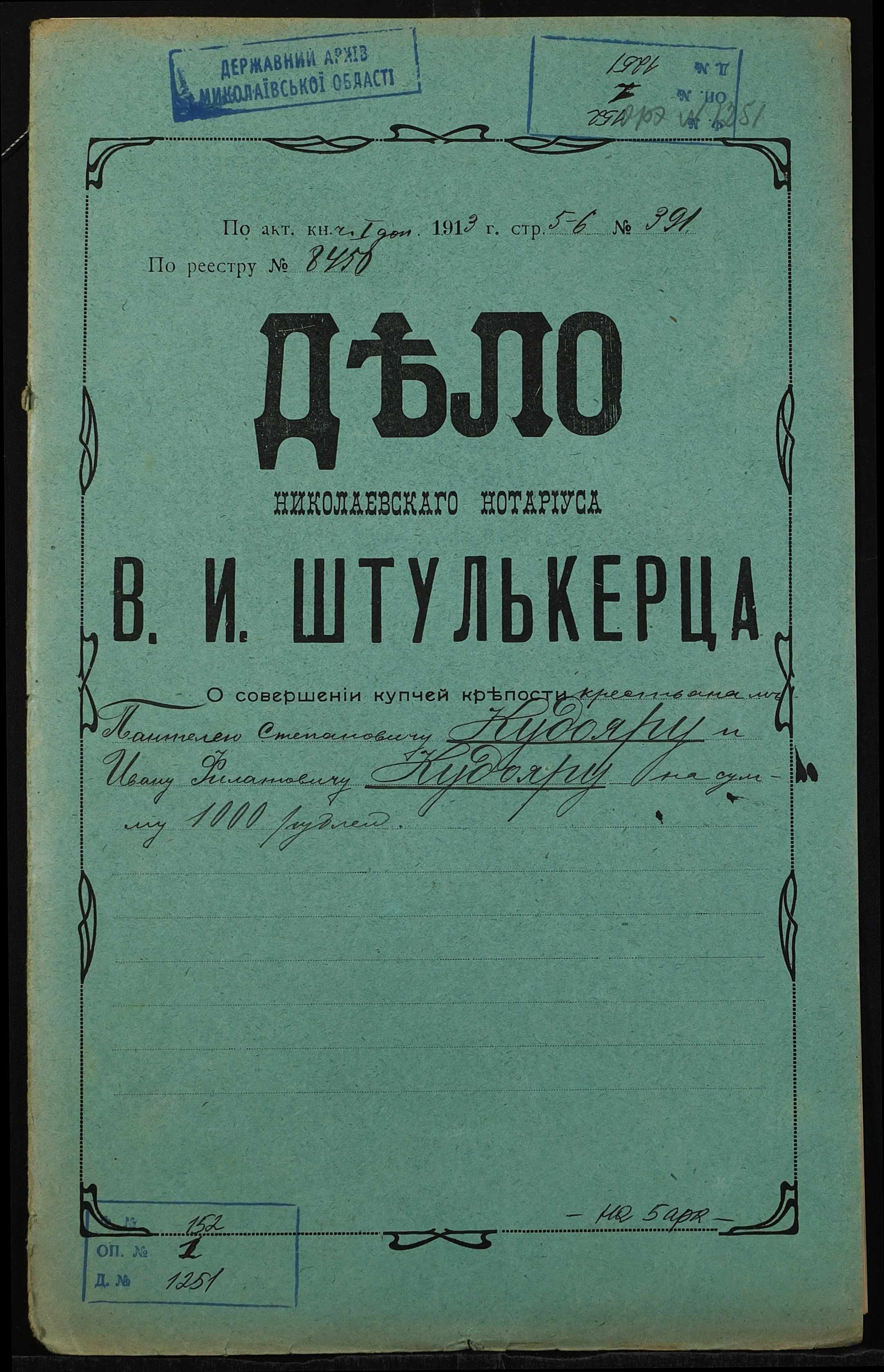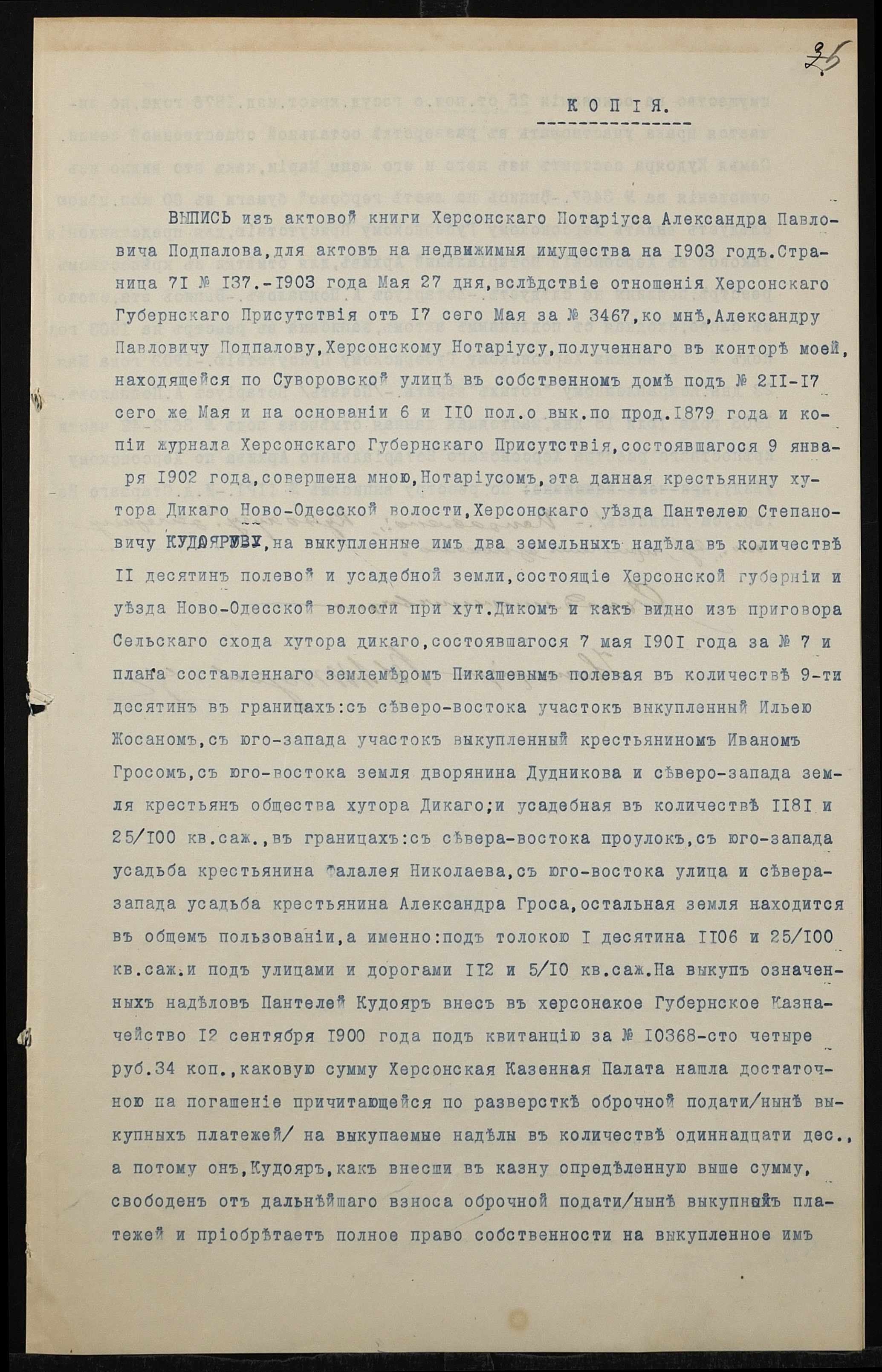 • • • • Справа № 1251 “Справа про вчинення купчої про продаж землі селянином Кудояром Пантелієм Степановичем (Кудояром Пантелеем Степановичем) на користь селянина Кудояра Івана Філатовича (Кудояра Ивана Филатовича)”