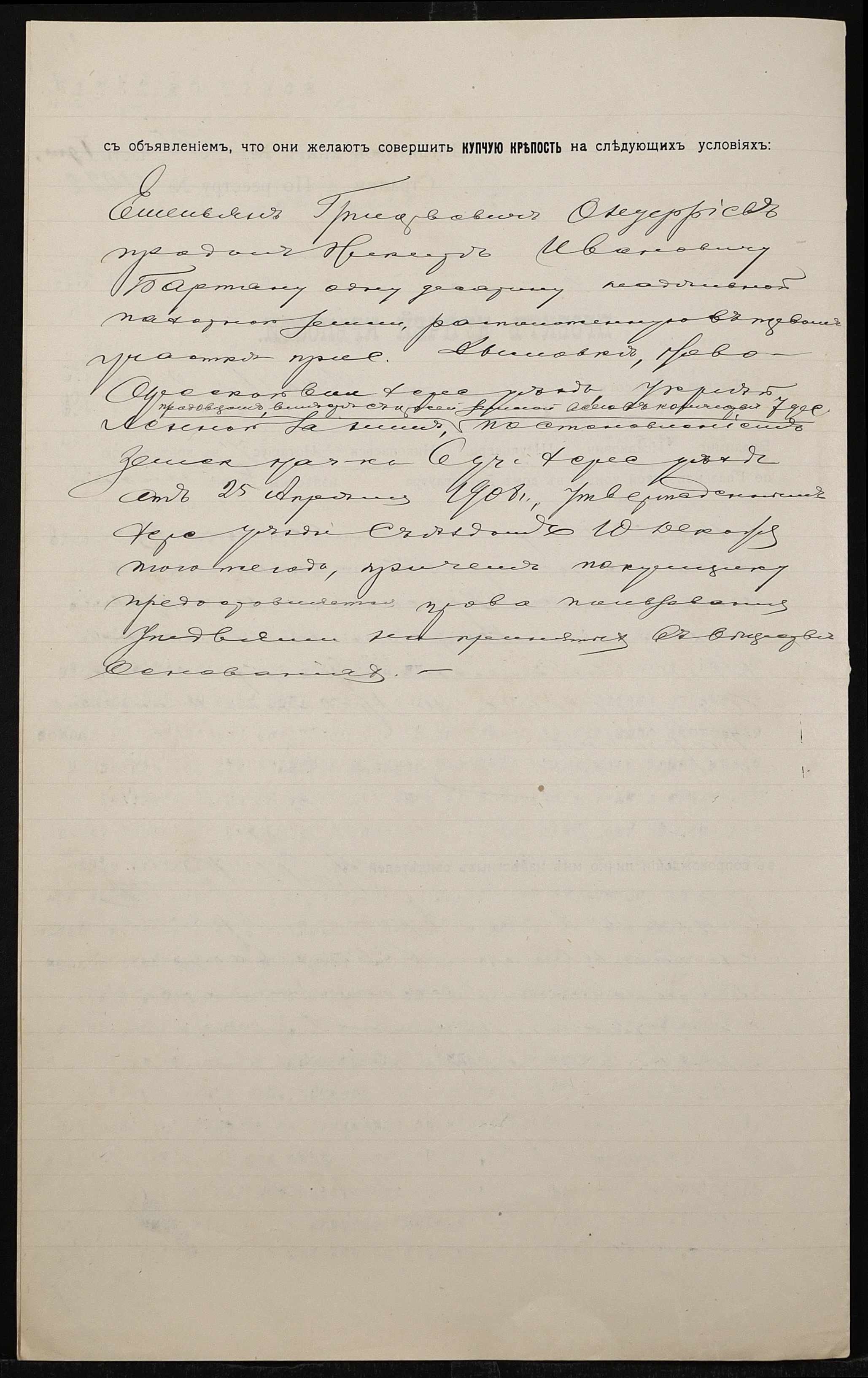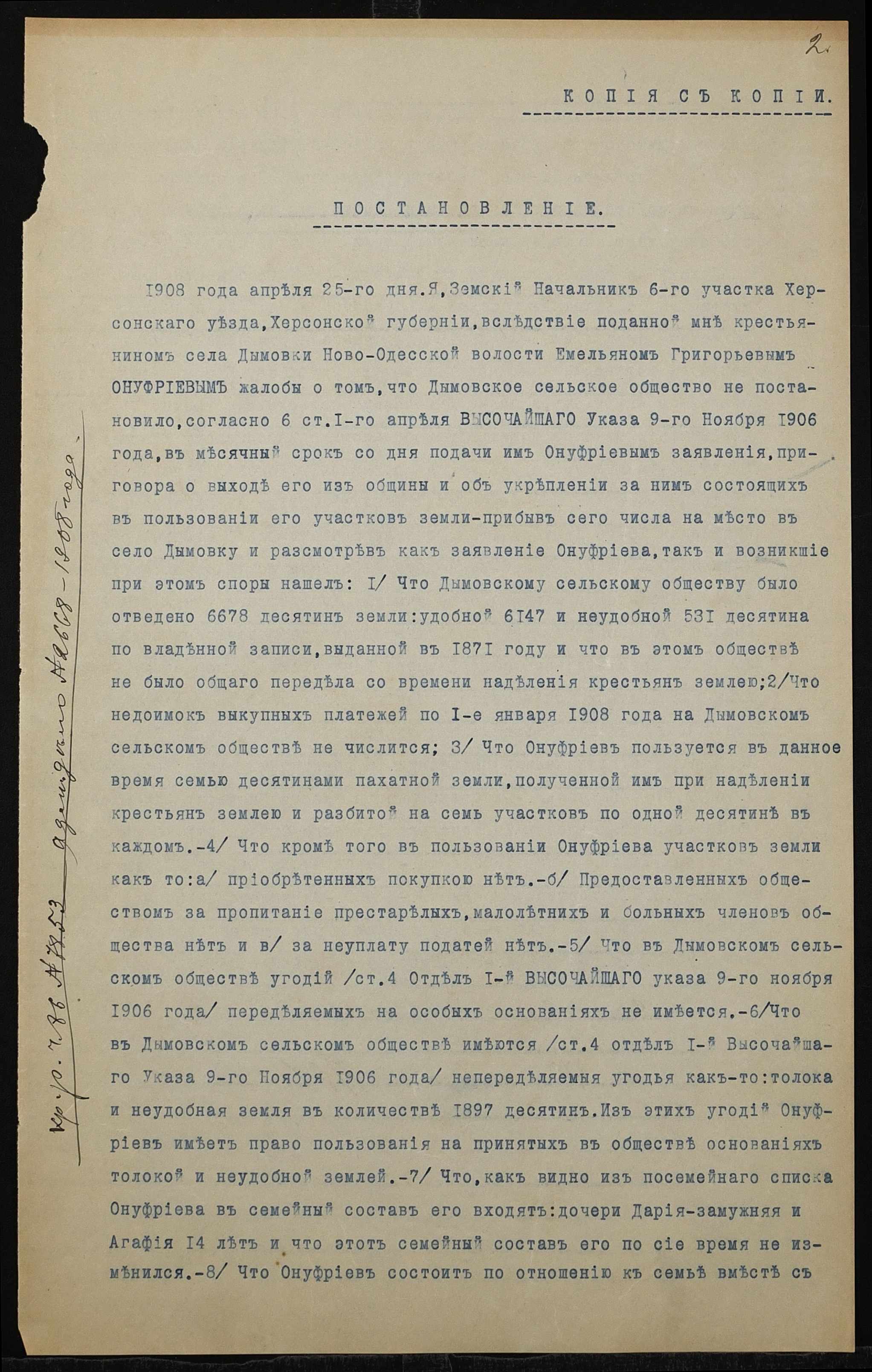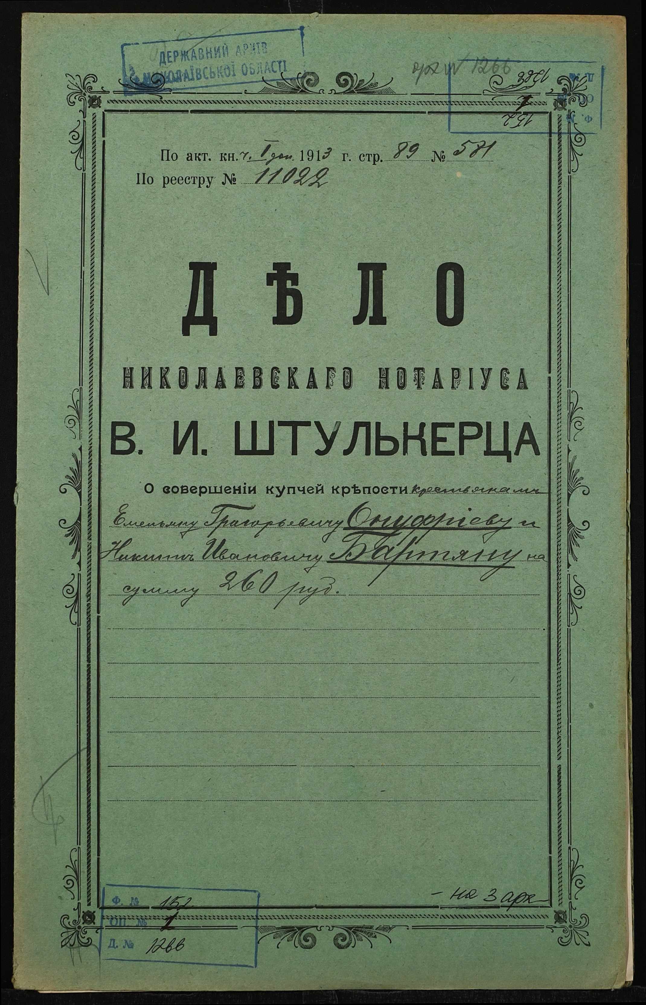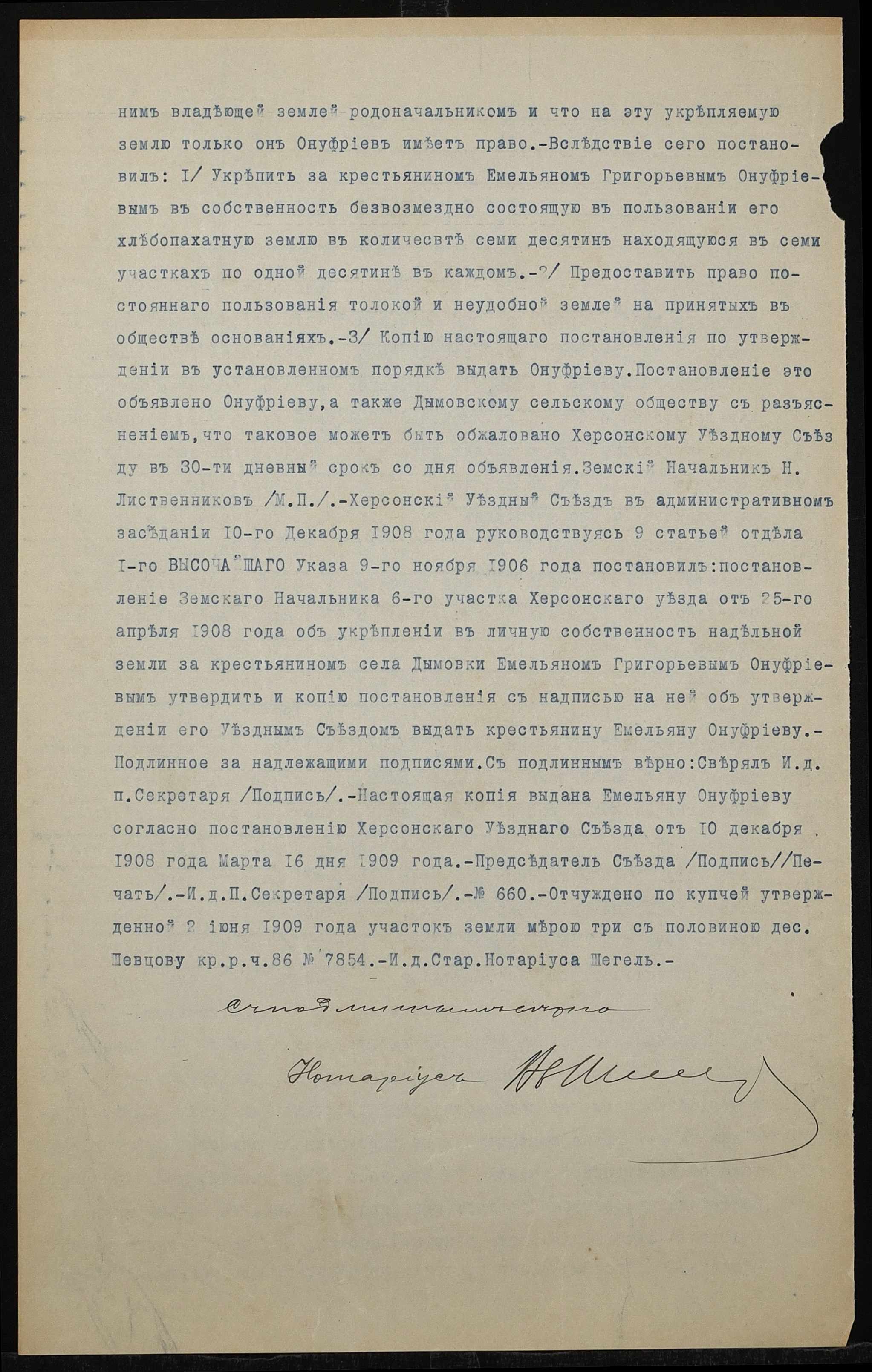 • • • • Справа № 1266 “Справа про вчинення купчої про продаж землі селянином Онуфрієвим Омеляном Григоровичем (Онуфриевым Емельяном Григорьевичем) на користь селянина Бартяна Микити Івановича (Бартяна Никиты Ивановича)”