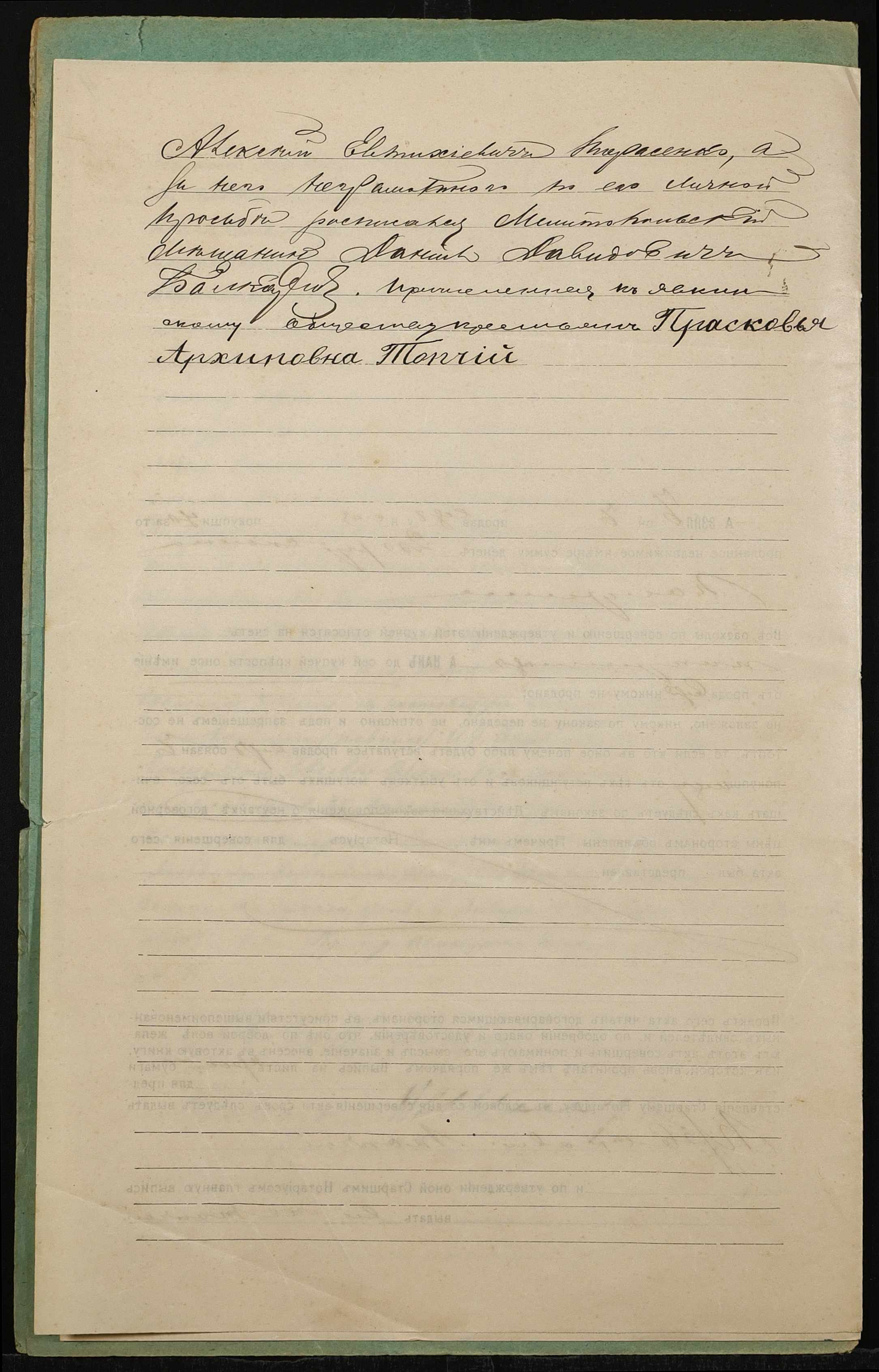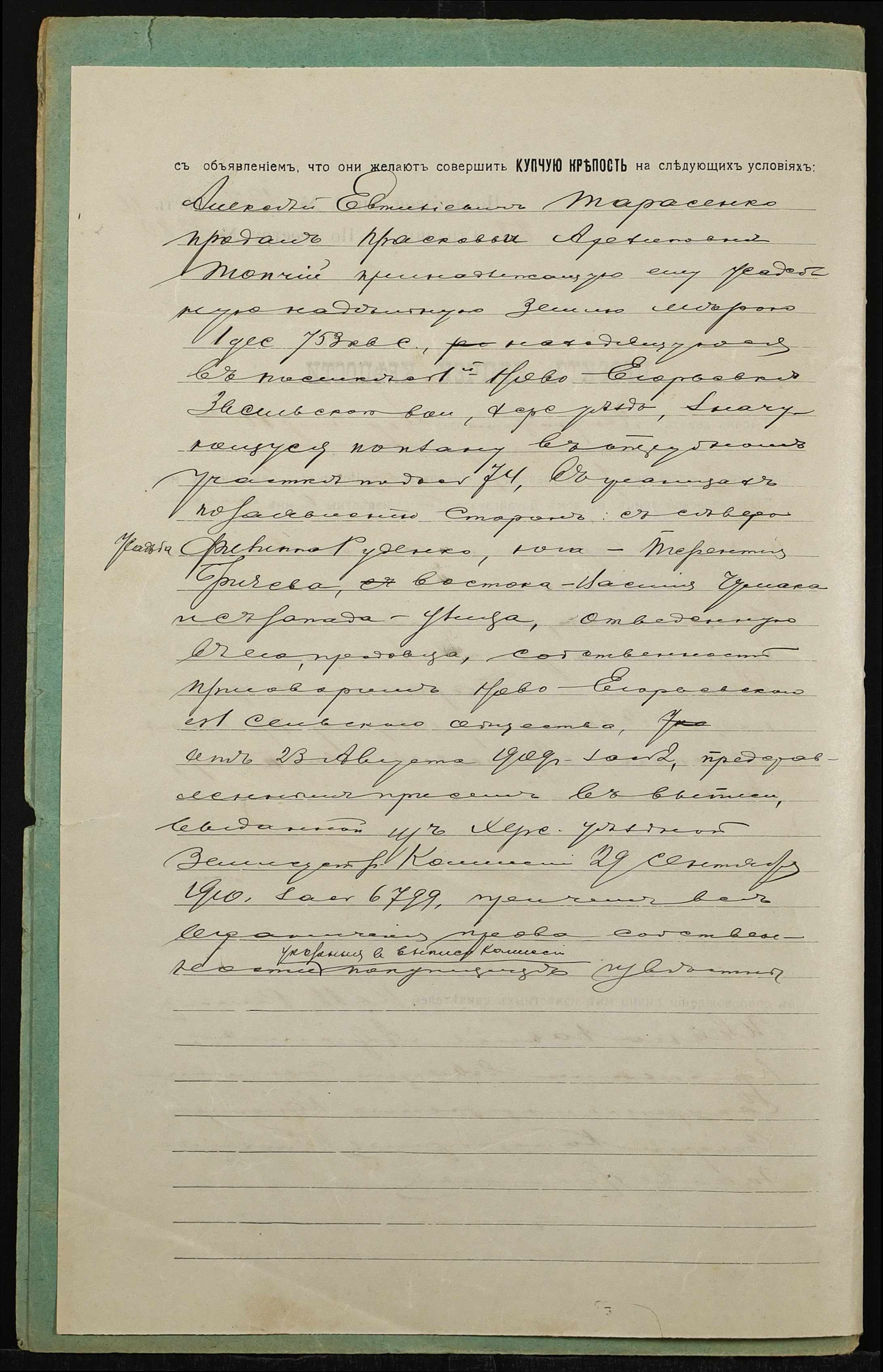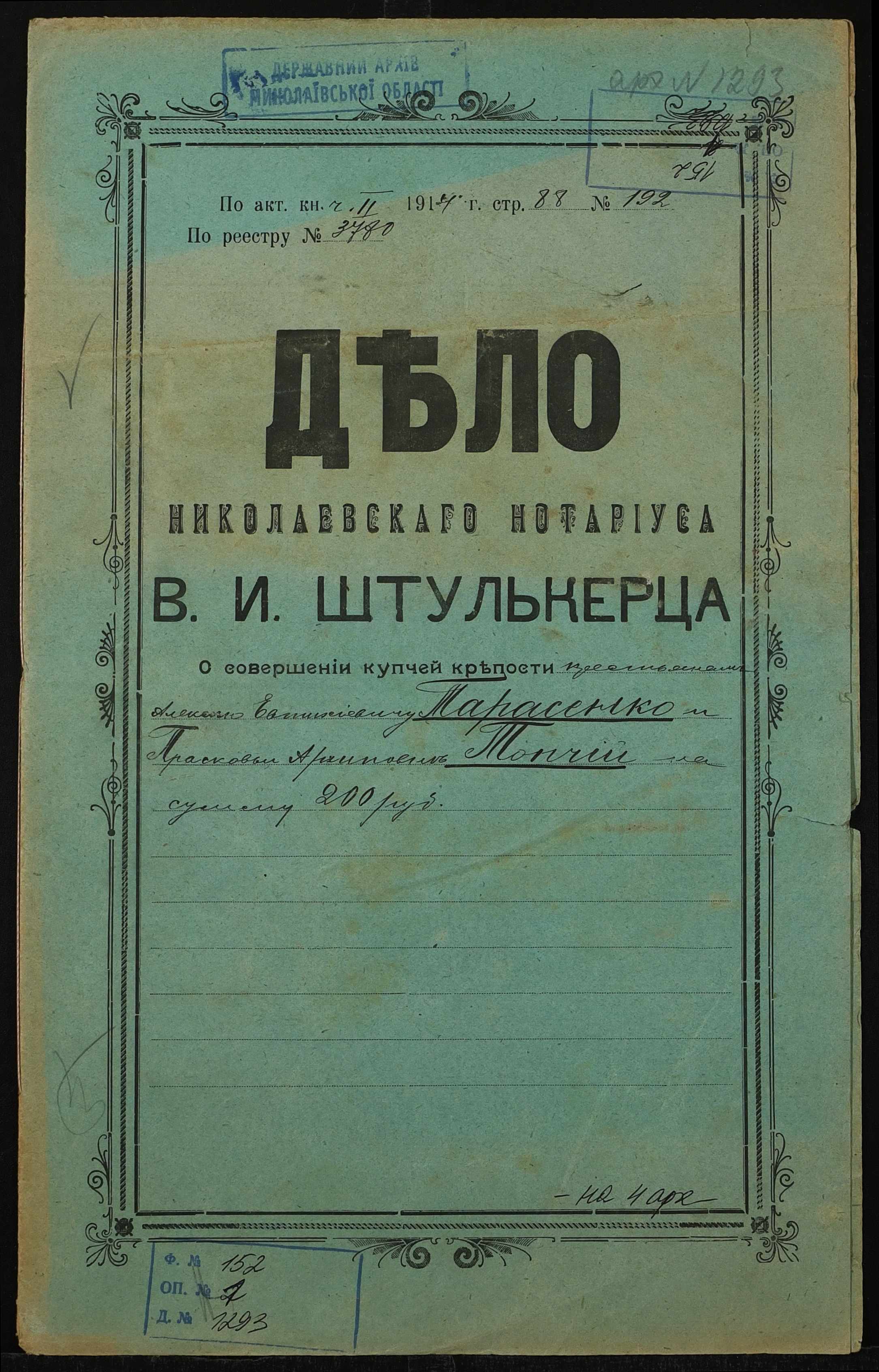 • • • • Справа № 1293 “Справа про вчинення купчої про продаж землі селянином Тарасенком Олексієм Євтихійовичем (Тарасенко Алексеем Евтихиевичем) на користь селянки Топчій Парасковії Архипівни (Топчий Прасковьи Архиповны)”