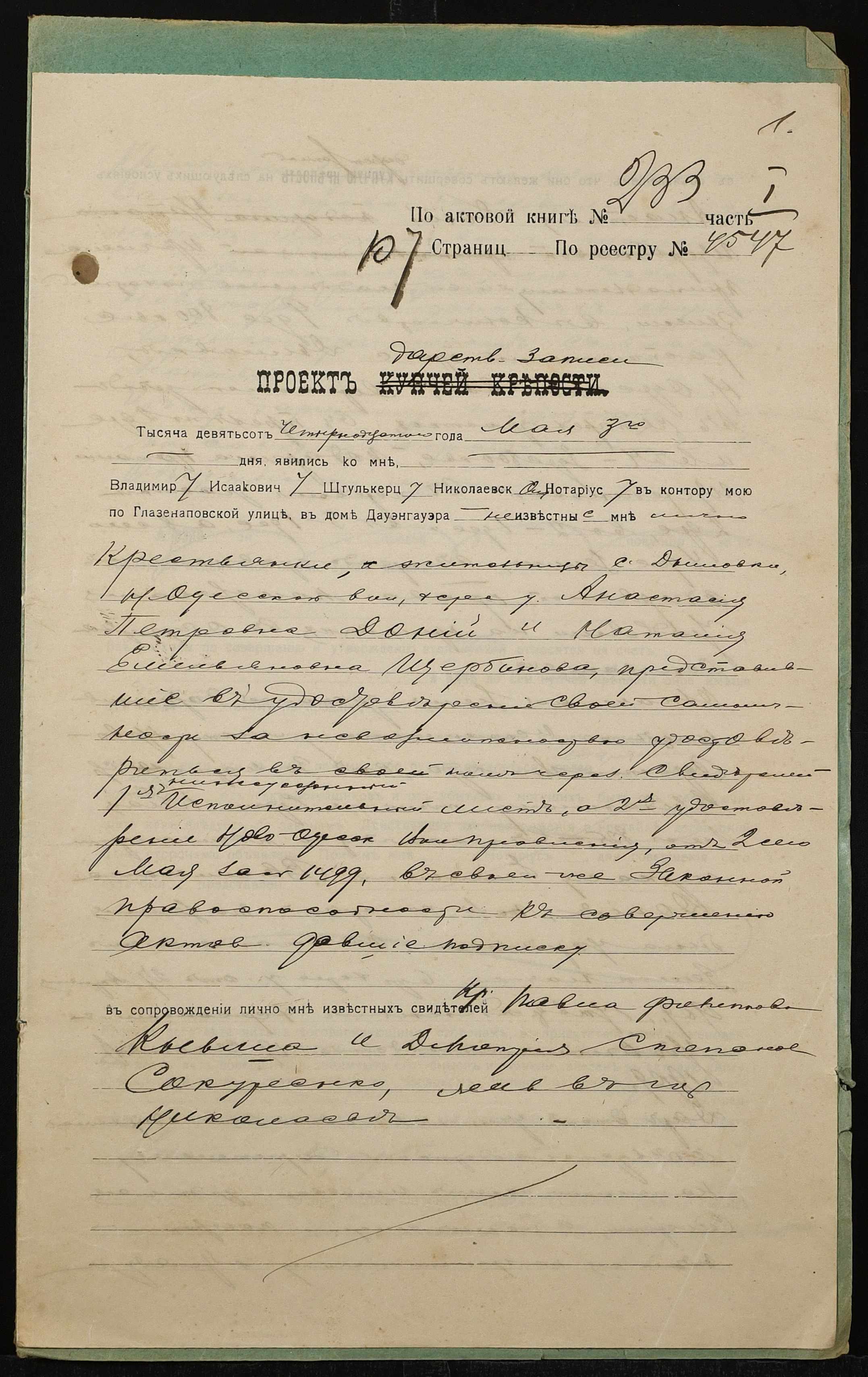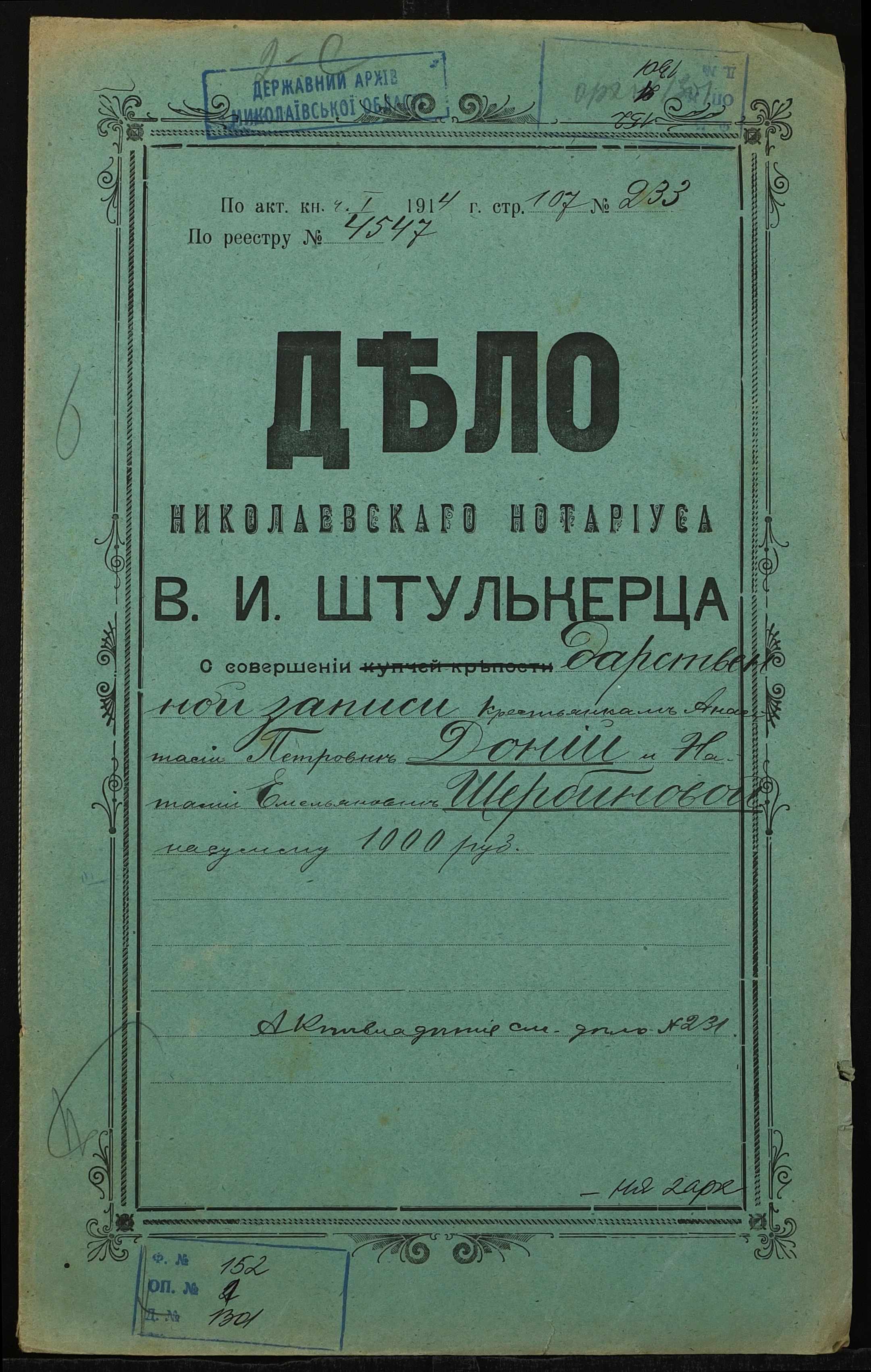 ◦ ◦ Фонд № 152 “Контора миколаївського нотаріуса Херсонського окружного суду Штулькерца Володимира Ісааковича”