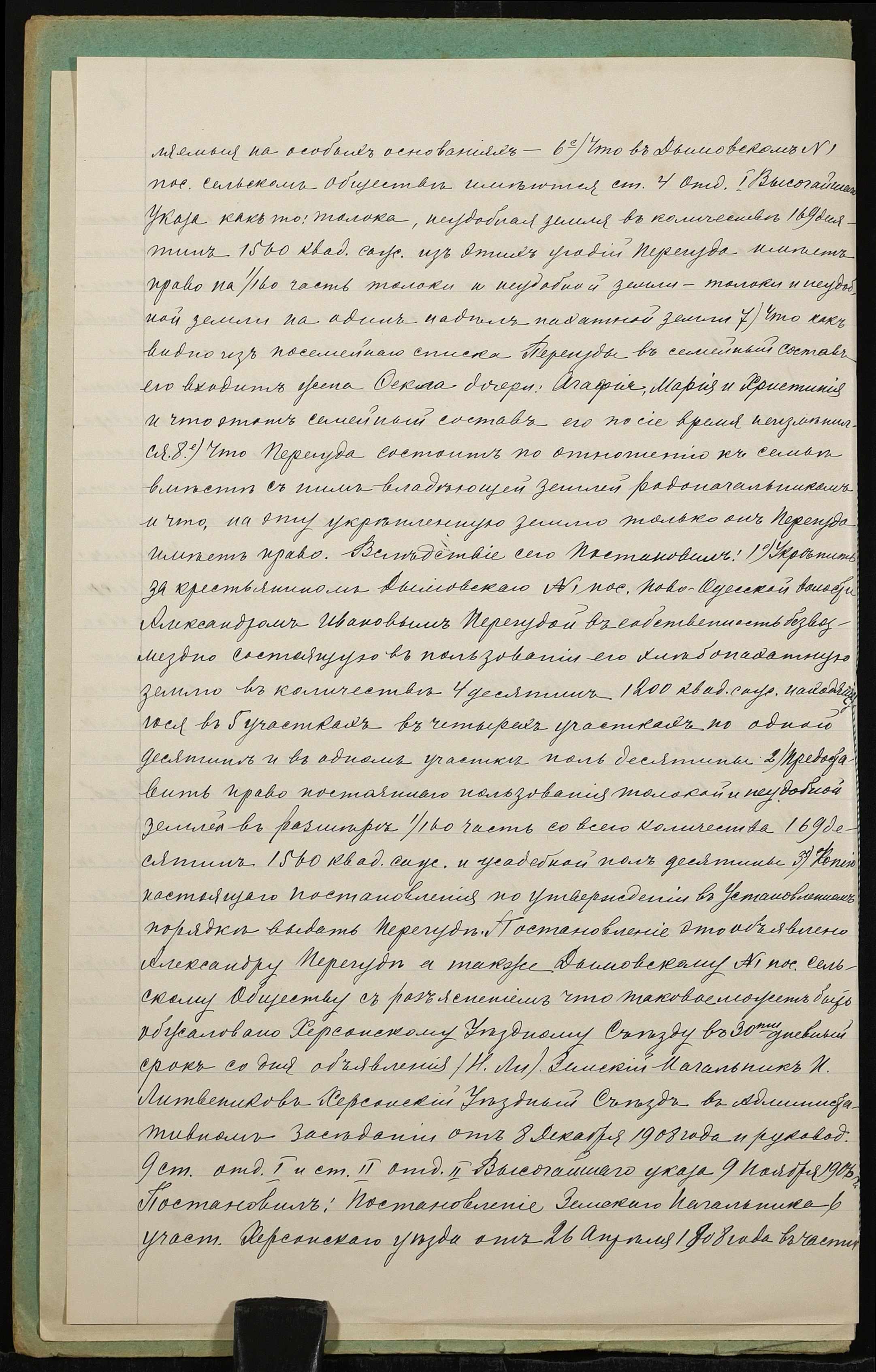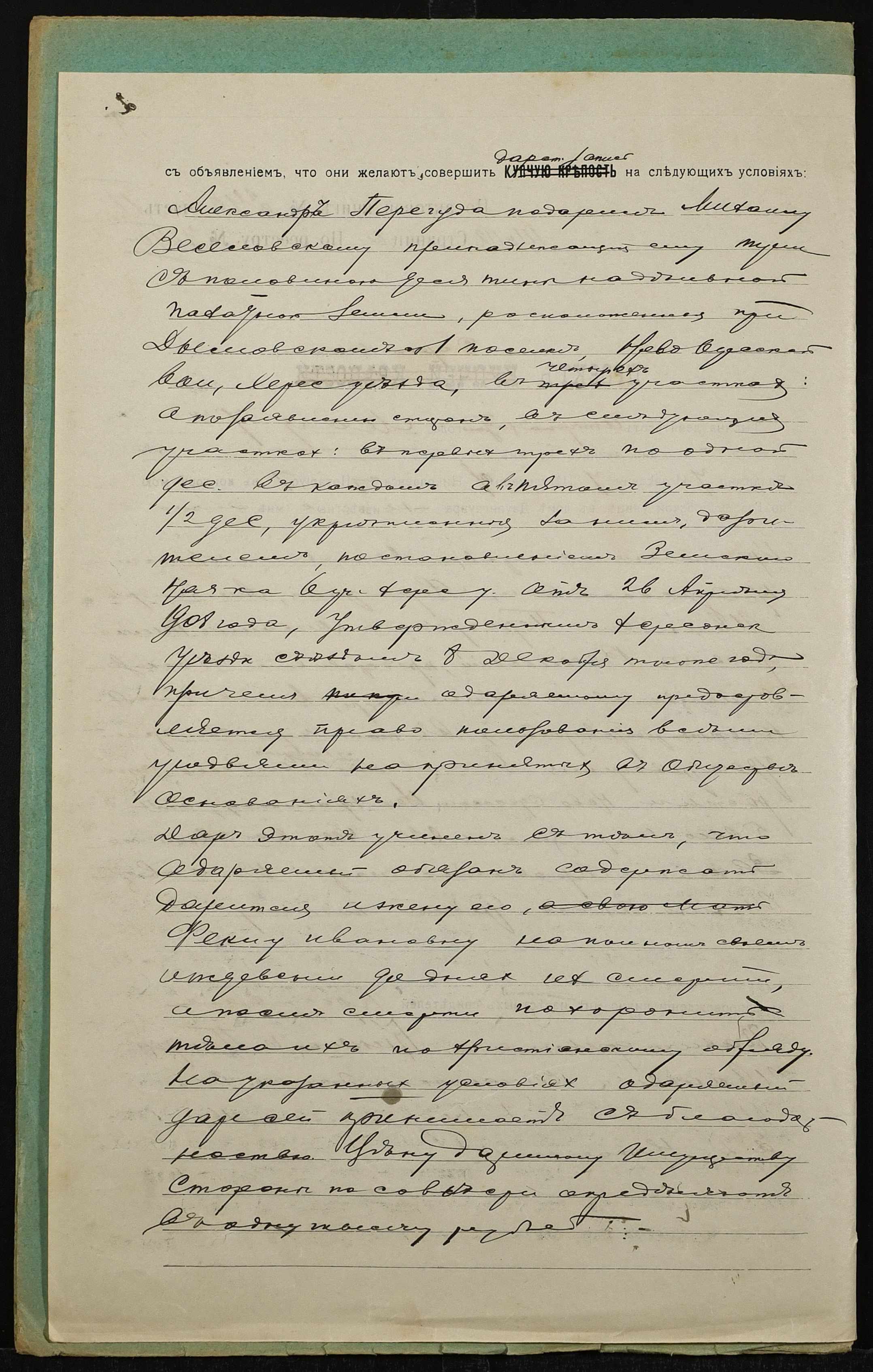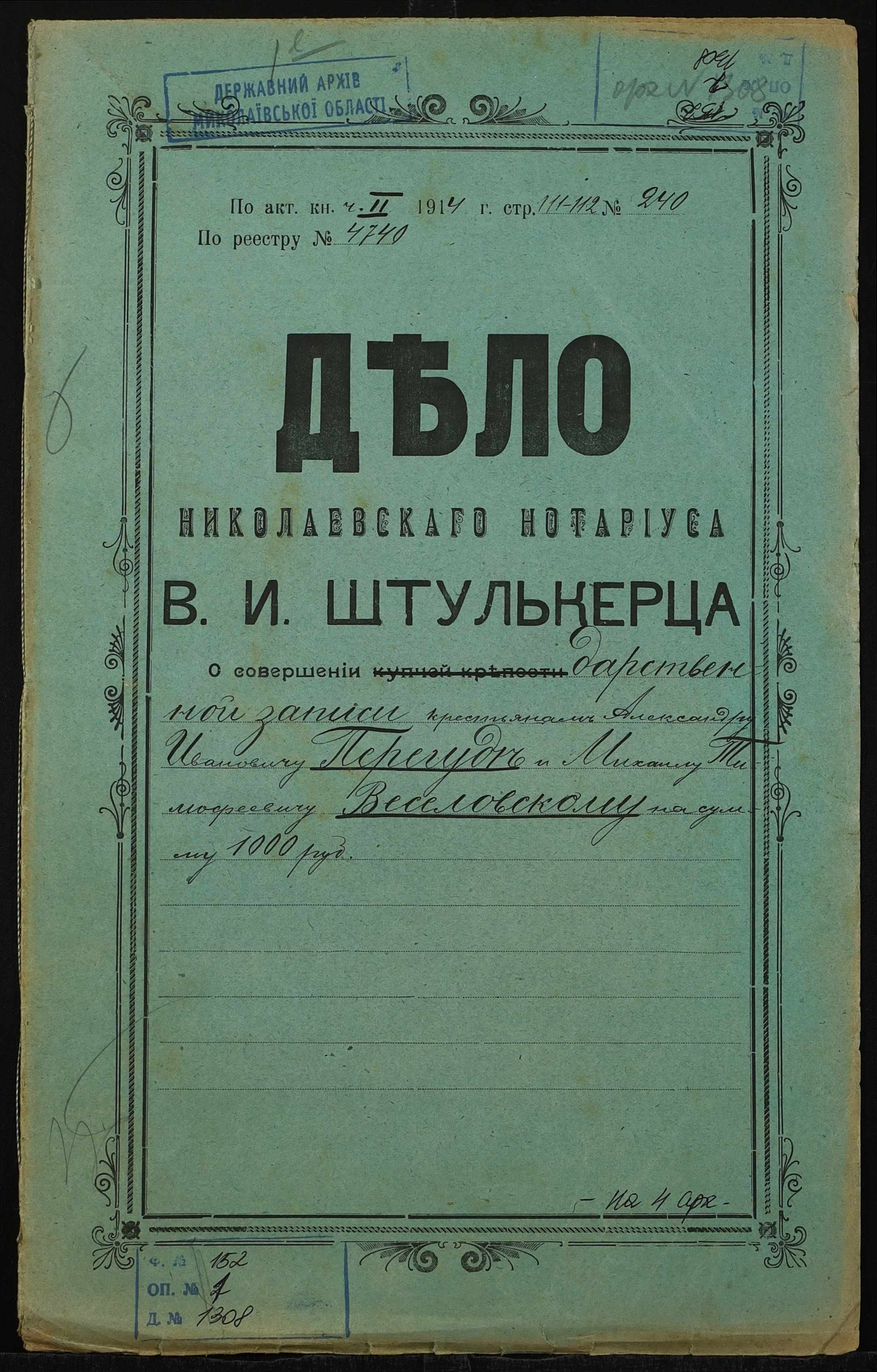 • • • • Справа № 1308 “Справа про вчинення дарчого запису на землю, передану селянином Перегудою Олександром Івановичем (Перегудой Александром Ивановичем) у власність селянина Веселовського Михайла Тимофійовича (Веселовского Михаила Тимофеевича)”