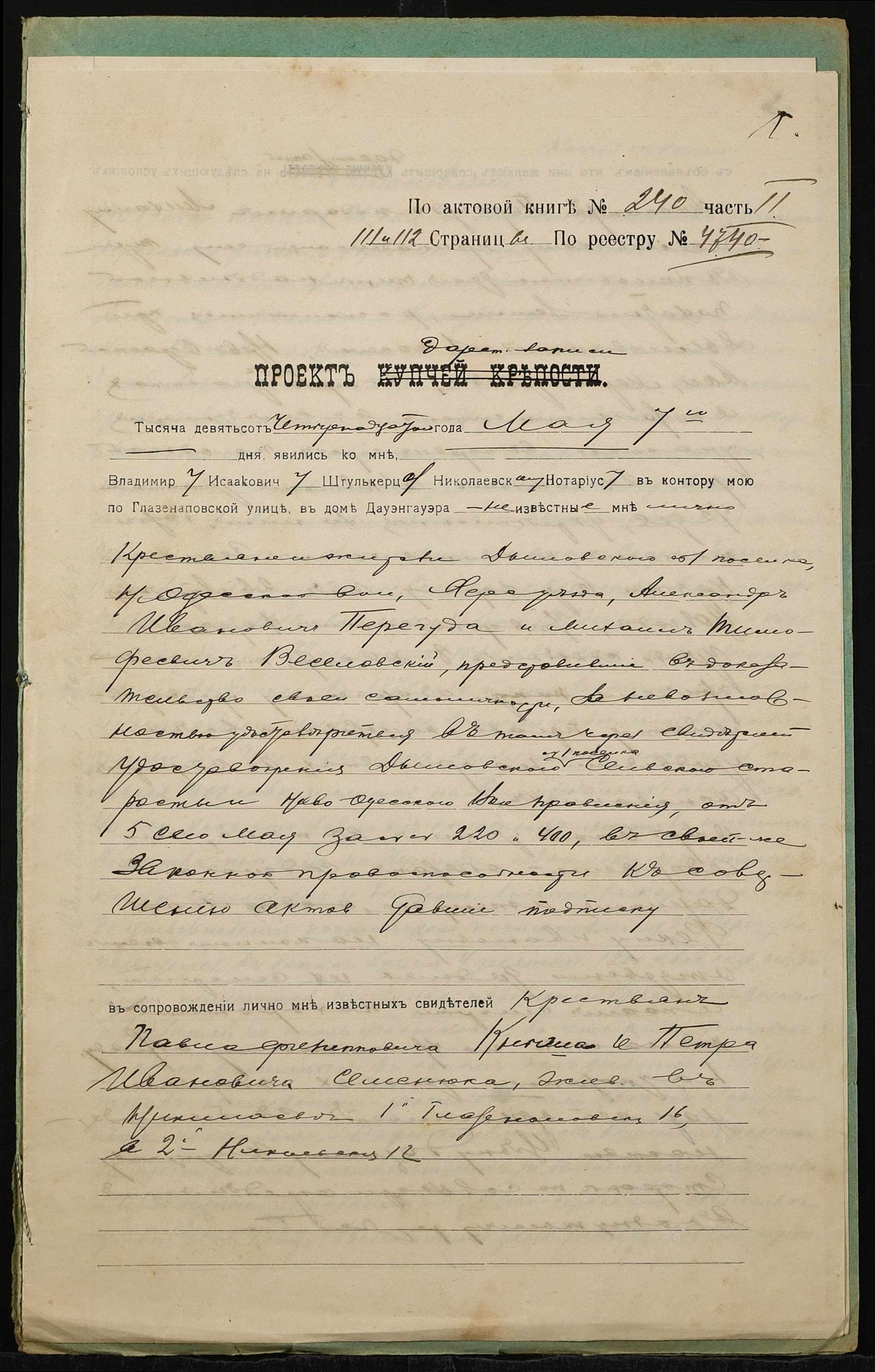 ◦ ◦ Фонд № 152 “Контора миколаївського нотаріуса Херсонського окружного суду Штулькерца Володимира Ісааковича”