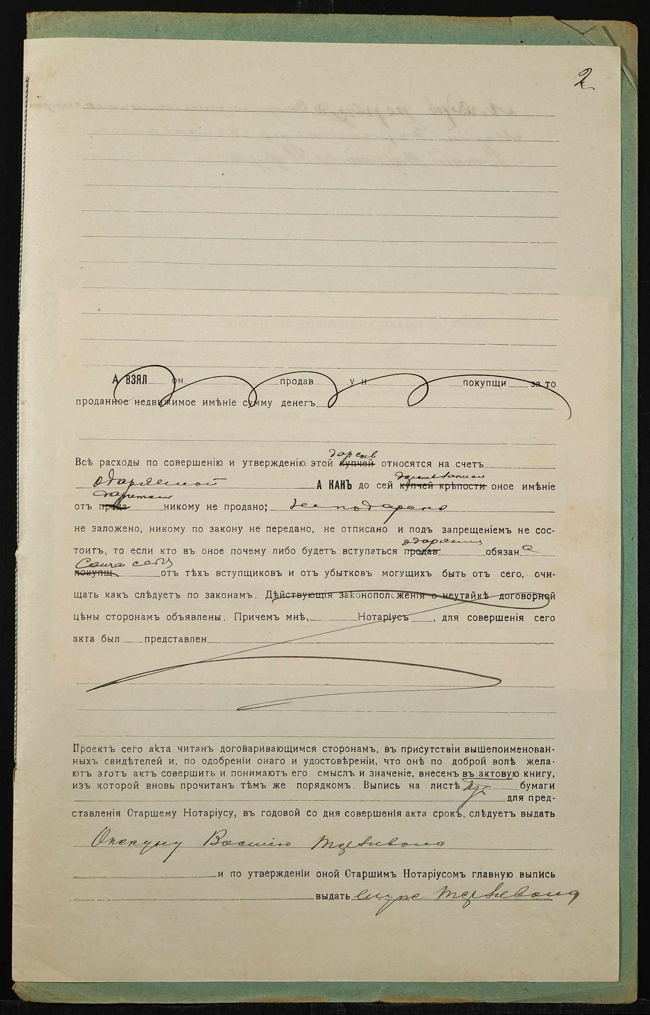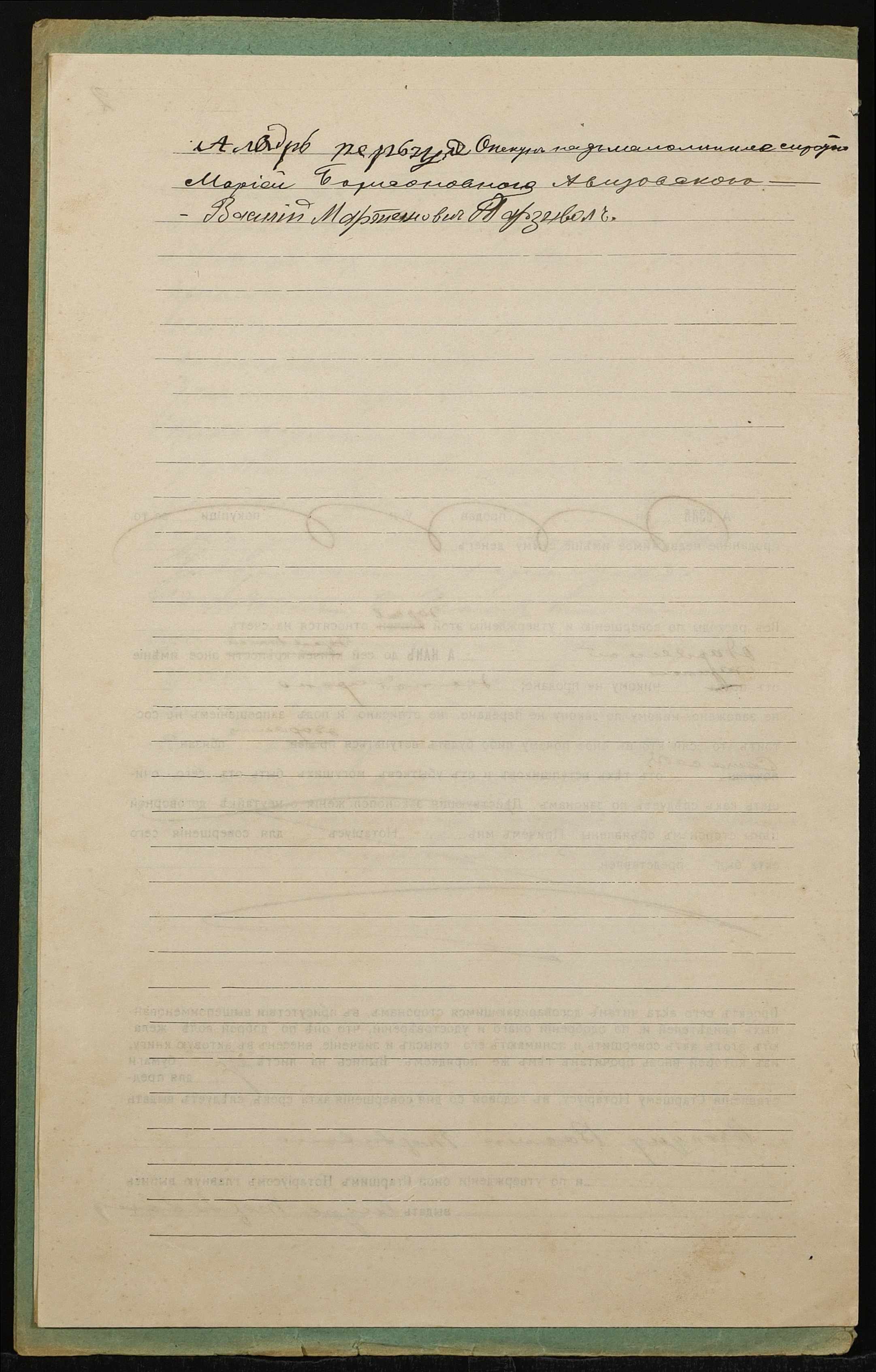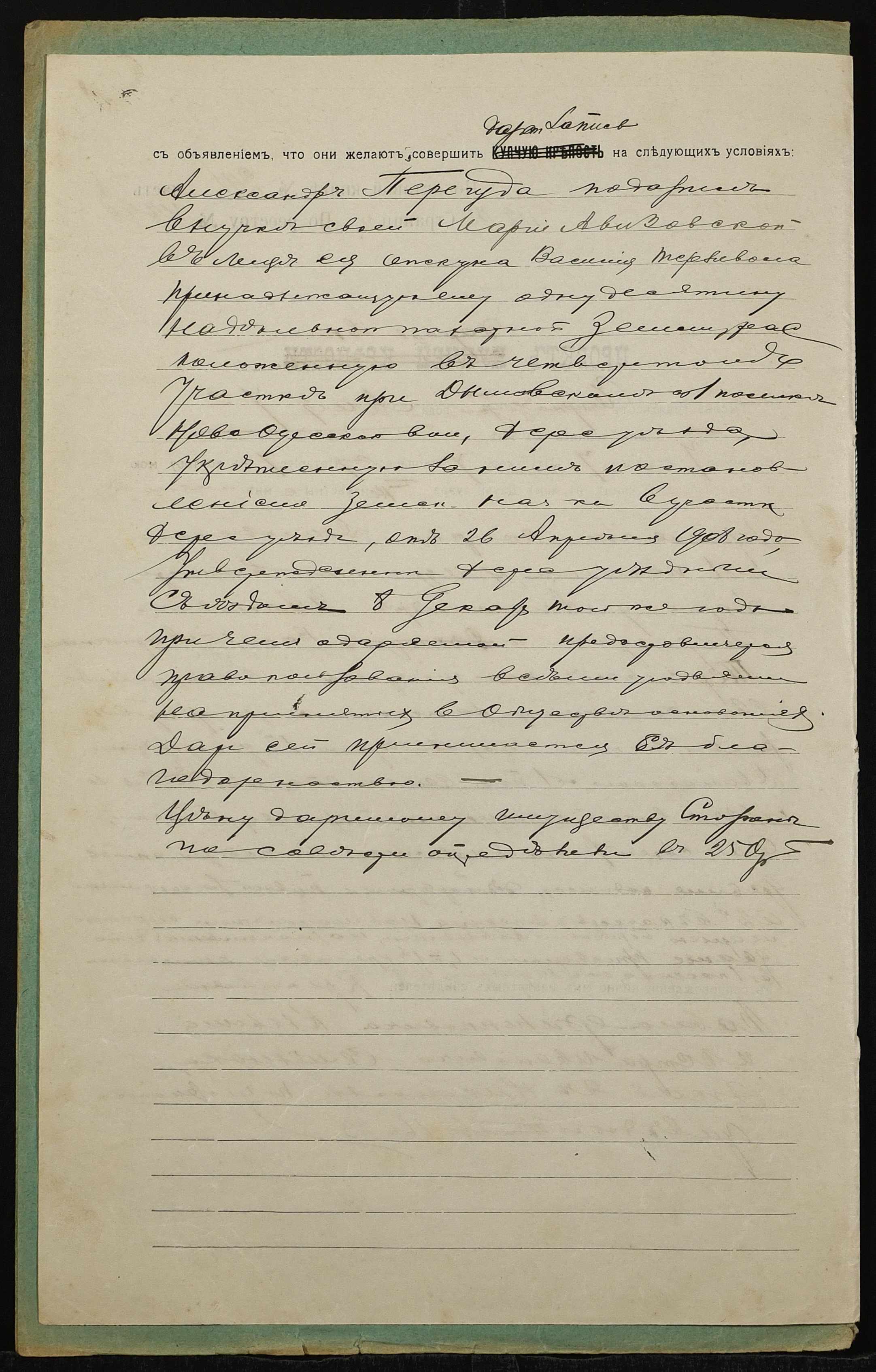 • • • • Справа № 1309 “Справа про вчинення дарчого запису на землю, передану селянином Перегудою Олександром Івановичем (Перегудой Александром Ивановичем) у власність малолітньої сироти Авизовської Марії Борисівни (Авизовской Марии Борисовны), в особі її опікуна Терзивола Василя Мартиновича (Терзивола Василия Мартыновича)”