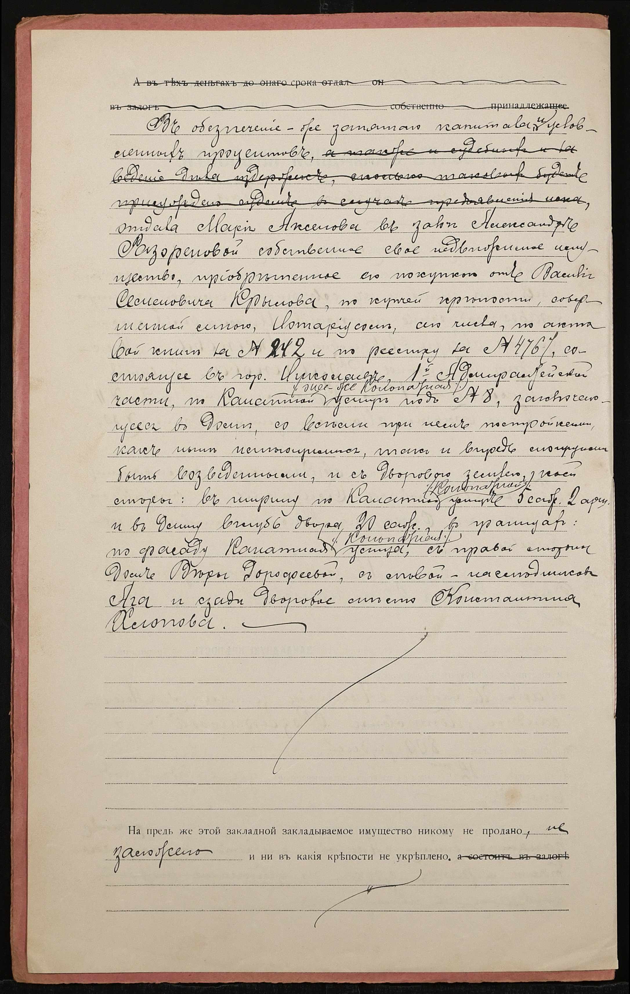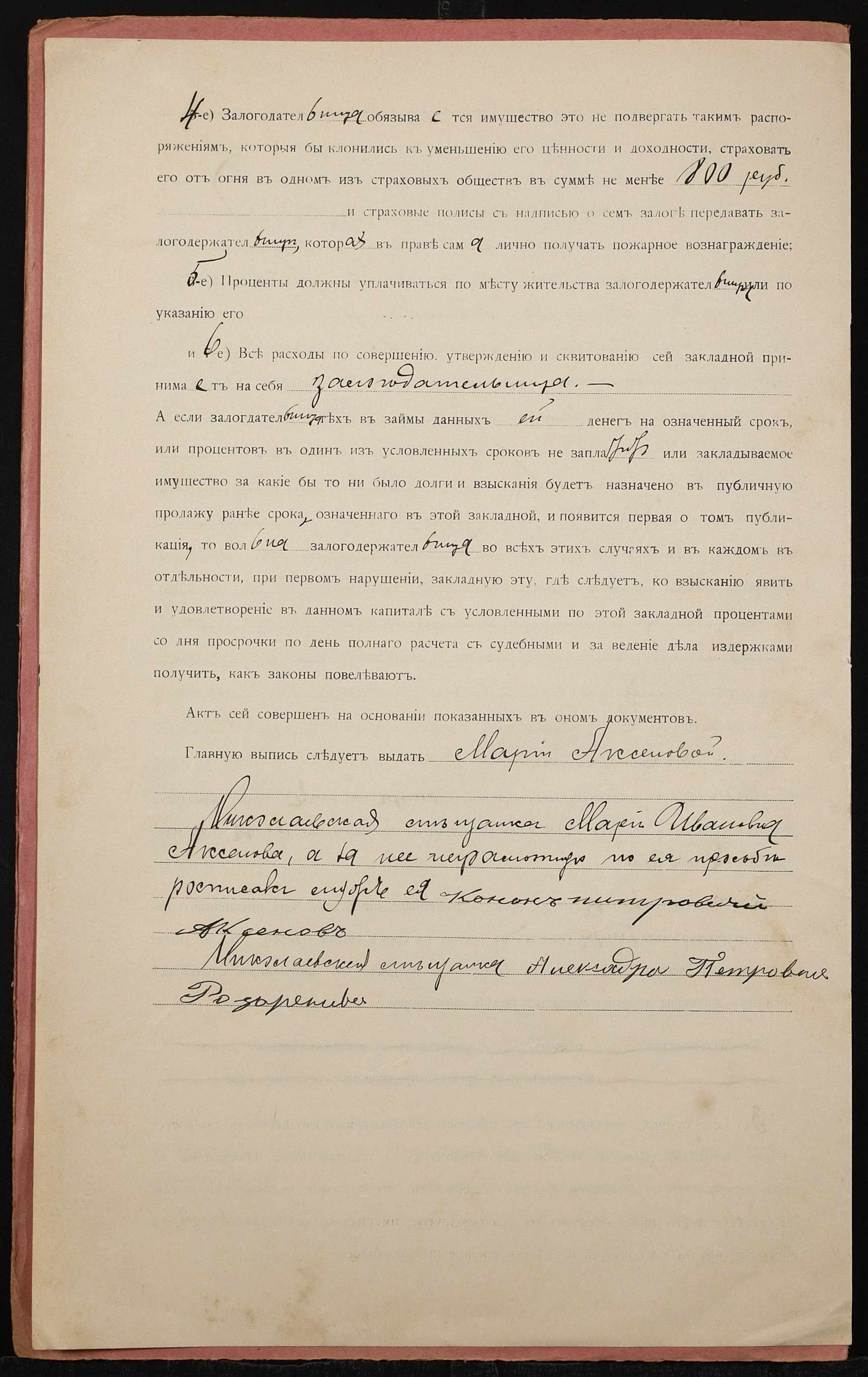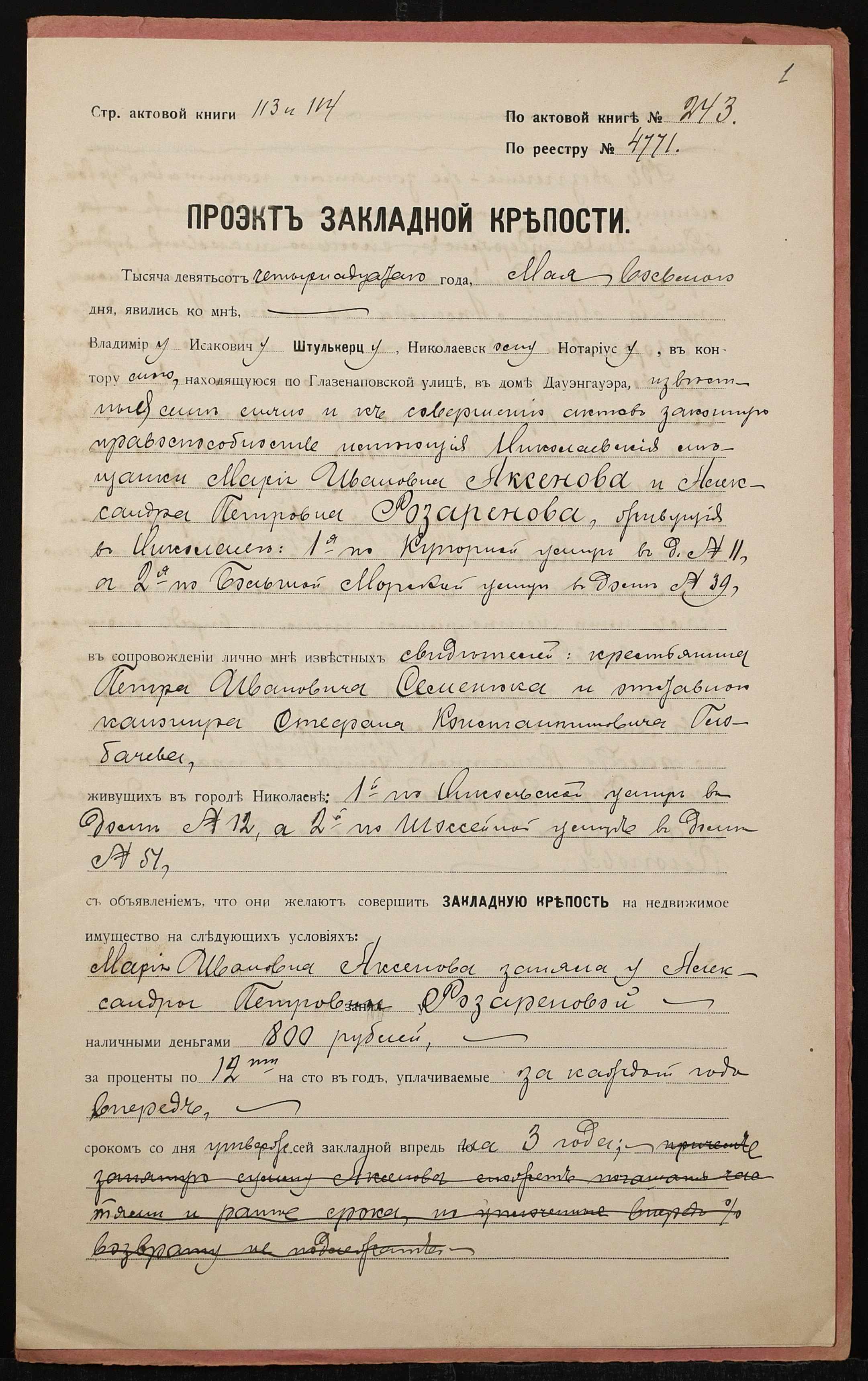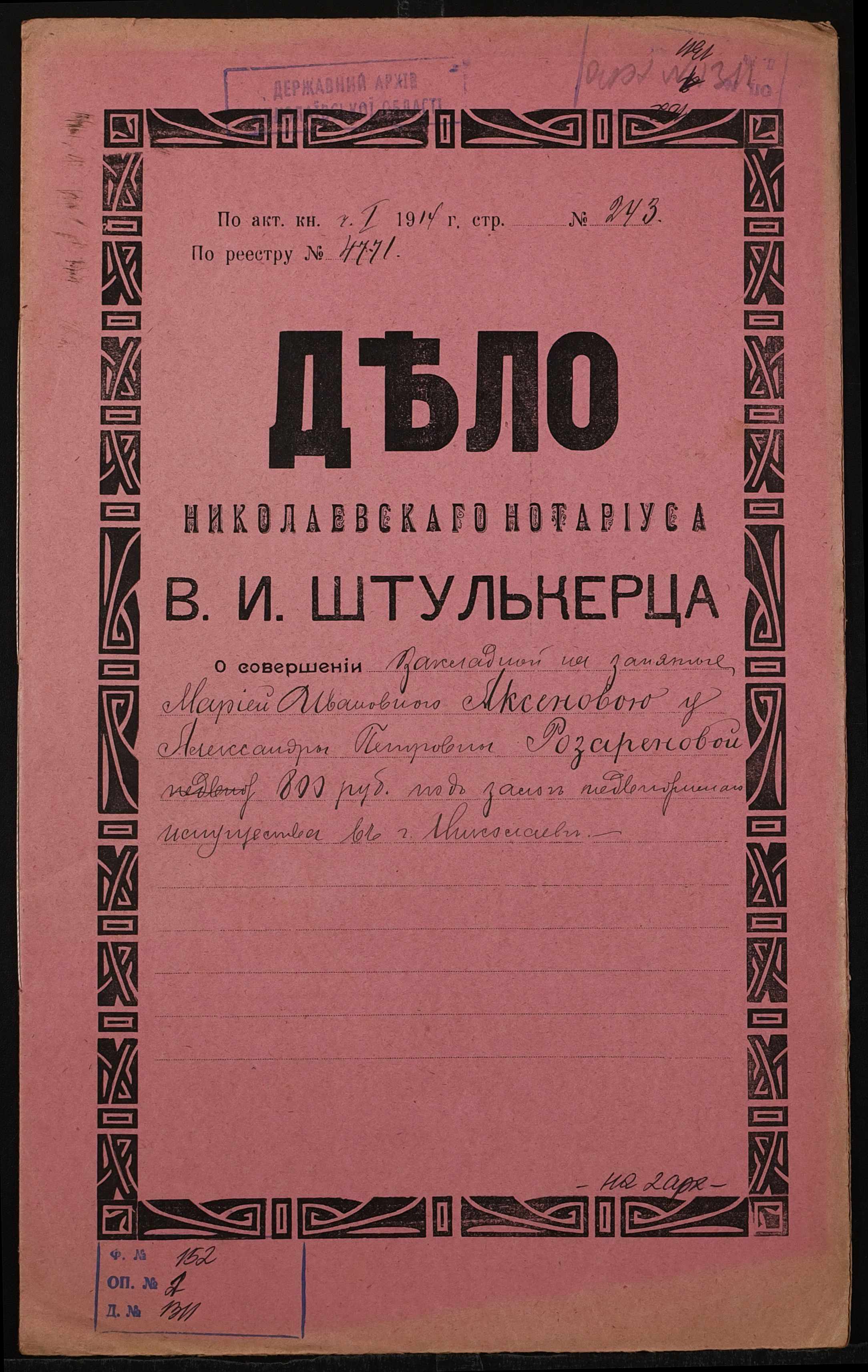 • • • • Справа № 1311 “Справа про вчинення заставної на нерухоме майно у м. Миколаїв, закладене Аксьоновою Марією Іванівною (Аксеновой Марией Ивановной) – Розареновій Олександрі Петрівні (Розареновой Александре Петровне)”
