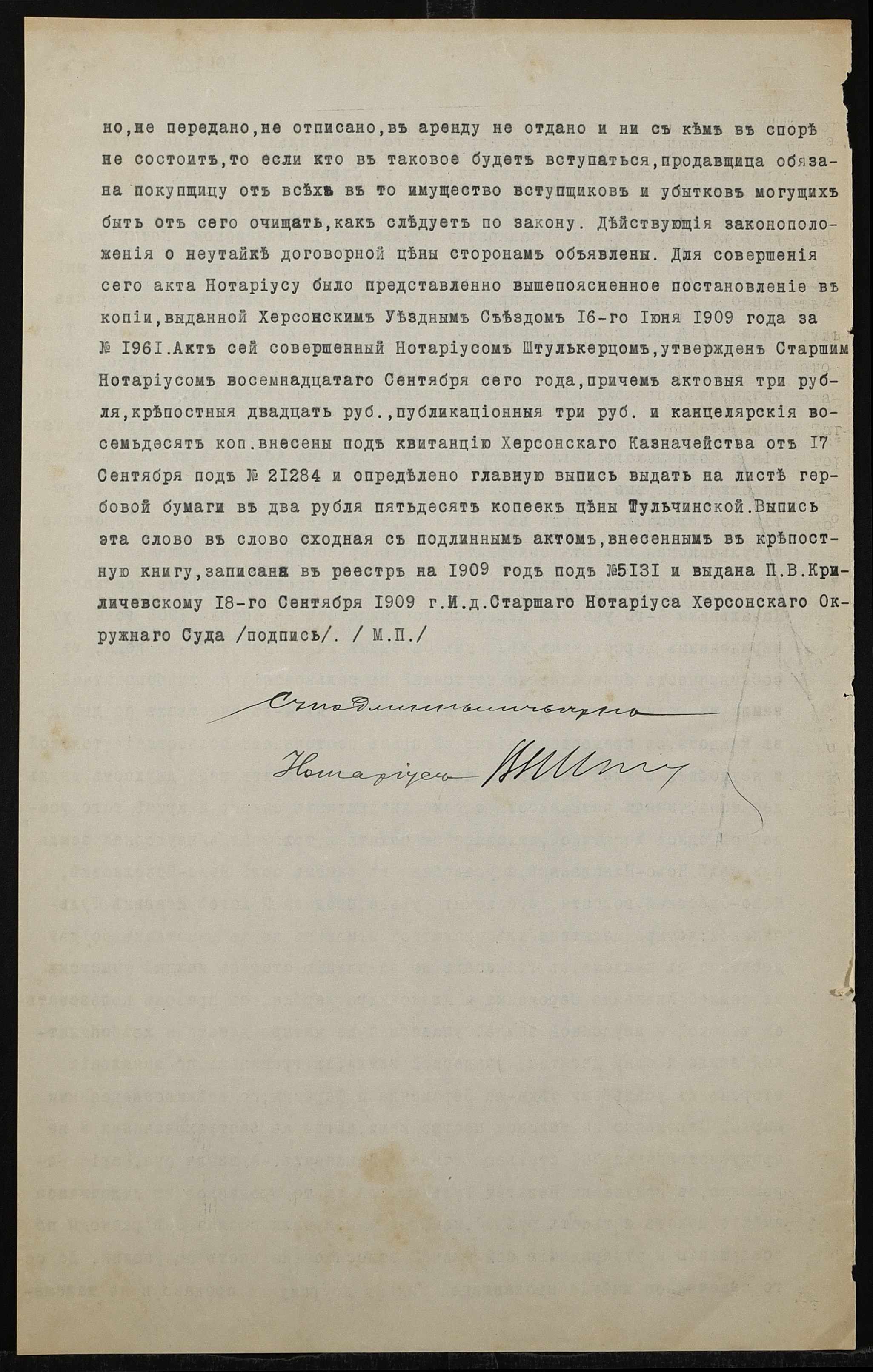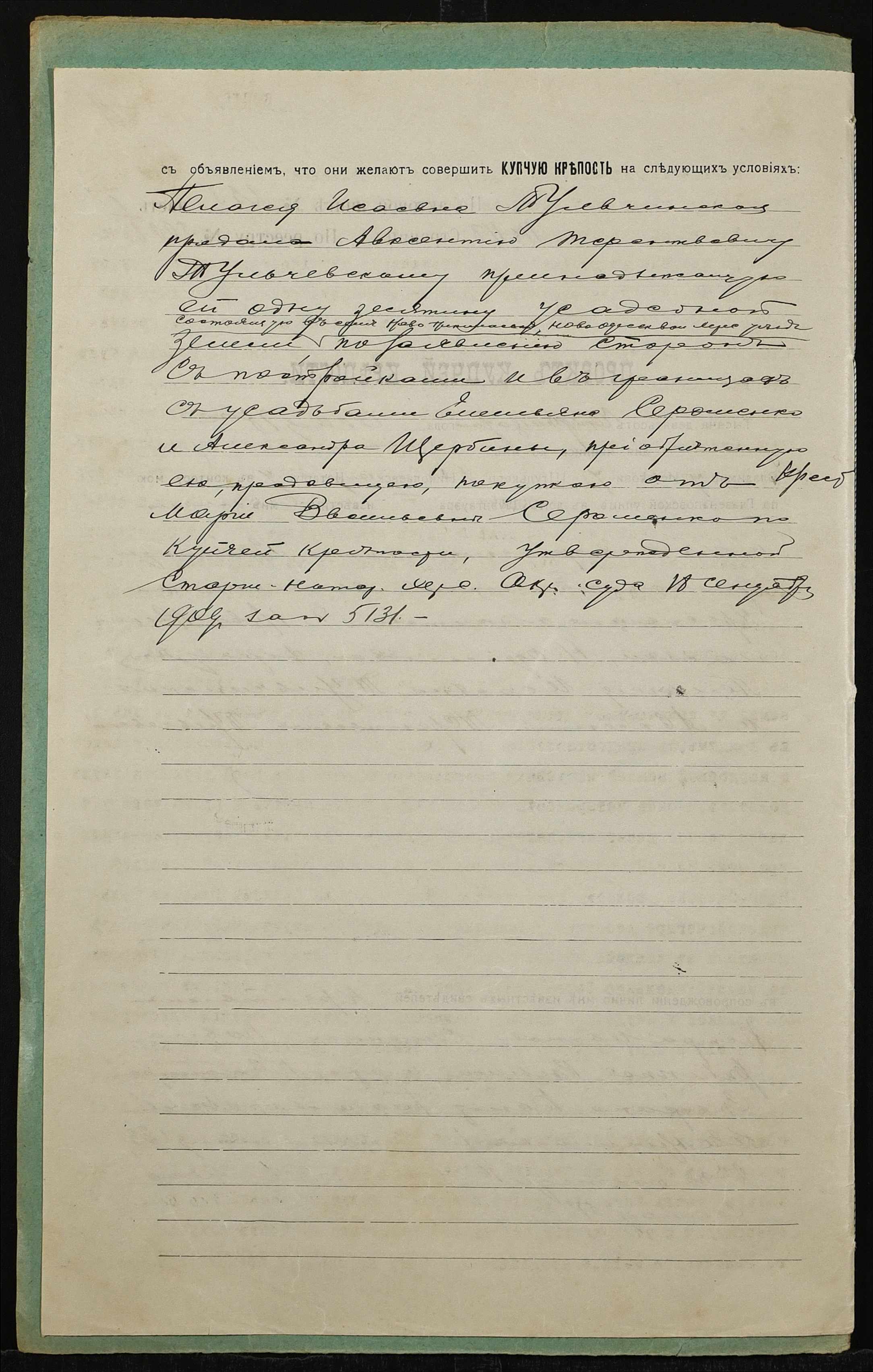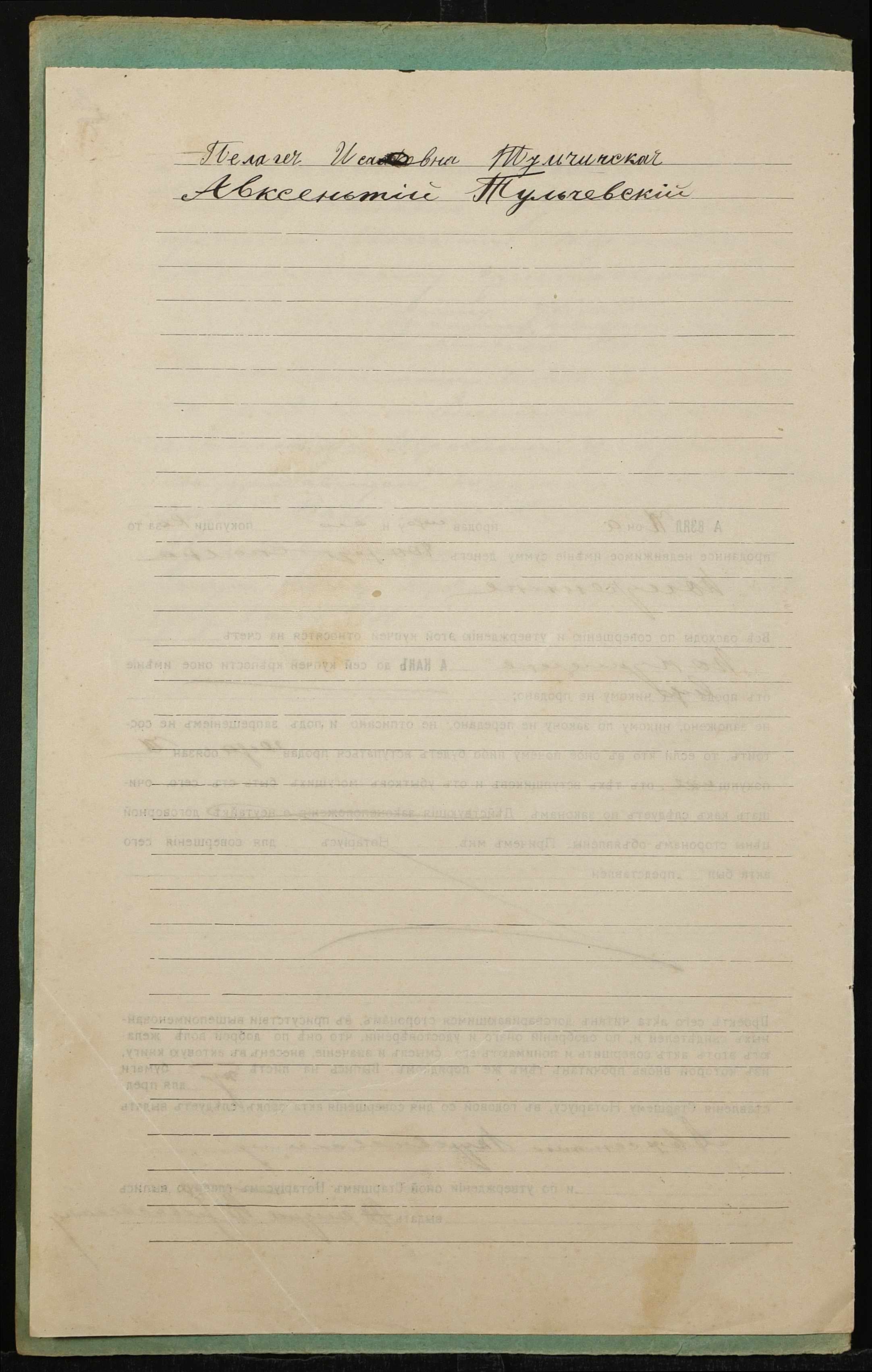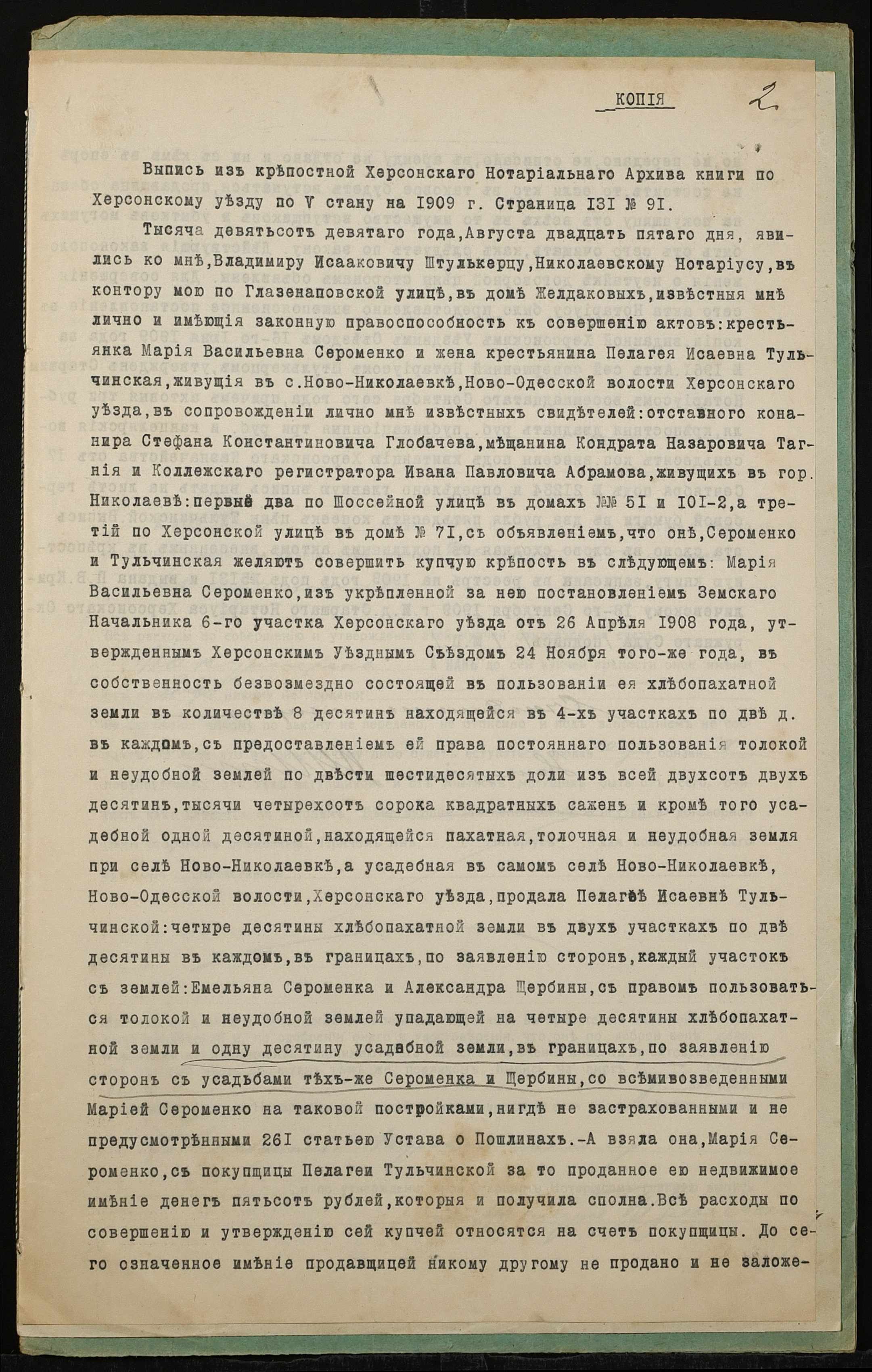 • • • • Справа № 1318 “Справа про вчинення купчої про продаж землі селянкою Тульчинською Пелагеєю Ісаївною (Тульчинской Пелагеей Исаевной) на користь селянина Тульчевського Овксентія Терентійовича (Тульчевского Авксентия Терентьевича)”