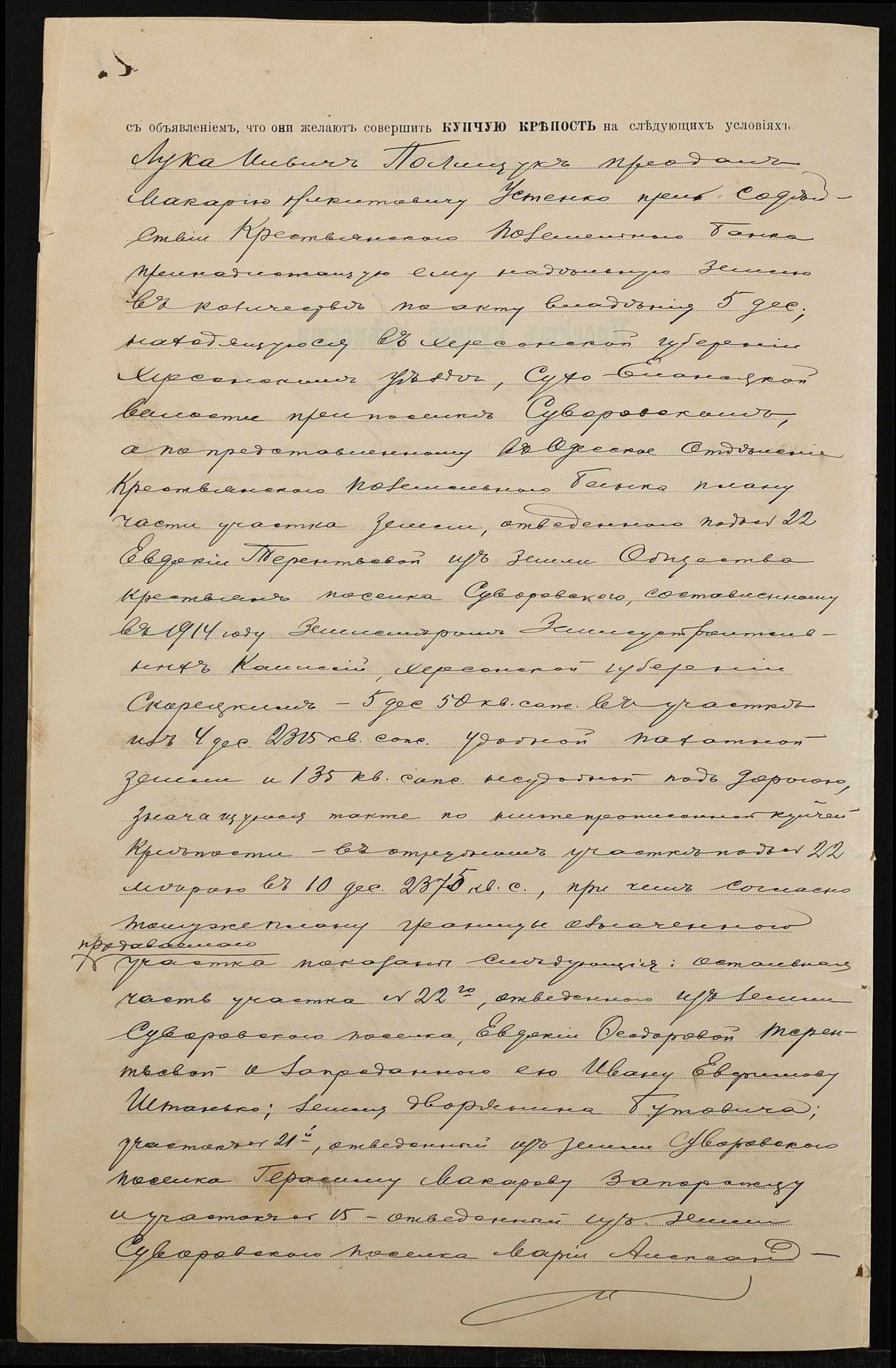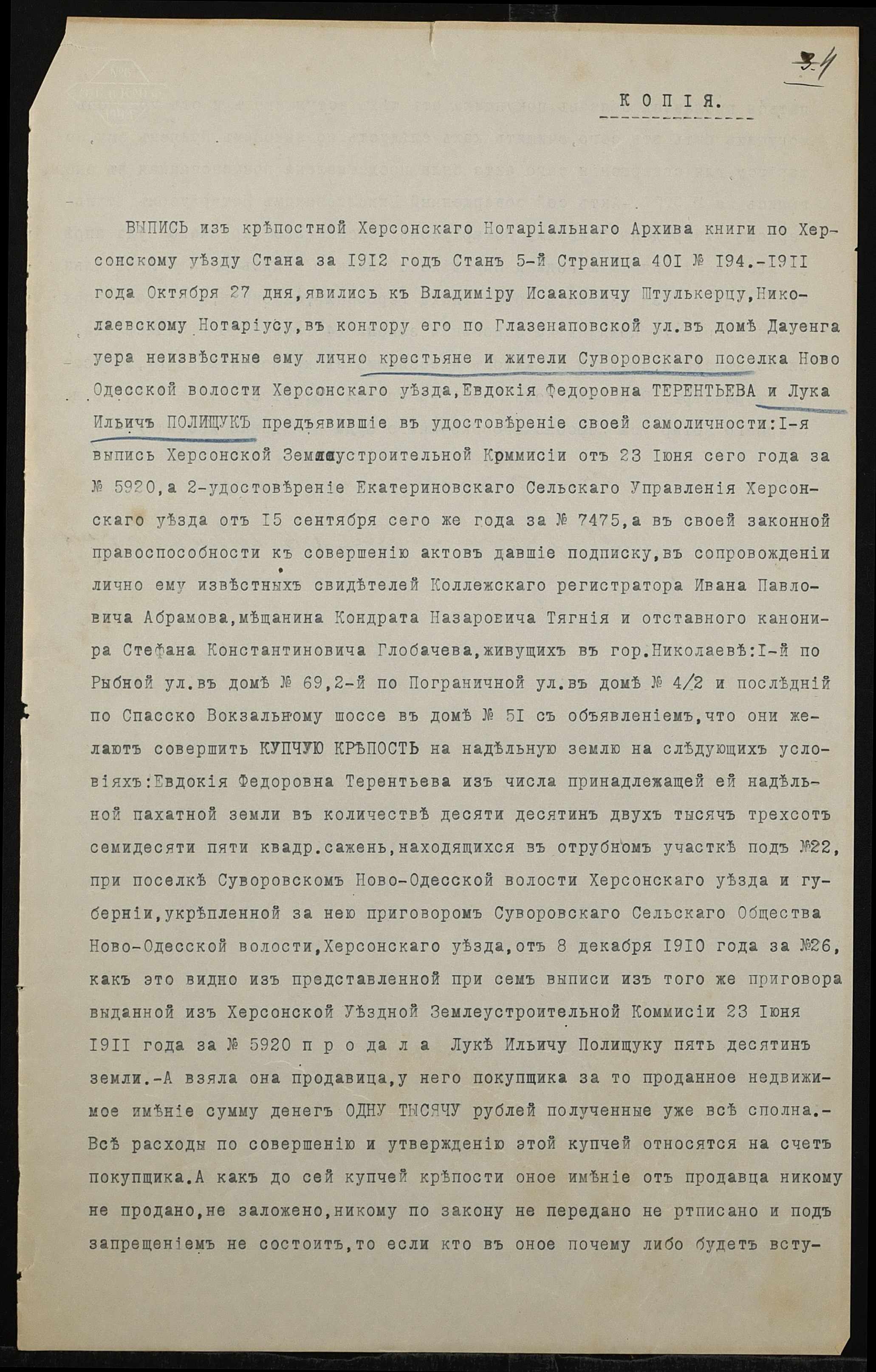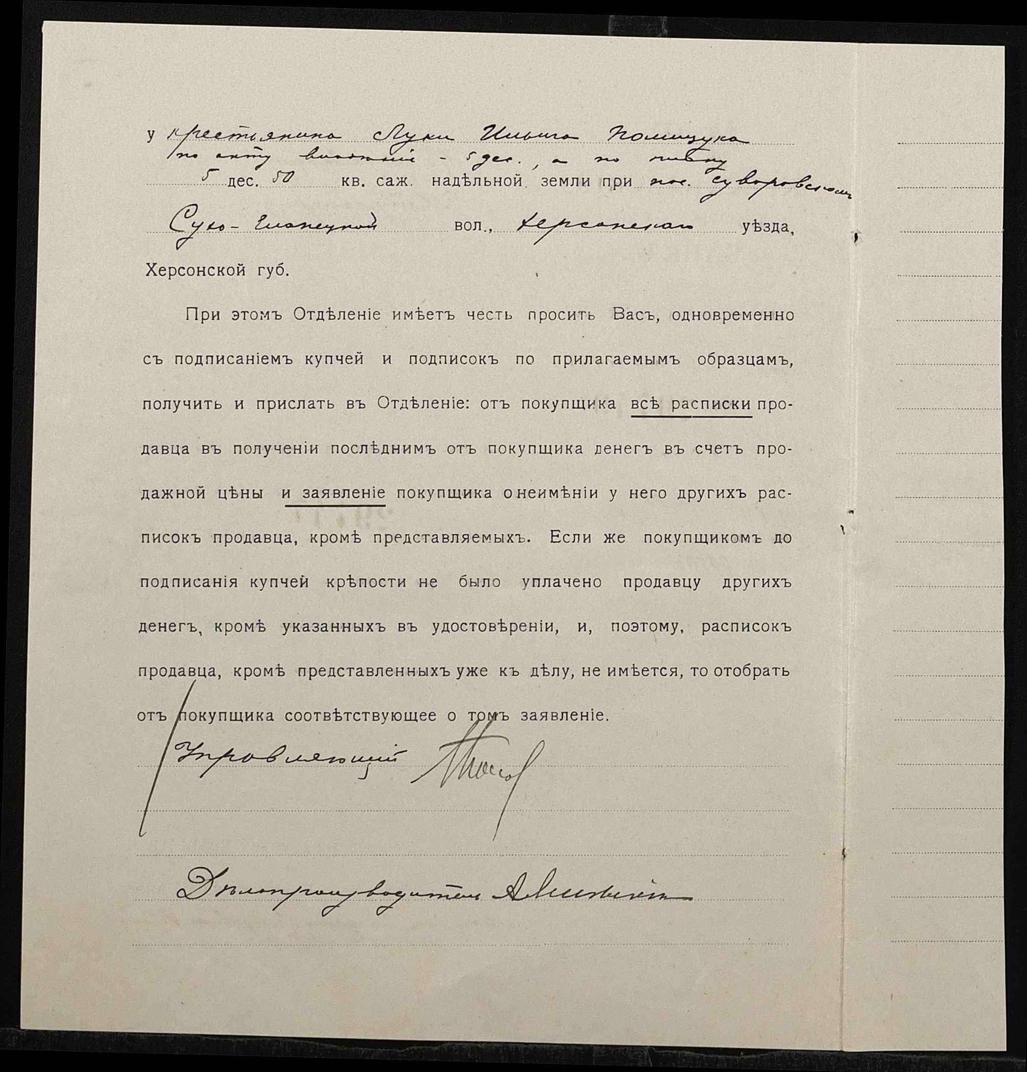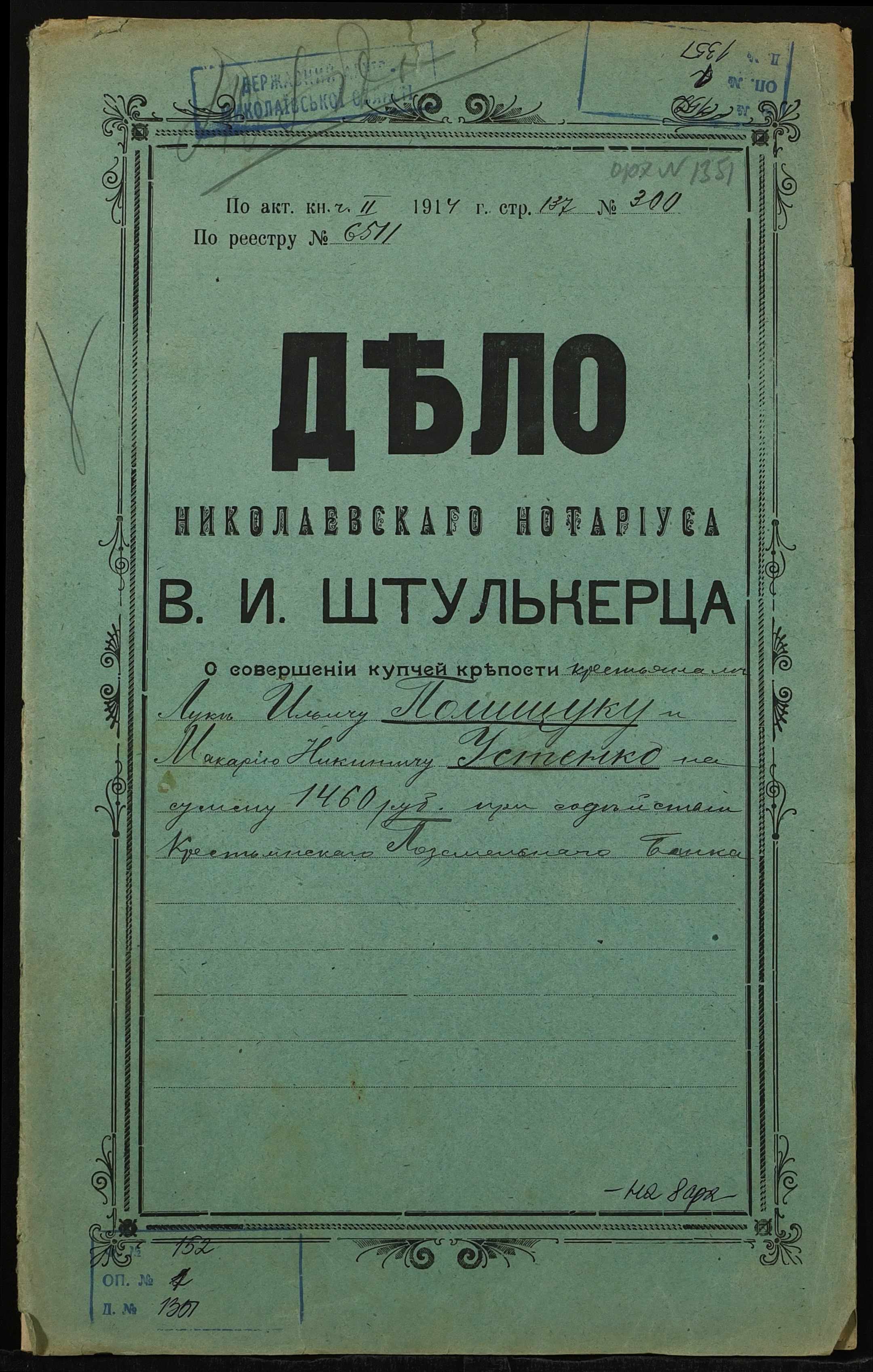 • • • • Справа № 1351 “Справа про вчинення купчої про продаж землі селянином Поліщуком Лукою Іллічем (Полищуком Лукой Ильичем) на користь селянина Устенка Макарія Микитовича (Устенко Макария Никитовича) за сприяння Селянського поземельного банку”