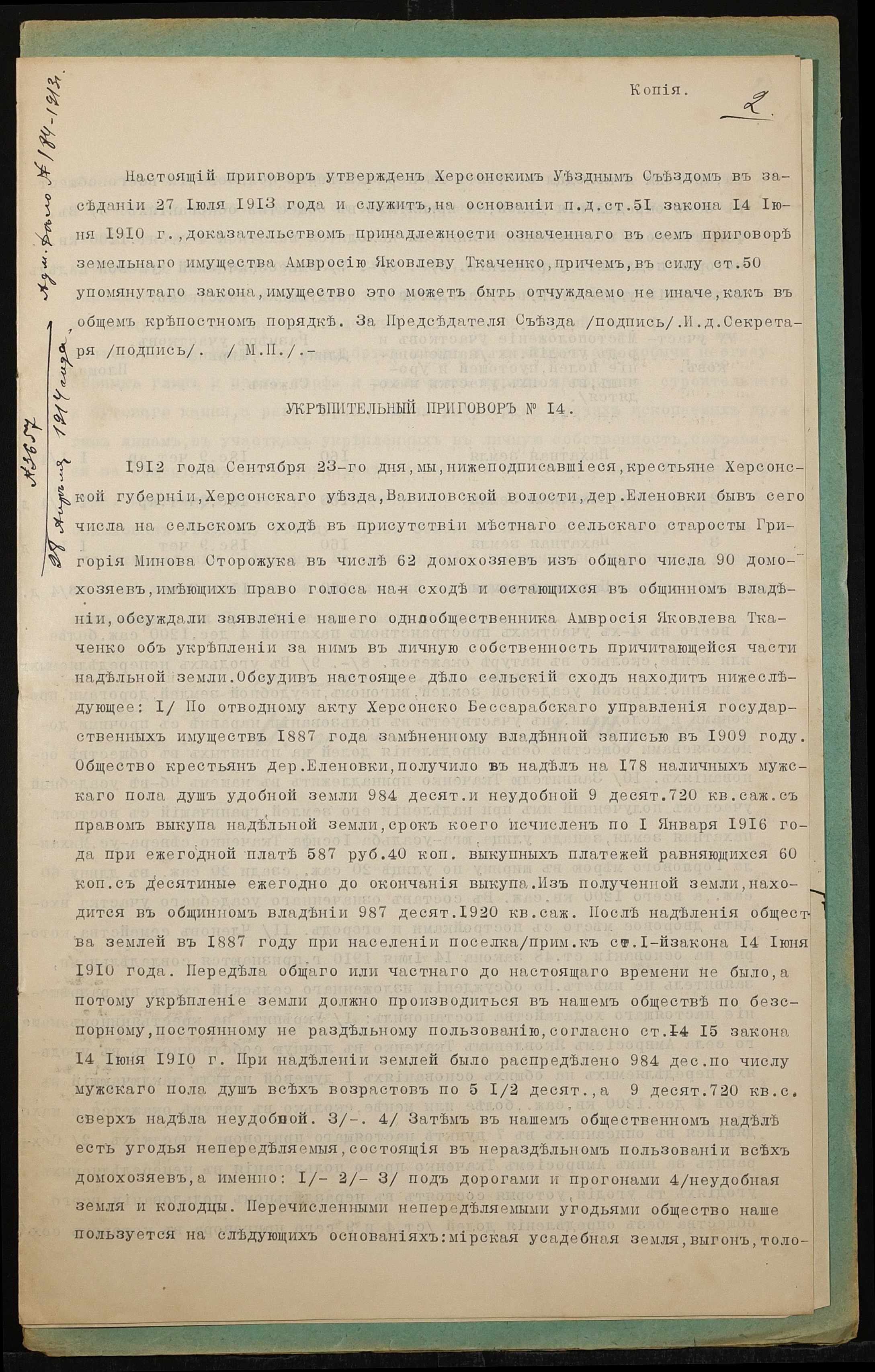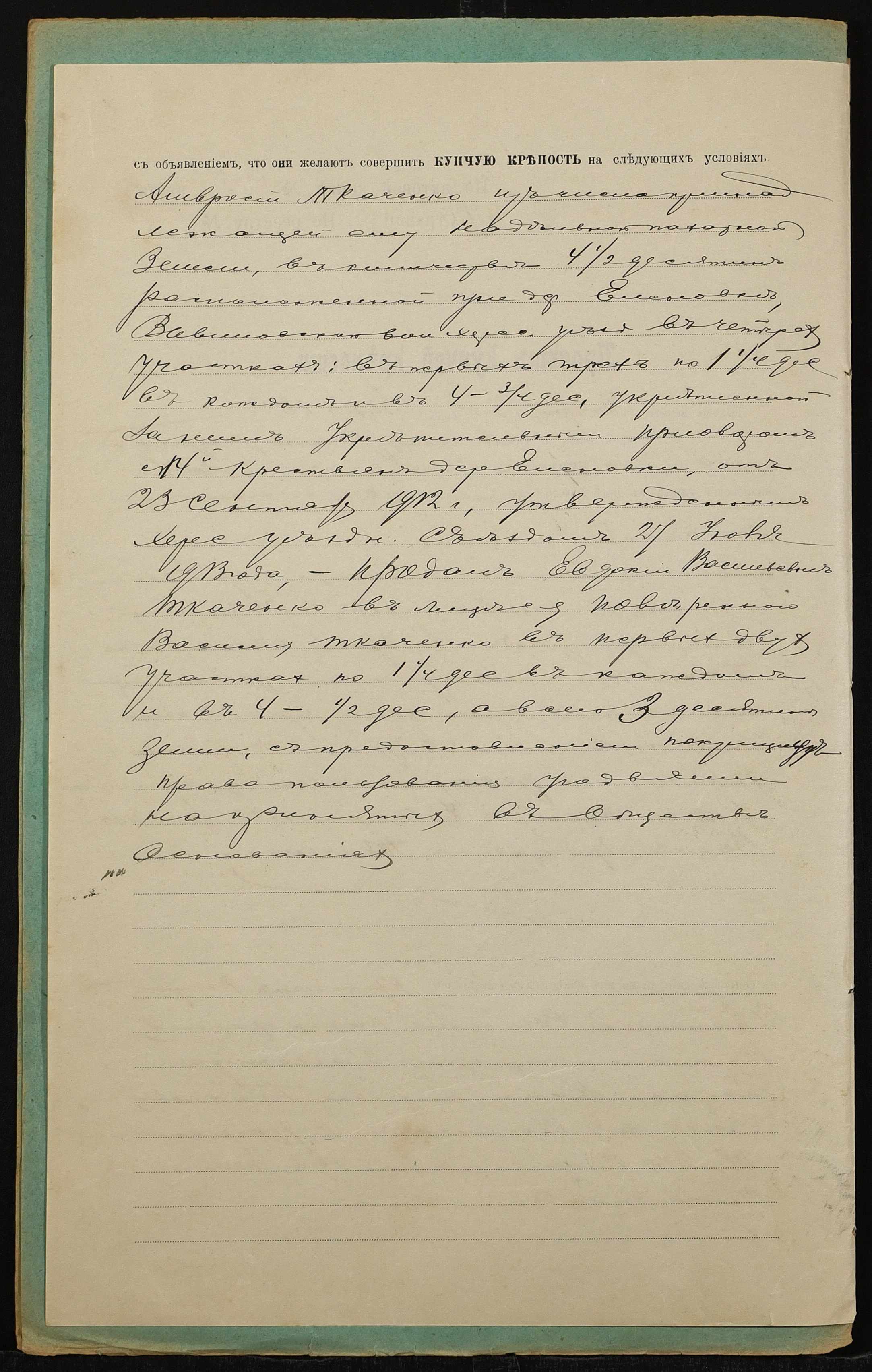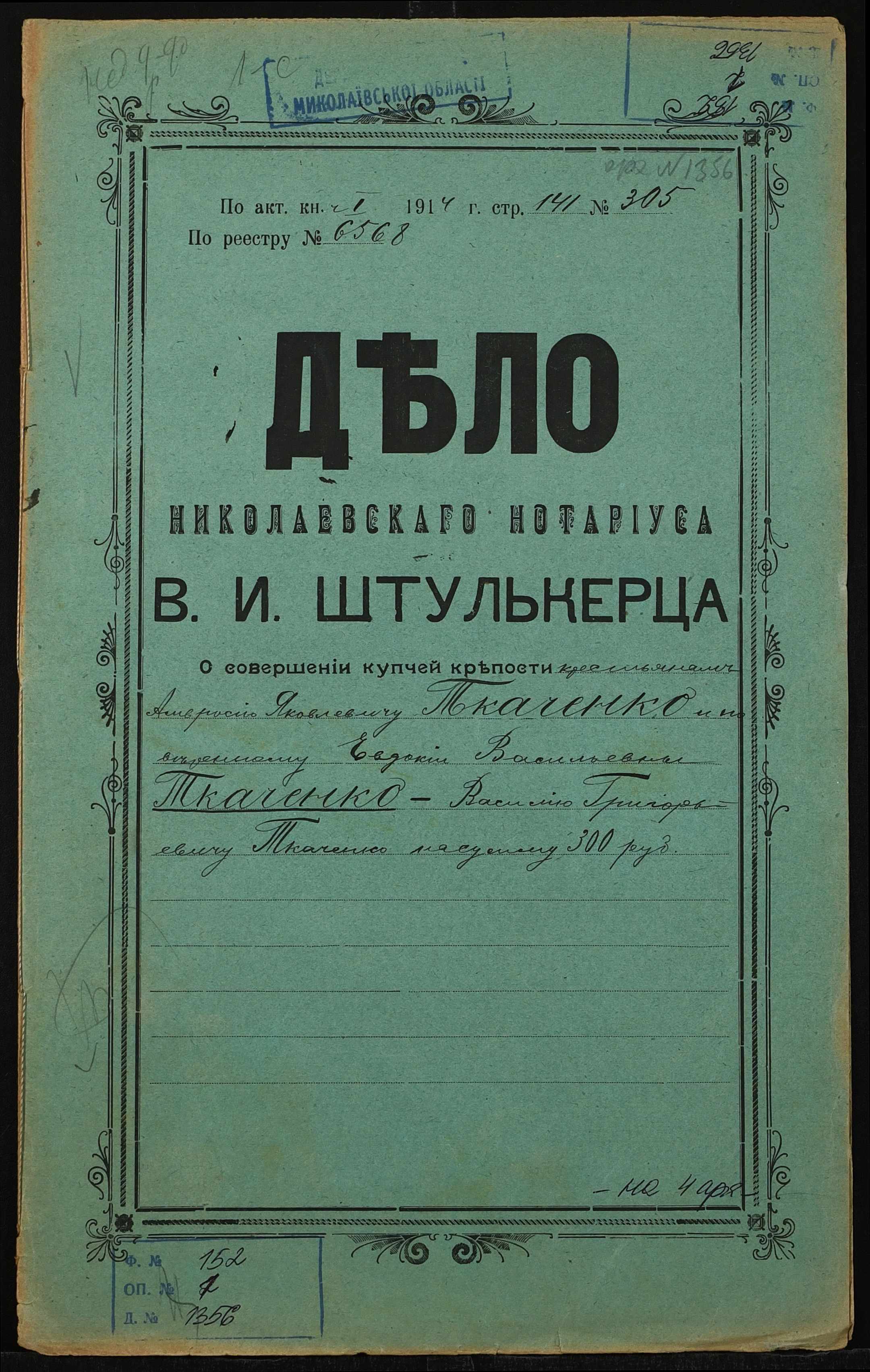• • • • Справа № 1356 “Справа про вчинення купчої про продаж землі селянином Ткаченком Амвросієм Яковичем (Ткаченко Амвросием Яковлевичем), повіреним селянки Ткаченко Євдокії Василівни (Ткаченко Евдокии Васильевны), на користь селянина Ткаченка Василя Григоровича (Ткаченко Василия Григорьевича)”