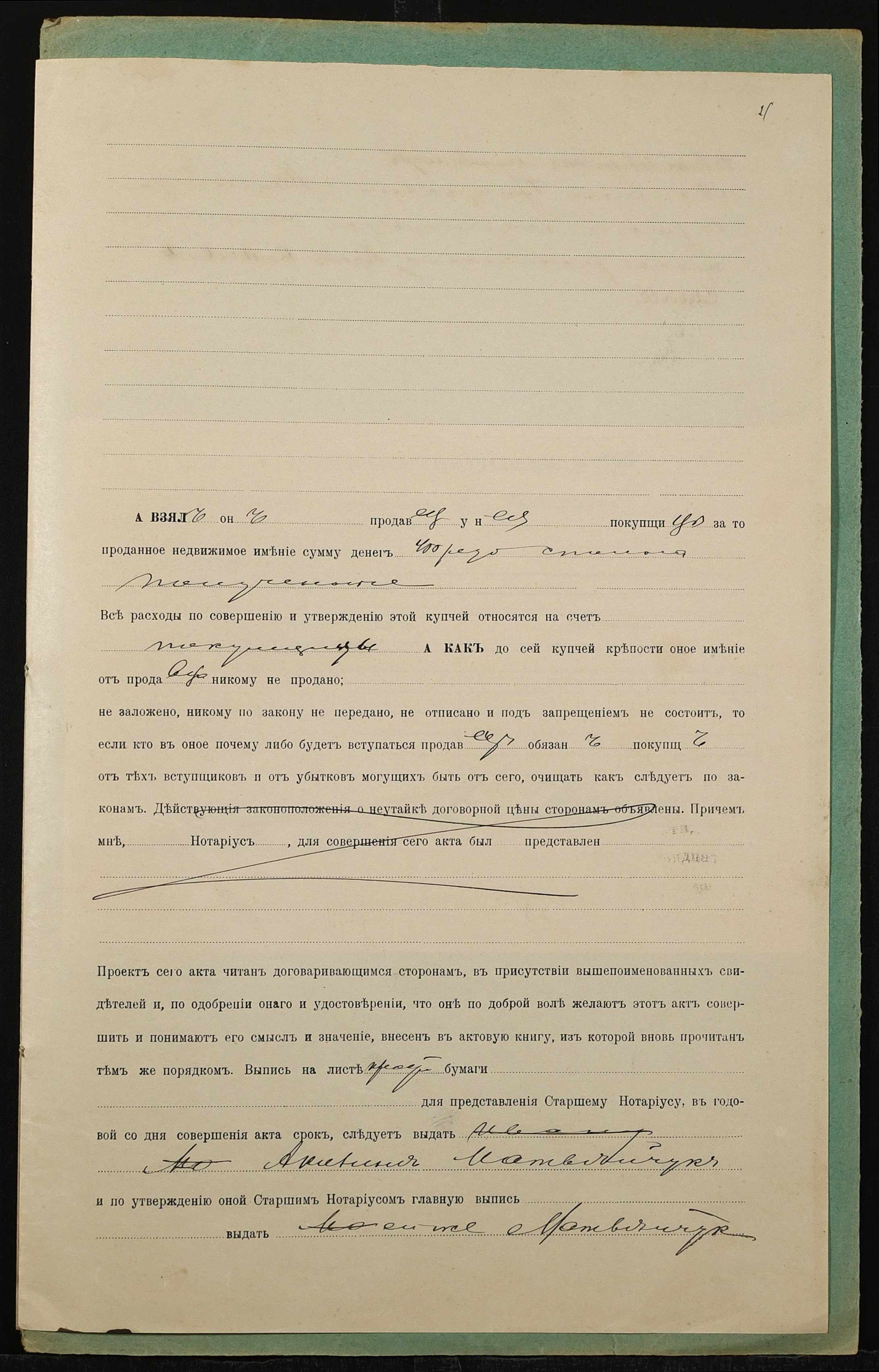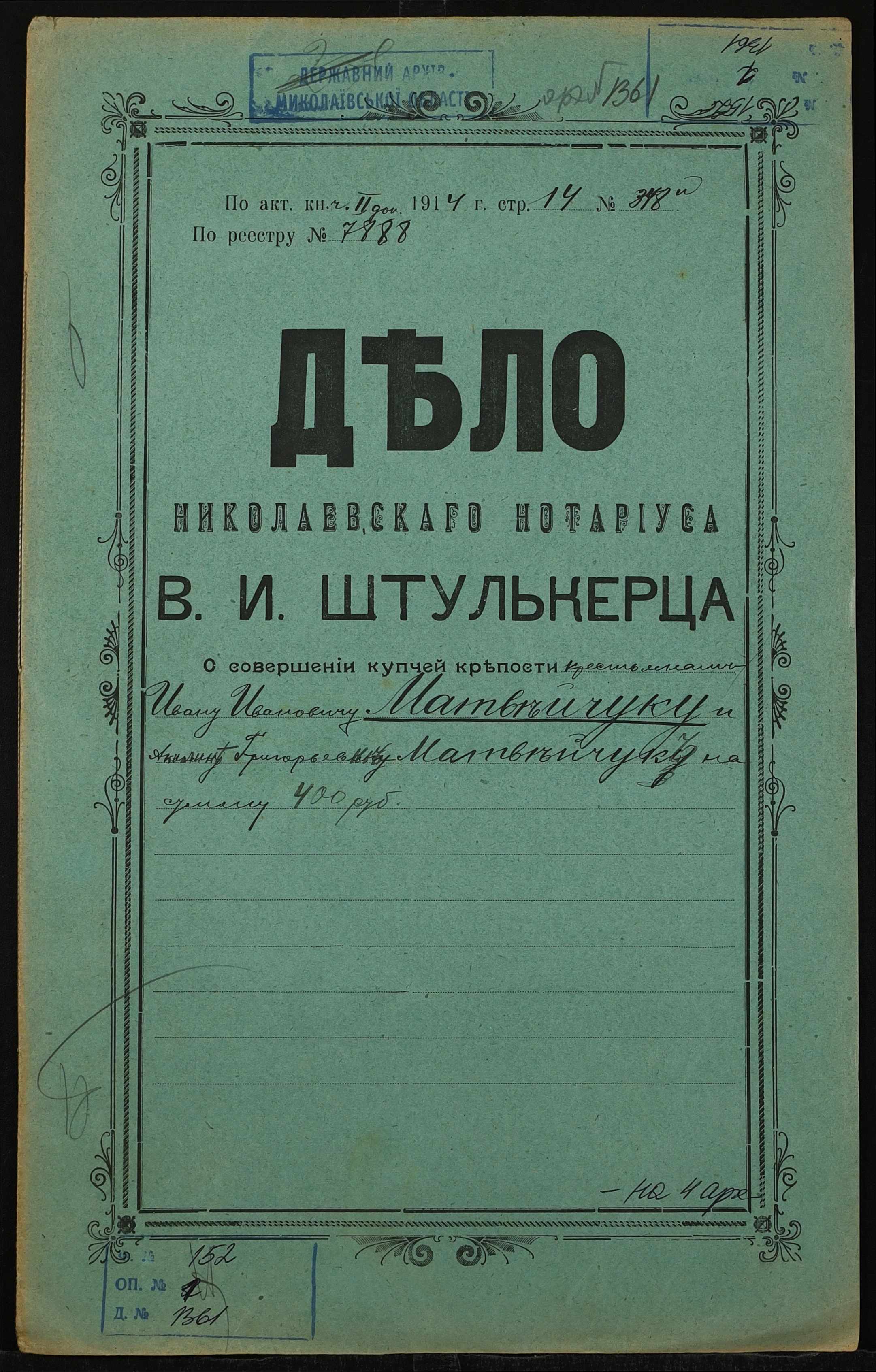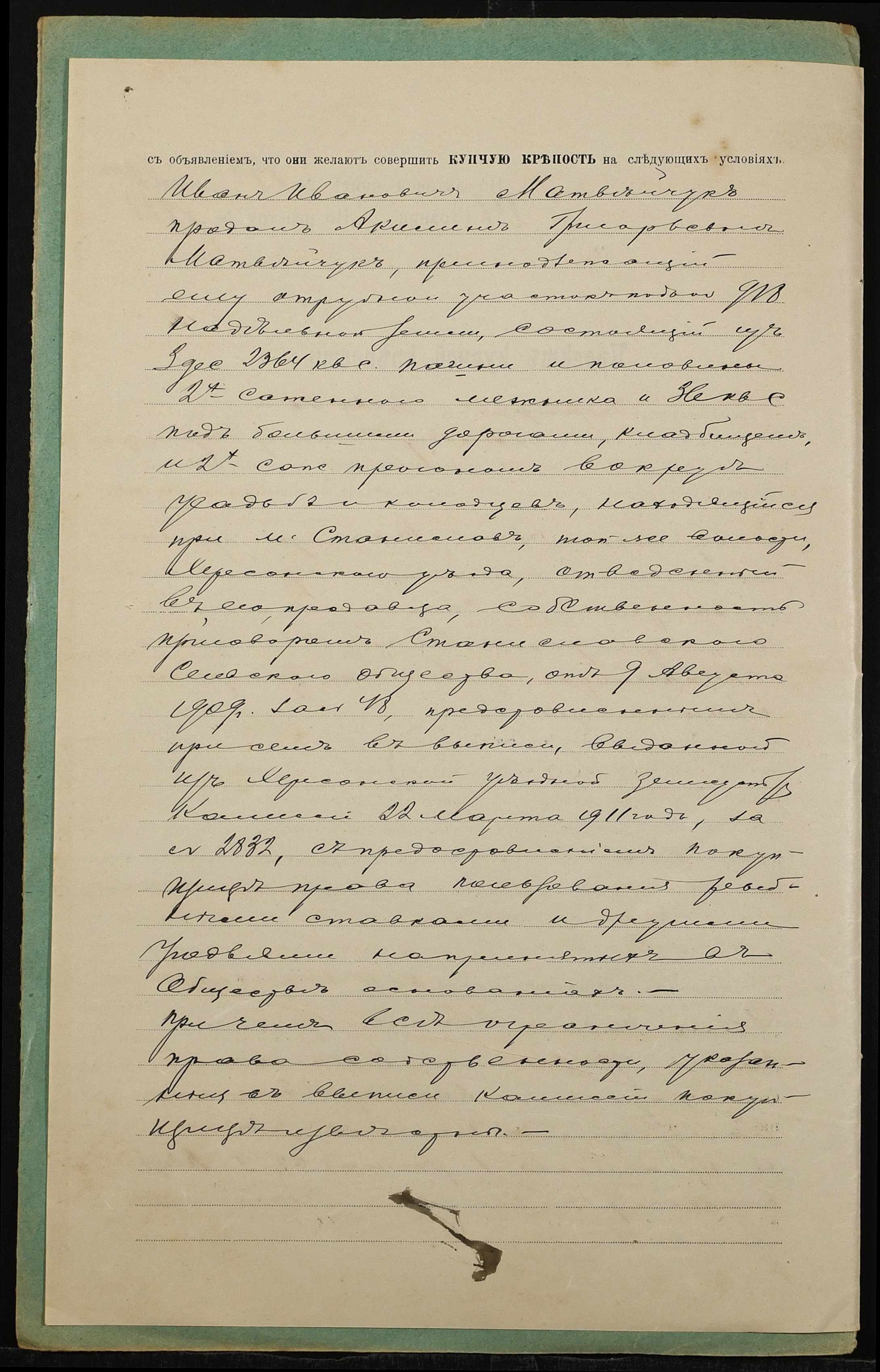• • • • Справа № 1361 “Справа про вчинення купчої про продаж землі селянином Матвійчуком Іваном Івановичем (Матвийчуком Иваном Ивановичем) на користь селянки Матвійчук Килини Григорівни (Матвийчук Акилины Григорьевны)”