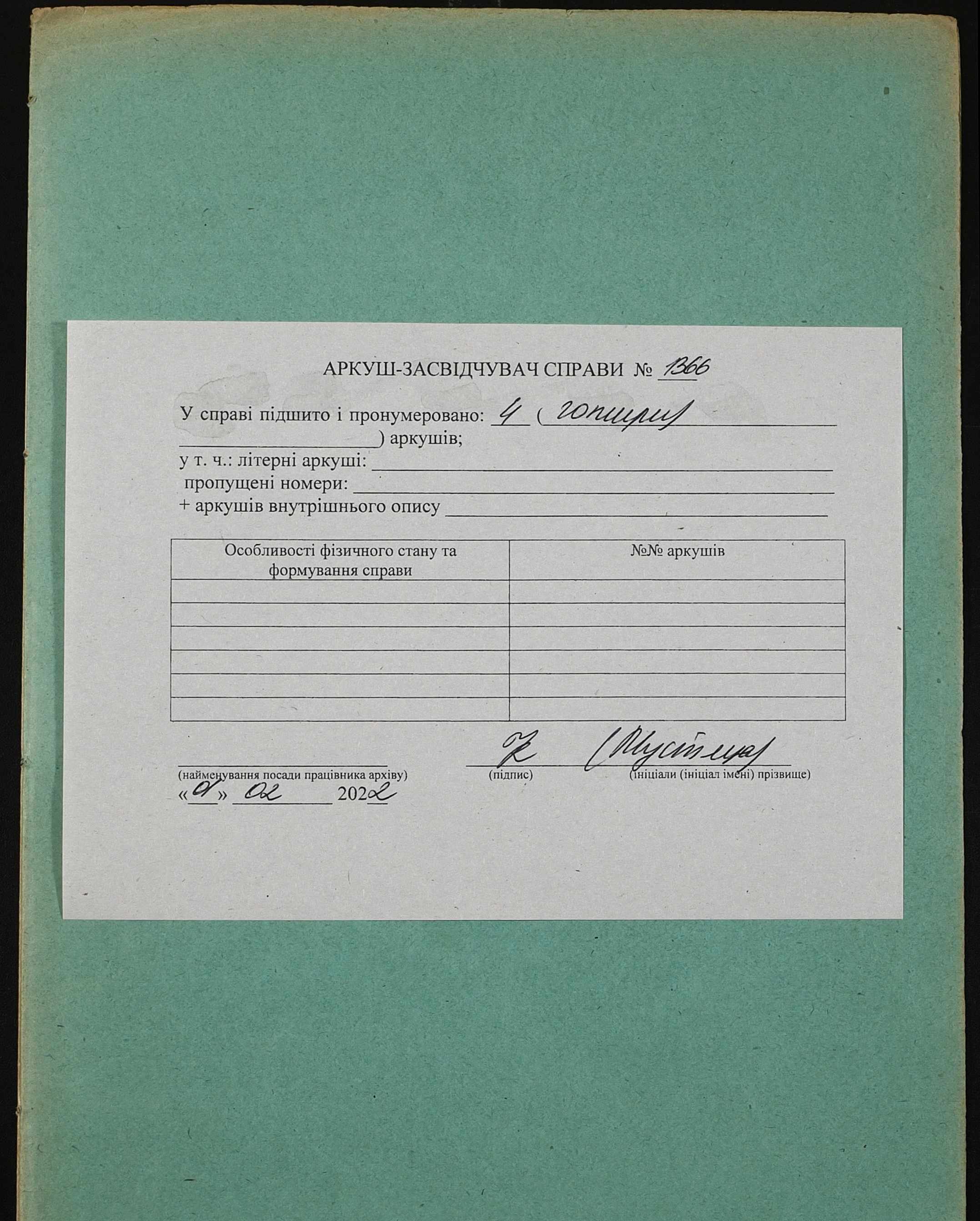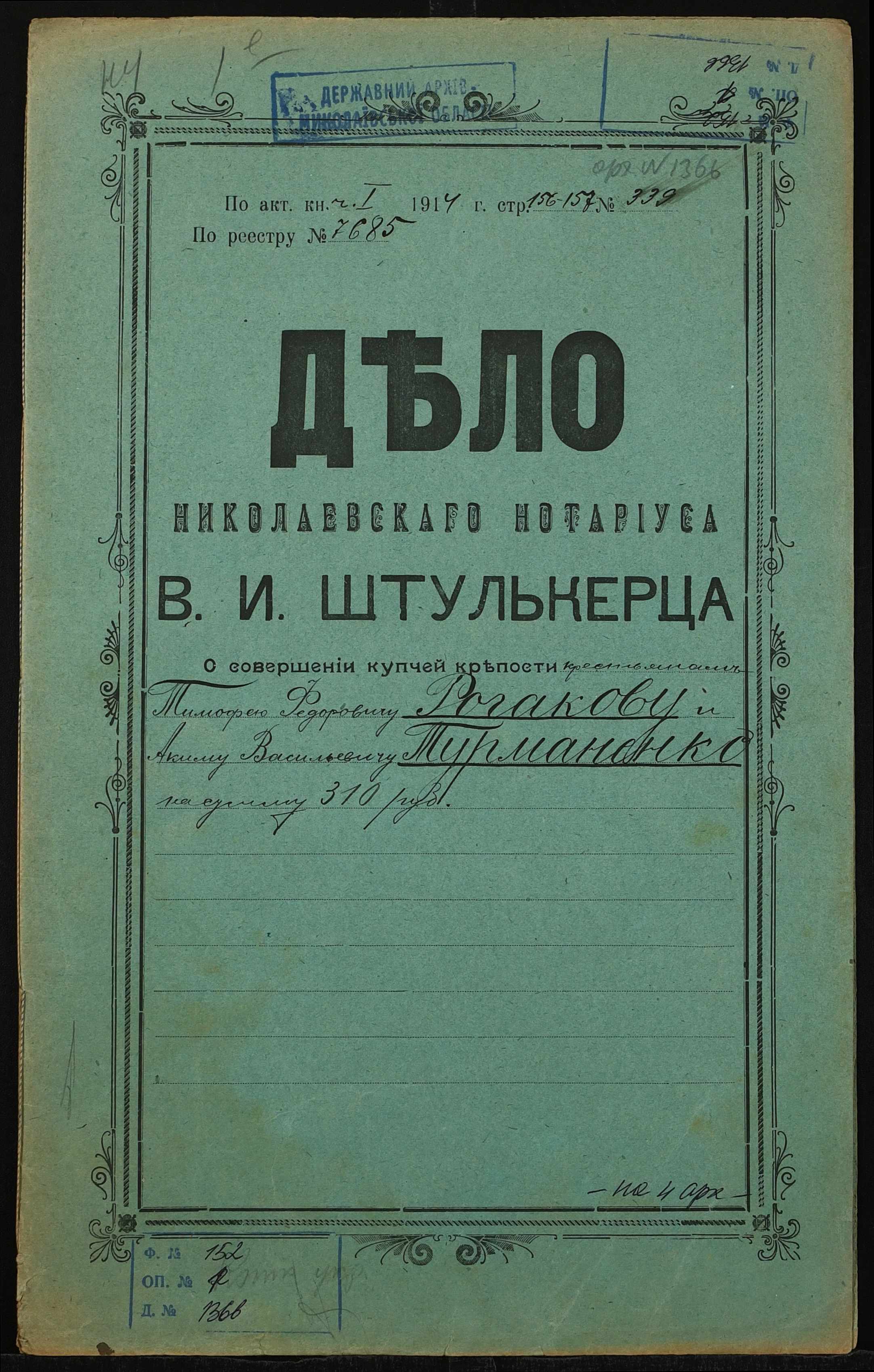 • • • • Справа № 1366 “Справа про вчинення купчої про продаж землі селянином Рогаковим Тимофієм Федоровичем (Рогаковым Тимофеем Федоровичем) на користь селянина Турманенка Якима Васильовича (Турманенко Акима Васильевича)”