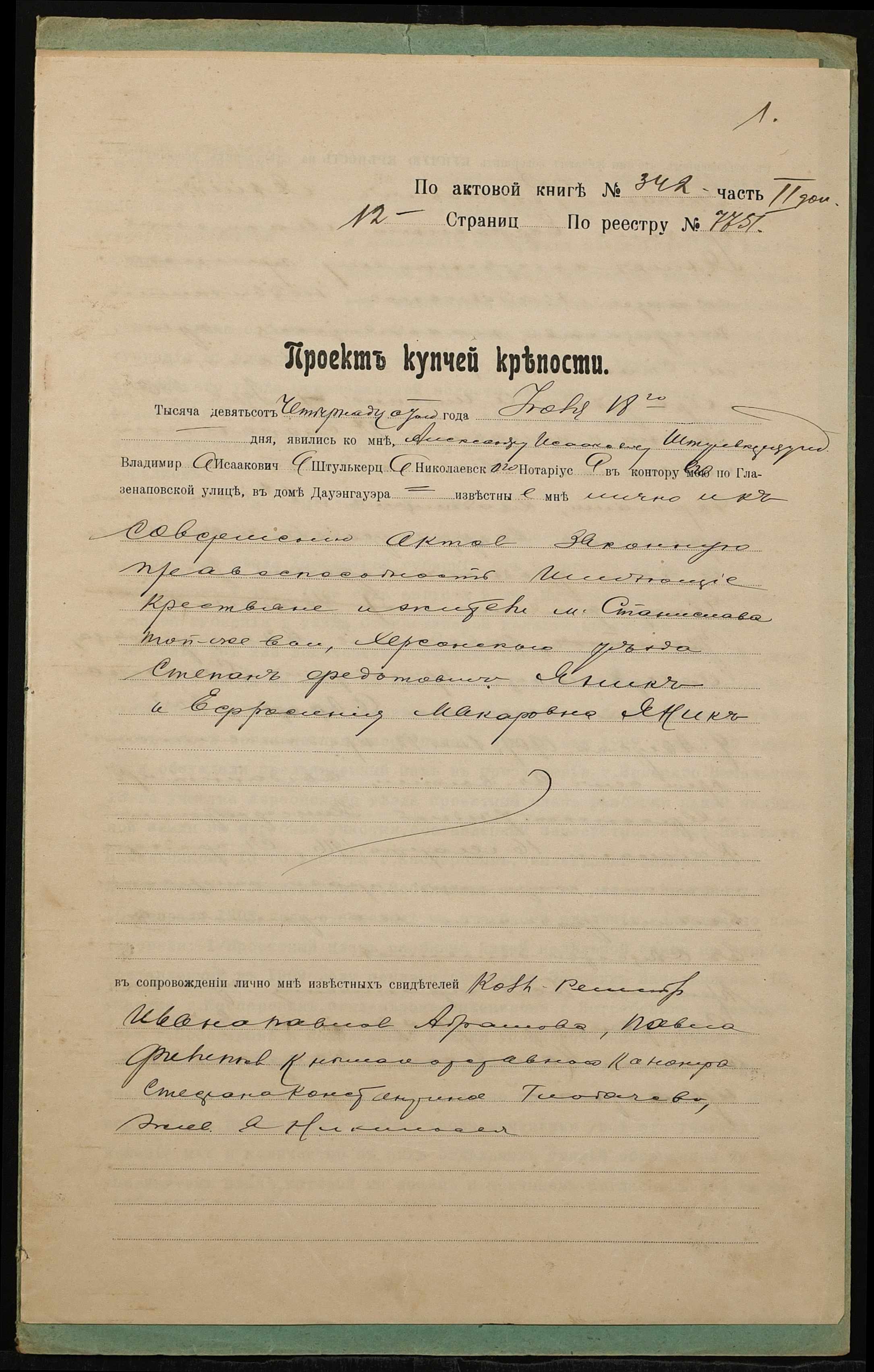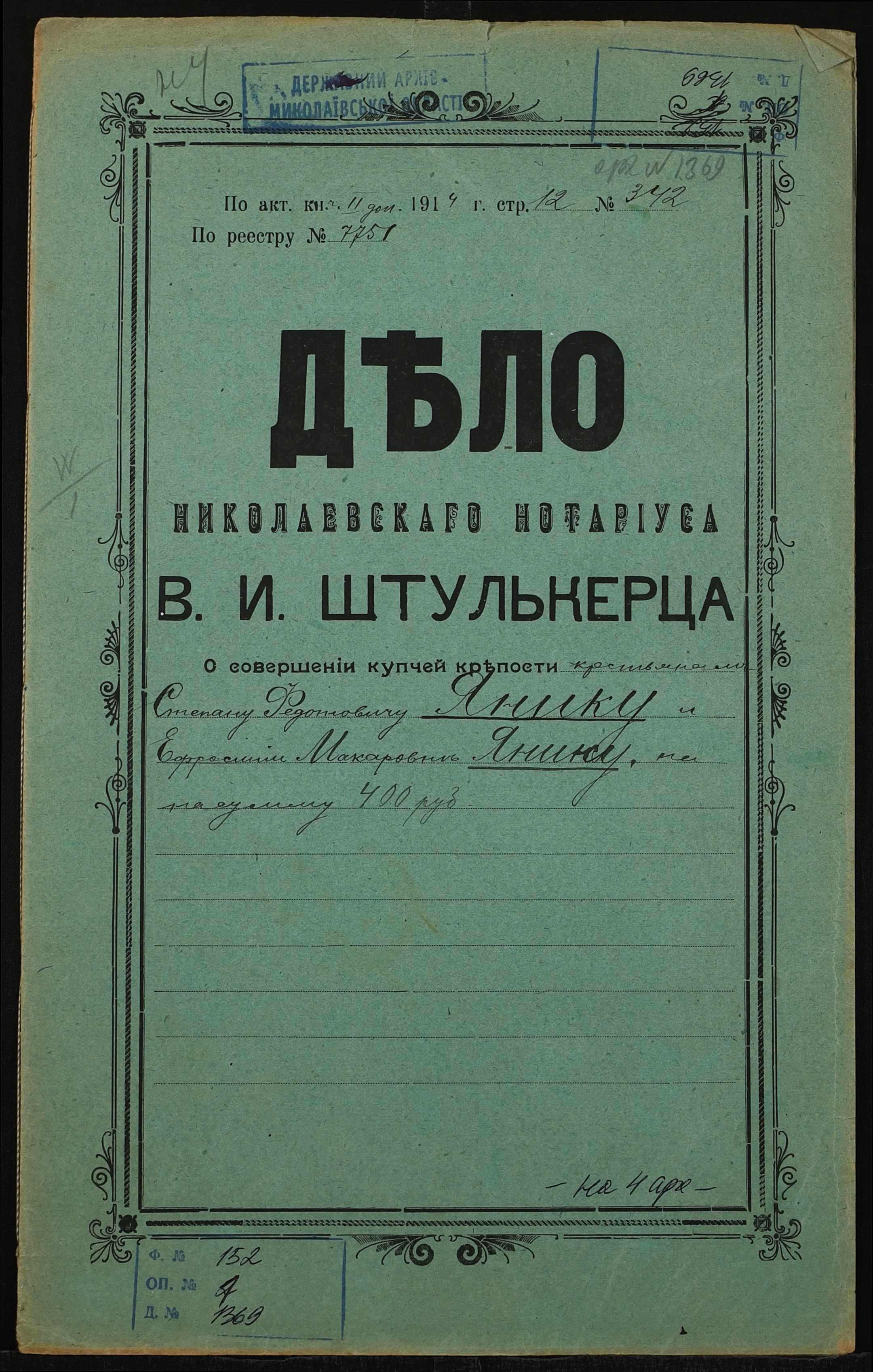 ◦ ◦ Фонд № 152 “Контора миколаївського нотаріуса Херсонського окружного суду Штулькерца Володимира Ісааковича”