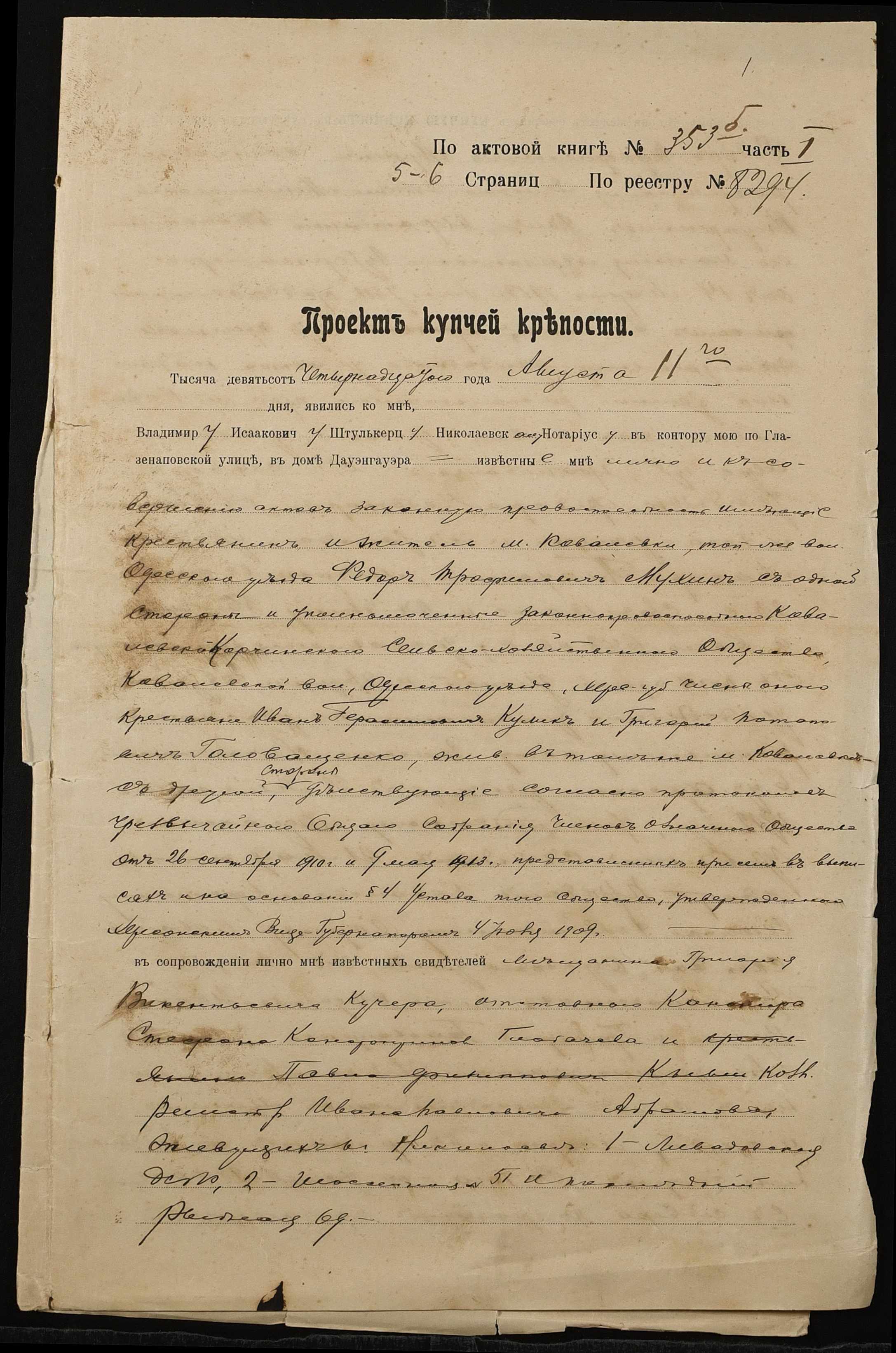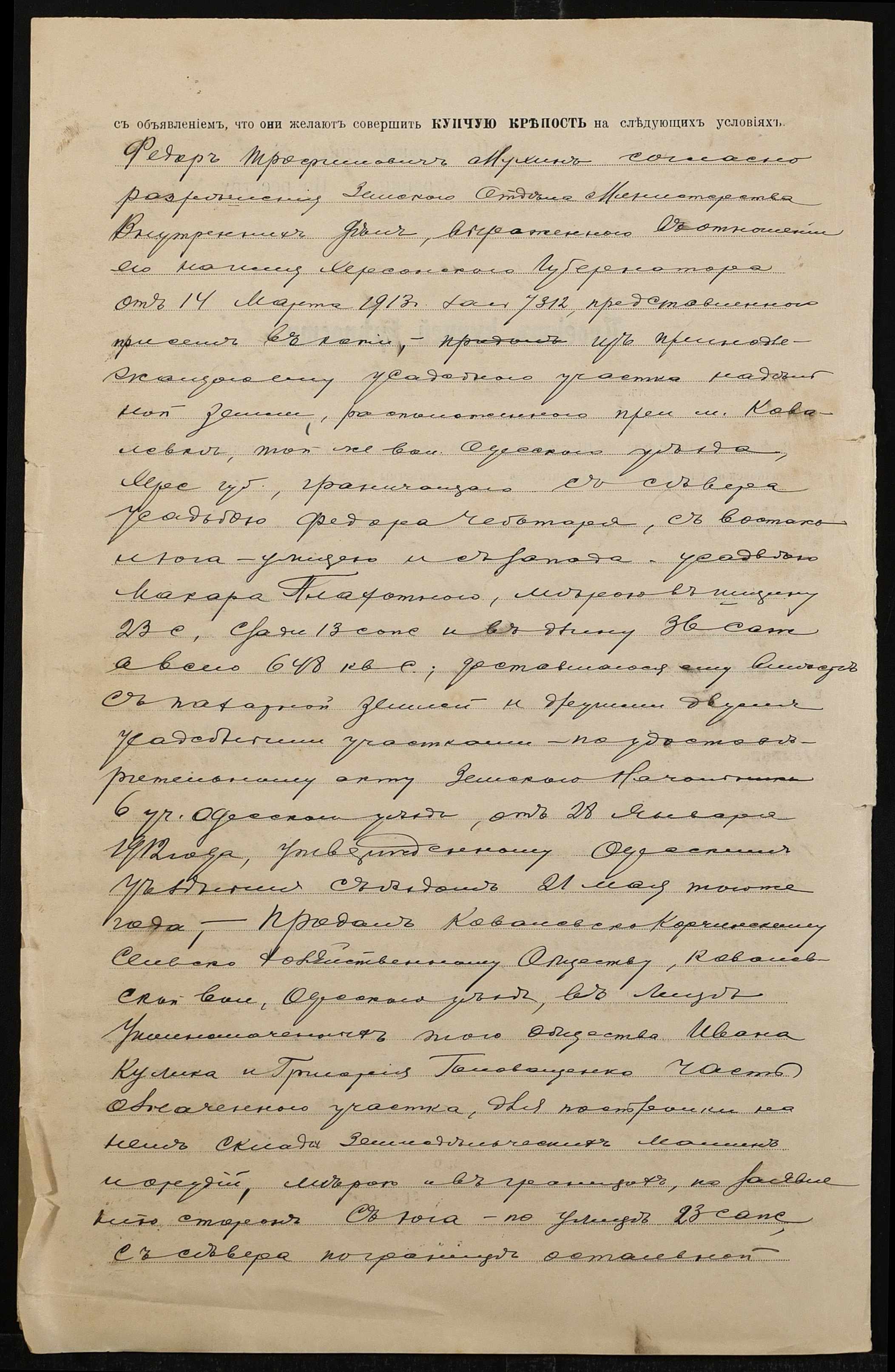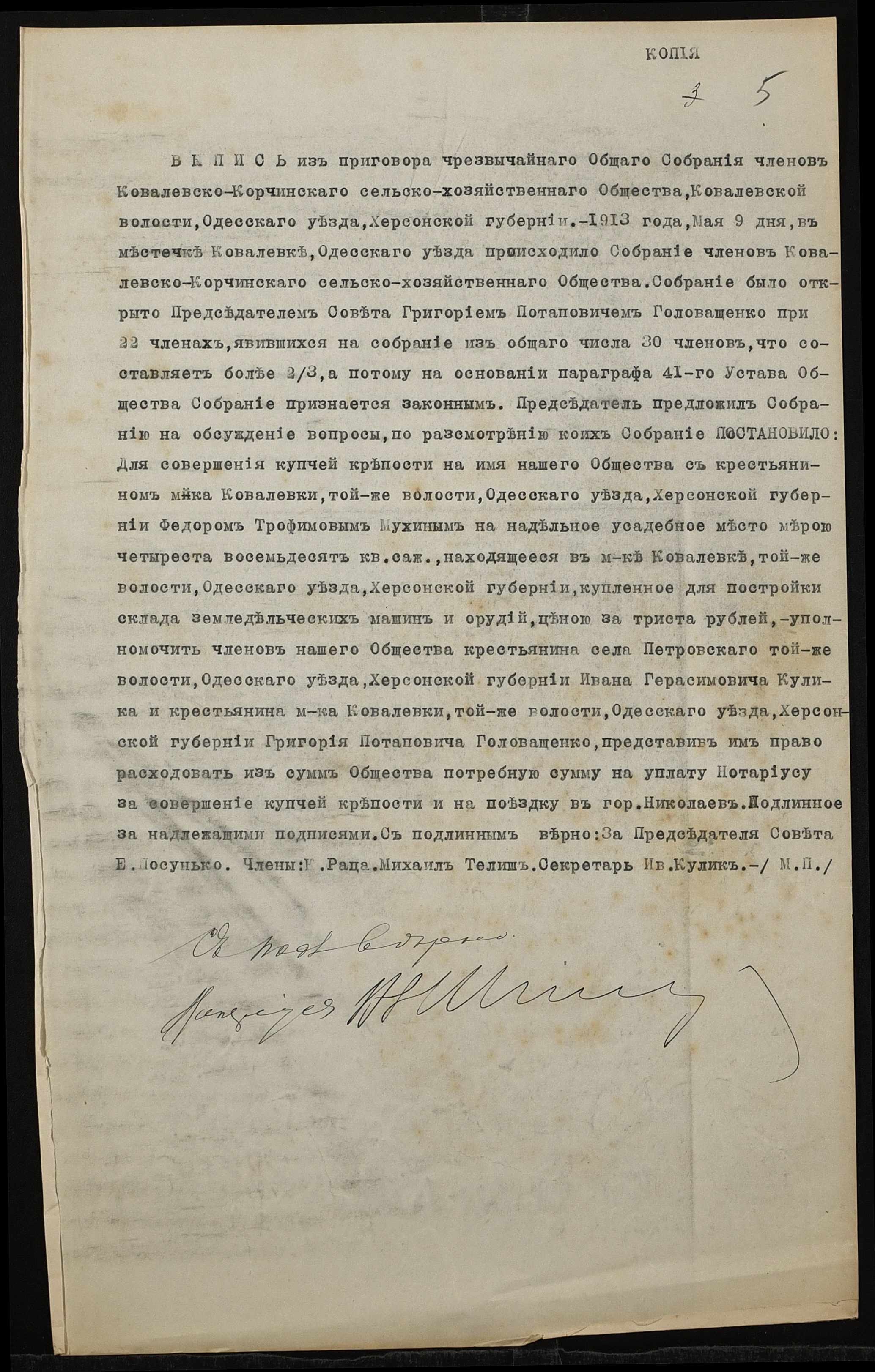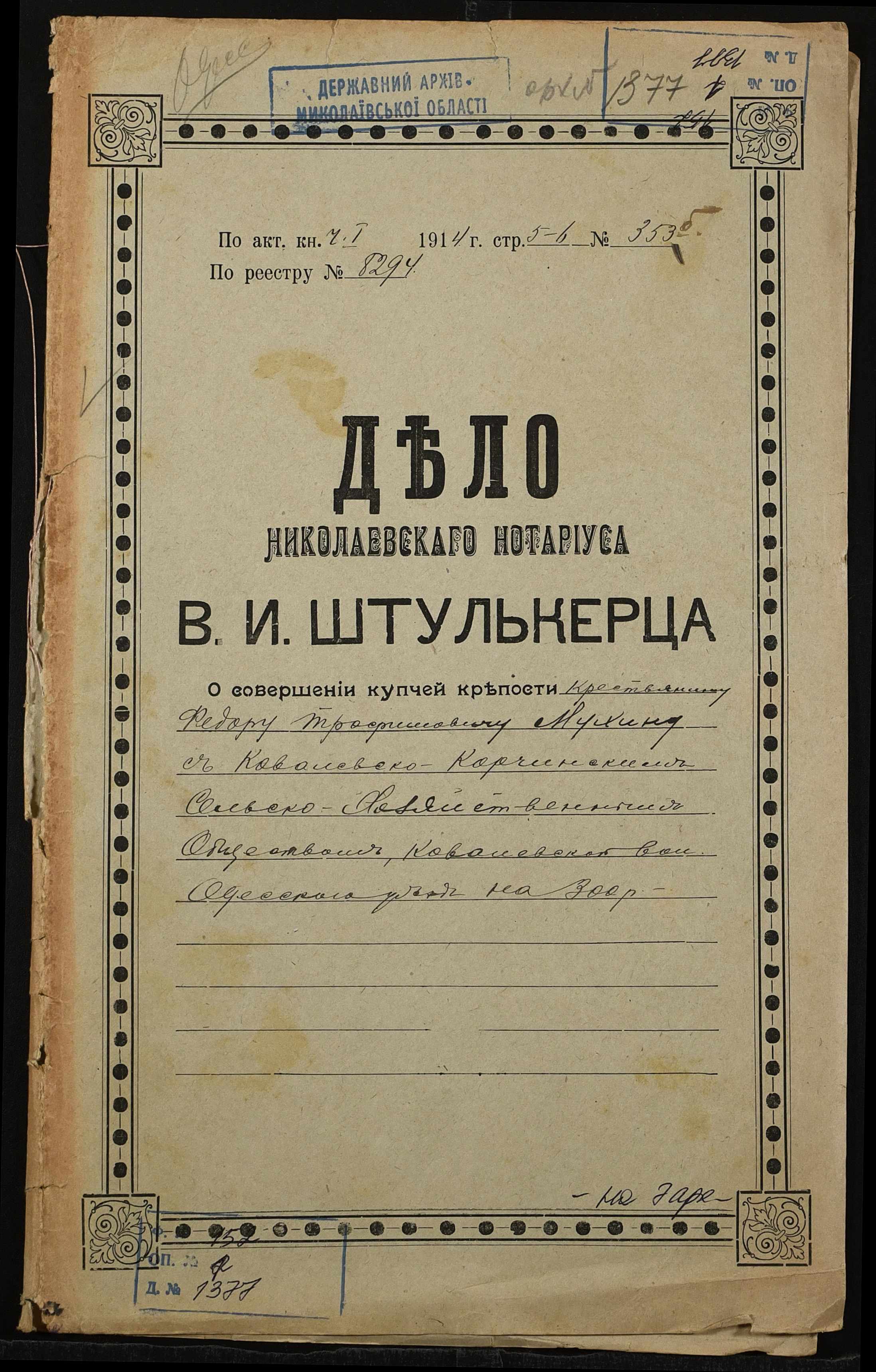 • • • • Справа № 1377 “Справа про вчинення купчої про продаж землі селянином Мухіним Федором Трохимовичем (Мухиным Федором Трофимовичем) на користь Ковалівсько-Корчинського сільськогосподарського товариства Ковалівської волості Одеського повіту”